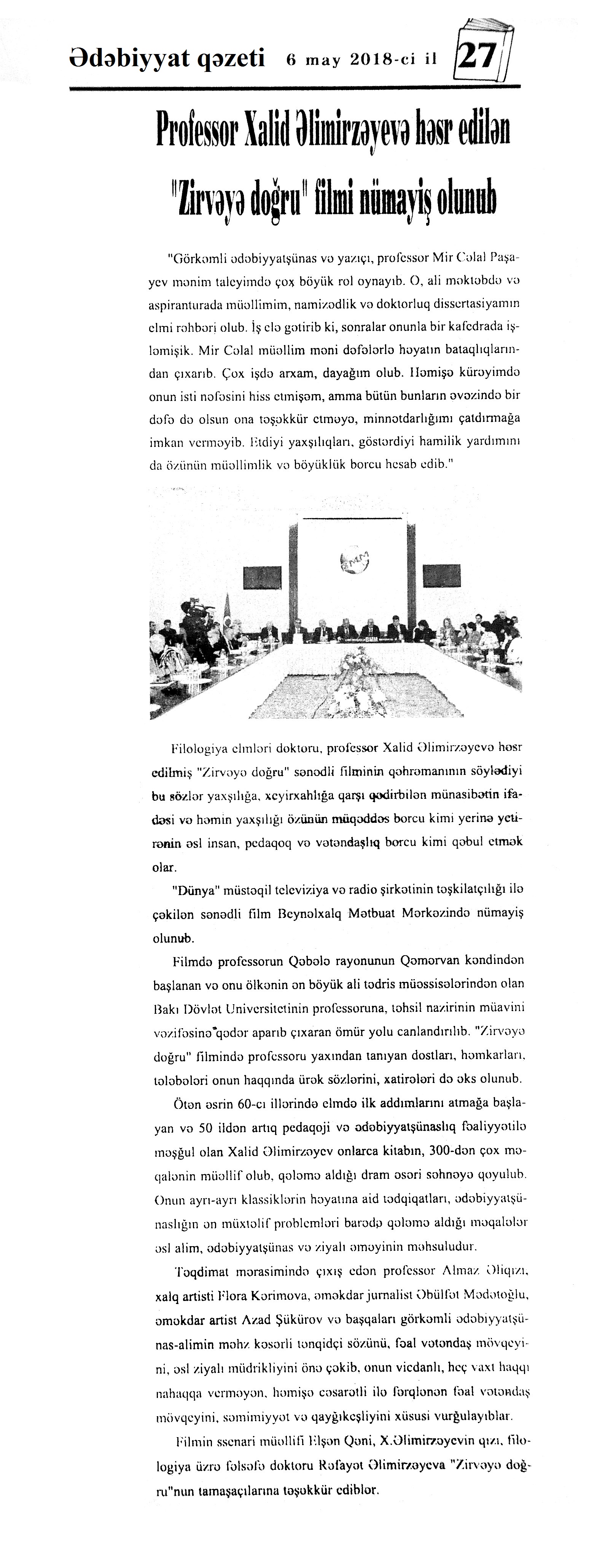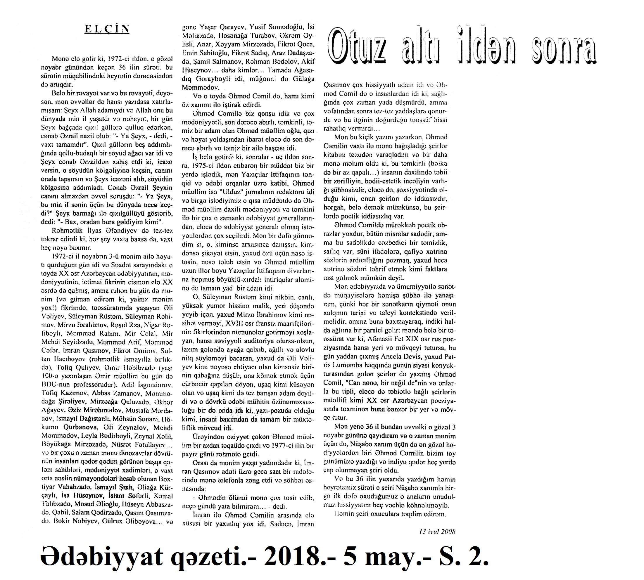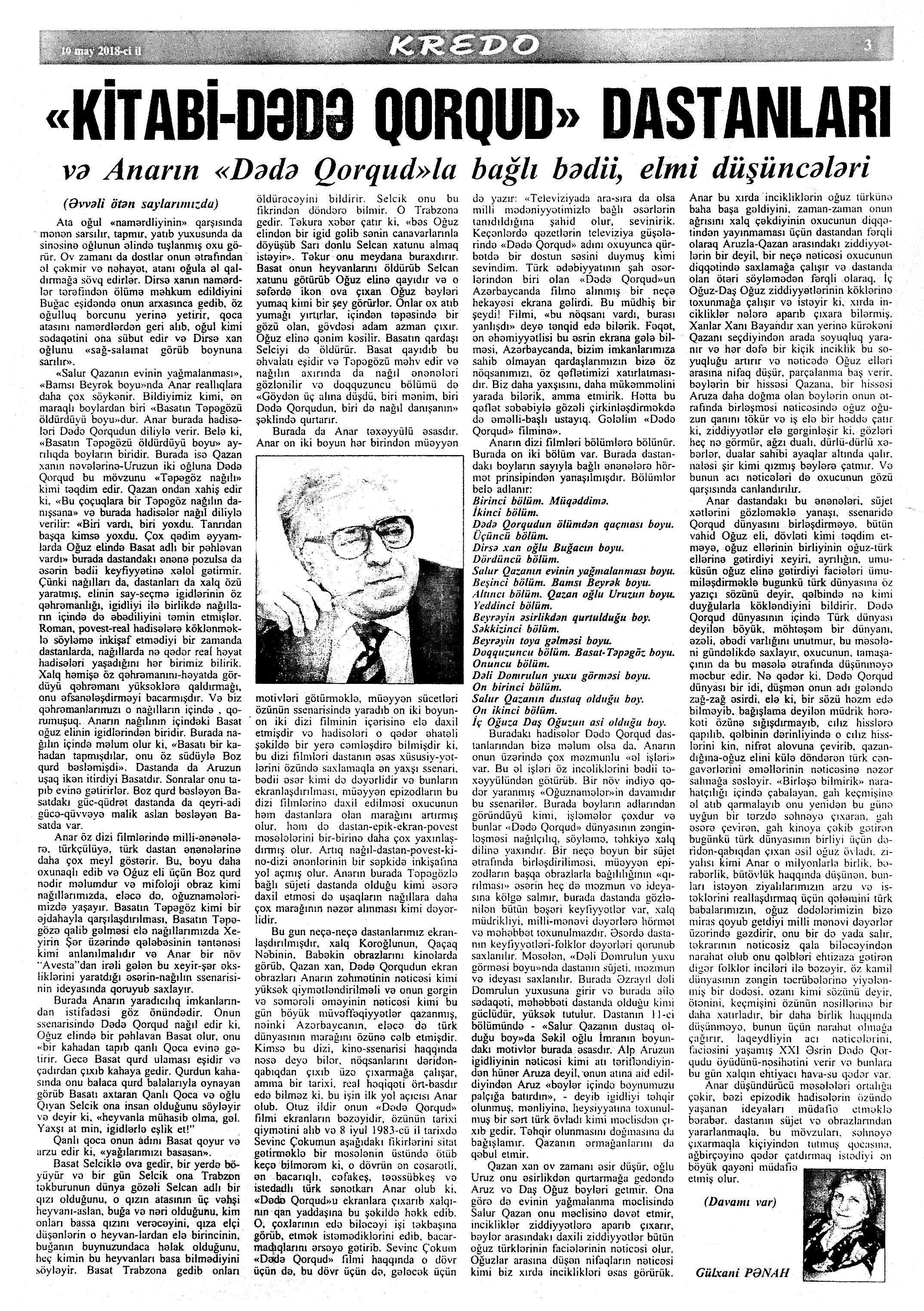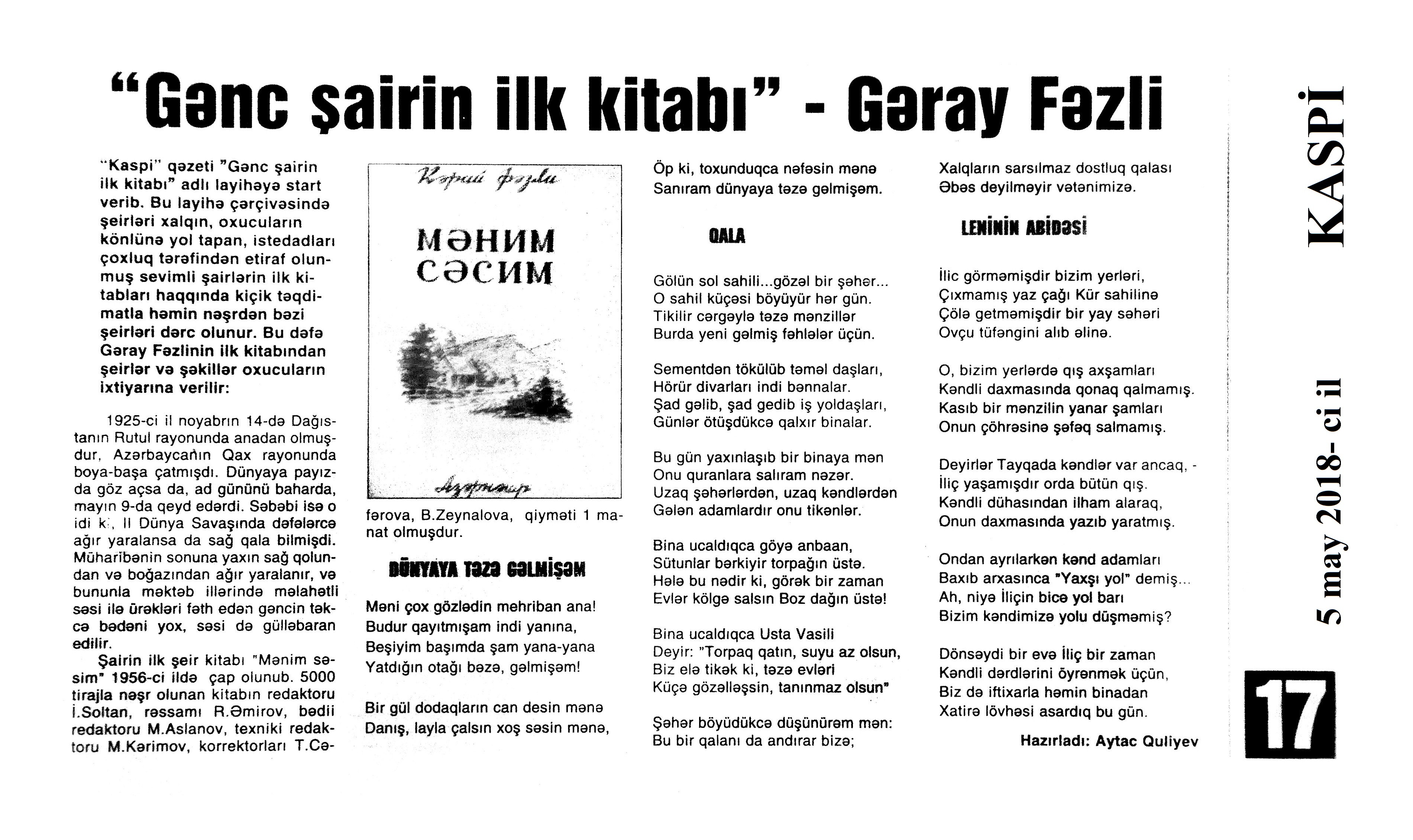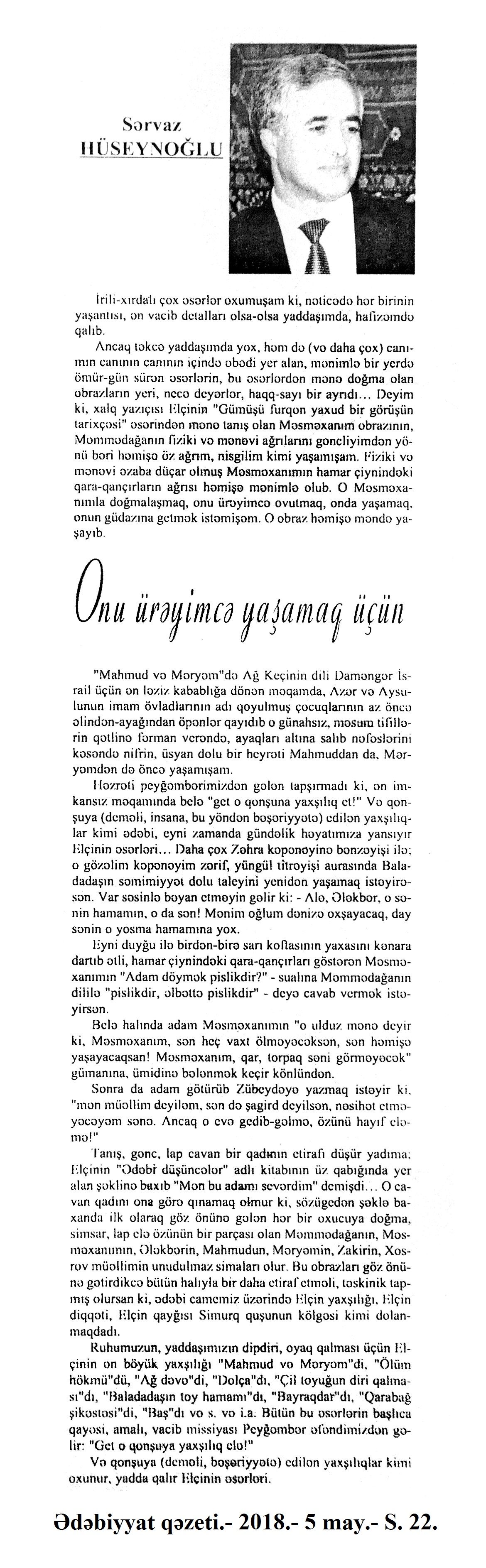 “Heyvanıstan” romanı haqqında] 1303. İsrailin tanınmış şairi Mətbuat Şurasında olub: [Pyotr Davıdov] //Səs.- 2018.-3 may.- S.9.; Mədəniyyət.-2018.- 4 may.- S.10. 1304. Karlyukeviç, A. Azərbaycan və Rıqor Borodulin – Ales Karlyukeviç: [müəlifin “Azərbaycan və Rıqor Borodulin” adlı məqaləsi haqqında] /tərc.etdi Kamran Nəzirli //Kaspi.-2018.- 12-14 may.- S.19. 1305. Kekelidze, G. Sənə məktublar: [gürcü ədəbiyyatı] /tərc etdi Neli Məmmədova //Ədəbiyyat qəzeti.-2018.- 19 may.- S.13. 1306. Qazaxıstanda Zəlimxan Yaqubun xatirəsi anılıb //Mədəniyyət.- 2018.- 9 may.- S.15. 1307. Məmmədzadə, S. Körpü: [Məmməd Orucun Rusiya ədəbiyyatından tərcümələri haqqında] //Ədəbiyyat qəzeti.-2018.- 19 may.- S.5. 1308. Müşfiq, Ş. “Kardeş kalemler”in may sayı: [Avrasiya Yazarlar Birliyinin mətbu orqanı böyük qazax şairi Ğalim Jaylıbaya həsr olunub] //525-ci qəzet.-2018.- 31 may.- S.6. 1309. Özer, A. Şeir bütün mədəniyyətlərin dinidir: Türkiyəli şair Adnan Özer: “İndiyə qədər intihar etməmişəmsə, bu, möcüzədir” /müsahibəni apardı Fərid Hüseyn //Kaspi.-2018.- 12-14 may.- S.13. 1310. Seyidli, P. Yaşamağı öyrədən roman: İqor Volnitskinin “Mənə ölməyi öyrət” romanındakı irfani şifrələr //Ədəbiyyat qəzeti. -2018.- 12 may.- S.26-27. 1311. Tahirli, A. Prof.dr. Okan Yeşilotun Azərbaycan sevgisi: [türk alimin araşdırmaları haqqında] //Ədəbiyyat qəzeti.- 2018.- 6 may.- S.15. 1312. Tanınmış qazax şairinin şeirləri Azərbaycan dilində: [Mağcan Cumabayın 125 illiyi ilə bağlı] //Mədəniyyət.- 2018.- 2 may.- S.15. 1313. Tanınmış Ukrayna ədibinin əsərləri ana dilimizdə: [Vladimir Danilenkonun “Qürub çağının işığında” kitabı] //Mədəniyyət.- 2018.- 9 may.- S.10. 1314. Türk dünyasının böyük yazıçısı Çingiz Aytmatov Bakıda yad olunub: [Türkdilli Ölkələrin Parlament Assambleyasının (TÜRKPA) Bakı ofisində] //Ədəbiyyat qəzeti.-2018.- 19 may.- S.3.; Mədəniyyət.- 2018.- 16 may. - S.2.