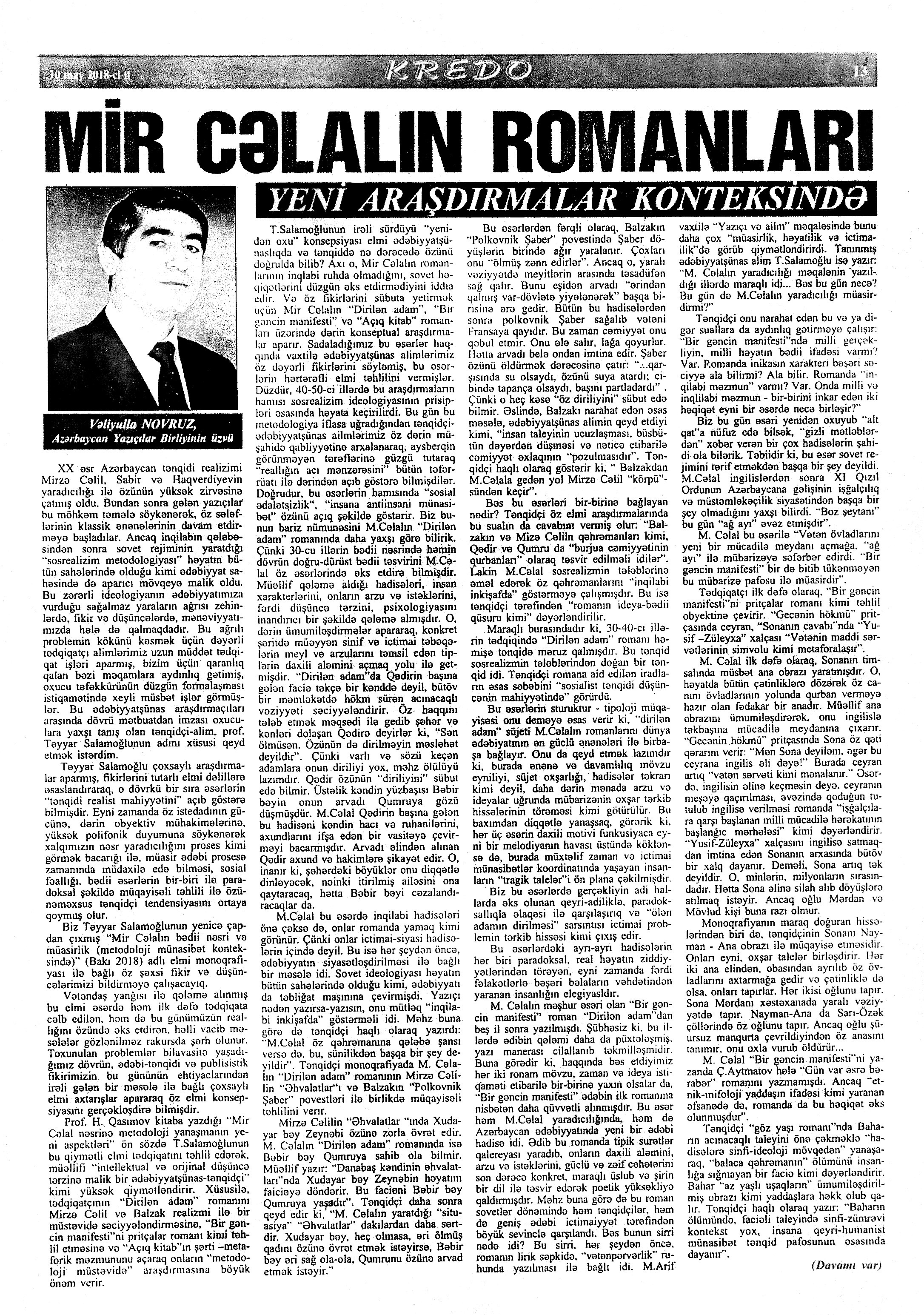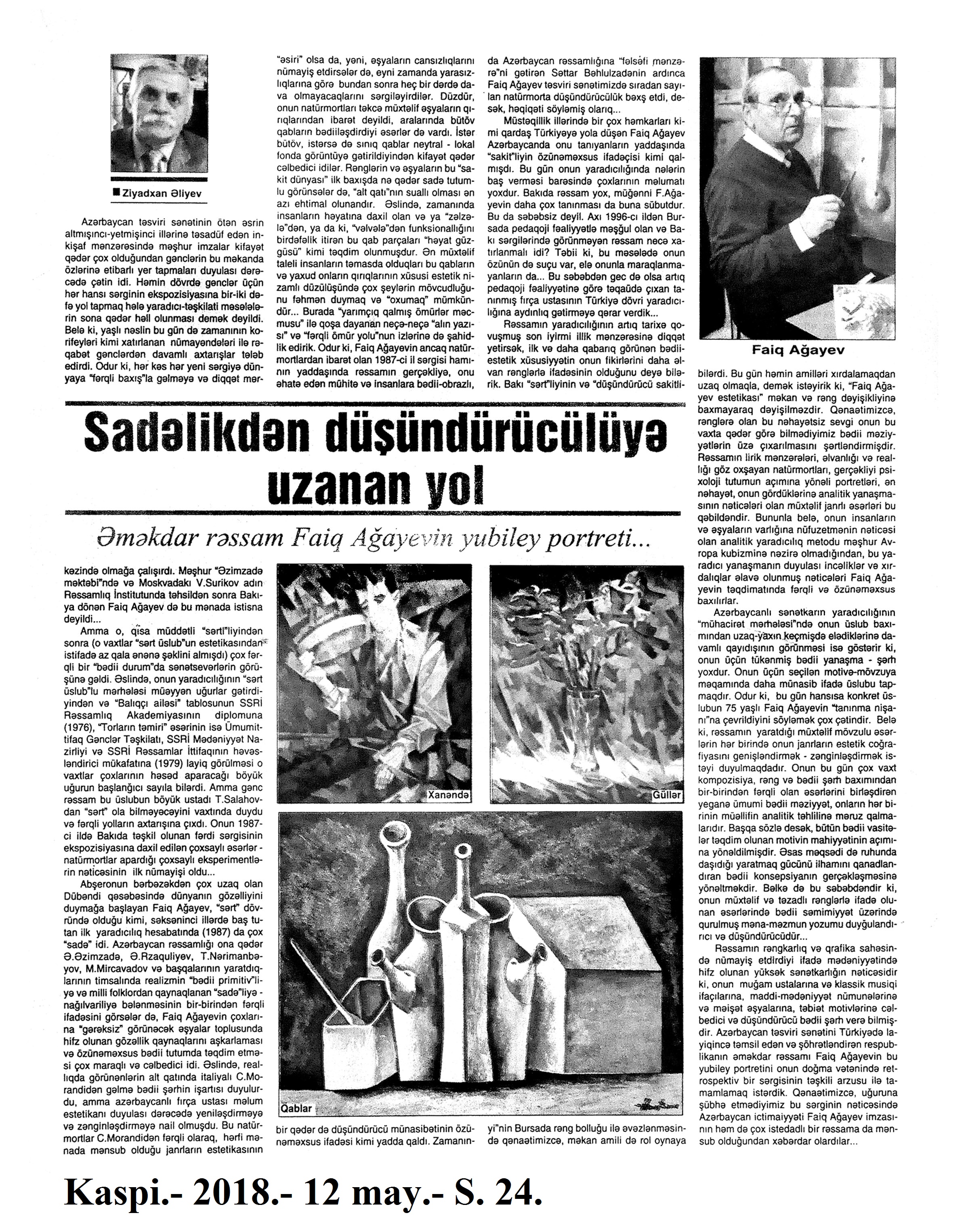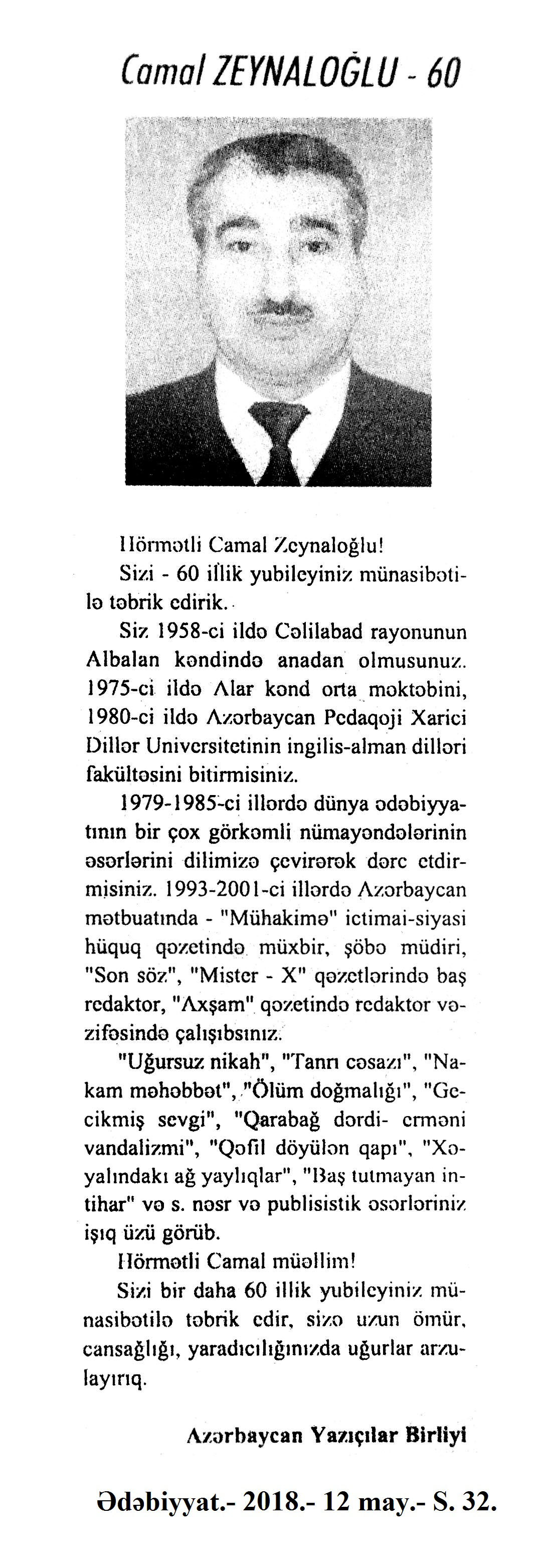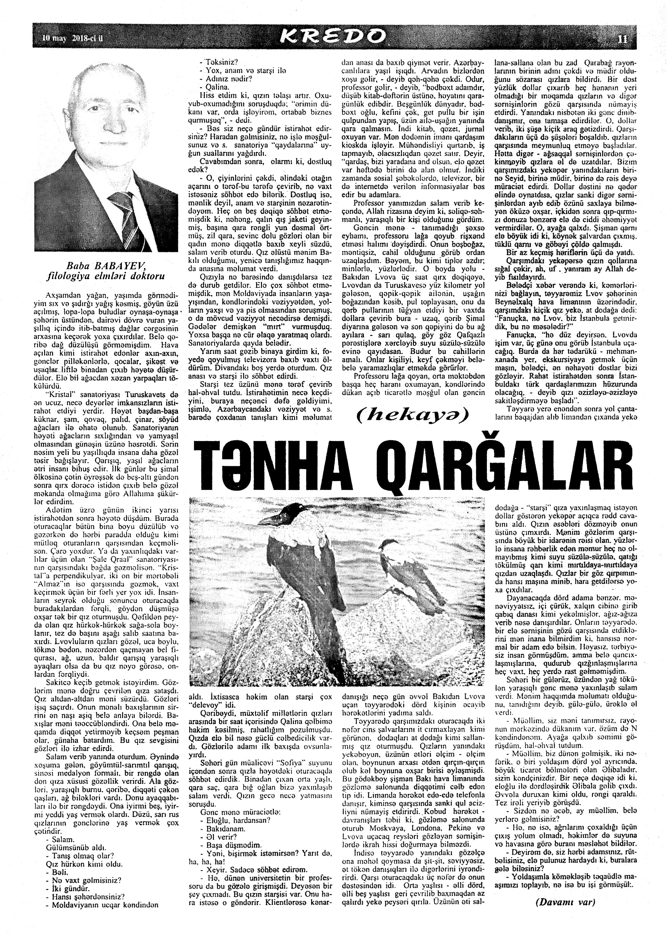 “Heyvanıstan” romanı haqqında] 1303. İsrailin tanınmış şairi Mətbuat Şurasında olub: [Pyotr Davıdov] //Səs.- 2018.-3 may.- S.9.; Mədəniyyət.-2018.- 4 may.- S.10. 1304. Karlyukeviç, A. Azərbaycan və Rıqor Borodulin – Ales Karlyukeviç: [müəlifin “Azərbaycan və Rıqor Borodulin” adlı məqaləsi haqqında] /tərc.etdi Kamran Nəzirli //Kaspi.-2018.- 12-14 may.- S.19. 1305. Kekelidze, G. Sənə məktublar: [gürcü ədəbiyyatı] /tərc etdi Neli Məmmədova //Ədəbiyyat qəzeti.-2018.- 19 may.- S.13. 1306. Qazaxıstanda Zəlimxan Yaqubun xatirəsi anılıb //Mədəniyyət.- 2018.- 9 may.- S.15. 1307. Məmmədzadə, S. Körpü: [Məmməd Orucun Rusiya ədəbiyyatından tərcümələri haqqında] //Ədəbiyyat qəzeti.-2018.- 19 may.- S.5. 1308. Müşfiq, Ş. “Kardeş kalemler”in may sayı: [Avrasiya Yazarlar Birliyinin mətbu orqanı böyük qazax şairi Ğalim Jaylıbaya həsr olunub] //525-ci qəzet.-2018.- 31 may.- S.6. 1309. Özer, A. Şeir bütün mədəniyyətlərin dinidir: Türkiyəli şair Adnan Özer: “İndiyə qədər intihar etməmişəmsə, bu, möcüzədir” /müsahibəni apardı Fərid Hüseyn //Kaspi.-2018.- 12-14 may.- S.13. 1310. Seyidli, P. Yaşamağı öyrədən roman: İqor Volnitskinin “Mənə ölməyi öyrət” romanındakı irfani şifrələr //Ədəbiyyat qəzeti. -2018.- 12 may.- S.26-27. 1311. Tahirli, A. Prof.dr. Okan Yeşilotun Azərbaycan sevgisi: [türk alimin araşdırmaları haqqında] //Ədəbiyyat qəzeti.- 2018.- 6 may.- S.15. 1312. Tanınmış qazax şairinin şeirləri Azərbaycan dilində: [Mağcan Cumabayın 125 illiyi ilə bağlı] //Mədəniyyət.- 2018.- 2 may.- S.15. 1313. Tanınmış Ukrayna ədibinin əsərləri ana dilimizdə: [Vladimir Danilenkonun “Qürub çağının işığında” kitabı] //Mədəniyyət.- 2018.- 9 may.- S.10. 1314. Türk dünyasının böyük yazıçısı Çingiz Aytmatov Bakıda yad olunub: [Türkdilli Ölkələrin Parlament Assambleyasının (TÜRKPA) Bakı ofisində] //Ədəbiyyat qəzeti.-2018.- 19 may.- S.3.; Mədəniyyət.- 2018.- 16 may. - S.2.