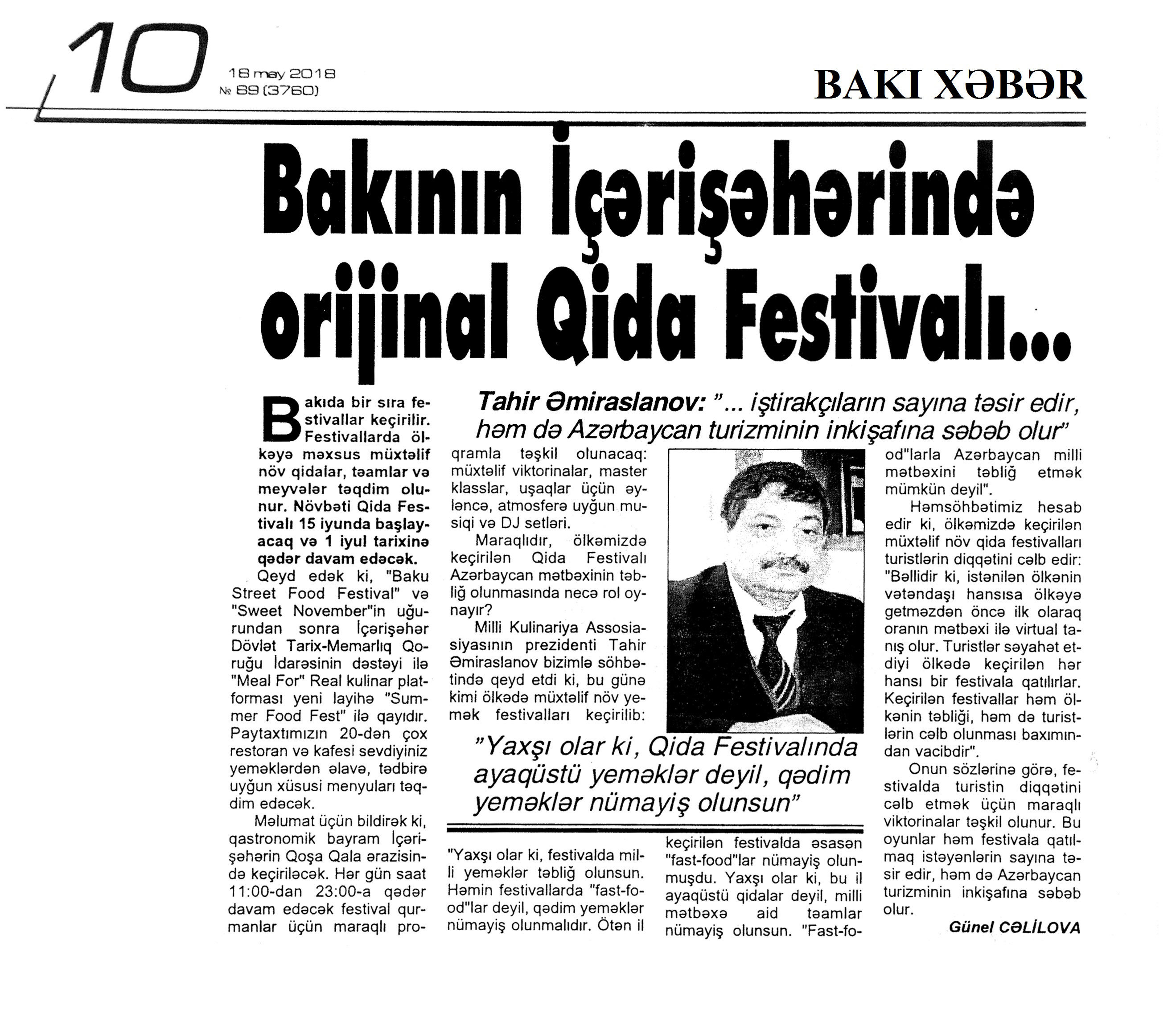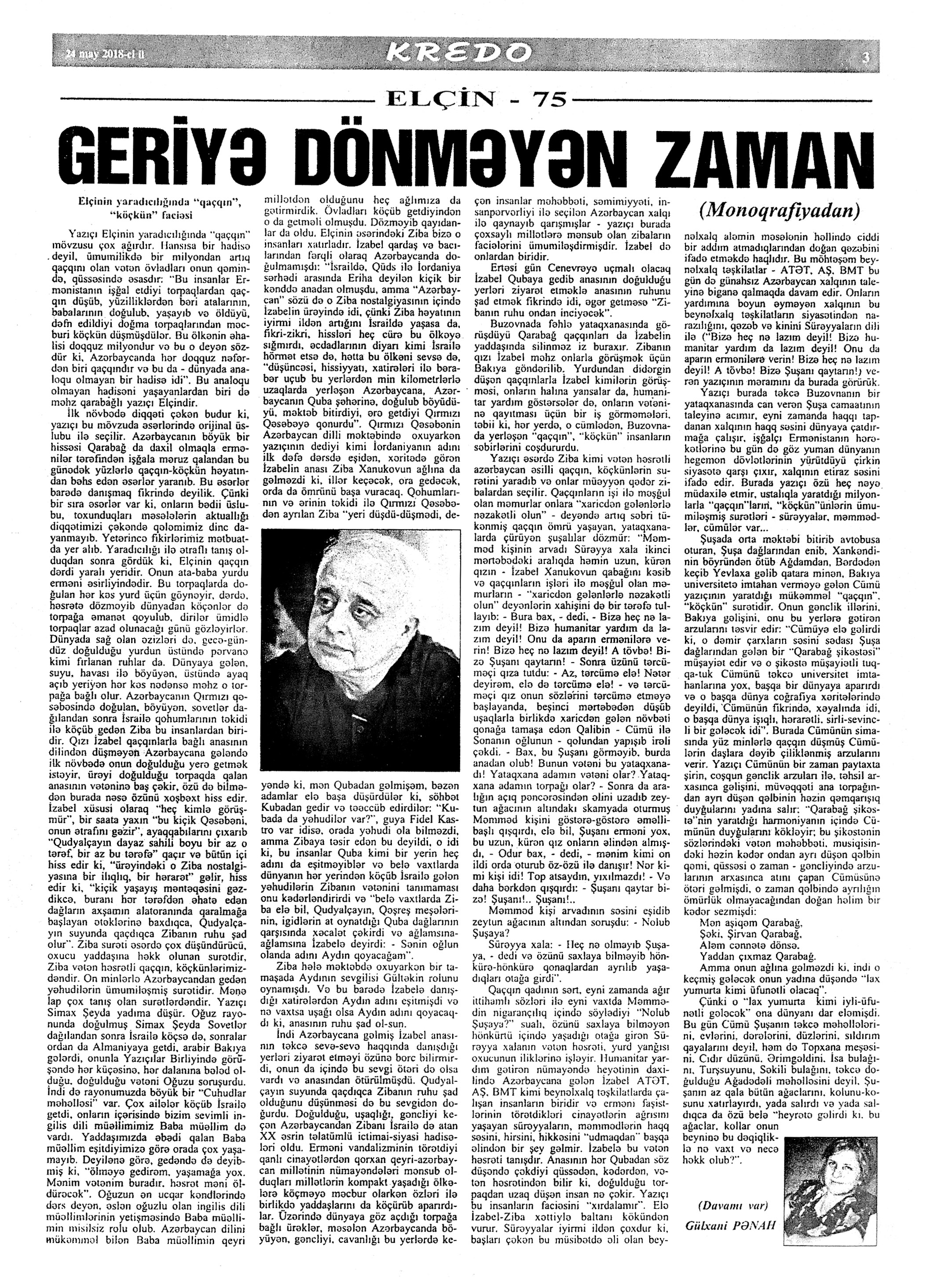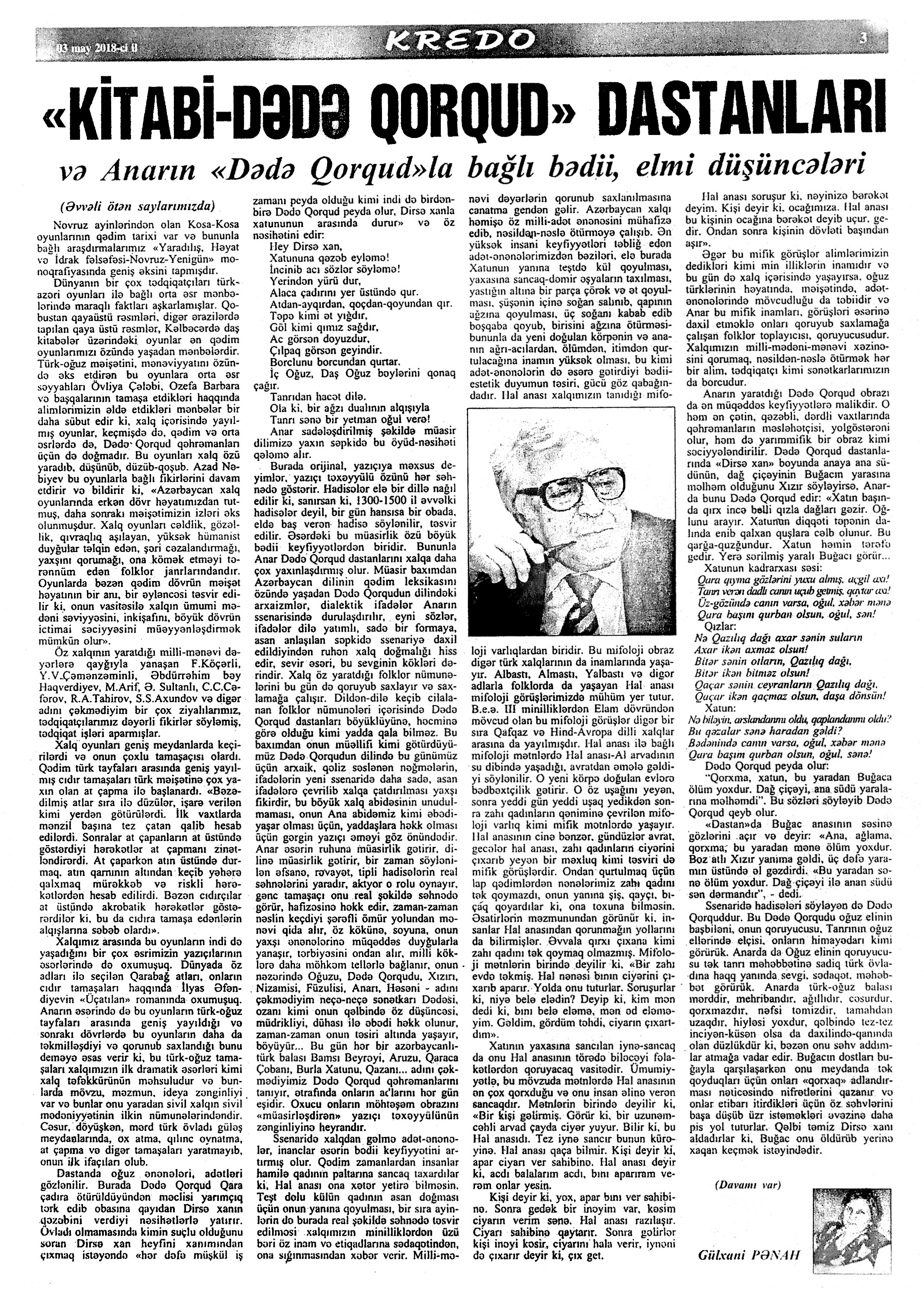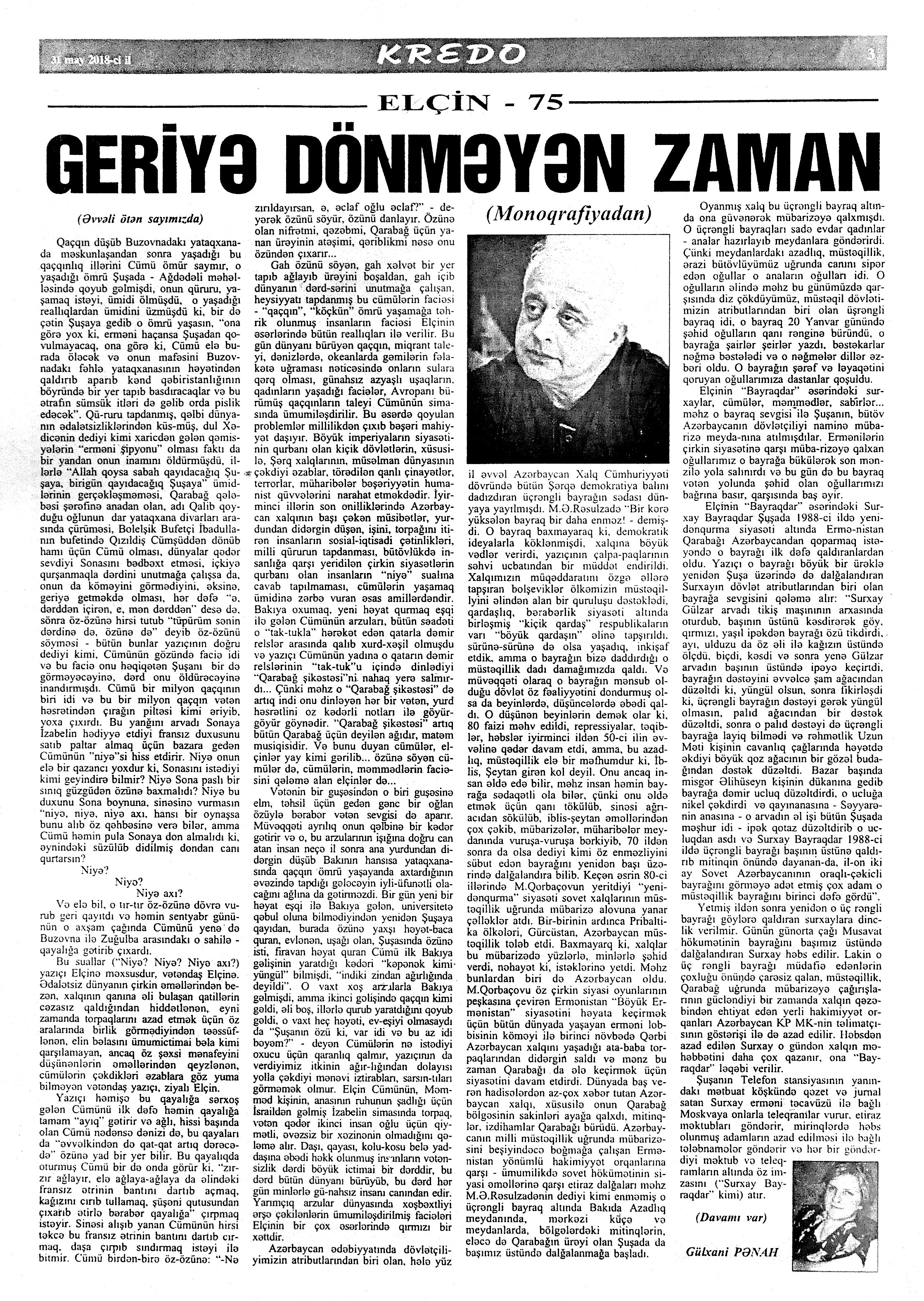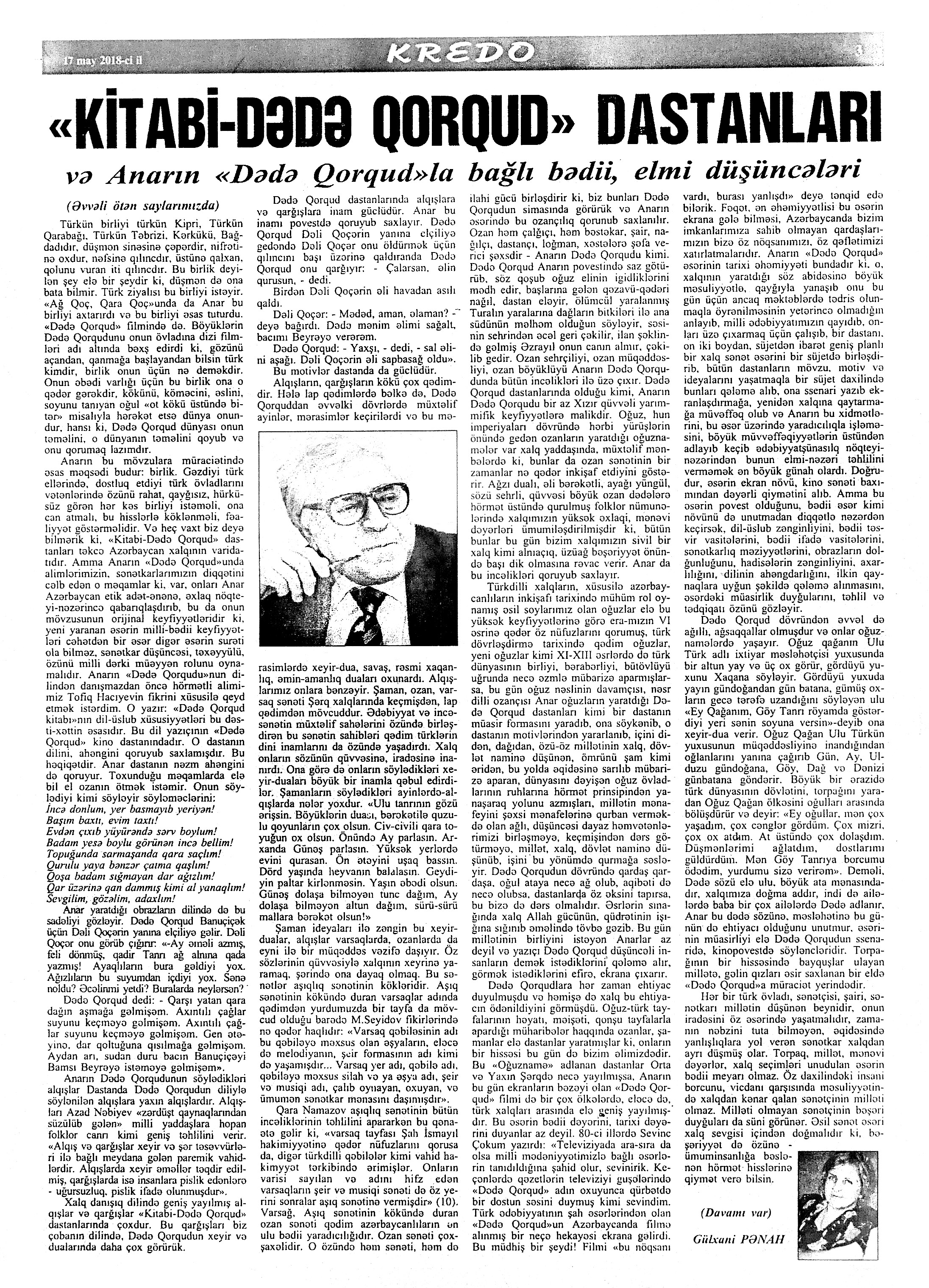 “Heyvanıstan” romanı haqqında] 1303. İsrailin tanınmış şairi Mətbuat Şurasında olub: [Pyotr Davıdov] //Səs.- 2018.-3 may.- S.9.; Mədəniyyət.-2018.- 4 may.- S.10. 1304. Karlyukeviç, A. Azərbaycan və Rıqor Borodulin – Ales Karlyukeviç: [müəlifin “Azərbaycan və Rıqor Borodulin” adlı məqaləsi haqqında] /tərc.etdi Kamran Nəzirli //Kaspi.-2018.- 12-14 may.- S.19. 1305. Kekelidze, G. Sənə məktublar: [gürcü ədəbiyyatı] /tərc etdi Neli Məmmədova //Ədəbiyyat qəzeti.-2018.- 19 may.- S.13. 1306. Qazaxıstanda Zəlimxan Yaqubun xatirəsi anılıb //Mədəniyyət.- 2018.- 9 may.- S.15. 1307. Məmmədzadə, S. Körpü: [Məmməd Orucun Rusiya ədəbiyyatından tərcümələri haqqında] //Ədəbiyyat qəzeti.-2018.- 19 may.- S.5. 1308. Müşfiq, Ş. “Kardeş kalemler”in may sayı: [Avrasiya Yazarlar Birliyinin mətbu orqanı böyük qazax şairi Ğalim Jaylıbaya həsr olunub] //525-ci qəzet.-2018.- 31 may.- S.6. 1309. Özer, A. Şeir bütün mədəniyyətlərin dinidir: Türkiyəli şair Adnan Özer: “İndiyə qədər intihar etməmişəmsə, bu, möcüzədir” /müsahibəni apardı Fərid Hüseyn //Kaspi.-2018.- 12-14 may.- S.13. 1310. Seyidli, P. Yaşamağı öyrədən roman: İqor Volnitskinin “Mənə ölməyi öyrət” romanındakı irfani şifrələr //Ədəbiyyat qəzeti. -2018.- 12 may.- S.26-27. 1311. Tahirli, A. Prof.dr. Okan Yeşilotun Azərbaycan sevgisi: [türk alimin araşdırmaları haqqında] //Ədəbiyyat qəzeti.- 2018.- 6 may.- S.15. 1312. Tanınmış qazax şairinin şeirləri Azərbaycan dilində: [Mağcan Cumabayın 125 illiyi ilə bağlı] //Mədəniyyət.- 2018.- 2 may.- S.15. 1313. Tanınmış Ukrayna ədibinin əsərləri ana dilimizdə: [Vladimir Danilenkonun “Qürub çağının işığında” kitabı] //Mədəniyyət.- 2018.- 9 may.- S.10. 1314. Türk dünyasının böyük yazıçısı Çingiz Aytmatov Bakıda yad olunub: [Türkdilli Ölkələrin Parlament Assambleyasının (TÜRKPA) Bakı ofisində] //Ədəbiyyat qəzeti.-2018.- 19 may.- S.3.; Mədəniyyət.- 2018.- 16 may. - S.2.