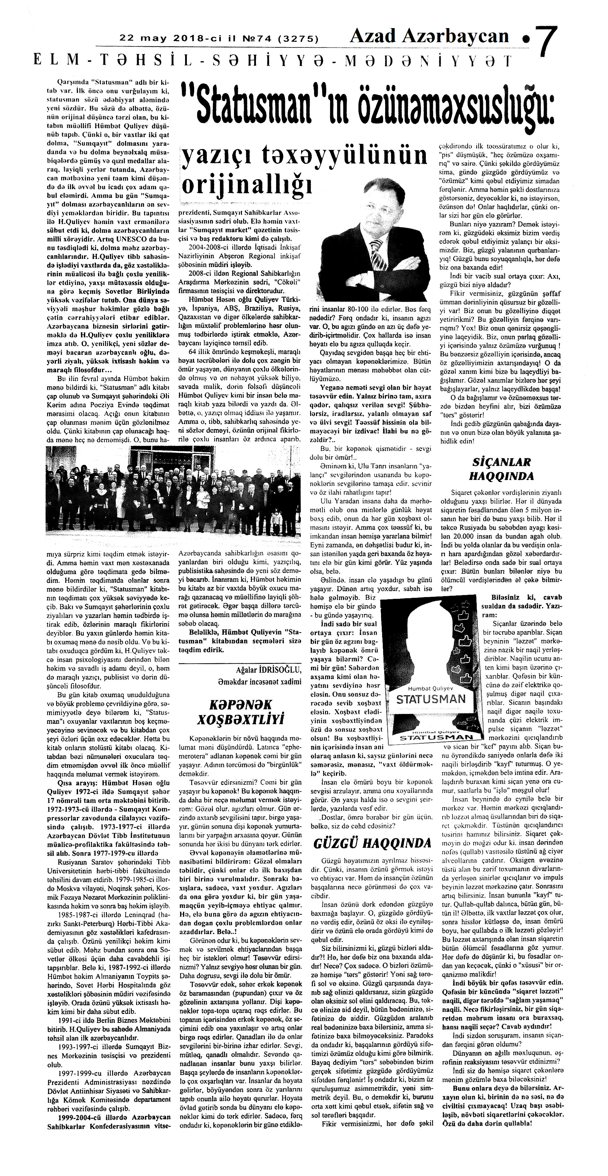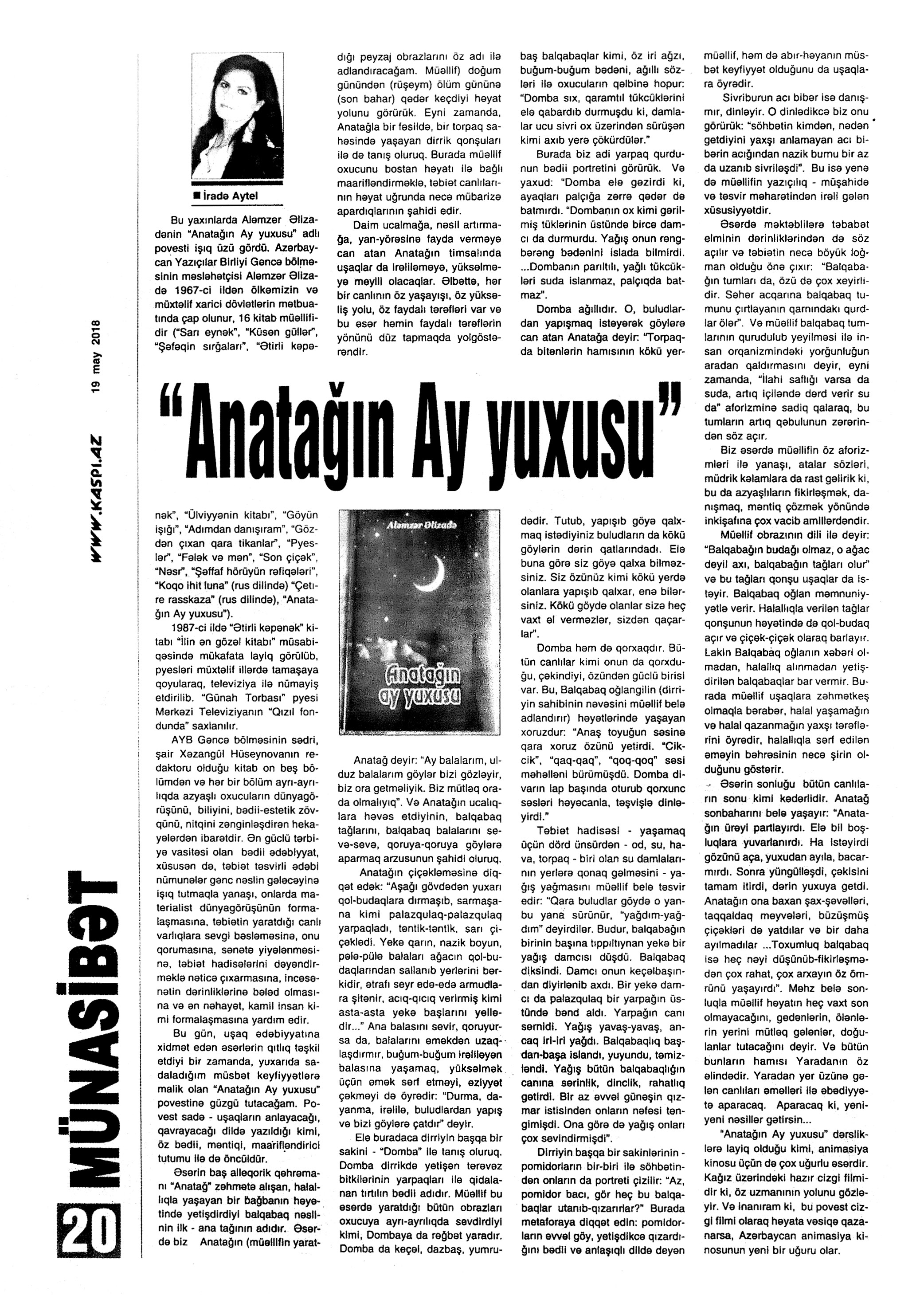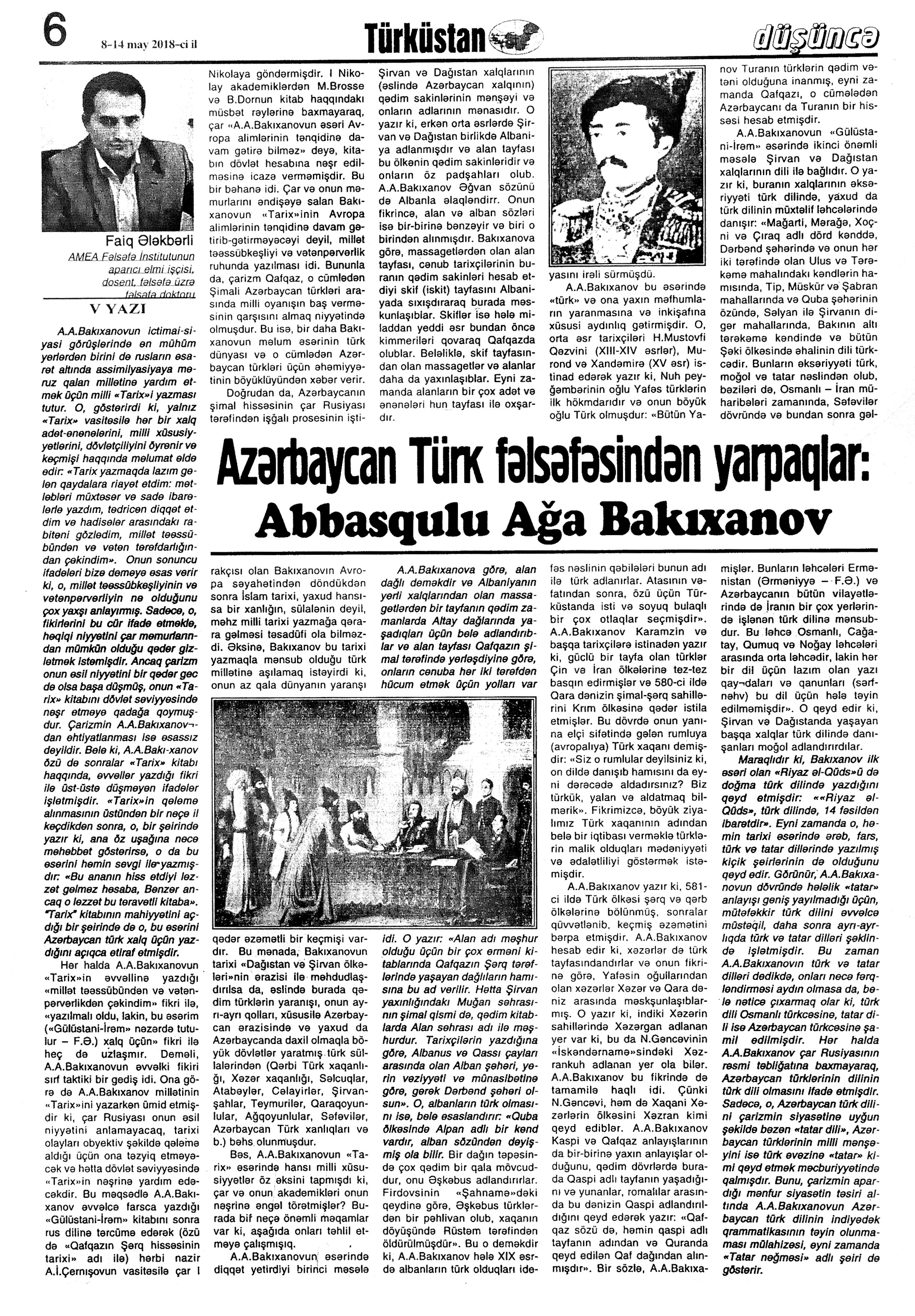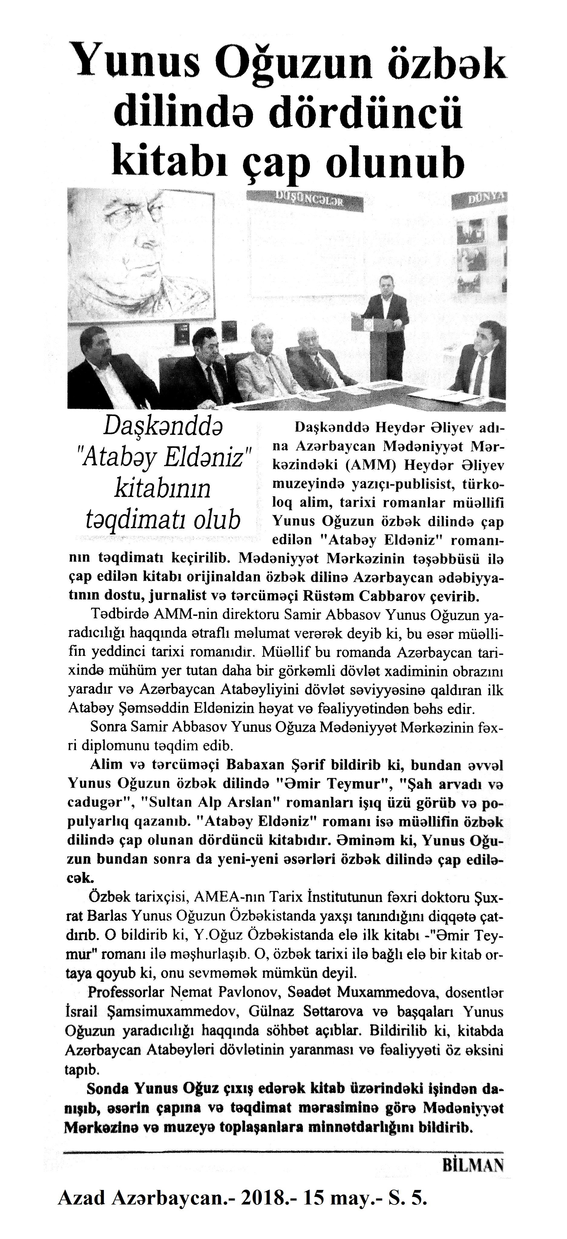“Tutunamayanlar” romanı haqqında] 1292. Babasoy, Ü. Zamanı kim oxşaya bilər ki –: [türk yazıçısı Mətin Kaçanın “Ağır roman”ı haqqında] //Ədəbiyyat qəzeti.-2018.- 19 may.- S.18-19. 1293. Bilman. Yunus Oğuzun özbək dilində dördüncü kitabı çap olunub: Daşkənddə “Atabəy Eldəniz” kitabının təqdimatı olub //Azad Azərbaycan. - 2018.- 15 may.- S.5. 1294. Camalova, Ş. “Ümid mələyi”nin dedikləri: [rus şairi Aleksandr Kerdanın eyniadlı kitabı haqqında] //525-ci qəzet.-2018.- 4 may.- S.7. 1295. Əzizəli, B. Paytaxtımız haqqında kitab: Muhsin Kadıoğlunun Bakı sevgisi: [türkiyəli yazarın “Bakı Gezi Rehberi” – “Bakı Turu bələdçisi” kitabı haqqında] //525-ci qəzet.-2018.- 15 may.- S.4. 1296. Fərəcov, S. Osmanlı ədəbi mühitinə yeniliklər gətirən ədib: Türk ədəbiyyatında ilk dəfə fransız dilində yazan İbrahim Şinasi yaradıcılığında folklora da geniş yer ayırıb: [şair, tərcüməçi, publisist haqqında] //Mədəniyyət-2018.-4 may.- S.15. 1297. Hacı K. “Sonu mutluluqla bitən kitab…”: [türk yazarı Osman Balcıgilin “Alagözlü Cəlilə” kitabı haqqında] //Ədalət.- 2018.- 22 may.- S.6. 1298. Həşimli, H. Azərbaycan ədəbi fikrində Məhtimqulu Fəraqi irsinə ilk müraciətin tarixindən //Ədəbiyyat qəzeti.- 2018.- 6 may.- S.18. 1299. Hikmət, N. İnsan mənzərələri: Pirayə xanıma: [türk ədəbiyyatı] /tərc.etdi Dilsuz //Ədəbiyyat qəzeti.- 2018.- 6 may.- S.16-17. 1300. Hikmət, N. İnsan mənzərələri: Pirayə xanıma: [türk ədəbiyyatı] /tərc.etdi Dilsuz //Ədəbiyyat qəzeti . -2018.- 12 may.- S.16-17. 1301. Hikmət, N. İnsan mənzərələri: Pirayə xanıma: [türk ədəbiyyatı] /tərc.etdi Dilsuz //Ədəbiyyat qəzeti.-2018.- 19 may.- S.16-17.