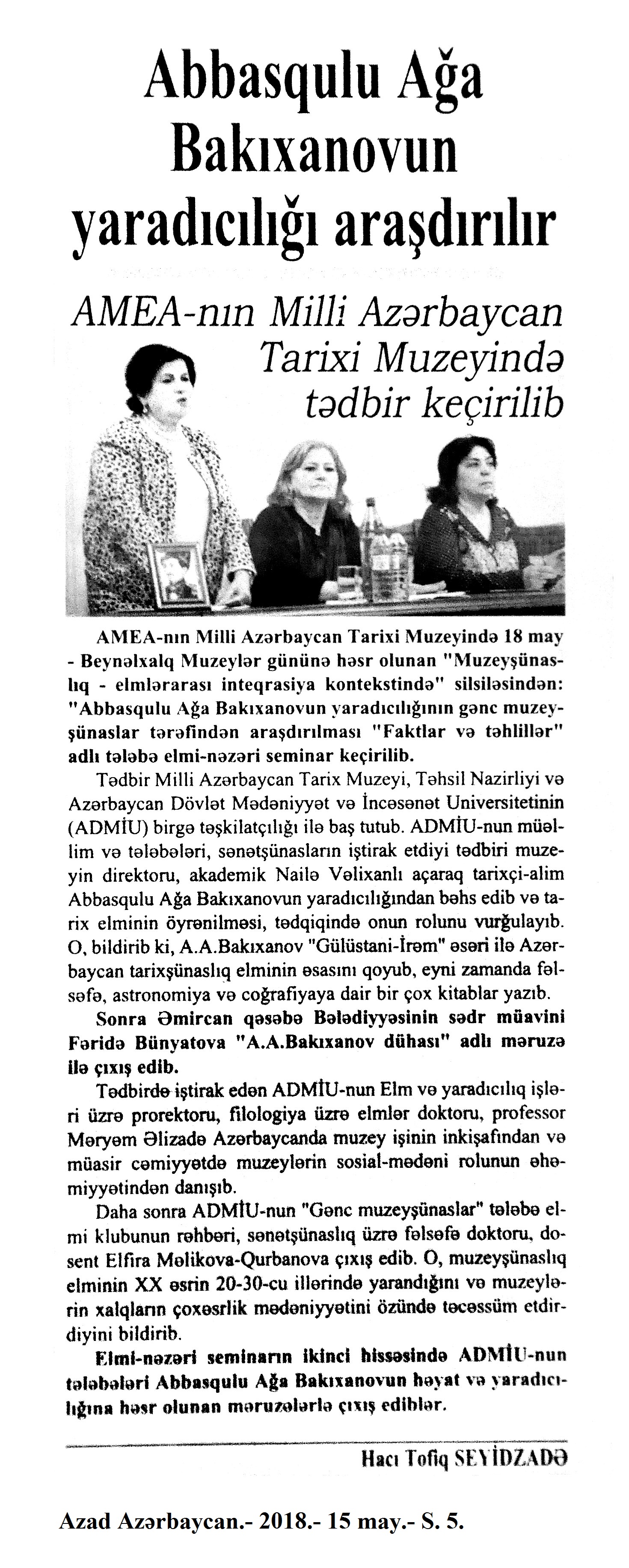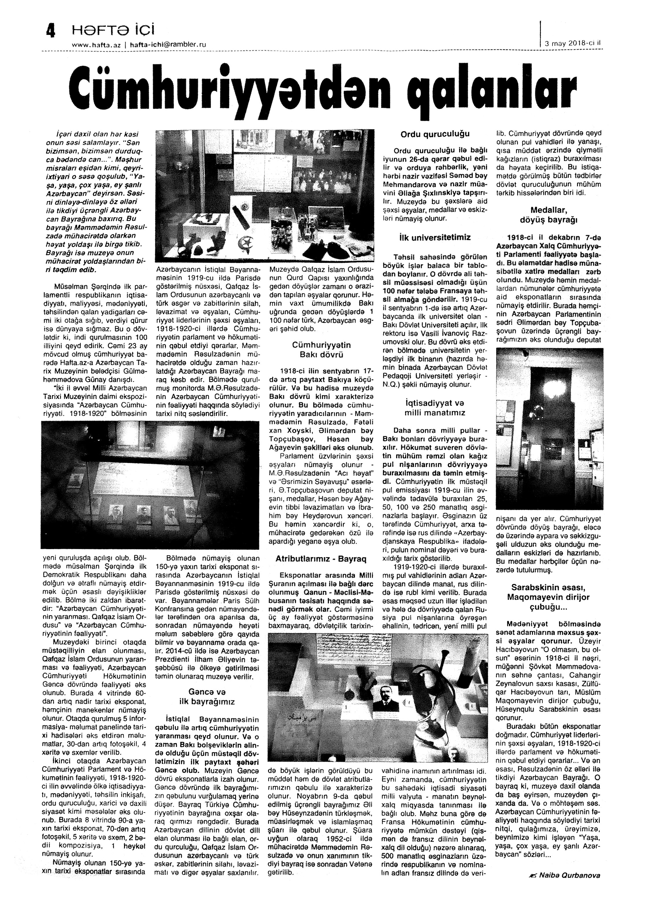 MUZEY İŞİ 617. Cəlil Məmmədquluzadənin ev-muzeyi yenilənir: [yeni ekspozisiyanın yaradılması ilə əlaqədar] //Mədəniyyət.-2018.- 18 may.- S. 4. 618. Həsənova, T. Azərbaycan tarixinin təbliğində muzeylərin rolu //Olaylar.- 2018.- 18 may.- S.10. 619. Milli İncəsənət Muzeyinə “Humay” mükafatı təqdim edilib: [“Bakılı” Beynəlxalq Mədəniyyət Cəmiyyəti tərəfindən təsis olunan eyniadlı mükafatın mədəniyyət xadimlərinə, sənət ocaqlarına, eləcə də idman və televiziya nümayəndələrinə təqdim edilməsi haqqında] //Mədəniyyət.-2018.- 23 may.- S.9. 620. Muzey işi sahəsində çalışanlara fəxri ad verilib: [“Əməkdar mədəniyyət işçisi” fəxri adı] //Mədəniyyət.-2018.- 23 may.- S.2. 621. Nərimanoğlu, M. Təbiətin canlı muzeyi: Ermənistanın işğalçılıq siyasəti nəticəsində xalqımıza məxsus 83500-dən çox eksponat, 14 xatirə kompleksi və 1891 maddi-mədəniyyət resursu talan olunub //Azərbaycan.- 2018.- 18 may.- S.7. 622. Sarıyeva, İ. Azərbaycan muzeylərində birgünlük açıq qapı ziyarəti… //Bakı Xəbər.- 2018.- 19-21 may.- S.13.
