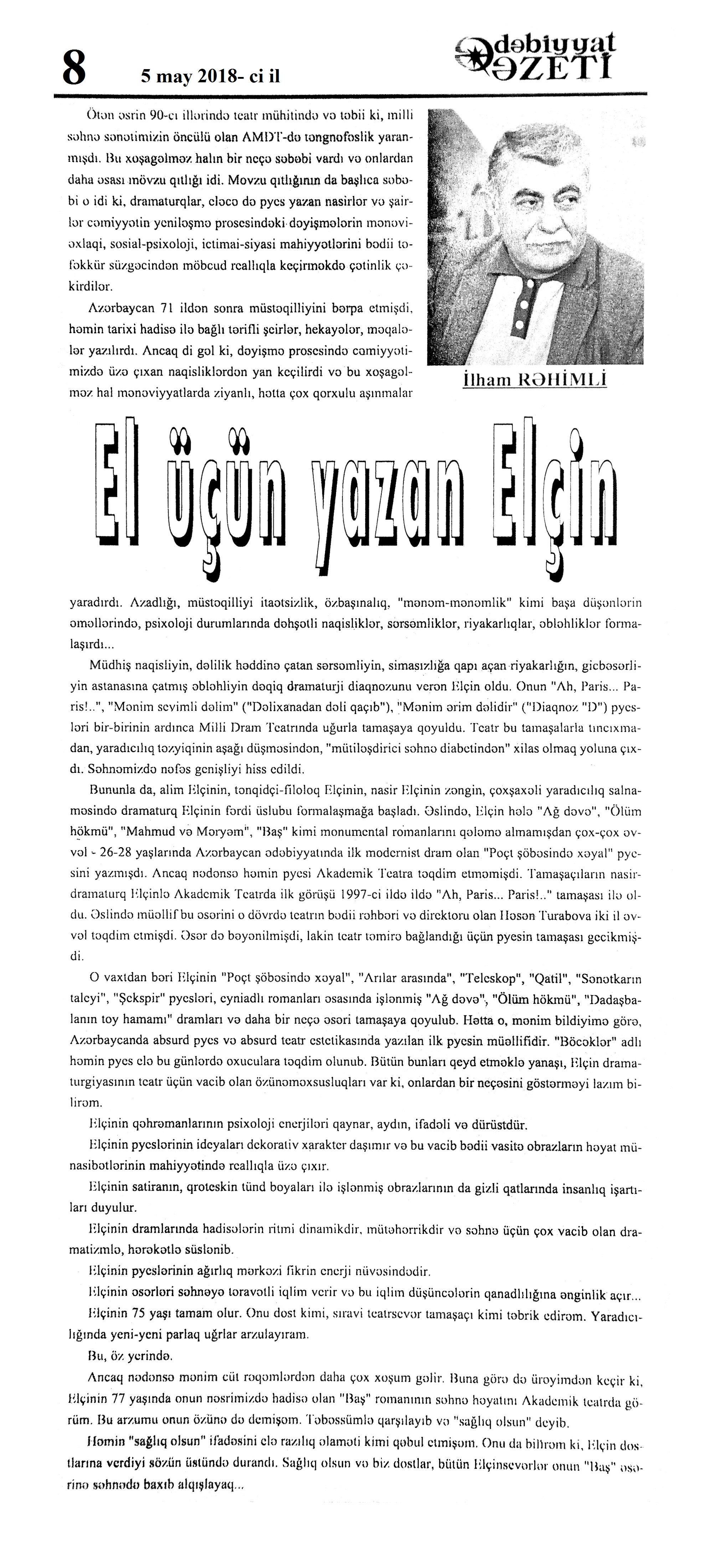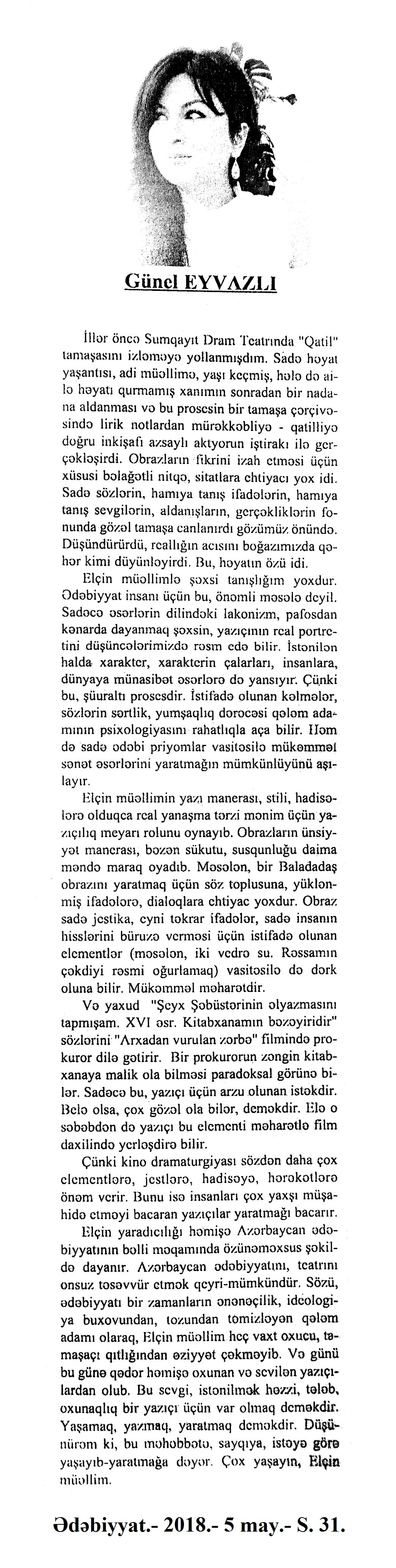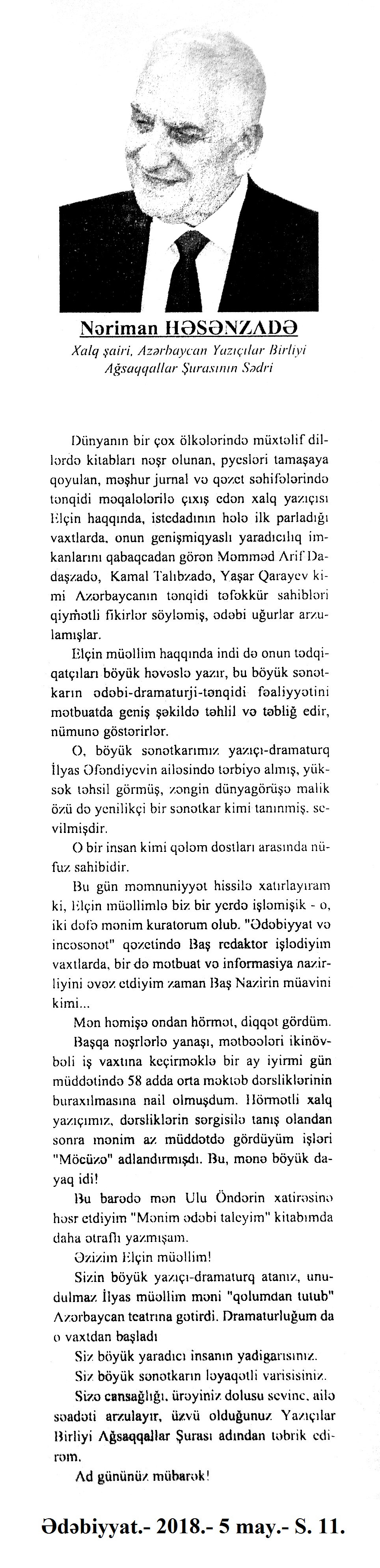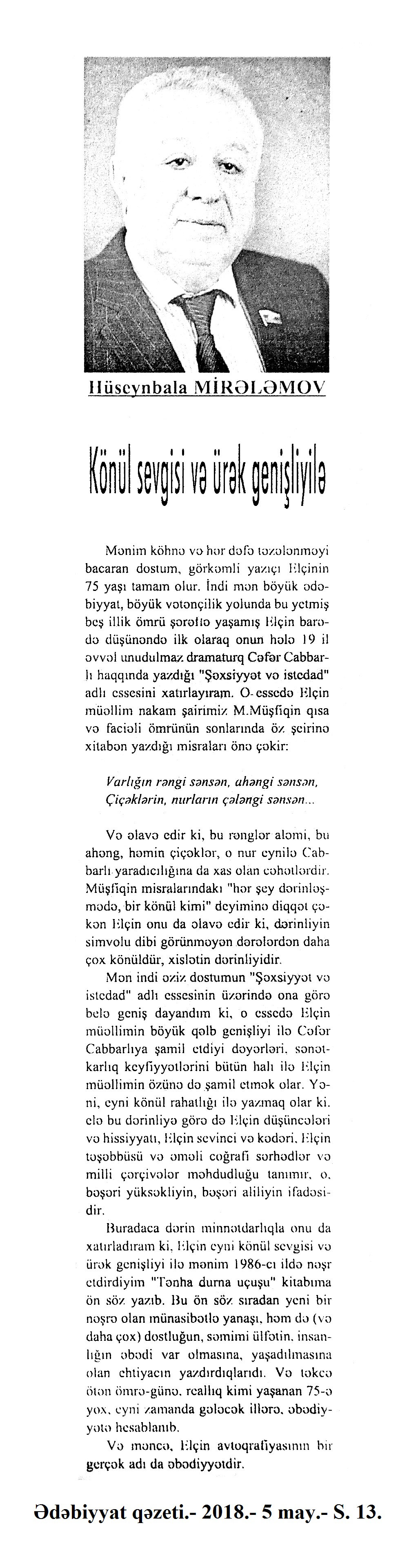“Baş” romanı Misirdə nəşr olunub 1204. Həbibbəyli, İ. Yeni ədəbiyyatın və müasir ədəbi tənqidin görkəmli yaradıcısı //Ədəbiyyat qəzeti: xüsusi buraxılış.- 2018.- 5 may.- S.16-18. 1205. Həsənzadə, N. Təbrik: [Xalq yazıçısı Elçinin yubileyi münasibətilə müəllifin təbriki] //Ədəbiyyat qəzeti: xüsusi buraxılış.- 2018.- 5 may.- S.11. 1206. Hüseynoğlu, S. Onu ürəyimcə yaşamaq üçün //Ədəbiyyat qəzeti: xüsusi buraxılış.- 2018.- 5 may.- S.22. 1207. “Xalq yazıçısı Elçin” adlı kitab sərgisi açıldı: [Milli Kitabxanada] //525-ci qəzet . -2018.- 15 may.- S. 7. 1208. Xalq yazıçısı Elçin “Şöhrət” ordeni ilə təltif edilib: [ədəbiyyatşünaslığın və ədəbi tənqidin inkişafı sahəsində səmərəli fəaliyyətinə görə] //Mədəniyyət.- 2018.-16 may.- S.2. 1209. Kamal Abdulla: Kosmik fəzada hamı eyni çəkidə olur: [Xalq yazıçısının yubileyi münasibətilə akademiklə müsahibə] /müsahibəni apardı Sərdar Amin //Ədəbiyyat qəzeti: xüsusi buraxılış.- 2018.- 5 may.- S.9. 1210. Kamal, R. Elçinin gümüşü günü //Ədəbiyyat qəzeti: xüsusi buraxılış.- 2018.- 5 may.- S.15. 1211. Qan T. Elçin bu günlərdə 75 yaşını qeyd edəcək... //Ədəbiyyat qəzeti: xüsusi buraxılış.- 2018.- 5 may.- S.31. 1212. Qismət, A. Dünyada elə yazıçılar da var ki... //Ədəbiyyat qəzeti: xüsusi buraxılış.- 2018.- 5 may.- S.19. 1213. Qiyas, Ə. Nəsrlə dramaturgiyanın qovuşduğu məqam //Ədəbiyyat qəzeti: xüsusi buraxılış.- 2018.- 5 may.- S.20. 1214. Qoca, F. Xalq yazıçısı Elçinə məktub: [Xalq yazıçısı Elçinin yubileyi münasibətilə] //Ədəbiyyat qəzeti: xüsusi buraxılış.-2018.- 5 may.- S.4. 1215. Məcid, R. Yazıçının sərvəti: Elçin – 75 //525-ci qəzet.-2018.- 12 may. - S.9. 1216. Məmmədli, R. Müqəddəs söz-sənət ocağının nurlu varisi: Elçin Əfəndiyev çağdaş Azərbaycan ədəbiyyatının canlı klassikidir //Azad Azərbaycan.- 2018.- 15 may.- S.7. 1217. Məmmədzadə, R. Elçin portreti //Ədəbiyyat qəzeti: xüsusi buraxılış. - 2018.- 5 may.- S.12. 1218. Məsud, A. Ədəbiyyat adamı: [yazıçının yubileyi münasibətilə Afaq Məsudun təbrik məktubu] //Xalq qəzeti.-2018.- 15 may.- S.6.; 525-ci qəzet.-2018.- 15 may.- S. 7.; Respublika.- 2018.- 15 may.- S.5. 1219. Mirələmov, H. Könül sevgisi və ürək genişliyilə //Ədəbiyyat qəzeti: xüsusi buraxılış.- 2018.- 5 may.- S.13. 1220. Mustafa, F. Uğurlarla zəngin yaradıcılıq yolu: Xalq yazıçısı Elçinin yaradıcılığında intertekstual əlaqələr //525-ci qəzet.-2018.- 8 may. - S.8. 1221. Nəsib, V. Zümrüd bəhəri, zümrüd baharı //Ədəbiyyat qəzeti: xüsusi buraxılış. - 2018.- 5 may.- S.13. 1222. Nəzirli, K. Yazıçının şəxsiyyəti //Ədəbiyyat qəzeti: xüsusi buraxılış.- 2018.- 5 may.- S.12. 1223. Osmanoğlu, M. Başın qayıdışı //Ədəbiyyat qəzeti: xüsusi buraxılış.- 2018.- 5 may.- S.14-15. 1224. Paşayev, Q. Qürur duyduğum yazıçı //Ədəbiyyat qəzeti: xüsusi buraxılış.- 2018.- 5 may.- S.20. 1225. Paşayeva, N. Nasir Elçin...: [Xalq yazıçısının yubileyi münasibətilə müəllifin təbriki] //Ədəbiyyat qəzeti: xüsusi buraxılış.-2018.- 5 may.- S.4. 1226. Pənah, G. Geriyə dönməyən zaman: (Monoqrafiyadan): Elçin – 75 //Kredo. - 2018.- 24 may.- S.3. 1227. Pənah, G. Geriyə dönməyən zaman: Elçin –75 //Kredo.-2018.- 31 may.- S.3. 1228. Rəhimli, İ. El üçün yazan Elçin //Ədəbiyyat qəzeti: xüsusi buraxılış. - 2018.- 5 may.- S.8. 1229. Rövşən, R. Sözlər: Elçinə //Ədəbiyyat qəzeti: xüsusi buraxılış.- 2018.- 5 may.- S.9. 1230. Rüstəmxanlı, S. Müdriklik zirvəsi //Ədəbiyyat qəzeti: xüsusi buraxılış.- 2018.- 5 may.- S.5. 1231. Rzayeva, M. Sabirdən müsahibə alan ilk və yeganə jurnalist – Salman Mümtazın jurnalist və publisistik fəaliyyəti böyük bir tarıxdir //Şərq.-2018.- 5 may.- S.11. 1232. Seyidzadə, C. Qatarlar və Çəhrayı qız: [Xalq yazıçısının “Bu dünyada qatarlar gedər” hekayəsi haqqında] //Ədəbiyyat qəzeti: xüsusi buraxılış.- 2018.- 5 may.- S.18. 1233. Səxavət, S. Yaşıl pencəkli oğlan //Ədəbiyyat qəzeti: xüsusi buraxılış. - 2018.- 5 may.- S.21. 1234. Süleymanlı, M. Mən Elçini həmişə...: [Xalq yazıçısının yubileyi münasibətilə müəllifin təbriki] //Ədəbiyyat qəzeti: xüsusi buraxılış . -2018.- 5 may.- S.4. 1235. Şəmsizadə, N. Ədəbi iftixarımız //Ədəbiyyat qəzeti: xüsusi buraxılış. - 2018.- 5 may.- S.6. 1236. Tahirli, A. Vətən üçün Elçin: Xalq yazıçısı, görkəmli ictimai xadim, tanınmiş ədəbiyyatşünas Elçinin 75 yaşı münasibətilə //525-ci qəzet.-2018.- 11 may. - S.7. 1237. Turan, A. Vətənin Elçini //Ədəbiyyat qəzeti: xüsusi buraxılış.- 2018.- 5 may.- S.32. 1238. Vahid, M. Sözlər və rənglər. Elçinin “Qatar. Pikasso. Latur. 1968” hekayəsi intermediallıq kontekstində: [Xalq yazıçısının eyniadlı hekayəsi haqqında] //Ədəbiyyat qəzeti: xüsusi buraxılış.- 2018.- 5 may.- S.25. 1239. Yusifli, V. Elçin haqqında nə demişlər...: [görkəmli elm xadimlərinin fikirləri] //Ədalət.-2018.- 23 may.- S.5. 1240. Yusifli, V. Ədəbiyyatımızın Elçini: Xalq yazıçısı, dramaturq, tənqidçi Elçin Əfəndiyevin 75 yaşı tamam olur //Mədəniyyət.-2018.- 11 may.- S.7.
