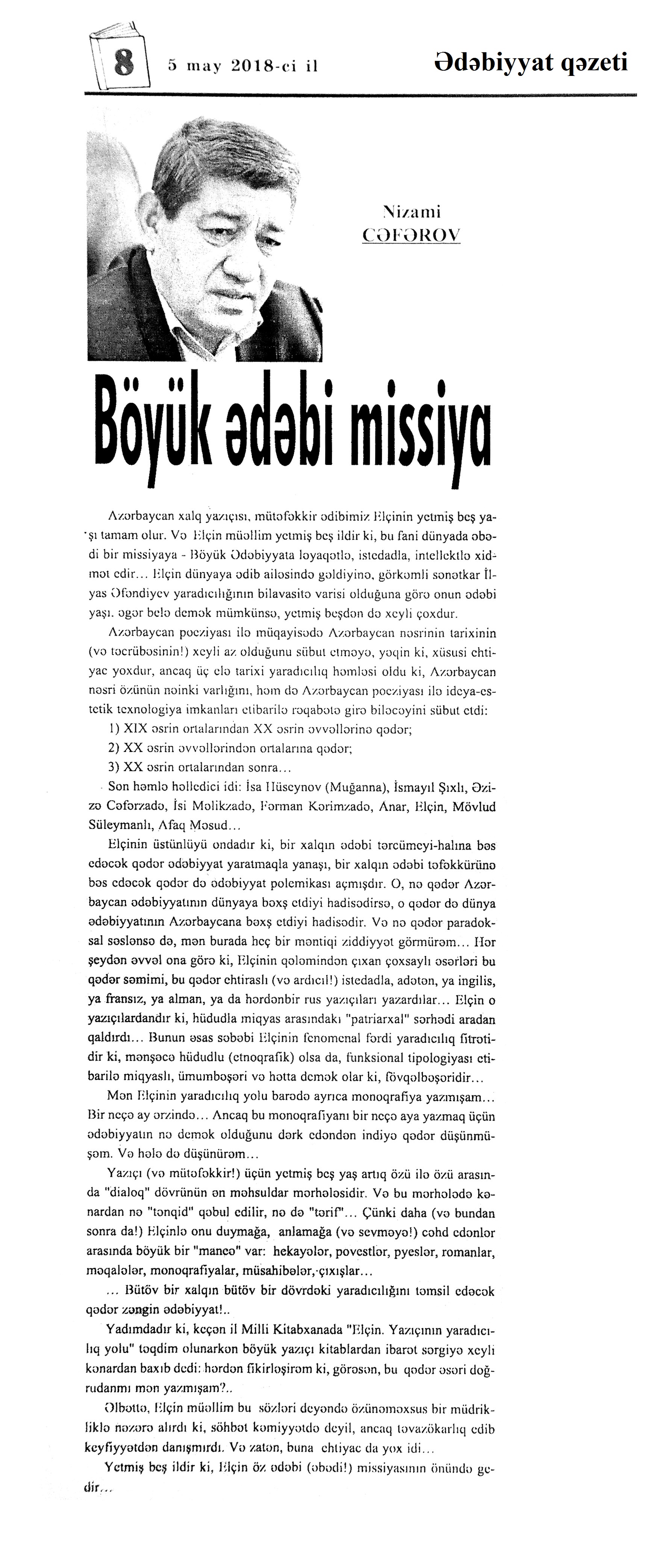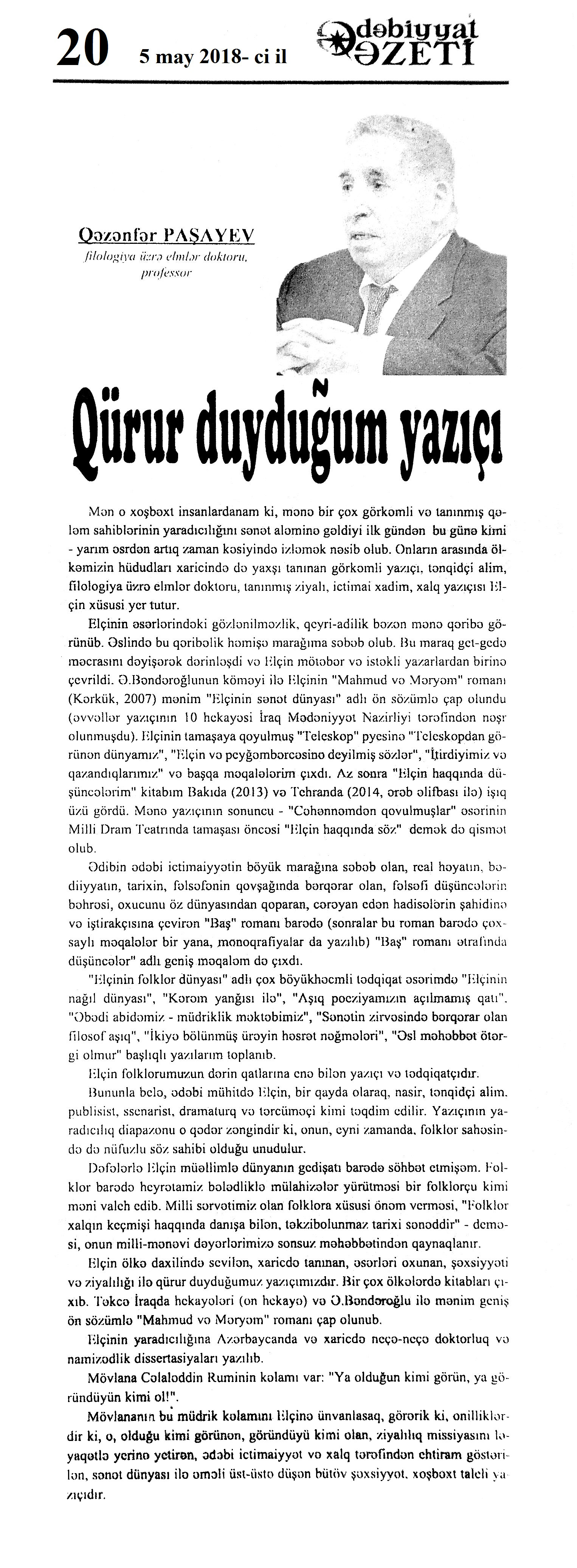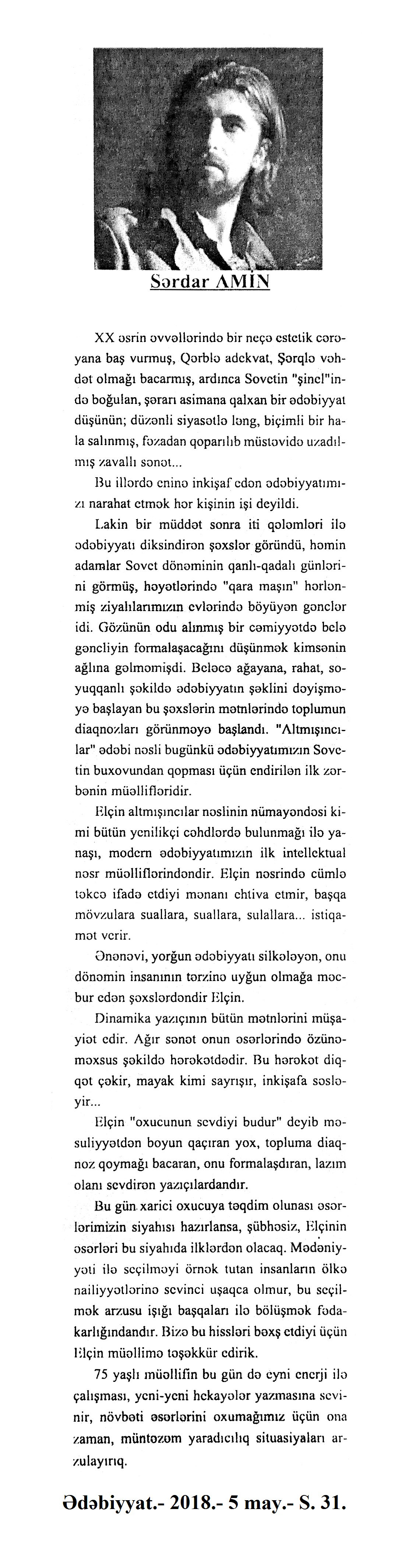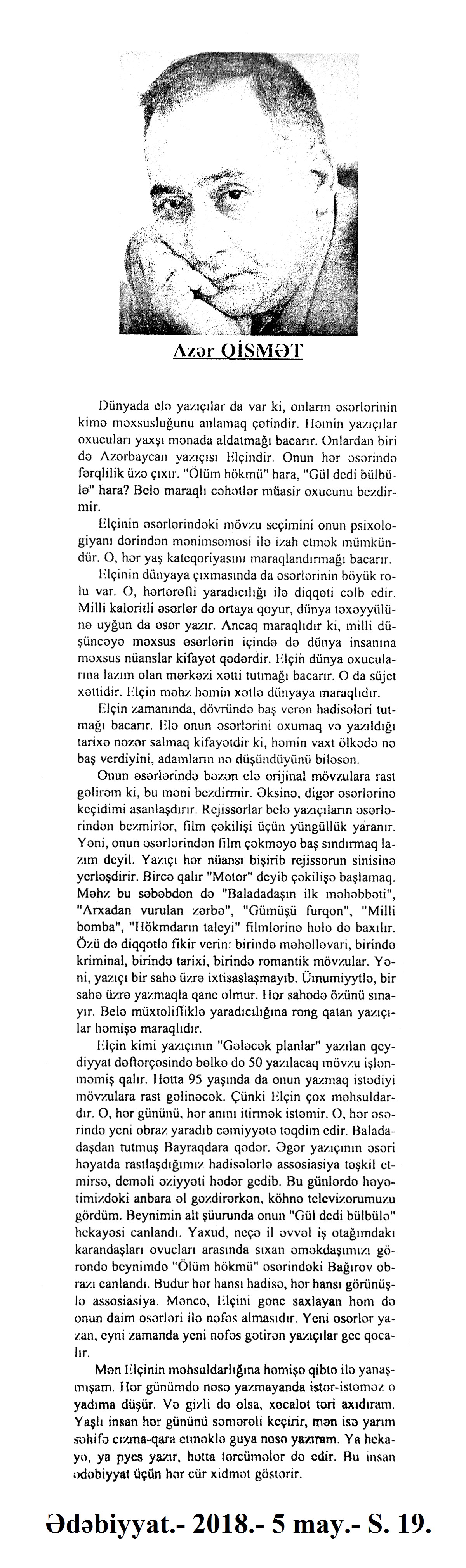 “Baş” romanı Misirdə nəşr olunub 1204. Həbibbəyli, İ. Yeni ədəbiyyatın və müasir ədəbi tənqidin görkəmli yaradıcısı //Ədəbiyyat qəzeti: xüsusi buraxılış.- 2018.- 5 may.- S.16-18. 1205. Həsənzadə, N. Təbrik: [Xalq yazıçısı Elçinin yubileyi münasibətilə müəllifin təbriki] //Ədəbiyyat qəzeti: xüsusi buraxılış.- 2018.- 5 may.- S.11. 1206. Hüseynoğlu, S. Onu ürəyimcə yaşamaq üçün //Ədəbiyyat qəzeti: xüsusi buraxılış.- 2018.- 5 may.- S.22. 1207. “Xalq yazıçısı Elçin” adlı kitab sərgisi açıldı: [Milli Kitabxanada] //525-ci qəzet . -2018.- 15 may.- S. 7. 1208. Xalq yazıçısı Elçin “Şöhrət” ordeni ilə təltif edilib: [ədəbiyyatşünaslığın və ədəbi tənqidin inkişafı sahəsində səmərəli fəaliyyətinə görə] //Mədəniyyət.- 2018.-16 may.- S.2. 1209. Kamal Abdulla: Kosmik fəzada hamı eyni çəkidə olur: [Xalq yazıçısının yubileyi münasibətilə akademiklə müsahibə] /müsahibəni apardı Sərdar Amin //Ədəbiyyat qəzeti: xüsusi buraxılış.- 2018.- 5 may.- S.9. 1210. Kamal, R. Elçinin gümüşü günü //Ədəbiyyat qəzeti: xüsusi buraxılış.- 2018.- 5 may.- S.15. 1211. Qan T. Elçin bu günlərdə 75 yaşını qeyd edəcək... //Ədəbiyyat qəzeti: xüsusi buraxılış.- 2018.- 5 may.- S.31. 1212. Qismət, A. Dünyada elə yazıçılar da var ki... //Ədəbiyyat qəzeti: xüsusi buraxılış.- 2018.- 5 may.- S.19. 1213. Qiyas, Ə. Nəsrlə dramaturgiyanın qovuşduğu məqam //Ədəbiyyat qəzeti: xüsusi buraxılış.- 2018.- 5 may.- S.20. 1214. Qoca, F. Xalq yazıçısı Elçinə məktub: [Xalq yazıçısı Elçinin yubileyi münasibətilə] //Ədəbiyyat qəzeti: xüsusi buraxılış.-2018.- 5 may.- S.4. 1215. Məcid, R. Yazıçının sərvəti: Elçin – 75 //525-ci qəzet.-2018.- 12 may. - S.9. 1216. Məmmədli, R. Müqəddəs söz-sənət ocağının nurlu varisi: Elçin Əfəndiyev çağdaş Azərbaycan ədəbiyyatının canlı klassikidir //Azad Azərbaycan.- 2018.- 15 may.- S.7. 1217. Məmmədzadə, R. Elçin portreti //Ədəbiyyat qəzeti: xüsusi buraxılış. - 2018.- 5 may.- S.12. 1218. Məsud, A. Ədəbiyyat adamı: [yazıçının yubileyi münasibətilə Afaq Məsudun təbrik məktubu] //Xalq qəzeti.-2018.- 15 may.- S.6.; 525-ci qəzet.-2018.- 15 may.- S. 7.; Respublika.- 2018.- 15 may.- S.5. 1219. Mirələmov, H. Könül sevgisi və ürək genişliyilə //Ədəbiyyat qəzeti: xüsusi buraxılış.- 2018.- 5 may.- S.13. 1220. Mustafa, F. Uğurlarla zəngin yaradıcılıq yolu: Xalq yazıçısı Elçinin yaradıcılığında intertekstual əlaqələr //525-ci qəzet.-2018.- 8 may. - S.8. 1221. Nəsib, V. Zümrüd bəhəri, zümrüd baharı //Ədəbiyyat qəzeti: xüsusi buraxılış. - 2018.- 5 may.- S.13. 1222. Nəzirli, K. Yazıçının şəxsiyyəti //Ədəbiyyat qəzeti: xüsusi buraxılış.- 2018.- 5 may.- S.12. 1223. Osmanoğlu, M. Başın qayıdışı //Ədəbiyyat qəzeti: xüsusi buraxılış.- 2018.- 5 may.- S.14-15. 1224. Paşayev, Q. Qürur duyduğum yazıçı //Ədəbiyyat qəzeti: xüsusi buraxılış.- 2018.- 5 may.- S.20. 1225. Paşayeva, N. Nasir Elçin...: [Xalq yazıçısının yubileyi münasibətilə müəllifin təbriki] //Ədəbiyyat qəzeti: xüsusi buraxılış.-2018.- 5 may.- S.4. 1226. Pənah, G. Geriyə dönməyən zaman: (Monoqrafiyadan): Elçin – 75 //Kredo. - 2018.- 24 may.- S.3. 1227. Pənah, G. Geriyə dönməyən zaman: Elçin –75 //Kredo.-2018.- 31 may.- S.3. 1228. Rəhimli, İ. El üçün yazan Elçin //Ədəbiyyat qəzeti: xüsusi buraxılış. - 2018.- 5 may.- S.8. 1229. Rövşən, R. Sözlər: Elçinə //Ədəbiyyat qəzeti: xüsusi buraxılış.- 2018.- 5 may.- S.9. 1230. Rüstəmxanlı, S. Müdriklik zirvəsi //Ədəbiyyat qəzeti: xüsusi buraxılış.- 2018.- 5 may.- S.5. 1231. Rzayeva, M. Sabirdən müsahibə alan ilk və yeganə jurnalist – Salman Mümtazın jurnalist və publisistik fəaliyyəti böyük bir tarıxdir //Şərq.-2018.- 5 may.- S.11. 1232. Seyidzadə, C. Qatarlar və Çəhrayı qız: [Xalq yazıçısının “Bu dünyada qatarlar gedər” hekayəsi haqqında] //Ədəbiyyat qəzeti: xüsusi buraxılış.- 2018.- 5 may.- S.18. 1233. Səxavət, S. Yaşıl pencəkli oğlan //Ədəbiyyat qəzeti: xüsusi buraxılış. - 2018.- 5 may.- S.21. 1234. Süleymanlı, M. Mən Elçini həmişə...: [Xalq yazıçısının yubileyi münasibətilə müəllifin təbriki] //Ədəbiyyat qəzeti: xüsusi buraxılış . -2018.- 5 may.- S.4. 1235. Şəmsizadə, N. Ədəbi iftixarımız //Ədəbiyyat qəzeti: xüsusi buraxılış. - 2018.- 5 may.- S.6. 1236. Tahirli, A. Vətən üçün Elçin: Xalq yazıçısı, görkəmli ictimai xadim, tanınmiş ədəbiyyatşünas Elçinin 75 yaşı münasibətilə //525-ci qəzet.-2018.- 11 may. - S.7. 1237. Turan, A. Vətənin Elçini //Ədəbiyyat qəzeti: xüsusi buraxılış.- 2018.- 5 may.- S.32. 1238. Vahid, M. Sözlər və rənglər. Elçinin “Qatar. Pikasso. Latur. 1968” hekayəsi intermediallıq kontekstində: [Xalq yazıçısının eyniadlı hekayəsi haqqında] //Ədəbiyyat qəzeti: xüsusi buraxılış.- 2018.- 5 may.- S.25. 1239. Yusifli, V. Elçin haqqında nə demişlər...: [görkəmli elm xadimlərinin fikirləri] //Ədalət.-2018.- 23 may.- S.5. 1240. Yusifli, V. Ədəbiyyatımızın Elçini: Xalq yazıçısı, dramaturq, tənqidçi Elçin Əfəndiyevin 75 yaşı tamam olur //Mədəniyyət.-2018.- 11 may.- S.7.