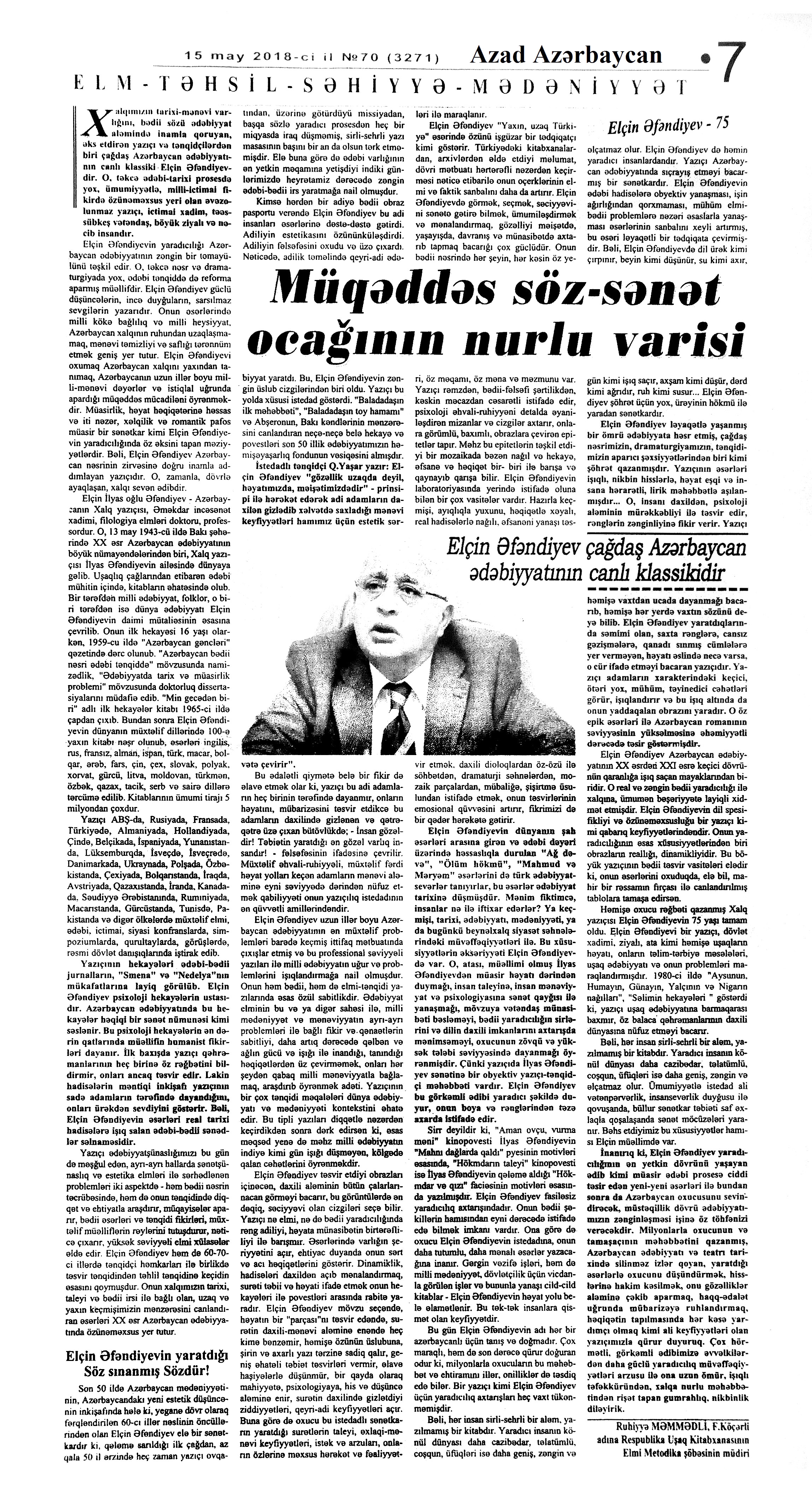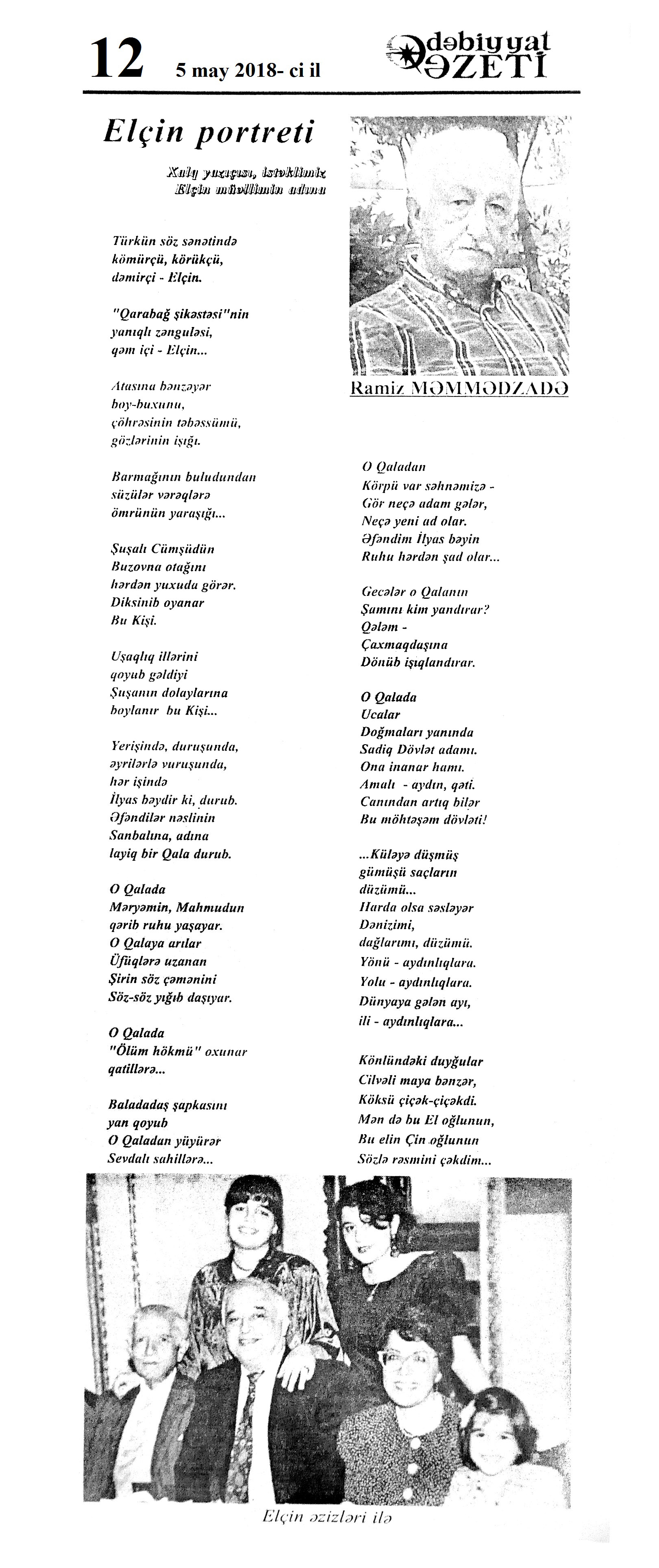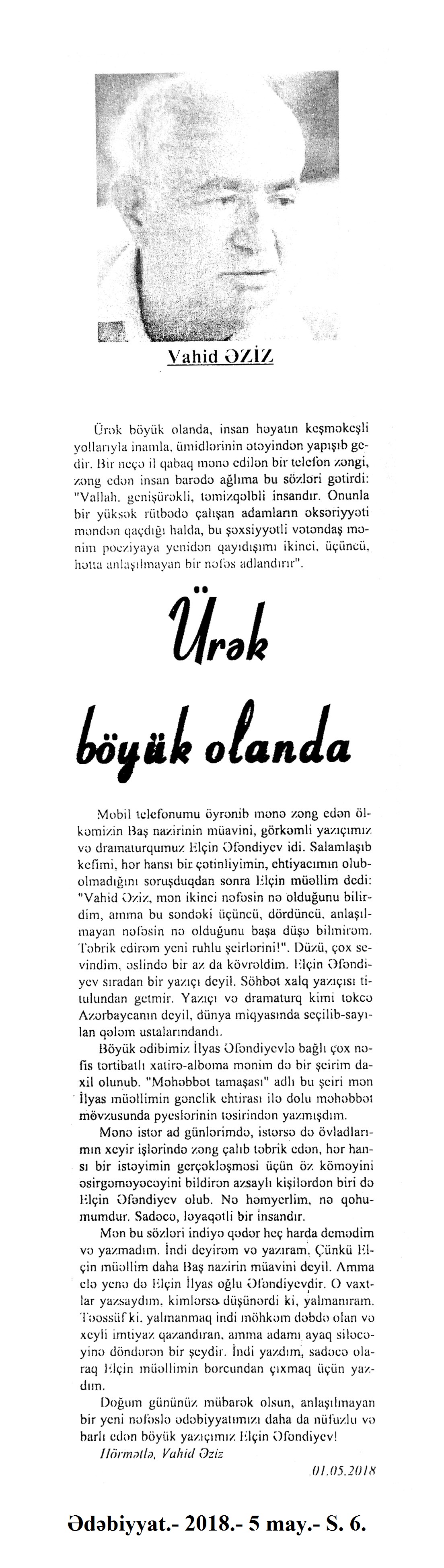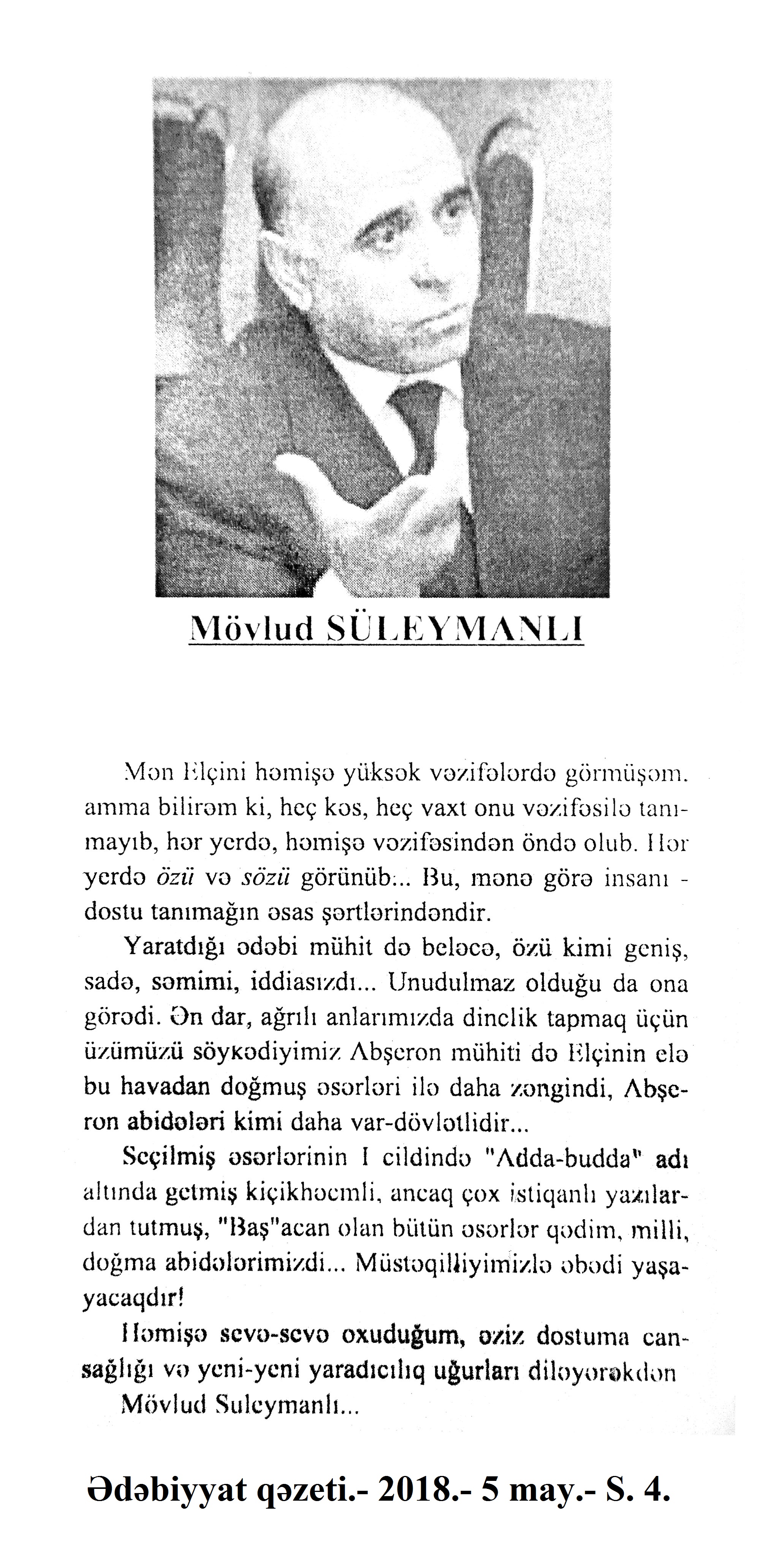 “Baş” romanı Misirdə nəşr olunub 1204. Həbibbəyli, İ. Yeni ədəbiyyatın və müasir ədəbi tənqidin görkəmli yaradıcısı //Ədəbiyyat qəzeti: xüsusi buraxılış.- 2018.- 5 may.- S.16-18. 1205. Həsənzadə, N. Təbrik: [Xalq yazıçısı Elçinin yubileyi münasibətilə müəllifin təbriki] //Ədəbiyyat qəzeti: xüsusi buraxılış.- 2018.- 5 may.- S.11. 1206. Hüseynoğlu, S. Onu ürəyimcə yaşamaq üçün //Ədəbiyyat qəzeti: xüsusi buraxılış.- 2018.- 5 may.- S.22. 1207. “Xalq yazıçısı Elçin” adlı kitab sərgisi açıldı: [Milli Kitabxanada] //525-ci qəzet . -2018.- 15 may.- S. 7. 1208. Xalq yazıçısı Elçin “Şöhrət” ordeni ilə təltif edilib: [ədəbiyyatşünaslığın və ədəbi tənqidin inkişafı sahəsində səmərəli fəaliyyətinə görə] //Mədəniyyət.- 2018.-16 may.- S.2. 1209. Kamal Abdulla: Kosmik fəzada hamı eyni çəkidə olur: [Xalq yazıçısının yubileyi münasibətilə akademiklə müsahibə] /müsahibəni apardı Sərdar Amin //Ədəbiyyat qəzeti: xüsusi buraxılış.- 2018.- 5 may.- S.9. 1210. Kamal, R. Elçinin gümüşü günü //Ədəbiyyat qəzeti: xüsusi buraxılış.- 2018.- 5 may.- S.15. 1211. Qan T. Elçin bu günlərdə 75 yaşını qeyd edəcək... //Ədəbiyyat qəzeti: xüsusi buraxılış.- 2018.- 5 may.- S.31. 1212. Qismət, A. Dünyada elə yazıçılar da var ki... //Ədəbiyyat qəzeti: xüsusi buraxılış.- 2018.- 5 may.- S.19. 1213. Qiyas, Ə. Nəsrlə dramaturgiyanın qovuşduğu məqam //Ədəbiyyat qəzeti: xüsusi buraxılış.- 2018.- 5 may.- S.20. 1214. Qoca, F. Xalq yazıçısı Elçinə məktub: [Xalq yazıçısı Elçinin yubileyi münasibətilə] //Ədəbiyyat qəzeti: xüsusi buraxılış.-2018.- 5 may.- S.4. 1215. Məcid, R. Yazıçının sərvəti: Elçin – 75 //525-ci qəzet.-2018.- 12 may. - S.9. 1216. Məmmədli, R. Müqəddəs söz-sənət ocağının nurlu varisi: Elçin Əfəndiyev çağdaş Azərbaycan ədəbiyyatının canlı klassikidir //Azad Azərbaycan.- 2018.- 15 may.- S.7. 1217. Məmmədzadə, R. Elçin portreti //Ədəbiyyat qəzeti: xüsusi buraxılış. - 2018.- 5 may.- S.12. 1218. Məsud, A. Ədəbiyyat adamı: [yazıçının yubileyi münasibətilə Afaq Məsudun təbrik məktubu] //Xalq qəzeti.-2018.- 15 may.- S.6.; 525-ci qəzet.-2018.- 15 may.- S. 7.; Respublika.- 2018.- 15 may.- S.5. 1219. Mirələmov, H. Könül sevgisi və ürək genişliyilə //Ədəbiyyat qəzeti: xüsusi buraxılış.- 2018.- 5 may.- S.13. 1220. Mustafa, F. Uğurlarla zəngin yaradıcılıq yolu: Xalq yazıçısı Elçinin yaradıcılığında intertekstual əlaqələr //525-ci qəzet.-2018.- 8 may. - S.8. 1221. Nəsib, V. Zümrüd bəhəri, zümrüd baharı //Ədəbiyyat qəzeti: xüsusi buraxılış. - 2018.- 5 may.- S.13. 1222. Nəzirli, K. Yazıçının şəxsiyyəti //Ədəbiyyat qəzeti: xüsusi buraxılış.- 2018.- 5 may.- S.12. 1223. Osmanoğlu, M. Başın qayıdışı //Ədəbiyyat qəzeti: xüsusi buraxılış.- 2018.- 5 may.- S.14-15. 1224. Paşayev, Q. Qürur duyduğum yazıçı //Ədəbiyyat qəzeti: xüsusi buraxılış.- 2018.- 5 may.- S.20. 1225. Paşayeva, N. Nasir Elçin...: [Xalq yazıçısının yubileyi münasibətilə müəllifin təbriki] //Ədəbiyyat qəzeti: xüsusi buraxılış.-2018.- 5 may.- S.4. 1226. Pənah, G. Geriyə dönməyən zaman: (Monoqrafiyadan): Elçin – 75 //Kredo. - 2018.- 24 may.- S.3. 1227. Pənah, G. Geriyə dönməyən zaman: Elçin –75 //Kredo.-2018.- 31 may.- S.3. 1228. Rəhimli, İ. El üçün yazan Elçin //Ədəbiyyat qəzeti: xüsusi buraxılış. - 2018.- 5 may.- S.8. 1229. Rövşən, R. Sözlər: Elçinə //Ədəbiyyat qəzeti: xüsusi buraxılış.- 2018.- 5 may.- S.9. 1230. Rüstəmxanlı, S. Müdriklik zirvəsi //Ədəbiyyat qəzeti: xüsusi buraxılış.- 2018.- 5 may.- S.5. 1231. Rzayeva, M. Sabirdən müsahibə alan ilk və yeganə jurnalist – Salman Mümtazın jurnalist və publisistik fəaliyyəti böyük bir tarıxdir //Şərq.-2018.- 5 may.- S.11. 1232. Seyidzadə, C. Qatarlar və Çəhrayı qız: [Xalq yazıçısının “Bu dünyada qatarlar gedər” hekayəsi haqqında] //Ədəbiyyat qəzeti: xüsusi buraxılış.- 2018.- 5 may.- S.18. 1233. Səxavət, S. Yaşıl pencəkli oğlan //Ədəbiyyat qəzeti: xüsusi buraxılış. - 2018.- 5 may.- S.21. 1234. Süleymanlı, M. Mən Elçini həmişə...: [Xalq yazıçısının yubileyi münasibətilə müəllifin təbriki] //Ədəbiyyat qəzeti: xüsusi buraxılış . -2018.- 5 may.- S.4. 1235. Şəmsizadə, N. Ədəbi iftixarımız //Ədəbiyyat qəzeti: xüsusi buraxılış. - 2018.- 5 may.- S.6. 1236. Tahirli, A. Vətən üçün Elçin: Xalq yazıçısı, görkəmli ictimai xadim, tanınmiş ədəbiyyatşünas Elçinin 75 yaşı münasibətilə //525-ci qəzet.-2018.- 11 may. - S.7. 1237. Turan, A. Vətənin Elçini //Ədəbiyyat qəzeti: xüsusi buraxılış.- 2018.- 5 may.- S.32. 1238. Vahid, M. Sözlər və rənglər. Elçinin “Qatar. Pikasso. Latur. 1968” hekayəsi intermediallıq kontekstində: [Xalq yazıçısının eyniadlı hekayəsi haqqında] //Ədəbiyyat qəzeti: xüsusi buraxılış.- 2018.- 5 may.- S.25. 1239. Yusifli, V. Elçin haqqında nə demişlər...: [görkəmli elm xadimlərinin fikirləri] //Ədalət.-2018.- 23 may.- S.5. 1240. Yusifli, V. Ədəbiyyatımızın Elçini: Xalq yazıçısı, dramaturq, tənqidçi Elçin Əfəndiyevin 75 yaşı tamam olur //Mədəniyyət.-2018.- 11 may.- S.7.