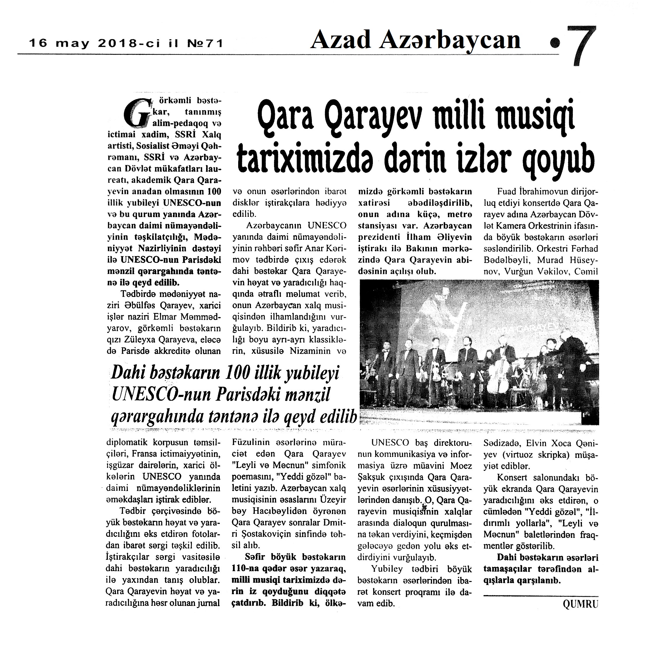 Qara Qarayev – 100 718. Azərbaycan Prezidenti mədəniyyətə və incəsənətə xüsusi diqqət göstərir: Züleyxa Qarayeva: Arzu edirəm ki, ölkəmiz həmişə belə çiçəklənsin və inkişaf etsin: [Bu fikri Q.Qarayevin yubileyi münasibətilə UNESCO-nun mənzil-qərargahında keçirilən təntənəli tədbirdə iştirak edən böyük bəstəkarın qızı AZƏRTAC-a müsahibəsində deyib] //Mədəniyyət.-2018.- 16 may.- S.3. 719. Əhədli, Ə. Dahi bəstəkar Qara Qarayevin 100 illiyinə //Xalq qəzeti.- 2018.- 24 may.- S.12. 720. Əlizadə, F. Düşündürən musiqi //525-ci qəzet. - 2018.- 31 may.- S.7. 721. Görkəmli bəstəkar Qara Qarayevin xatirəsi anılıb: [Fəxri xiyabanda] //Mədəniyyət.-2018.- 16 may.- S.11. 722. Hüseynov, F. Dahi bəstəkarın 100 illiyinə həsr olunan musiqi axşamı: [Akademik Filarmoniyada orqan musiqisi axşamının keçirilməsi haqqında] //Mədəniyyət.-2018.- 23 may.- S.2. 723. Xədicə. Bakıda Qara Qarayevin xatirəsi anıldı: [Fəxri xiyabanda] //525-ci qəzet.- 2018.- 15 may.- S.7. 724. Xədicə. Qara Qarayevin 100 illik yubileyi UNESCO-da qeyd edildi //525-ci qəzet.- 2018.- 16 may.- S.7. 725. Xədicə. Qara Qarayevin 100 illiyi Parisdə qeyd olundu //525-ci qəzet.- 2018.- 1 may.- S.7. 726. Qumru. Qara Qarayev milli müsiqi tariximizdə dərin izlər qoyub: Dahi bəstəkarın 100 illik yubileyi UNESCO-nun Parisdəki mənzil-qərargahında təntənə ilə qeyd edilib //Azad Azərbaycan.- 2018.- 16 may.- S.7. 727. Parisdə dahi bəstəkarın yubileyi qeyd olunub //Mədəniyyət.- 2018.- 2 may.- S.8. 728. Sultanova, M. Qara Qarayevin musiqiləri Kayseridə səslənib //Mədəniyyət.-2018.- 23 may.- S.16. 729. UNESCO-da Azərbaycan musiqisinin təntənəsi: Dahi bəstəkar Qara Qarayevin 100 illik yubileyi Parisdə qeyd edilib //Mədəniyyət.-2018.- 16 may.- S.3. 730. Yeddi səsdən doğan sərvət - elm və musiqi: Dahi bəstəkara həsr olunmuş layihənin təqdimatı: [Dillər Universitetinin akt zalında bəstəkarın yubileyinə həsr olunmuş eyniadlı layihənin təqdimatı haqqında] //Mədəniyyət.-2018.- 30 may.- S.9.