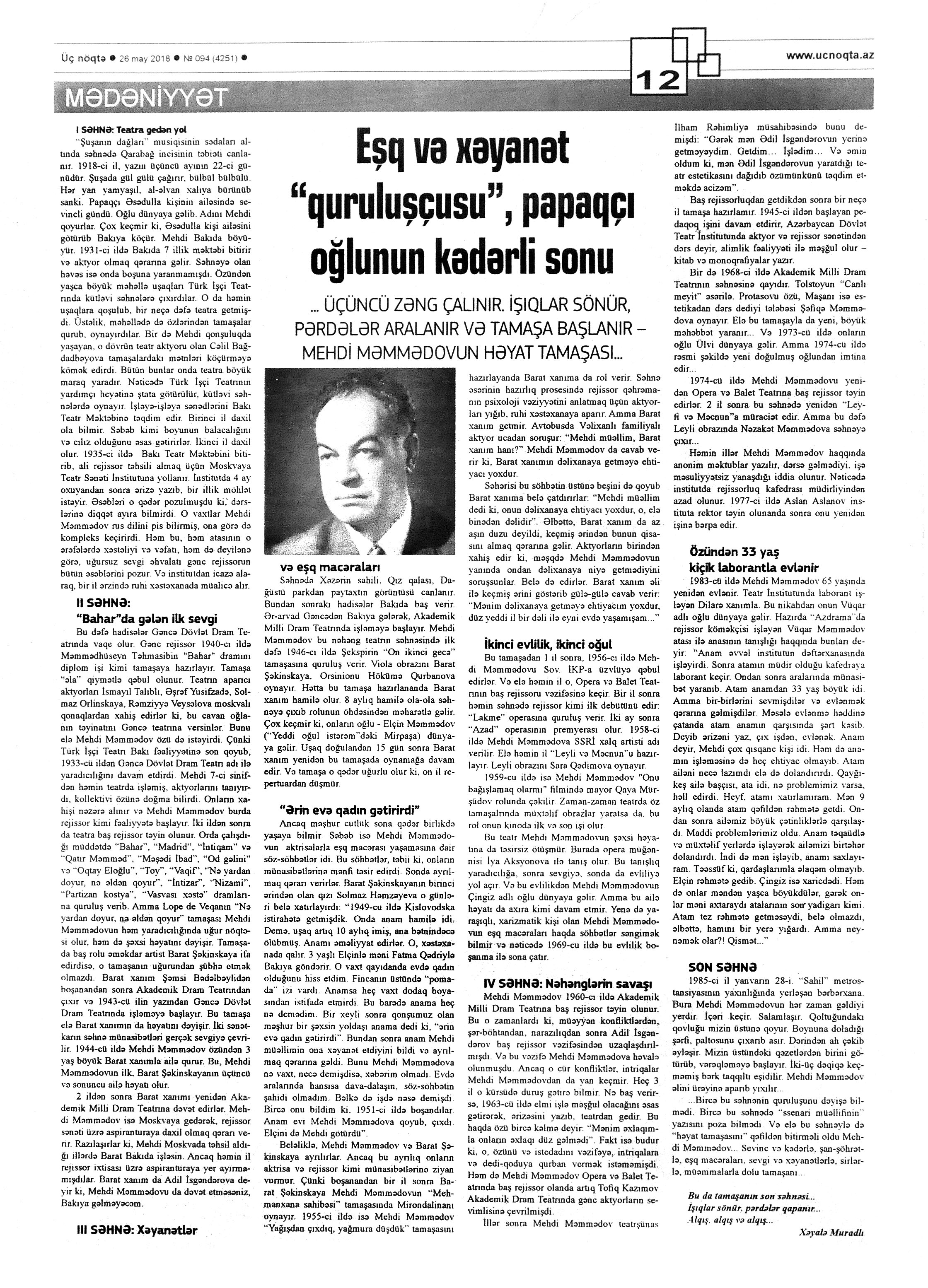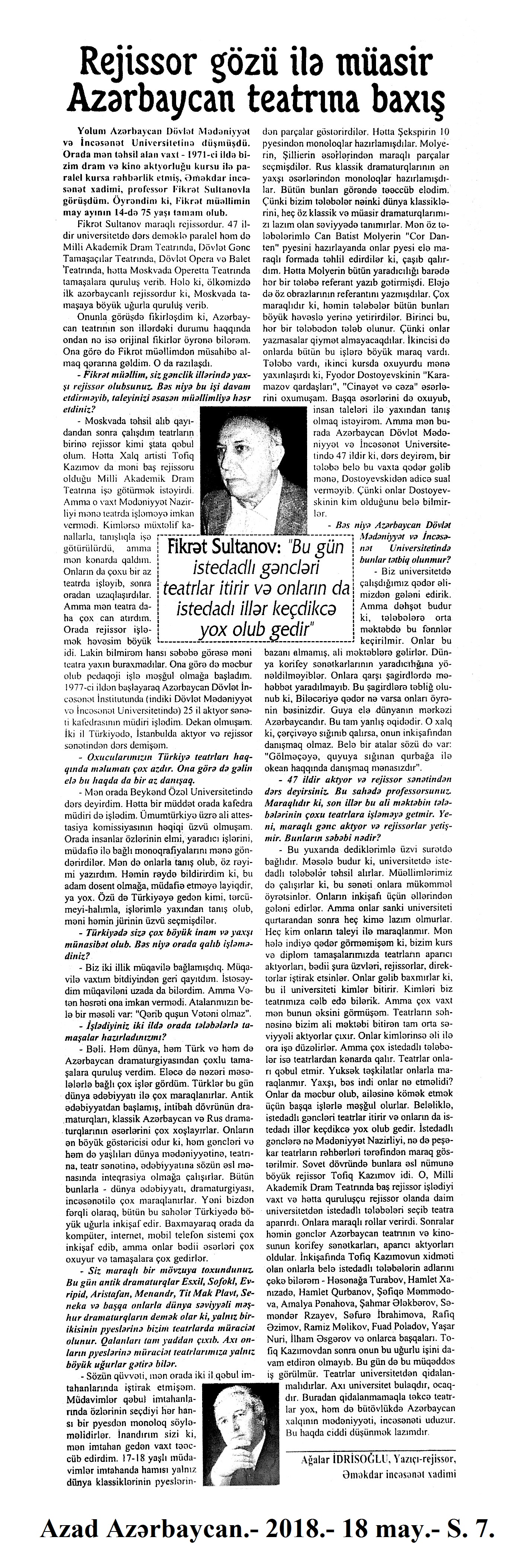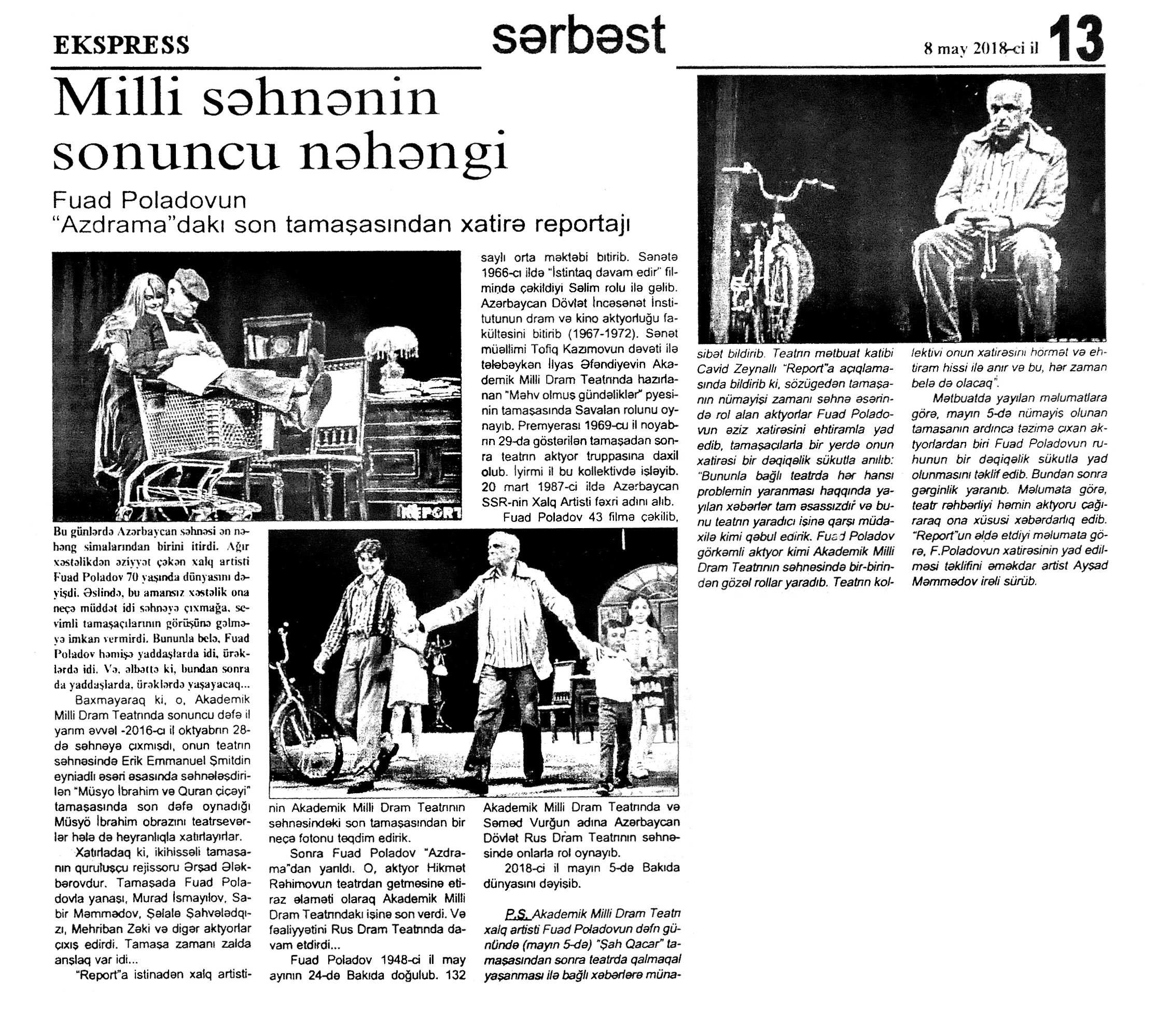 Fuad Poladovun vəfatı ilə əlaqədar 828. Əliyeva, L. Fuad Poladovun yayımlanmayan müsahibəsi: [Xalq artistinin həyatda ikən fikirləri] //Bizim yol.- 2018.- 9 may.- S.13; 15. 829. Əşrəf, S. Bir damla yaşa dönmək...: [Xalq artistinin vəfatı ilə bağlı] //Ədəbiyyat qəzeti.- 2018.- 6 may.- S.13. 830. Xalq artisti Fuad Poladov dünyasını dəyişib //Mədəniyyət.- 2018.- 9 may.- S.6. 831. Milli səhnənin sonuncu nəhəngi: Fuad Poladovun “Azdrama”dakı son tamaşasından xatirə reportajı //Ekspress.- 2018.- 8 may.- S.13. 832. Nadir, Z. Səhnənin məğlubedilməz şahı... //Olaylar.- 2018.- 12-14 may.- S.12. 833. Sultanova, S. Fuad Poladovun günahı: [unudulmaz aktyorun həyat və yaradıcılığı haqqında] //Bizim yol.- 2018.- 8 may.- S.15. 834. Şəmsizadə, N. Azərbaycan səhnəsinin zadəganı: [Xalq artisti, fenomen aktyor haqqında] //525-ci qəzet.- 2018.- 24 may.- S.8. 835. Yusif. Küçələrə su səpmişəm: Fuad Poladovun əziz xatirəsinə //525-ci qəzet. - 2018.- 19 may.- S.12-13. Mehdi Məmmədov – 100 836. Abbaslı, T. Dramatik, epik, lirik bir ömür: Bu “mozaik” taleyin yazanı Tanrı, “avtorejissor”u isə - adiliklərin ən maraqlısına belə qail olmayan bu “faili-muxtar”ın özü: Mehdi Məmmədov – 100 //Mədəniyyət.-2018.- 16 may.- S.12. 837. Eşq və xəyanət “quruluşçusu”: Papaqçı oğlunun kədərli “həyat tamaşası”: [rejissor Mehdi Məmmədov haqqında] //Bizim yol.- 2018.- 25 may.- S.15. 838. Mehdi Məmmədovun sənət yolundan söhbət açılıb: [Yasamal rayonu Heydər Əliyev Mərkəzində teatr rejissorunun 100 illiyi münasibətilə] //Mədəniyyət.-2018.- 30 may.- S.13. 839. Milli Dram Teatrının kollektivi Mehdi Məmmədovun məzarını ziyarət edib: [SSRİ Xalq artisti, professorun 100 illiyi münasibətilə] //Mədəniyyət.- 2018.- 25 may.- S.5. 840. Muradlı, X. Eşq və xəyanət “quruluşçusu”, papaqçı oğlunun kədərli sonu: [Mehdi Məmmədov haqqında] //Üç nöqtə.- 2018.- 26 may.- S.12. 841. Mükərrəmoğlu, M. Sənətkar ömrünün əbədiyaşar cizgiləri: Mehdi Məmmədov-100 //Xalq qəzeti.- 2018.- 6 may.- S.6.