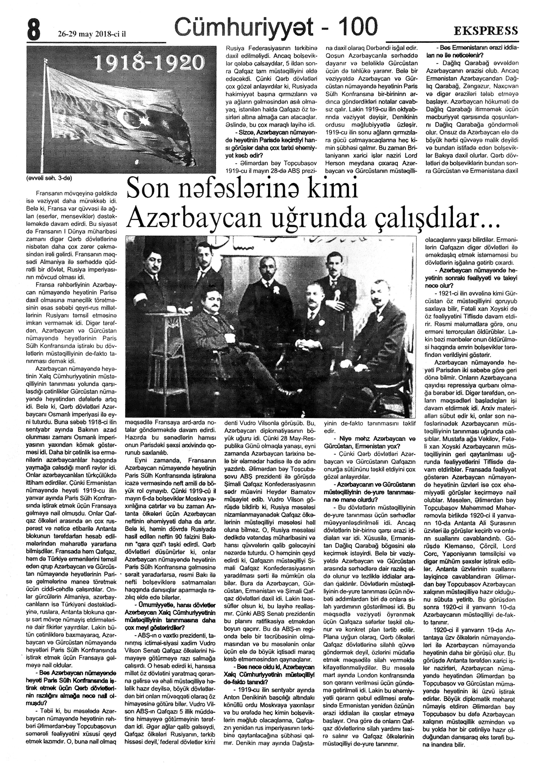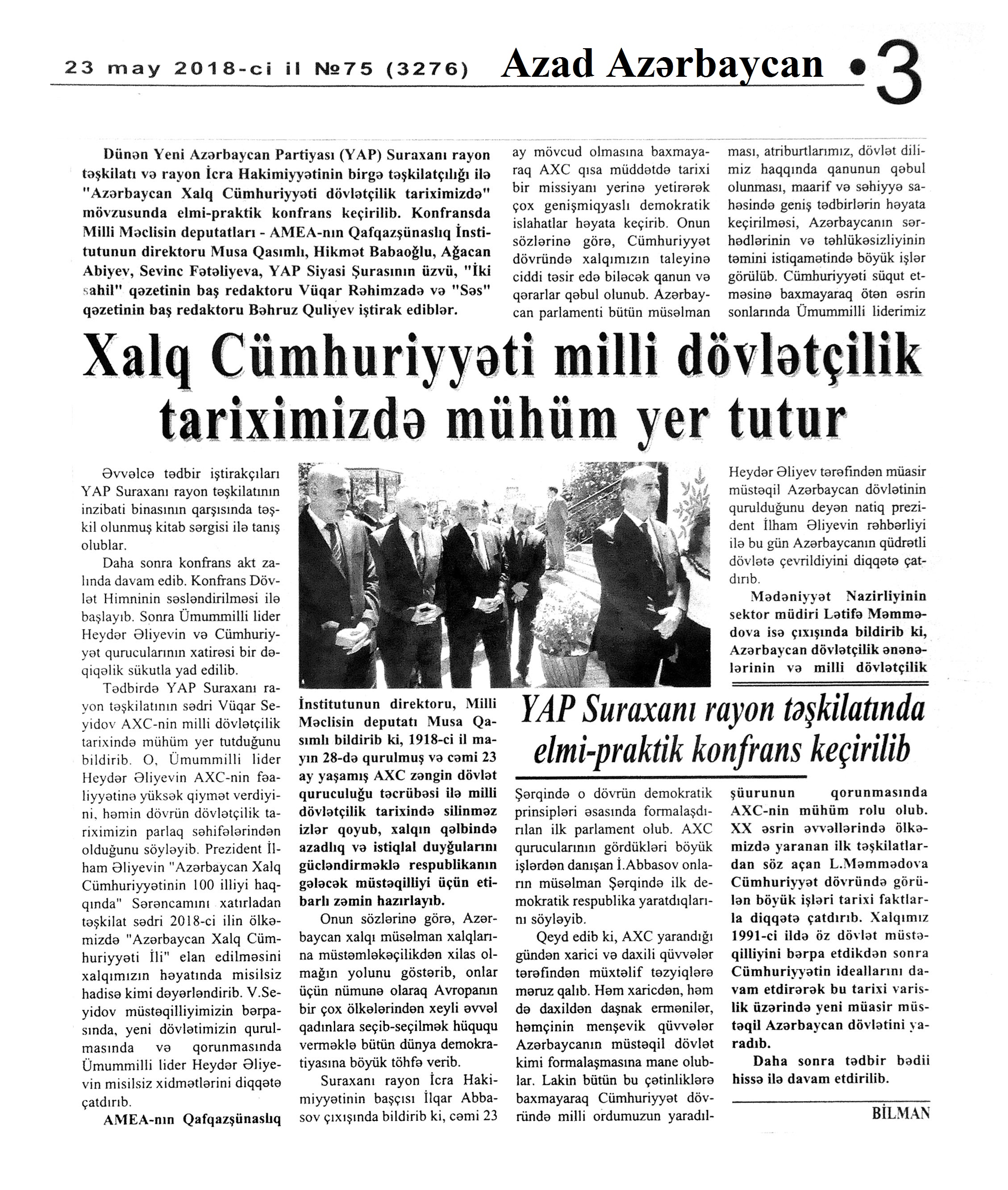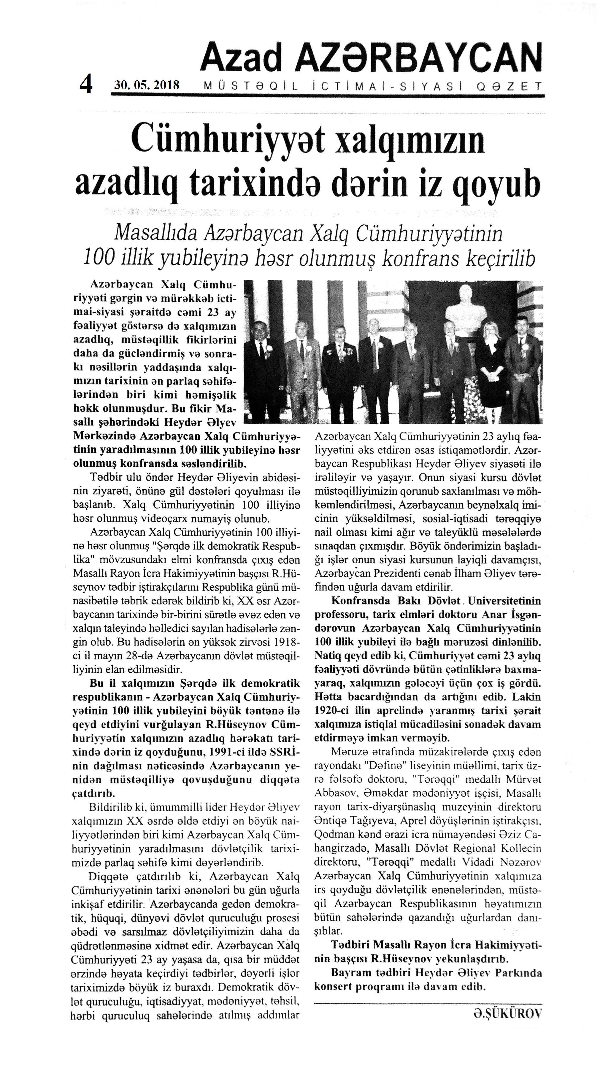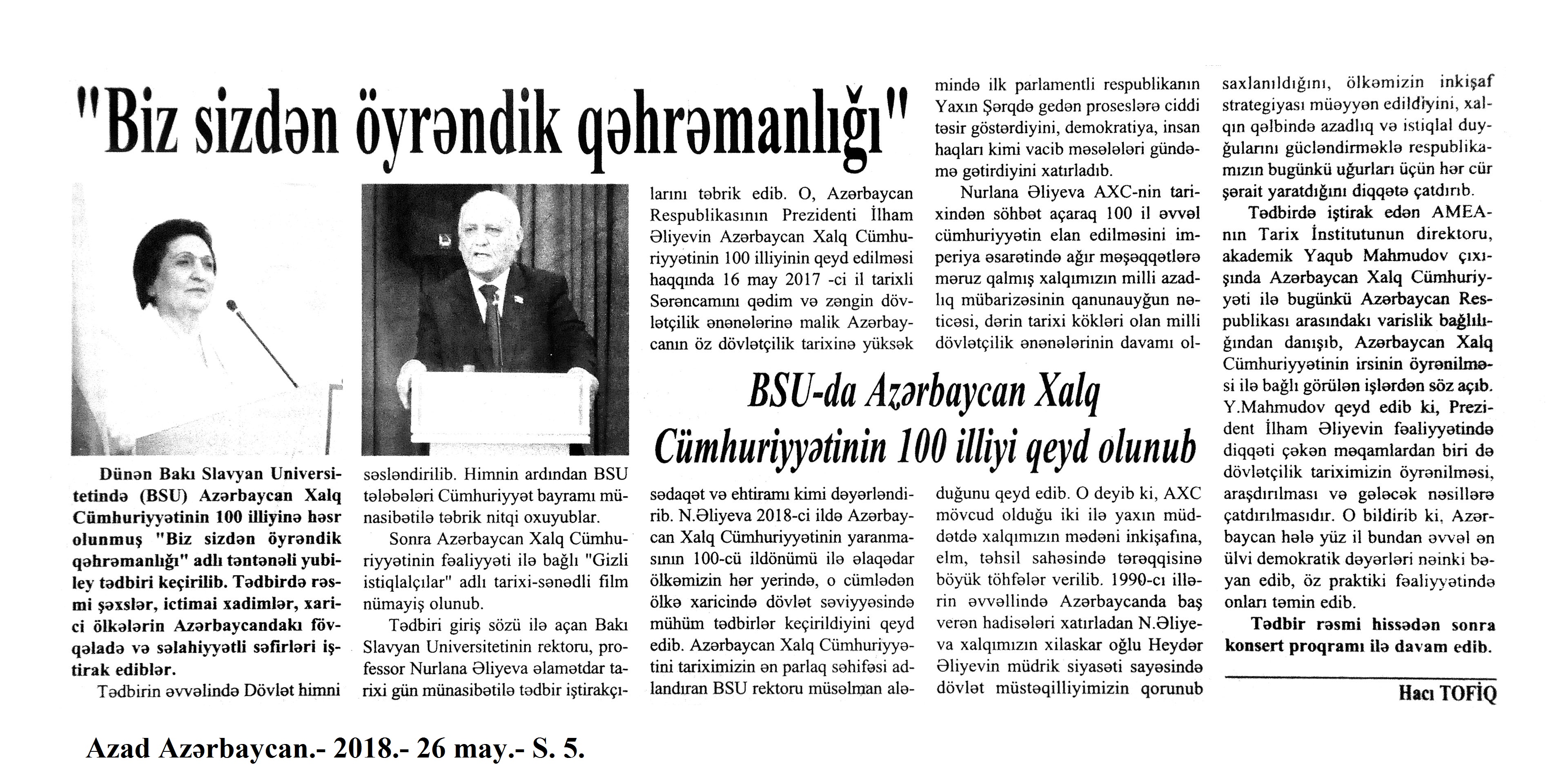 2018 – «Год Азербайджанской Демократической Республики» 1372. Абаскулиева, Э. От прошлого к будущему: На парижском форуме обсуждались актуальные проблемы тюркских языков //Азербайджанские известия.- 2018.- 3 мая.- С.3. 1373. Абаскулиева, Э. Создателям АДР посвящается: [о монографии «Создатели государства» Н.Ягублу] //Азербайджанские известия.-2018.-12 мая.- С.1. 1374. Азербайджанская Демократическая Республика в лицах (1918-1920) //Вышка.- 2018.- 18 мая.- С.7. 1375. Азербайджанская Демократическая Республика в лицах (1918-1920) //Вышка.- 2018.- 25 мая.- С.7. 1376. Азербайджанская Демократическая Республика — наша история чести и достоинства //Бакинский рабочий.-2018.- 26 мая.- С.3. 1377. Алиев, З. Золотая сотня: Зейналабдин Алиев – первый профессиональный скульптор АДР //Каспiй.- 2018.- 26 мая.- С.20. 1378. Алиев, И. Состоялся официальный прием по случаю 100-летнего юбилея Азербайджанской Демократической Республики: В официальном приеме принял участие Президент Ильхам Алиев: [Речь Президента Ильхама Алиева] //Бакинский рабочий.- 2018.- 30 мая.- С.2-3. 1379. Алиев, И. Участникам международной конференции «Межгосударственные отношения на Кавказе: 100 лет назад и современный период» //Бакинский рабочий.- 2018.- 24 мая.- С.1. 1380. Алиев, И. Участницам V Форума азербайджанских женщин: [в связи со 100-летним юбилеем Азербайджанской Демократической Республики] //Бакинский рабочий.- 2018.- 31 мая.- С.1. 1381. Алиева, С. Азбука освободительной борьбы Гусейн Байкара: Время само взрастит тех, кто будет изучать прошлое азербайджанского народа: [о жизни и деятельности публициста и поэта Г.Байкара] //Каспiй.- 2018.- 25 мая.- С.12. 1382. Асадова, И. Париж присоединяется к празднованию 100 - летия АДР: Еще один торжественный вечер с участием высокопоставленных гостей прошел в столице Франции //Эхо.- 2018. - 25 мая. - С.8. 1383. Асадова, И. "Последнее собрание": Долгожданный фильм, посвященный 100-летию Азербайджанской Демократической республики, уже завтра на экранах Cinema Plus //Эхо.- 2018. - 25 мая. - С.8. 1384. Асадова, И. 100-летие АДР отметили в Словакии: В концертной программе прозвучали лучшие образцы азербайджанской и мировой классической музыки в исполнении оркестра под руководством Эйюба Кулиева //Эхо.- 2018.- 25 мая. - С.8. 1385. Асадова, И. Чикаго празднует 100-летие АДР: Мероприятие посетили официальные лица, а после состоялся концерт //Эхо.- 2018. - 23 мая.- С.8. 1386. Буланова, О. Поэт независимости: Со дня рождения знаменитого поэта, автора слов к гимну АДР Ахмеда Джавада прошло 126 лет //Эхо.- 2018.- 5 мая.- С.10. 1387. В Баку прошел общереспубликанский фестиваль «Мой Азербайджан»: [по случаю 100-летия Азербайджанской Демократической Республики] //Бакинский рабочий.-2018.- 26 мая.- С.2. 1388. В Baku Crystal Hall состоялся торжественный концерт, посвященный 100-летию Азербайджанской Демократической Республики: На концерте присутствовал Президент Ильхам Алиев //Бакинский рабочий.- 2018.- 30 мая.- С.3-4. 1389. В Баку состоялся V Форум азербайджанских женщин, посвященный 100-летию предоставления женщинам в Азербайджане избирательного права //Бакинский рабочий.-2018.- 31 мая.- С.4;6. 1390. В городе Питтсбург США 28 Мая объявлен «Днем Азербайджана» //Бакинский рабочий.- 2018.- 8 мая.- С.7. 1391. В Киеве состоялся официальный прием по случаю 100-летия Азербайджанской Демократической Республики //Бакинский рабочий.- 2018.- 22 мая.- С.6. 1392. В Лондоне торжественно отмечен 100-летний юбилей Азербайджанской Демократической Республики //Бакинский рабочий.- 2018.- 26 мая.- С.3. 1393. Во Фр