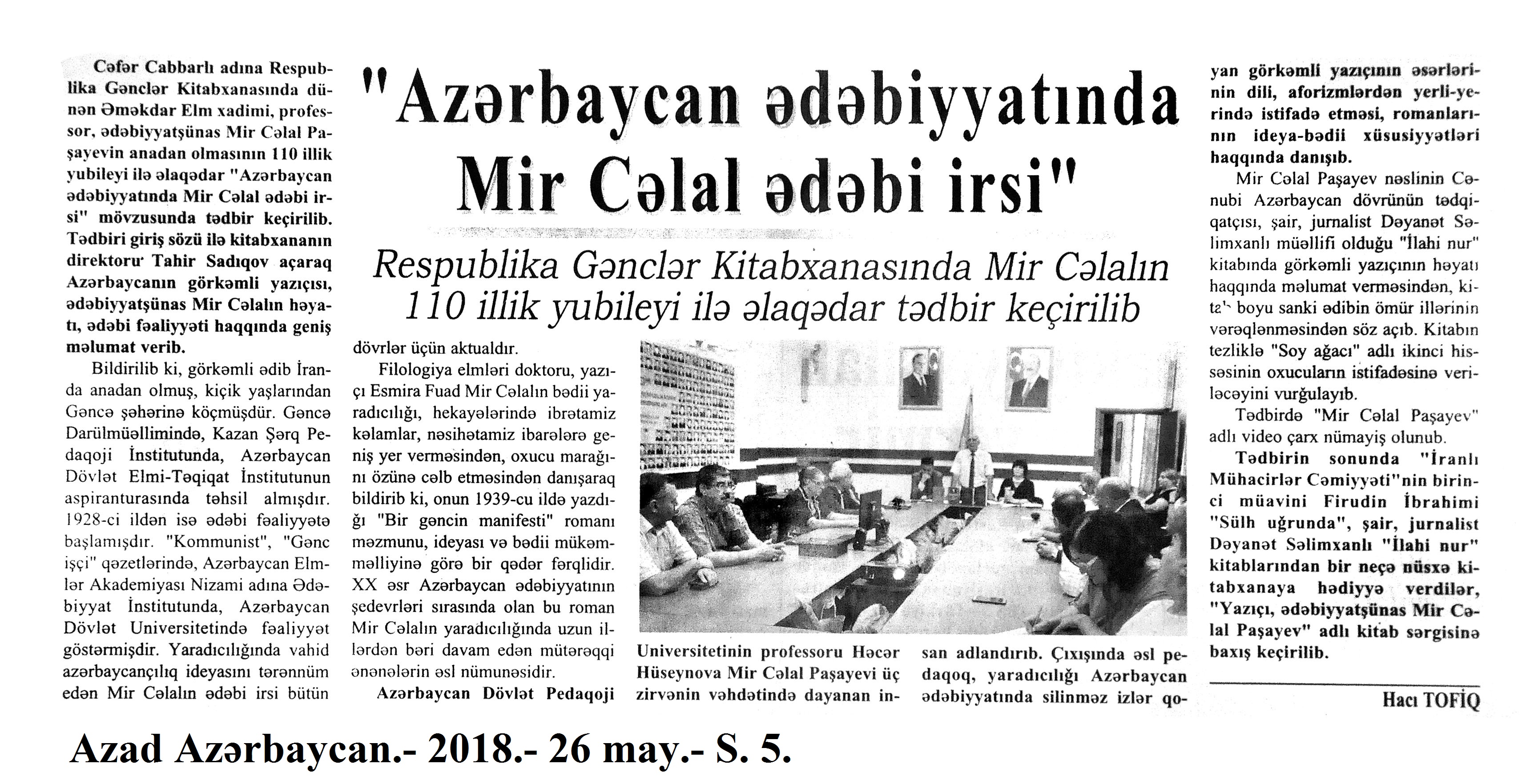 Мир Джалал – 110 1553. В АДА прошло мероприятие, посвященное 110-й годовщине со дня рождения Мир Джалала Пашаева //Ежедневные новости.- 2018.- 4 мая.- С.2. 1554. В Баку представлены две книги о Мир Джалале Пашаеве: «Мир Джалал. Библиография», книги Низами Джафарова «Национальные идеалы Мир Джалала» //Ежедневные новости.- 2018.- 4 мая.- С.10. 1555. Ислам, А. Месседж поколениям: Мир Джалал-110: Большой мастер маленького рассказа //Каспiй.- 2018.- 1 мая.- С.12. 1556. «Мир Джалал. Библиография» и «Национальные идеалы Мир Джалала»: презентация в Национальной библиотеке //Бакинский рабочий.- 2018.- 1 мая.- С.9. 1557. Мир Джалал Пашаев как ученый-литературовед внес ценный вклад в нашу науку //Бакинский рабочий.- 2018.- 2 мая.- С.3. 1558. Награждены победители конкурса рассказа, посвященного памяти Мир Джалала //Бакинский рабочий.- 2018.- 24 мая.- С.3.