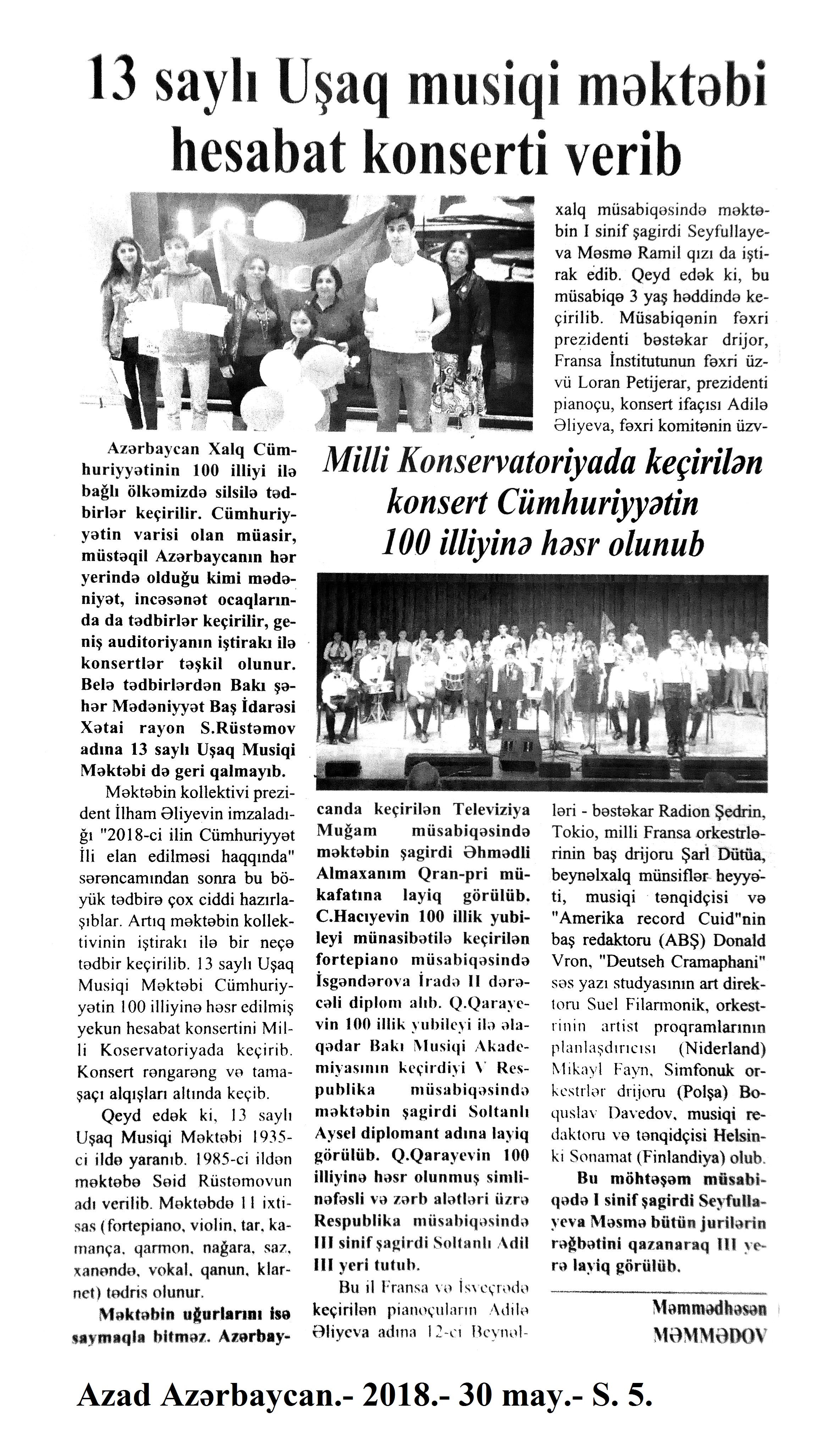МУЗЫКА 1497. В Баку отметили День Европы: [концертом Baku Chamber Orchestr в Оперной студии] //Бакинский рабочий.-2018.- 9 мая.- С. 5. 1498. В столице презентован фильм о Рашиде Бейбутове: [режиссера Р.Мамедова] //Ежедневные новости.- 2018.- 11 мая.- С.10. 1499. Ислам, А. На высокой лирической ноте: В рамках проекта Международного центра мугама прошел вечер памяти Шовкет Алекперовой //Каспiй.- 2018.- 17 мая.- С.13. 1500. Международный музыкальный фестиваль «Нежность» в Гяндже стал настоящим событием в культурной жизни нашей страны: [памяти академика Зарифы Алиевой] //Бакинский рабочий.- 2018.- 1мая.- С.9. 1501. Микеладзе, Г. Мир рукоплещет «Пассиону Насими»: И чествует его автора, выдающегося азербайджанского композитора Франгиз Ализаде //Каспiй.- 2018.- 12 мая.- С.13. 1502. Прощаясь с Гасаном Адигезалзаде: [памяти композитора] //Бакинский рабочий.- 2018.- 4 мая.- С.3. 1503. Расулова, В. Дорога жизни: [беседа с пианисткой В. Расуловой] /провела Н.Алиярова //Эхо.- 2018.- 5 мая.- С.10. 1504. Юная азербайджанка признана лучшей в Германии: А.Келбиева //Ежедневные новости.- 2018.- 18 мая.- С.10.