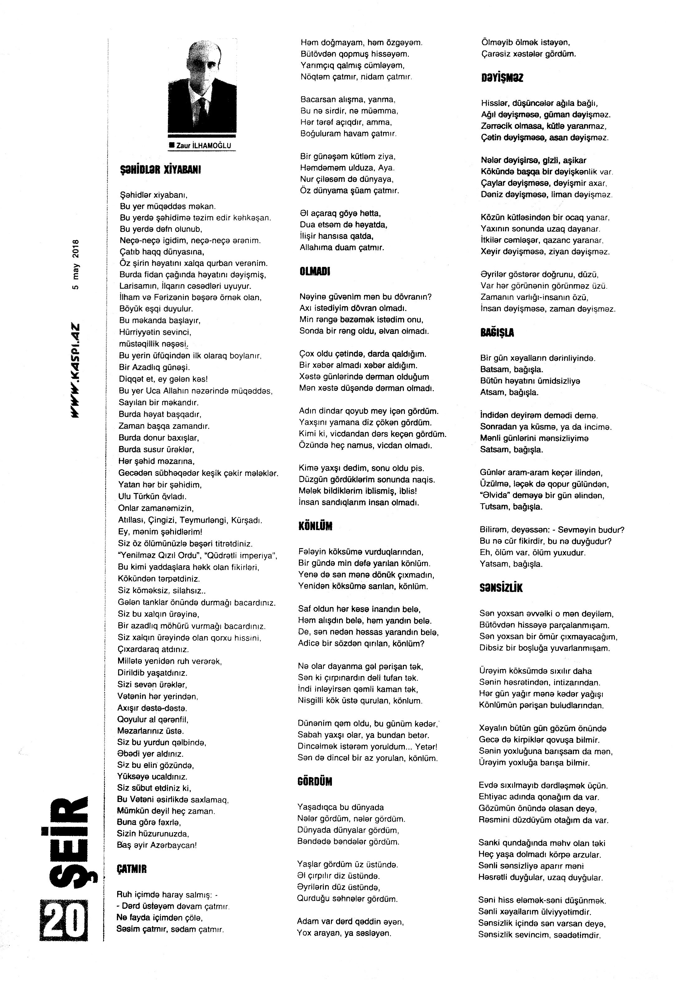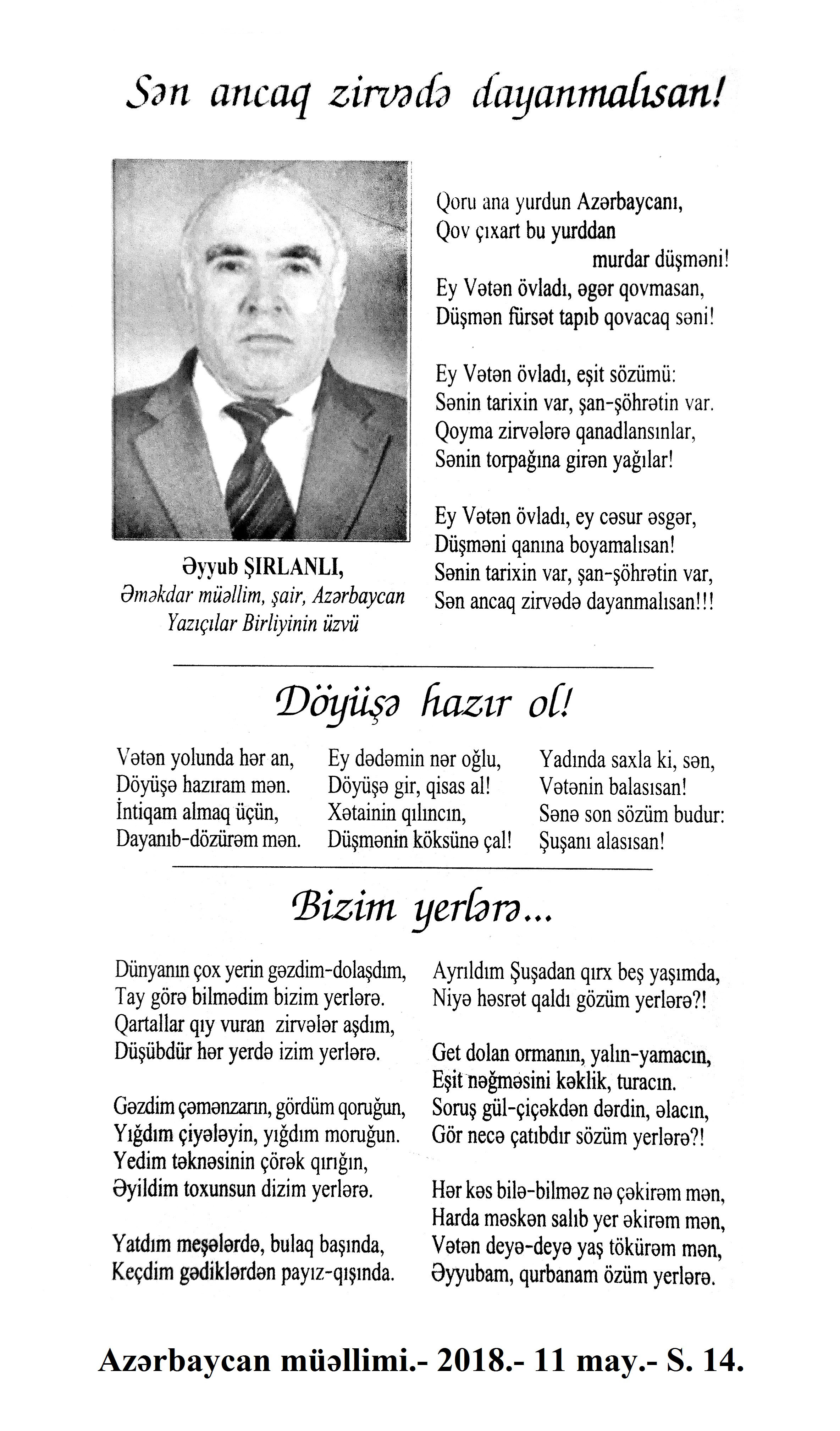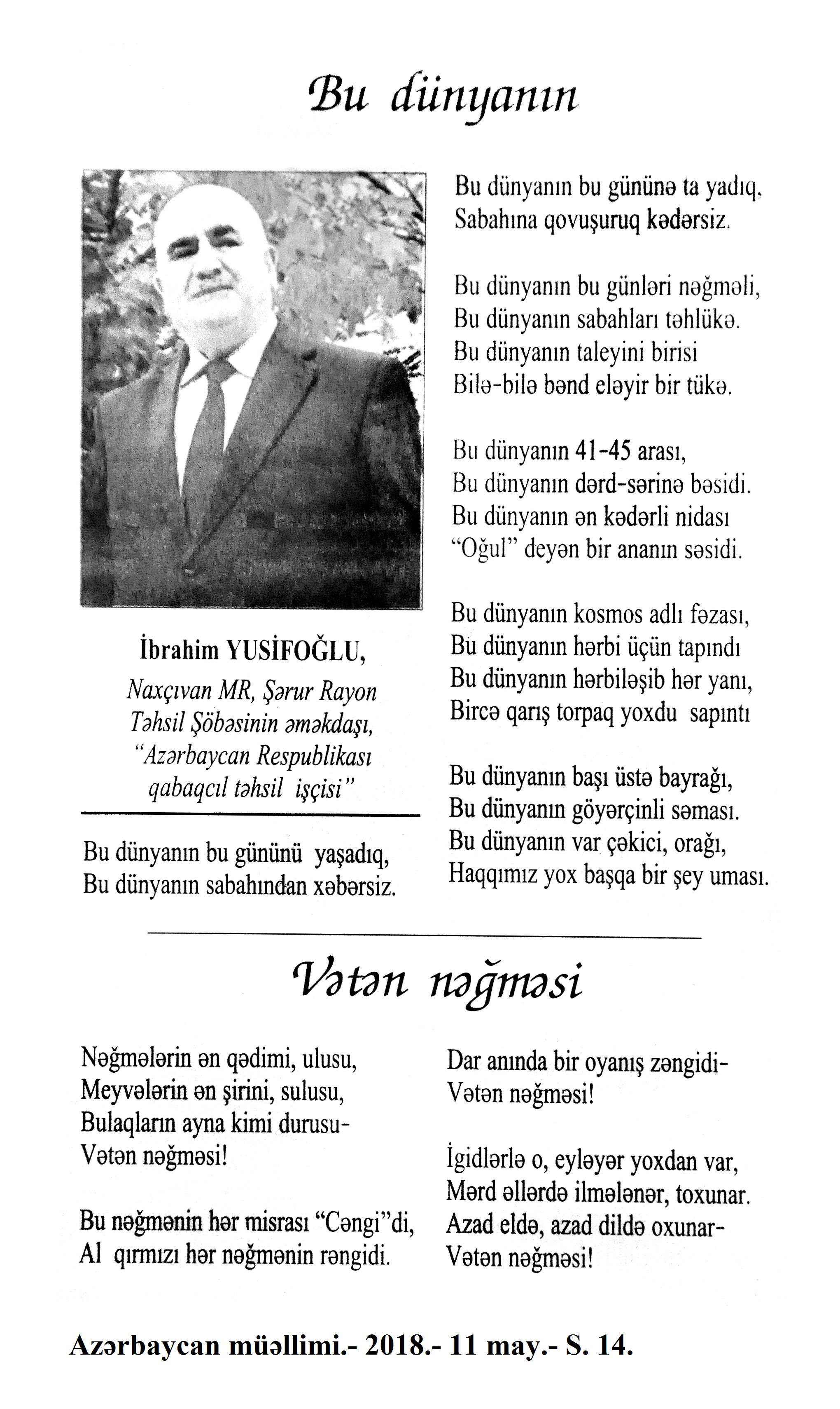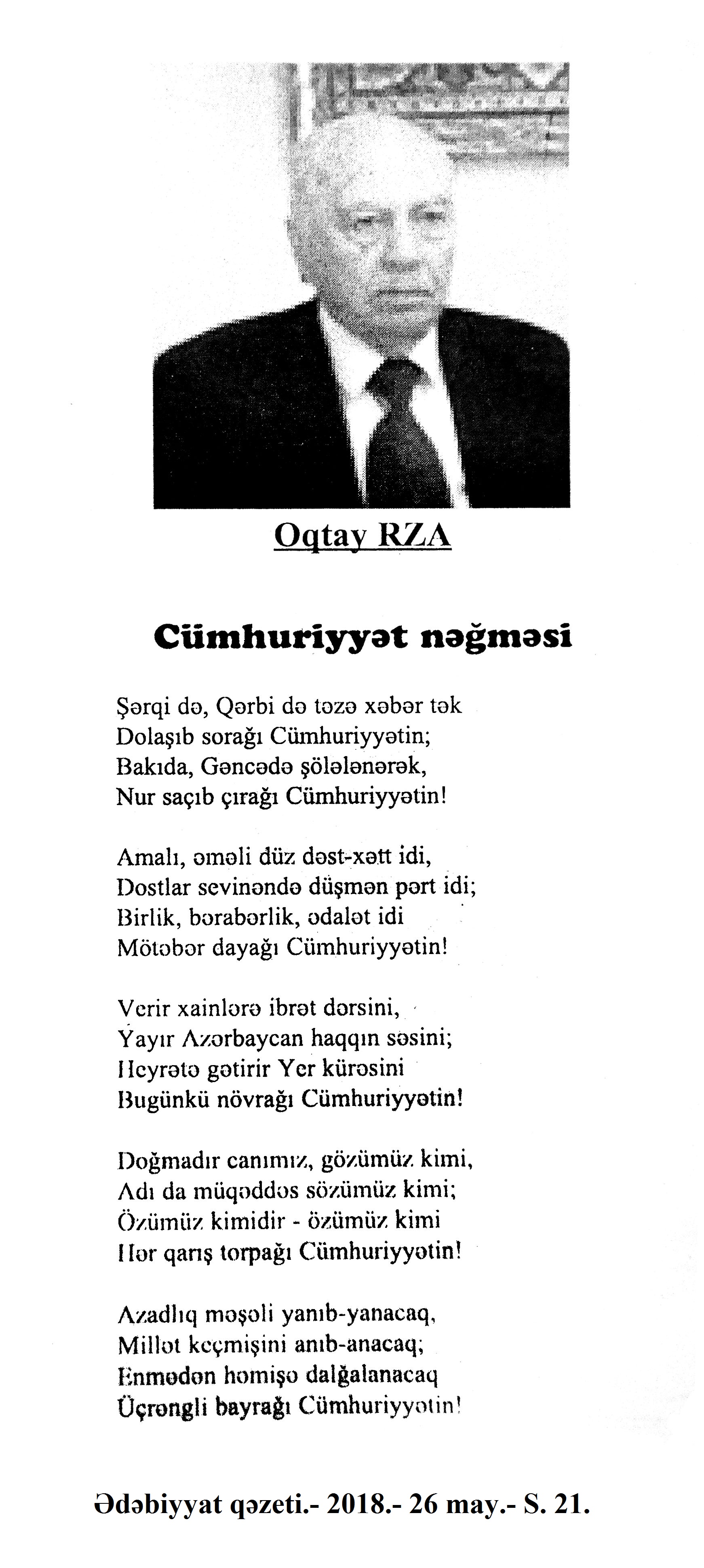 BƏDİİ ƏDƏBİYYAT VƏ ƏDƏBİYYATŞÜNASLIQ ŞEİRLƏR 863. Abdulla, S. Sübh yuxusundan öncəki şeir; Ucalıqların şeiri; Çəki; Çatmır ey...; Heç kəs; Yadından çıxart məni...; Plagiat məktublar //Ədəbiyyat qəzeti.- 2018.- 12 may.- S.28. 864. Alarlı, B. Yağış ovqatı; Ağıllı nağıl; Qapı; İşıq //Azərbaycan müəllim.- 2018.- 11 may.- S.14. 865. Araz, M. Ayağa qalx, Azərbaycan! //Ədəbiyyat qəzeti.-2018.- 26 may.- S.16. 866. Azəroğlu, B. Elə oğul istəyir vətən //Ədəbiyyat qəzeti.-2018.- 26 may.- S.17. 867. Börns, R. Ömrün soyuq qışı; Al qızılgül: [ingilis dilindən tərcümə] /tərc. etdi Leyla Əsədullayeva //Kaspi.-2018.- 5-7 may.- S.11. 868. Buludlu, A. Oğlum //Azərbaycan müəllimi.- 2018.- 11 may.- S.14. 869. Cavadov, S. Allah, sən özün saxla bizi; Metro ömrü; Kompüter //Ədalət.-2018.- 22 may.- S.8. 870. Cəliloğlu, Y. Aşıq //Azərbaycan müəllimi.- 2018.- 11 may.- S.14. 871. Çeşməli, D. Ölüm haqqında (Rekviyem); Bayatı buketi; Çölüm içimdən yer alıb; Dərdi dizimə çıxıb və s. //Ədalət.-2018.- 17 may.- S.8. 872. Əhməd, Q. Çərçivə; Sənin uşaq taleyin; Və bir gün...; Nolar...; Aldana-aldana və s. //525-ci qəzet.-2018.- 31 may.- S.8. 873. Əlioğlu, V. Unuda bilmirəm; Səcdəgahdı, vətəndi; Dünyanın və s. //Ədalət.- 2018.- 2 may.- S.8.