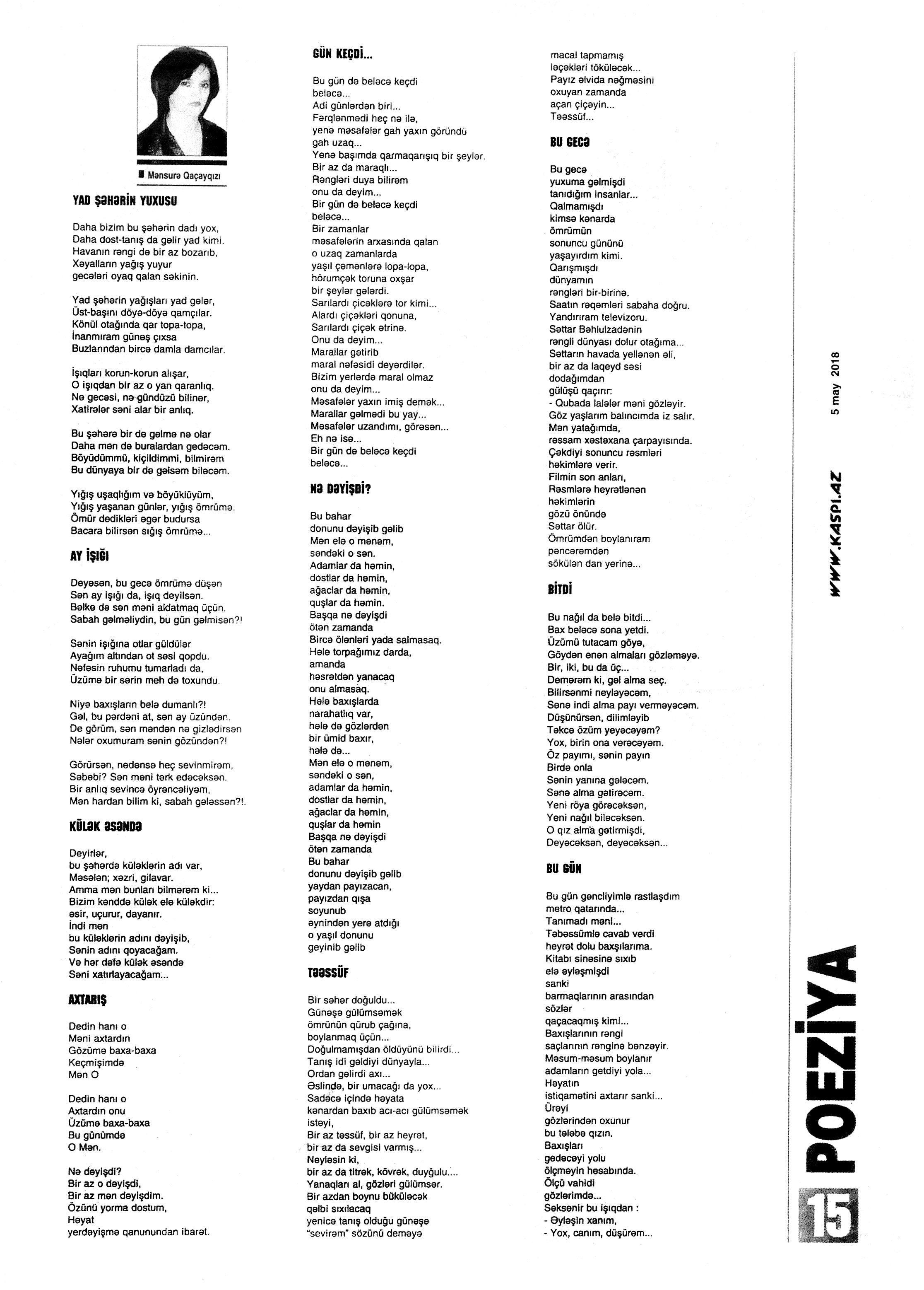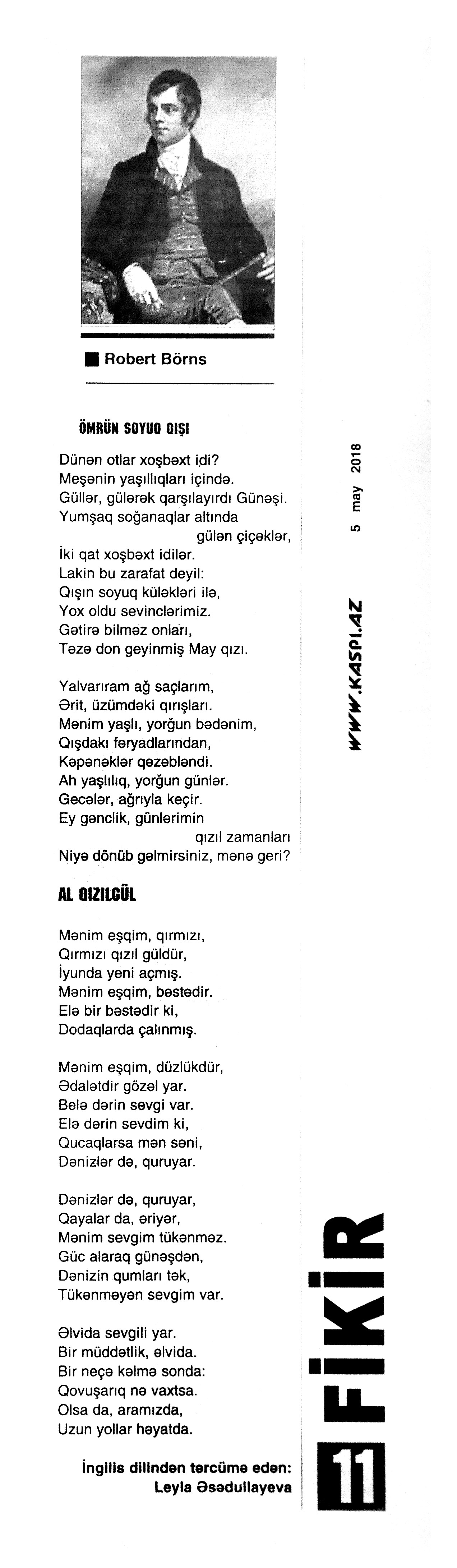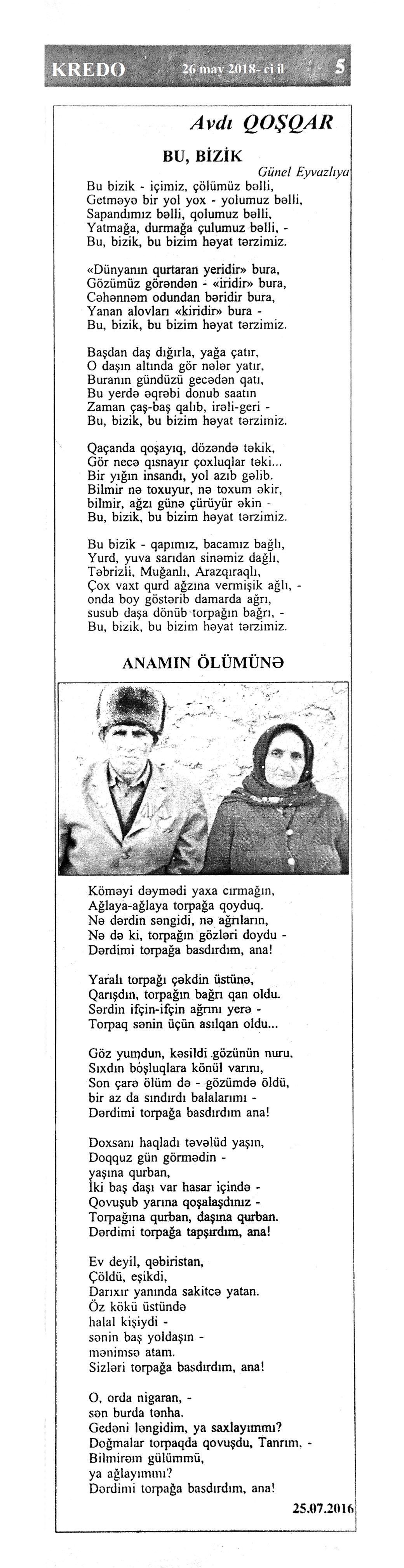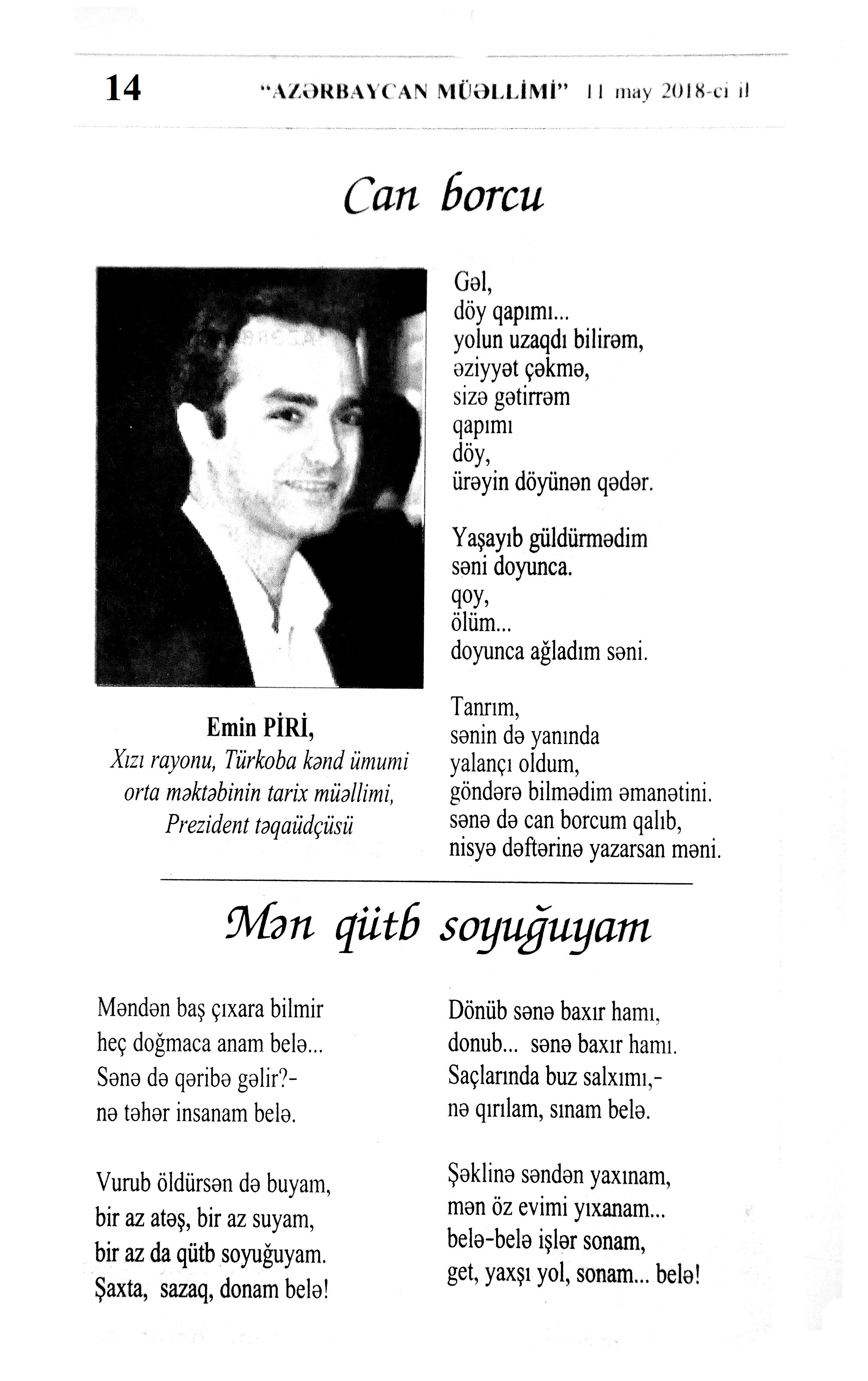 BƏDİİ ƏDƏBİYYAT VƏ ƏDƏBİYYATŞÜNASLIQ ŞEİRLƏR 863. Abdulla, S. Sübh yuxusundan öncəki şeir; Ucalıqların şeiri; Çəki; Çatmır ey...; Heç kəs; Yadından çıxart məni...; Plagiat məktublar //Ədəbiyyat qəzeti.- 2018.- 12 may.- S.28. 864. Alarlı, B. Yağış ovqatı; Ağıllı nağıl; Qapı; İşıq //Azərbaycan müəllim.- 2018.- 11 may.- S.14. 865. Araz, M. Ayağa qalx, Azərbaycan! //Ədəbiyyat qəzeti.-2018.- 26 may.- S.16. 866. Azəroğlu, B. Elə oğul istəyir vətən //Ədəbiyyat qəzeti.-2018.- 26 may.- S.17. 867. Börns, R. Ömrün soyuq qışı; Al qızılgül: [ingilis dilindən tərcümə] /tərc. etdi Leyla Əsədullayeva //Kaspi.-2018.- 5-7 may.- S.11. 868. Buludlu, A. Oğlum //Azərbaycan müəllimi.- 2018.- 11 may.- S.14. 869. Cavadov, S. Allah, sən özün saxla bizi; Metro ömrü; Kompüter //Ədalət.-2018.- 22 may.- S.8. 870. Cəliloğlu, Y. Aşıq //Azərbaycan müəllimi.- 2018.- 11 may.- S.14. 871. Çeşməli, D. Ölüm haqqında (Rekviyem); Bayatı buketi; Çölüm içimdən yer alıb; Dərdi dizimə çıxıb və s. //Ədalət.-2018.- 17 may.- S.8. 872. Əhməd, Q. Çərçivə; Sənin uşaq taleyin; Və bir gün...; Nolar...; Aldana-aldana və s. //525-ci qəzet.-2018.- 31 may.- S.8. 873. Əlioğlu, V. Unuda bilmirəm; Səcdəgahdı, vətəndi; Dünyanın və s. //Ədalət.- 2018.- 2 may.- S.8.