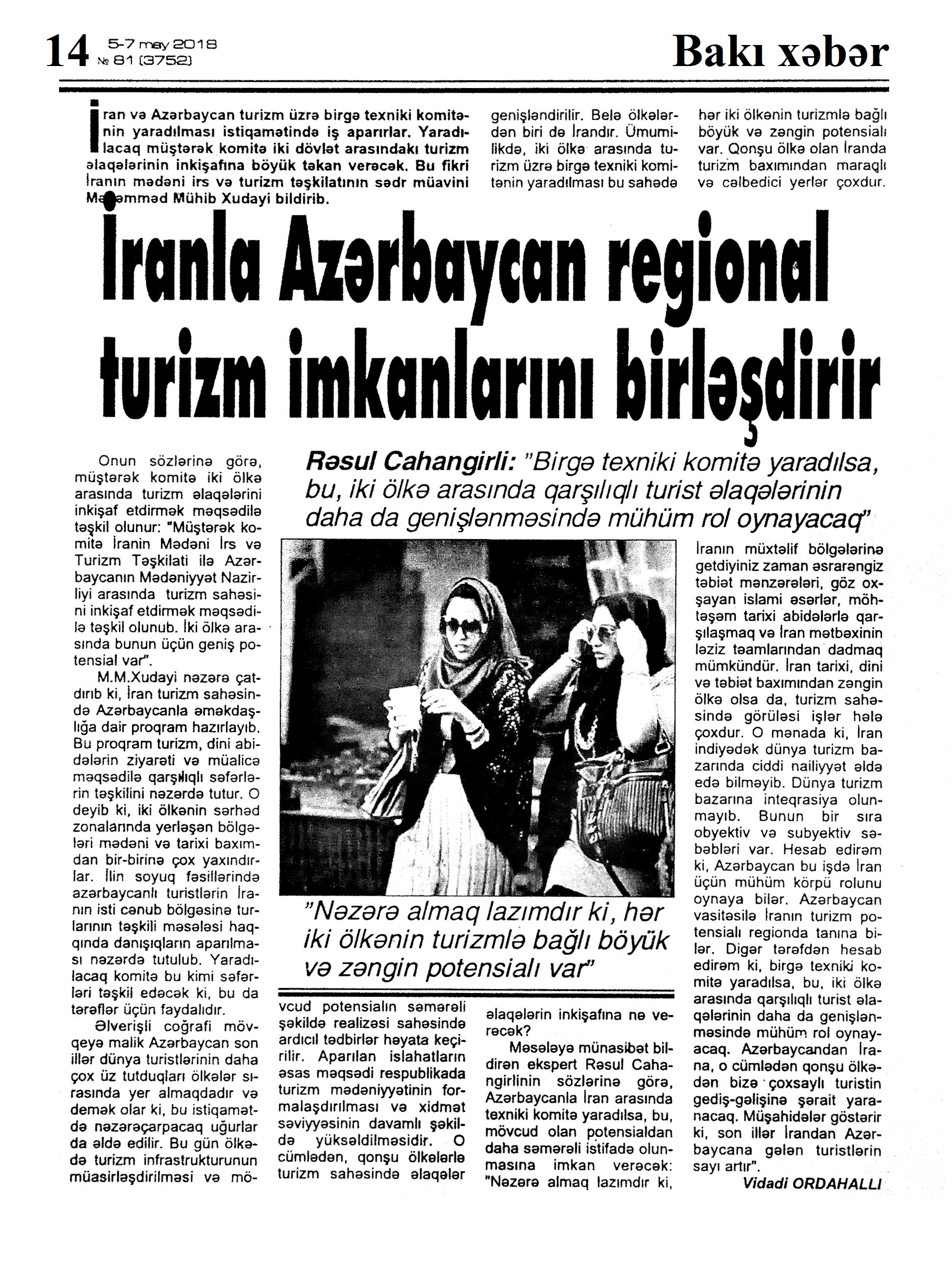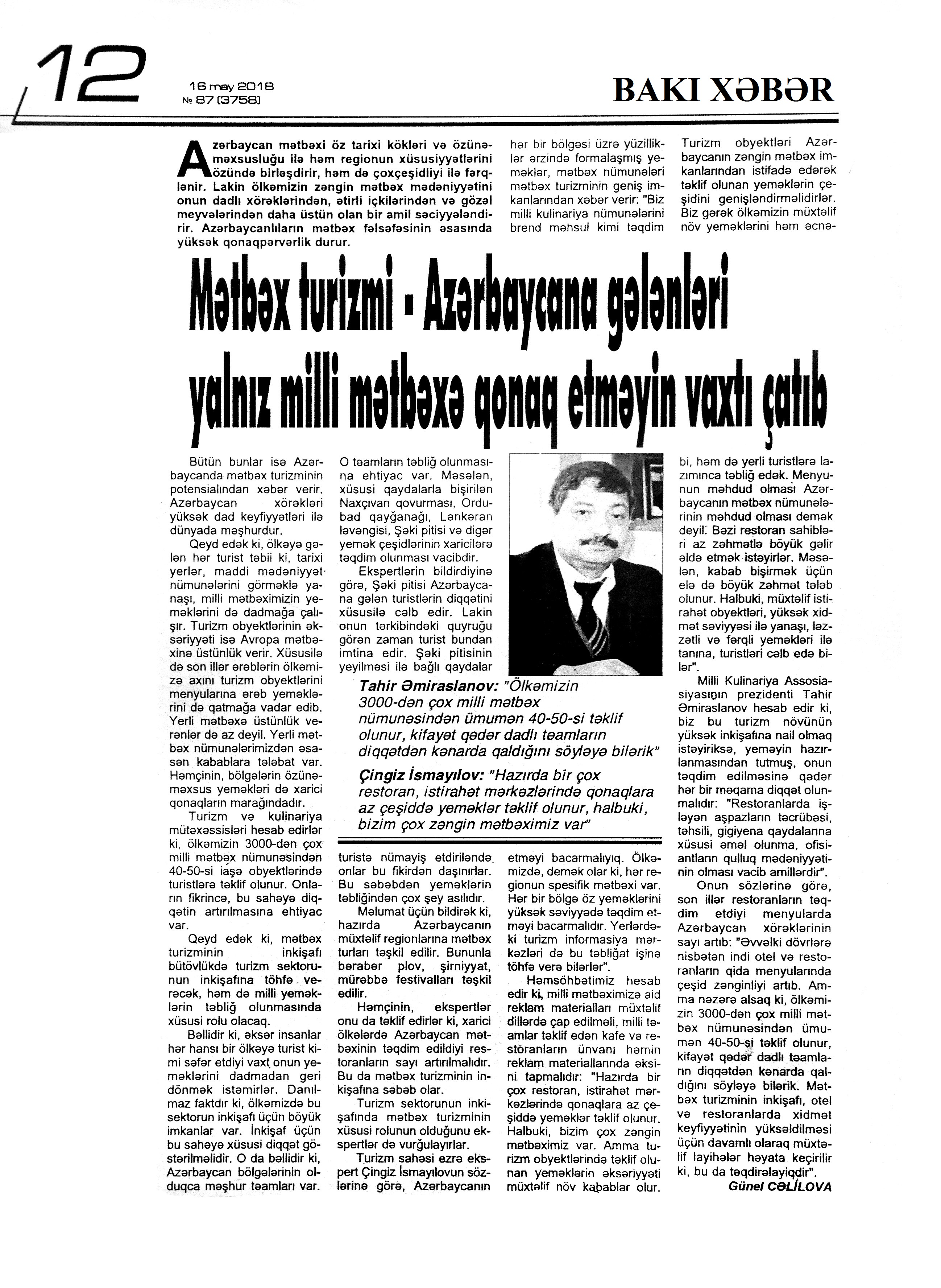 TURİZM 853. Almaniyanın Frankfurt şəhərində IMEX sərgisi açılıb: Azərbaycan Konqreslər Bürosu iştirakçı ölkələr arasında ən yaxşı nümayiş stendinə görə təşəkkür məktubu alıb //Azərbaycan.- 2018.-16 may.- S.8. 854. Azəri, N. Azərbaycana gələn xarici turistlərin sayı ildən-ilə artır //Yeni Azərbaycan. - 2018.- 2 may.- S.7. 855. Baxşəliyev, R. 78 ölkə, 94 min azarkeş: “Formula-1” Azərbaycan Qran-prisinin ölkəmizə gətirdiyi turistlərin sayı orta hesabla hər il 30 faiz artır //Azərbaycan.- 2018.-4 may.- S.1; 11. 856. Bakıda “Dinamo” hoteli istifadəyə verilib: Prezident İlham Əliyev açılış mərasimində iştirak edib: [birinci xanım Mehriban Əliyeva mərasimdə iştirak edib] //Azərbaycan.- 2018.- 12 may.- S.1-2. 857. Cəlilova, G. Mətbəx turizmi-Azərbaycana gələnləri yalnız milli mətbəxə qonaq etməyin vaxtı çatıb: [Milli Kulinariya Assosiasiyasının prezidenti Tahir Əmiraslanovun soylədikləri] //Bakı xəbər. - 2018.- 16 may.- S.15. 858. Ələddinqızı, N. Turizm sürətlə inkişaf edən iqtisadi sektora çevrilib: “Dinamo” otelin istifadəyə verilməsi ölkəmizdə turizmin inkişafına daha bir töhfədir //Səs. - 2018.-18 may.- S.7. 859. Hadiyev, E. 2 milyon 692 min turist: Ötən ili turizm sahəsində mühüm nailiyyətlərlə başa vuran ölkəmizə son dörd ayda gələn qonaqların sayı 13 faiz artıb //Azərbaycan. - 2018.-19 may.- S.1; 6. 860. Məmmədova, S. Bakı bölgənin sərfəli ticarət mərkəzinə çevrilir: 800-dən çox mağazada “Əvvəlcə alış-veriş et, sonra pulunun bir qismini geri al” kampaniyası davam edir //Azərbaycan.- 2018.-18 may.- S.1; 3. 861. Ordahallı, V. İranla Azərbaycan regional turizm imkanlarını birləşdirir [turizm ekspert Rəsul Cahangirlinın söylədikləri] //Bakı xəbər. - 2018.- 5-7 may.- S.14. 862. Səlimov, Ə. Yollar yay-turizm mövsümünə hazırlanır: [İsmayıllı rayonunun yol infrastrukturunun yenidən qurulması haqqında] //Azərbaycan. - 2018.- 15 may.- S.6.