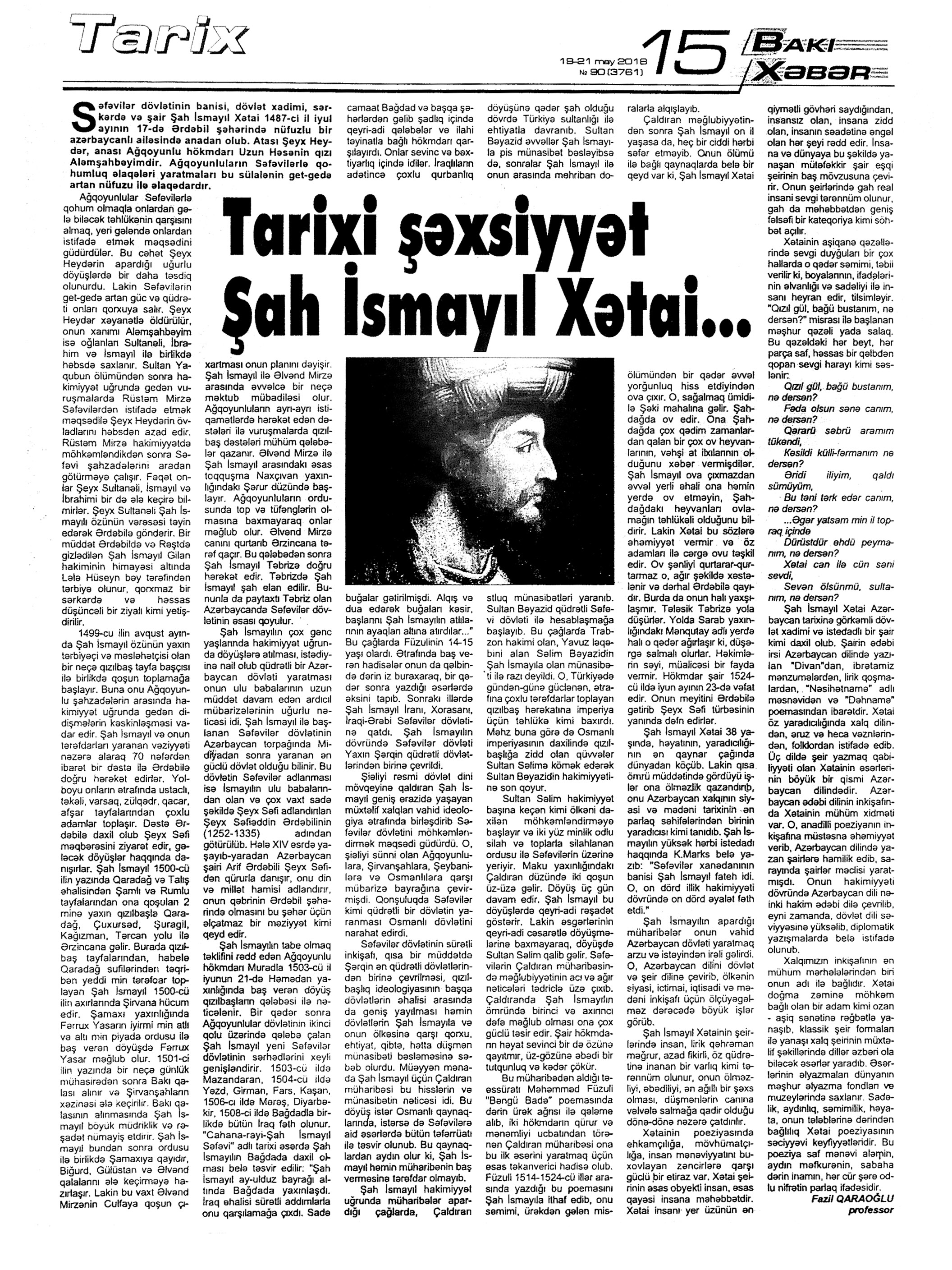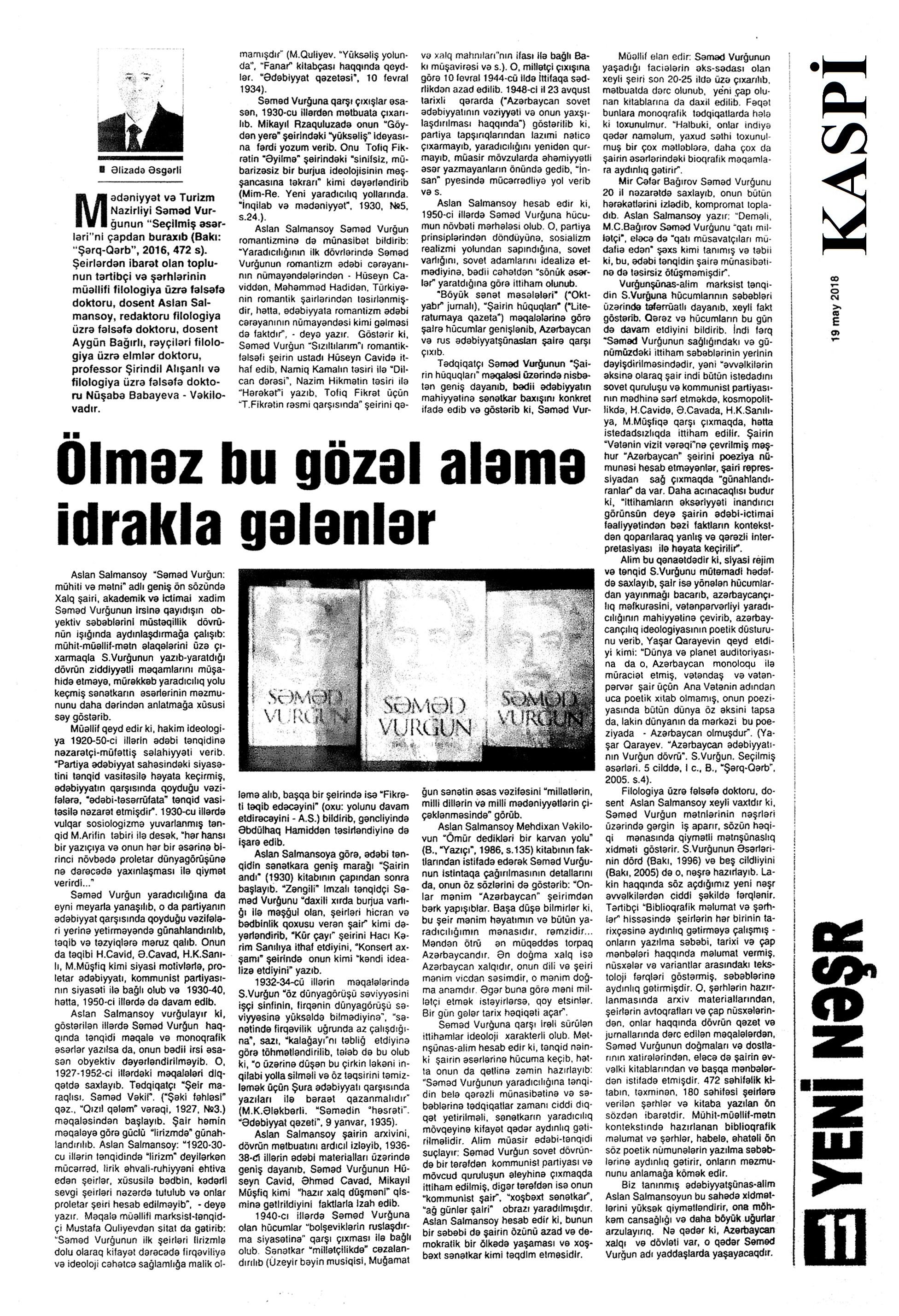 Sunamiyə... kitabı haqqında] 1108. Şıxıyeva, S. Azərbaycan şeirinin qərib səhifələri: III məqalə //Ədəbiyyat qəzeti.- 2018.- 6 may.- S.26-27. 1109. Şirinov, S. Sirli yazılar, qəribə adamlar romanı: [Şərif Ağayarın “Ağ göl” romanı haqqında] //525-ci qəzet.-2018.- 12 may.- S.19. 1110. Şirinova, R. Arxiv sənədlərinə həyat verən tədqiqatçı: Tahirə xanımın elmə verdiyi töhfələr onu daim yaşadacaq: [AMEA-nın Əlyazmalar İnstitutunun Farsdilli əlyazmaların tədqiqi şöbəsinin aparıcı elmi işçisi, mərhum filologiya üzrə fəlsəfə doktoru Tahirə Nuriyeva haqqında] //Kaspi.-2018.- 3 may.- S.15. 1111. Şükürov, A. Bolqarıstanla elmi əlaqələr: [İsa Həbibbəylinin dost ölkəyə səfəri haqqında] //Ədəbiyyat qəzeti.- 2018.- 26 may.- S.32. 1112. Şükürov, Ə. Bəs indi necəsən, Rəsul müəllim?!: Qəlm yoldaşımızın ömründən məqamlar: [şair, publisist Rəsul Rzayev haqqında] //Azad Azərbaycan.-2018.- 19 may.- S.7. 1113. Şükürov, Ə. “Oğul arxalı Vətən”in səhnə həyatı: Ana ilə vətənin müqayisəsində, tərəzinin “vətən gözü” ağır gəlir: [şair-publisist Rəsul Rzayevin eyniadlı kitabı haqqında] //Kaspi.- 2018.- 1 may.- S.15.; 525-ci qəzet.-2018.- 16 may.- S.8. 1114. Turan, T. İçimdəki poeziya yataqları tükənib, nəsrə keçəcəyəm...: [gənc şair Tural Turanla müsahibə] /müsahibəni apardı: Tural Cəfərli //Ədalət.-2018.- 12 may.- S.6. 1115. Ülvi, A. O, kübar olduğu qədər də gözəl idi: [AMEA-nın Nizami adına Ədəbiyyat İnstitutunun Dünya ədəbiyyatı və komparativistika şöbəsində baş elmi işçi vəzifəsində çalışmış mərhum Tamara Şəriflinin 80 illiyi ilə bağlı] //525-ci qəzet.-2018.- 31 may.- S.8. 1116. Veysəlli, N. Geriyə yol varmı...: [yazıçının həyatının ayrı-ayrı əhəmiyyətli məqamları haqqında] //Ədalət.- 2018.- 2 may.- S.7. 1117. Veysəlli, N. Geriyə yol varmı... //Ədalət.- 2018.- 3 may.- S.7. 1118. Veysəlli, N. Geriyə yol varmı... //Ədalət.- 2018.- 4 may.- S.7. 1119. Veysəlli, N. Geriyə yol varmı... //Ədalət.- 2018.- 5 may.- S.9. 1120. Veysəlli, N. Geriyə yol varmı... //Ədalət.- 2018.- 6 may.- S.7. 1121. Veysəlli, N. Geriyə yol varmı... //Ədalət.- 2018.- 9 may.- S.6. 1122. Veysəlli, N. Geriyə yol varmı... //Ədalət.- 2018.- 11 may.- S.6. 1123. Veysəlli, N. Geriyə yol varmı... //Ədalət.- 2018.- 15 may.- S.7. 1124. Veysəlli, N. Geriyə yol varmı... //Ədalət.- 2018.- 16 may.- S.7. 1125. Veysəlli, N. Geriyə yol varmı... //Ədalət.- 2018.- 17 may.- S.7. 1126. Veysəlli, N. Geriyə yol varmı... //Ədalət.-2018.- 18 may.- S.7. 1127. Veysəlli, N. Geriyə yol varmı... //Ədalət.- 2018.- 18 may.- S.7. 1128. Veysəlli, N. Geriyə yol varmı... //Ədalət.- 2018.- 19 may.- S.14. 1129. Veysəlli, N. Geriyə yol varmı... //Ədalət.- 2018.- 22 may.- S.7. 1130. Veysəlli, N. Geriyə yol varmı... //Ədalət.- 2018.- 23 may.- S.7. 1131. Veysəlli, N. Geriyə yol varmı... //Ədalət.- 2018.- 24 may.- S.7. 1132. Veysəlli, N. Geriyə yol varmı... //Ədalət.- 2018.- 25 may.- S.7. 1133. Veysəlli, N. Geriyə yol varmı... //Ədalət.-2018.- 30 may.- S.7. 1134. Veysəlli, N. Geriyə yol varmı... //Ədalət.-2018.- 31 may.- S.7. 1135. Yeni lüğət dilimizin dərin qatlarından xəbər verir: [professor Qara Məşədiyevin “Azərbaycan dilində ayamaların izahlı lüğəti” kitabının çapdan çıxması haqqında] //Mədəniyyət.- 2018.- 9 may.- S.10. 1136. Yusif Həsənbəyin 85 illik yubileyi qeyd olunub: [tanınmış şairin yubileyi münasibətilə Azərbaycan Yazıçılar Birliyininin tədbiri] //Ədəbiyyat qəzeti -2018.- 12 may.- S.23. 1137. Yusifli, C. Bir neçə fəaliyyət sahəsini birləşdirən şəxsiyyət: Cavanşir Yusifli: Ceyhun Hacıbəyli istiqlalçı yazıçı idi: [“Cümhuriyyət ədəbiyyatı” layihəsi çərçivəsində tənqidçi, ədəbiyyatşünasın yazıçı, jurnalist və tərcüməçi Ceyhun Hacıbəyli haqqında müsahibəsı] /müsahibəni apardı Sahil Səxavət //Kaspi.- 2018.- 5-7 may.- S.18-19. 1138. Yusifov, Y. Söz üzərində düşünmək...: [şair Xankişi Bəxtiyarın yaradıcılığı haqqında] //Kredo.-2018.- 31 may.- S.11.