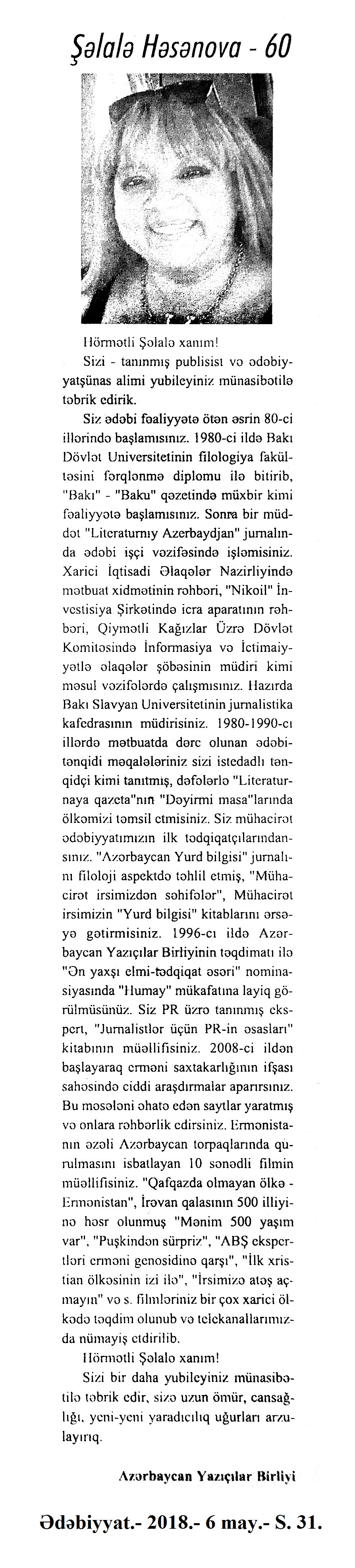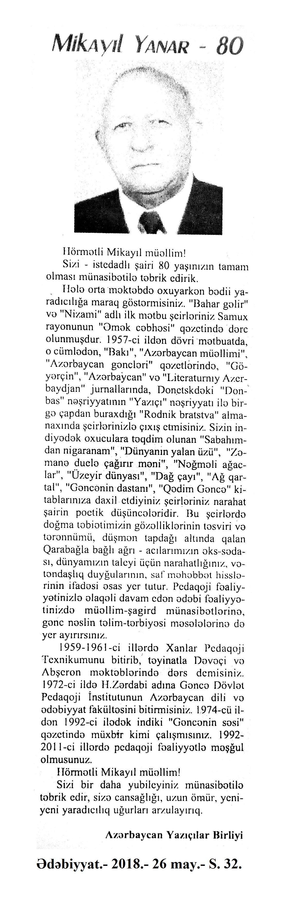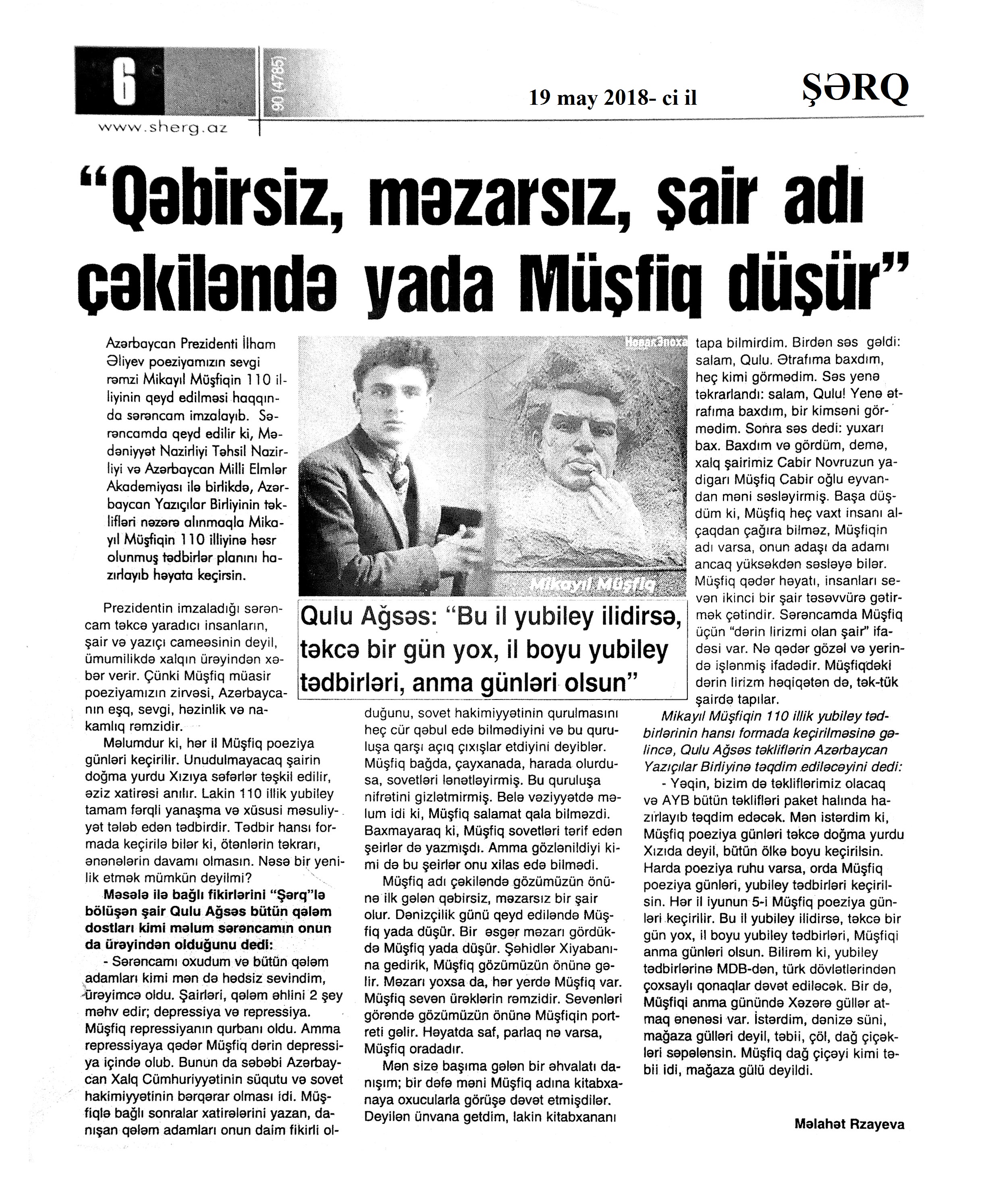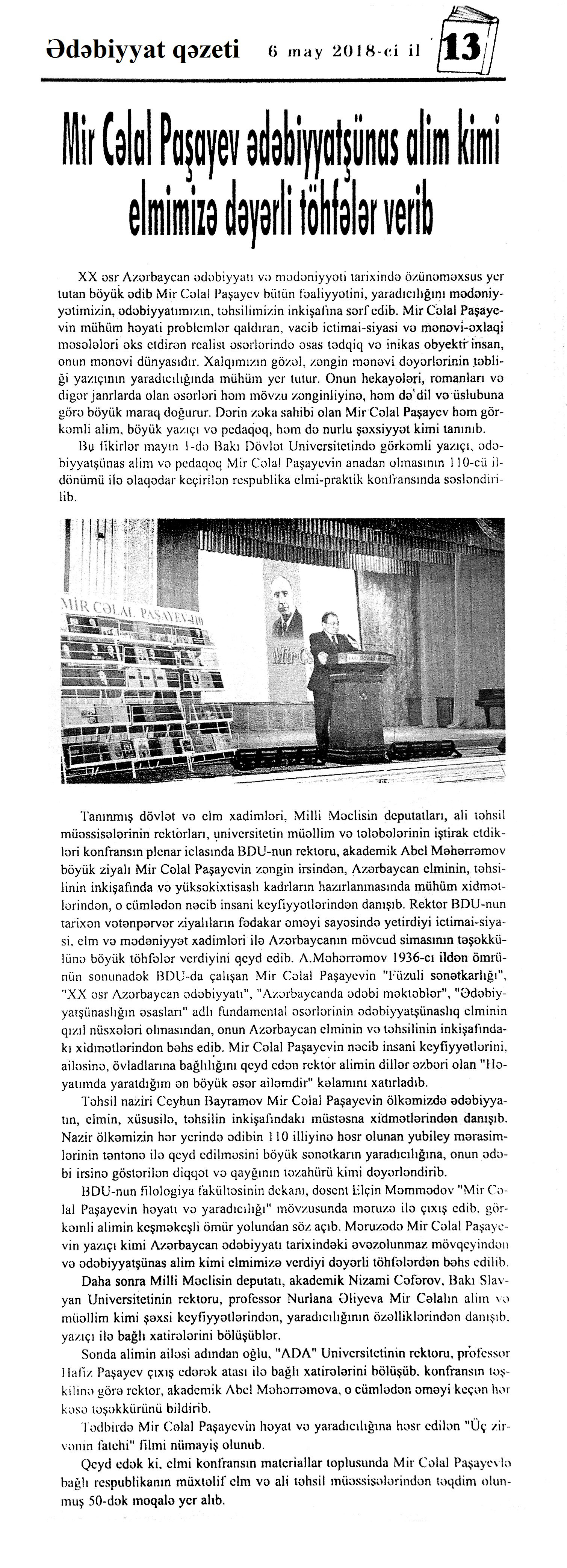 elektron məlumat bazasının təqdimatı keçirilib] 1152. “Mir Cəlal. Biblioqrafiya”sı və “Mir Cəlalın milli idealları” kitablarının təqdimatı olub: [Mədəniyyət Nazirliyi və Milli Kitabxana tərəfindən nəşr olunmuş eyniadlı bibloqrafiyanın və Nizami Cəfərovun “Mir Cəlalın milli idealları” kitablarının və “Mir Cəlal – 110” elektron məlumat bazasının Milli Kitabxanada təqdimatı] //Azərbaycan.-2018.- 1 may.- S.7.; Xalq qəzeti.-2018.- 1 may.- S.10.; Yeni Azərbaycan.-2018.- 1 may.- S.5. 1153. Mir Cəlal Paşayev Azərbaycan ədəbiyyatında dəstxəti ilə seçilən yazıçı, əsl elm fədaisi olub: [AMEA-nın Nizami Gəncəvi adına Ədəbiyyat İnstitutunda ədəbiyyatşünas alimin yubileyinə həsr olunan elmi konfrans keçirilib] //Azərbaycan.- 2018.- 12 may.- S.3. 1154. Mir Cəlal Paşayev ədəbiyyatşünas alim kimi elmimizə dəyərli töhfələr verib: [BDU-da keçirilən yubiley tədbiri haqqında] //Ədəbiyyat qəzeti. - 2018.- 6 may.- S.13. 1155. Mir Cəlal Paşayev ədəbiyyatşünas alim kimi elmimizə dəyərli töhfələr verib: [BDU-da ədəbiyyatşünas alimin yubileyinə həsr olunan respublika elmi-praktik konfransı keçirilib] //Azərbaycan.-2018.- 1 may.- S.7. 1156. Mir Cəlal Paşayevin 110 illiyilə bağlı elmi konfrans: [Nizami Gəncəvi adına Ədəbiyyat İnstitutunda] //525-ci qəzet.-2018.- 12 may.- S.12. 1157. Mir Cəlal Paşayevlə bağlı nəşrlər və elektron baza təqdim edildi: [M. F. Axundov adına Azərbaycan Milli Kitabxanasında] //525-ci qəzet . -2018.- 1 may.- S.7. 1158. Mir Cəlalın xatirəsinə həsr olunan hekayə müsabiqəsinin qalibləri mükafatlandırılıb: [İçərişəhərdəki “Ədibin evi”ndə keçirilən tədbir haqqında] //Azərbaycan.- 2018.- 24 may.- S.6.; Respublika.- 2018.- 24 may.- S.4.; Mədəniyyət.- 2018.- 25 may.- S.5. 1159. Mir Cəlalın 110 illiyi “Xatirələr” tamaşası ilə qeyd edilib: [Azərbaycan Dövlət Pedaqoji Kollecində] //Mədəniyyət.-2018.- 2 may.- S.6. 1160. Novruz, V. Mir Cəlalın romanları yeni araşdırmalar kontekstində //525-ci qəzet . -2018.- 18 may.- S.8. 1161. Müşfiq, Ş. Hekayənin bayramı: Mir Cəlal adına hekayə müsabiqəsinin qalibləri mükafatlandırılıb //525-ci qəzet.-2018.- 24 may.- S.7. 1162. Müşfiq, Ş. Satira və yumorun iki ustadı: Mir Cəlal və Əziz Nesin //525-ci qəzet.- 2018.- 2 may.- S.7. 1163. Nigar. “Mir Cəlal – yazıçı, alim və müəllim” [ADPU-da yazıçının yubileyinə həsr olunmuş eyniadlı Respublika Elmi Konfransı keçirilib] //Palitra.- 2018.- 23 may.- S.12. 1164. Novruz, V. Mir Cəlalın romanları: yeni araşdırmalar konteksində //Kredo.- 2018.- 10 may.- S.13. 1165. Novruz, V. Mir Cəlalın romanları: yeni araşdırmalar konteksində //Kredo.- 2018.- 17 may.- S.5. 1166. Tofiq, H. Azərbaycan ədəbiyyatında Mir Cəlal ədəbi irsi: Respublika Gənclər Kitabxanasında Mir Cəlalın 110 illik yubileyi ilə əlaqədar tədbir keçirilib //Azad Azərbaycan.- 2018.- 26 may.- S.5. Mikayıl Müşfiq – 110 1167. Cəmşidqızı, L. Nakam şairin yarımçıq qalan arzuları: Mikayil Müşfiq –110: [Sumqayıtda Əli Kərim adına Poeziya Evində şairin yubileyinə həsr olunmuş ədəbi-bədii gecə haqqında] //Azad Azərbaycan.- 2018.- 15 may.- S.7. 1168. Ələddinqızı, N. Ürəklərdə yuva salan Mikayıl Müşfiq //Səs.- 2018.- 22 may.- S.13. 1169. Əliyeva, A. Azərbaycan poeziyasında Müşfiq zirvəsi: I yazı //Türküstan.- 2018.- 28 may-4 iyun.- S.10. 1170. Əliyeva, A. Səni kim unudar...: Mikayıl Müşfiq – 110 //Mədəniyyət.- 2018.- 25 may.- S.13. 1171. Mikayıl Müşfiqin 110 illiyi qeyd ediləcək //Mədəniyyət.-2018.- 18 may.- S.2. 1172. Rzayeva, M. Qəbirsiz, məzarsız, şair adı çəkiləndə yada Müşfiq düşür //Şərq.- 2018.- 19 may.- S. 6. Anar – 80 1173. Anar. Təranənin ad günü: [yazıçı-dramaturqun bacısı Təranə Rzayeva haqqında] //525-ci qəzet.-2018.- 9 may.- S.7. 1174. Anarın 80 illiyi xarici mətbuatda //525-ci qəzet.-2018.- 15 may.- S. 7. 1175. Xalq yazıçısının yubileyi qeyd olunub: [Rəsul Rzanın Göyçay şəhərindəki ev-muzeyində] //Mədəniyyət.-2018.- 4 may.- S.11. 1176. Xarici mətbuat səhifələrində: [Anarın yubileyi ilə bağlı dərc olunmuş yazılar haqqında] //Ədəbiyyat qəzeti.- 2018.- 12 may.- S.10. 1177. Pənah, G. “Kitabi-Dədə Qorqud” dastanları və Anarın “Dədə Qorqud”la bağlı bədii, elmi düşüncələri //Kredo.- 2018.- 3 may.- S.3. 1178. Pənah, G. “Kitabi-Dədə Qorqud” dastanları və Anarın “Dədə Qorqud”la bağlı bədii, elmi düşüncələri //Kredo.- 2018.- 10 may.- S.3. 1179. Pənah, G. “Kitabi-Dədə Qorqud” dastanları və Anarın “Dədə Qorqud”la bağlı bədii, elmi düşüncələri //Kredo.- 2018.- 17 may.- S.3. 1180. Şirinov, Ə. Gün keçdi, ömür hələ keçməyib: [yazıçının yaradıcılığı haqqında] //Kaspi.-2018.- 12-14 may.- S.18. Elçin – 75 1181. Akimova, E. Hekayə diskurs kimi: Tut budağı, ərik budağı və sarı bülbül: [Xalq yazıçısının eyniadlı hekayəsinin təhlili] //Ədəbiyyat qəzeti: xüsusi buraxılış.- 2018.- 5 may.- S.10-11. 1182. Amin, S. XX əsrin əvvəllərində...: [yazıçının yubileyi münasibətilə] //Ədəbiyyat qəzeti: xüsusi buraxılış.- 2018.- 5 may.- S.31. 1183. Anar. Elçinin zarafatları: Elçinin yubileyinə qeyri-yubiley yazısı //Ədəbiyyat qəzeti: xüsusi buraxılış.-2018.- 5 may.- S.3. 1184. Babasoy, Ü. Zamanı qabaqlamağın estetikası //Ədəbiyyat qəzeti: xüsusi buraxılış.- 2018.- 5 may.- S.21. 1185. “Baladadaşın toy hamamı” müəllifin yubileyinə həsr edilib: [Cənnət Səlimovanın Musiqili Teatrda hazırladığı eyniadlı tamaşa haqqında] //Mədəniyyət.- 2018.-16 may.- S.9. 1186. Bəhmənli, V. Kamil yazıçı və şəxsiyyət obrazı: [Xalq yazıçısının yubileyi münasibətilə] //Ədəbiyyat qəzeti: xüsusi bur