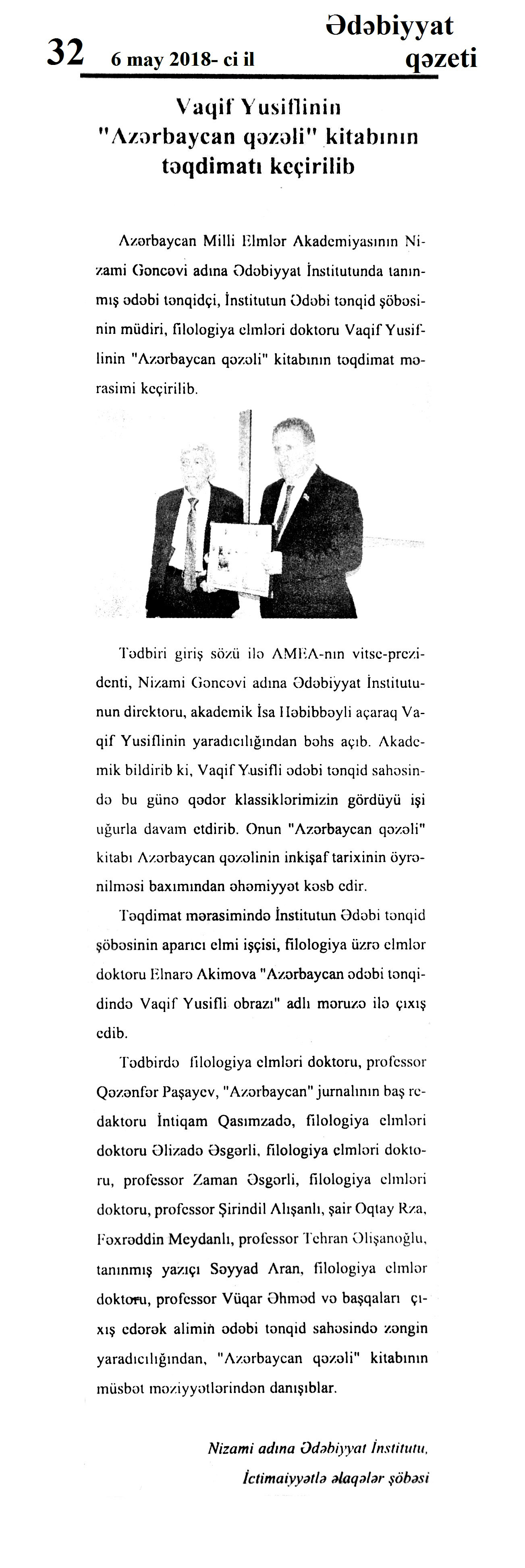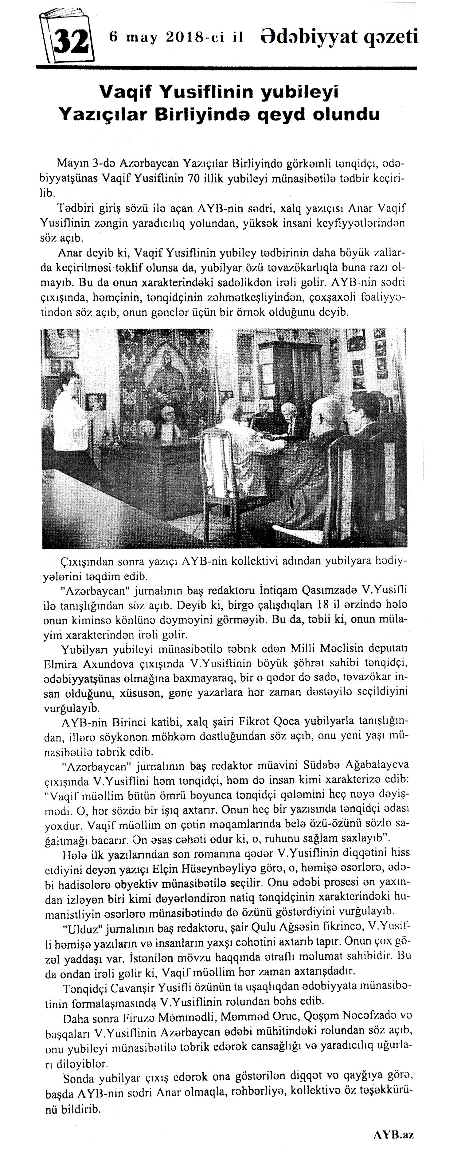 Yusifli Vaqif – 70 1241. “Azərbaycan qəzəli” kitabının təqdimatı: [Nizami Gəncəvi adına Ədəbiyyat İnstitutunda filologiya elmləri doktoru Vaqif Yusiflinin eyniadlı kitabının təqdimatı haqqında] //Mədəniyyət.- 2018.- 9 may.- S.10.; 525-ci qəzet.-2018.- 5 may.- S.12. 1242. Ədəbiyyatşünas alimin yubileyi qeyd olunub: [AYB-də keçirilən tədbir haqqında] //Mədəniyyət.- 2018.- 16 may.- S.14. 1243. Müşfiq, Ş. Vaqif Yusiflinin yubileyi Yazıçılar Birliyində qeyd olundu //525-ci qəzet.-2018.- 4 may.- S.7. 1244. Rəşid, M. Vaqif Yusifli ilə bayram kimi bir görüş: [Abşeron Rayon Mərkəzi Kitabxanasında] //525-ci qəzet.-2018.- 1 may.- S.8. 1245. Vaqif Yusiflinin “Azərbaycan qəzəli” kitabının təqdimatı keçirilib: [AMEA-nın Nizami adına Ədəbiyyat İnstitutunda] //Ədəbiyyat qəzeti. -2018.- 6 may.- S.32. 1246. Vaqif Yusiflinin yubileyi Yazıçılar Birliyində qeyd olundu //Ədəbiyyat qəzeti.-2018.- 6 may.- S.32. 1247. Yusifli, V. Cavad Zeynalla görüş... amma şair kimi //525-ci qəzet.-2018.- 31 may.- S.8. 1248. Yusifli, V. Ədəbi tənqidçi öz bölüyünə atəş açan əsgərdir: [Vaqif Yusiflinin müsahibəsi] /müsahibəni apardı Günel Şamilqızı, Aytac Quliyeva //Kaspi.-2018.- 12-14 may.- S.16-17. 1249. Yusifli, V. Əgər səmimiyyət varsa...: [şair Fəxrəddin Teyyubun yaradıcılığı haqqında] //Ədalət.-2018.- 6 may.- S.6. 1250. Yusifli, V. “Qələm ancaq sözdən yazar”: [şairə Səmayə Güləliqızının yaradıcılığı haqqında] //Ədalət.-2018.- 17 may.- S.6. 1251. Yusifli, V. Ömür keçir, gün keçir...: (Tanınmış yazıçı-publisist Əlövsət Bəşirlinin 80 yaşı münasibətilə) //Ədalət.- 2018.- 26 may.- S.15. 1252. Yusifli, V. Poeziya... Poeziya...: (2017): III //Ədalət.- 2018.- 5 may.- S.15. 1253. Yusifli, V. Poeziya... Poeziya...: (2017): IV //Ədalət.- 2018.-12 may.- S.15. 1254. Yusifli, V. Unudulmaz Qabilimiz: (Xalq şairinin özü və onun yeddi cildliyi haqqında) //Ədalət.- 2018.- 19 may.- S.15.