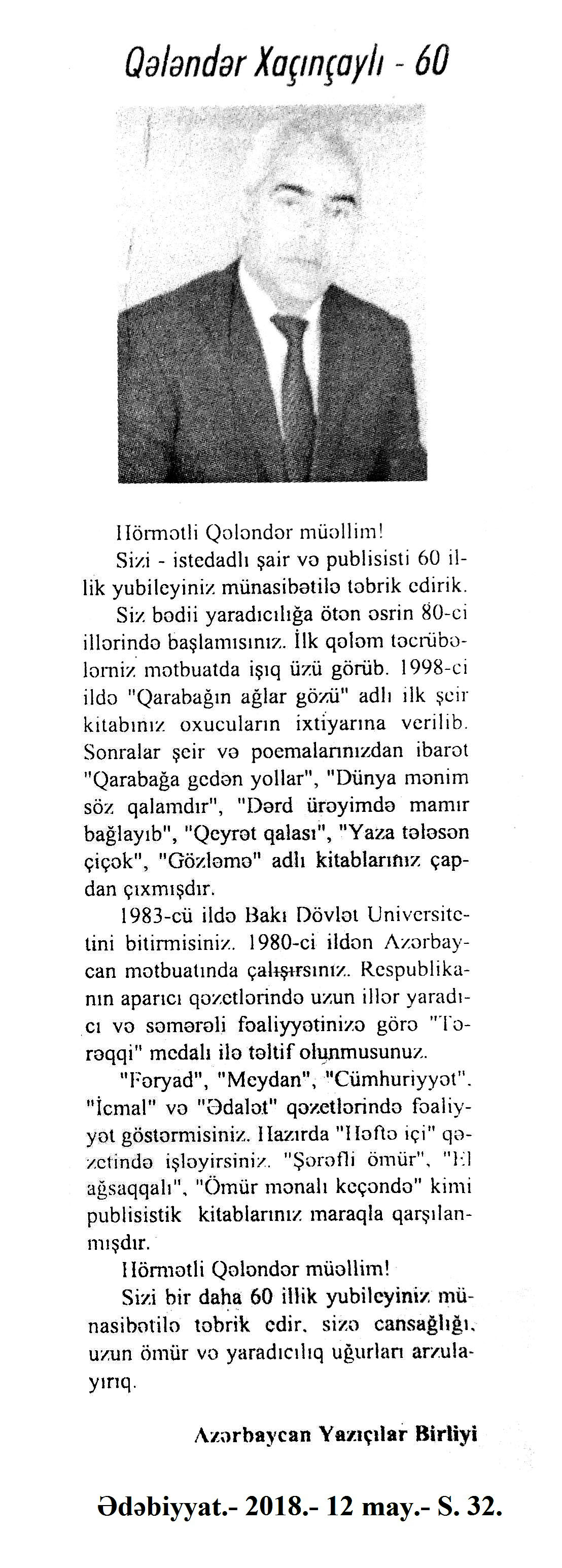 Qələndər Xaçınçaylı – 60 1272. Bayramov, Q. Bir kövrək nəğmədir həyatım mənim...: [tanınmış şair, yazıçı-publisist haqqında] //Ədalət.- 2018.- 9 may.- S.7. 1273. Bayramov, Q. Qəlbi Qarabağla döyünən şair: Qələndər Xaçınçaylının 60 yaşına //525-ci qəzet.- 2018.- 3 may.- S.7. 1274. Qələndər Xaçınçaylı – 60: [şairin yubileyi münasibətilə AYB-nin təbriki] //Ədəbiyyat qəzeti.- 2018.- 12 may.- S.32.