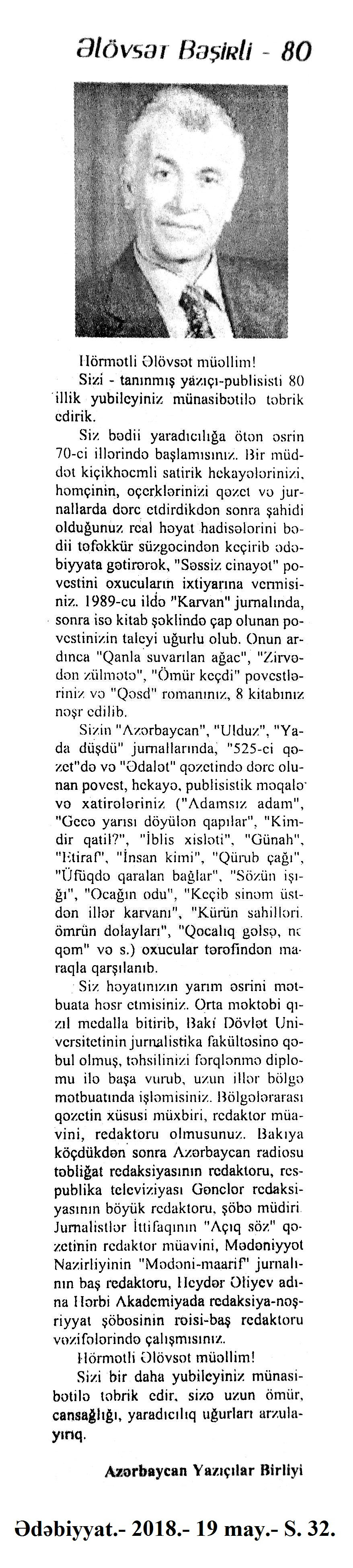 ƏDƏBİYYATŞÜNASLIQ VƏ ƏDƏBİ TƏNQİD 962. Abbaslı, T. Vətən yanğılı, millət qanlı Qantəmir: Bu sözləri 48 il öncə “qədim” sovet universitetimizdə – çox azsaylı milli müəllimlərimizin birindən eşitmişəm...: [publisist-yazıçı, görkəmli maarif xadimi Qantəmir – Qafur Sədrəddin oğlu Əfəndiyev haqqında] //Mədəniyyət.-2018.- 23 may.- S.13. 963. Abdullayev, İ. Onun “Hünər” dastanı”: Şair Məmməd Kazımın xatirəsinə //Ədalət.- 2018.- 1 may.- S.5. 964. Adışirinov, K. Yazıçı və hüquqşünas Mustafa bəy Əlibəyov: erməni-bolşevik məkrinin qurbanı //525-ci qəzet.-2018.- 22 may.- S.4. 965. “Adil Babayev – 80” kitab sərgisi: [filologiya elmləri doktoru, professor] //525-ci qəzet.-2018.- 1 may.- S.8. 966. Adil Qasımlı – 80: [şair-publisistin yubileyi münasibətilə AYB-nin təbriki] //Ədəbiyyat qəzeti.- 2018.- 12 may.- S.30. 967. Ağazadə, Ə. “Şuşanın dağları... başı dumanlı”: Abid Tahirlinin “Mətbuat: millətin dili, gücü və güzgüsü” kitabını oxuyarkən //525-ci qəzet.-2018.- 8 may. - S.8. 968. Albalıyev, Ş. “Mifin tarixə müdaxiləsi” əbədi prosesdir: [folklorşünas Səfa Pənah oğlu Qarayevin “Mifin tarixə müdaxiləsi: 21 dekabr 2012-ci il” monoqrafiyası haqqında] //Xalq cəbhəsi.- 2018. - 11 may. - S.13. 969. Atilla, İ. Əli Sultanlı dühası, Əli Sultanlı fenomeni //Kredo.- 2018.- 3 may.- S.5;7. 970. Atilla, İ. Əli Sultanlı dühası, Əli Sultanlı fenomeni //Kredo.- 2018.- 10 may.- S.5;7. 971. Aytel, İ. “Anatağın Ay yuxusu”: [şairə Aləmzər Əlizadənin eyniadlı kitabı haqqında] //Kaspi.- 2018.- 19-21 may.- S.20. 972. Ayvaz, O. Kinomuz da ədəbiyyatımızın tayı olub...: [bununla bağlı yazıçıların münasibəti] //Ədalət.- 2018.- 22 may.- S.8. 973. Azərbaycan dilinə çevrilən Misir nağılları uşaqların gözü ilə: “Əsrarəngiz Misir nağılları” kitabının təqdimatı və rəsm sərgisi: [Uşaq-Gənclər İnkişaf Mərkəzinin Təsviri sənət qalereyasında eyniadlı kitabın təqdimatı və nəşrə çəkilən rəsm əsərlərinin sərgisi haqqında] //Mədəniyyət.- 2018.- 16 may.- S.4. 974. Azəri, L. Mühacirət poeziyamızdan boylanan vətən nisgili: [Almas İldırım, Kərim Yaycılı, Əmin Abid (Gültəkin), Alazan Baycan haqqında] //Mədəniyyət.- 2018.-2 may.- S.15. 975. Babanlı, V. Allaha yalvarıram ki, romanımı tamamlamaq üçün mənə imkan versin: Vidadi Babanlı ilə 91 illik söhbət...: [müəllifin müsahibəsi] //Xalq cəbhəsi.-2018.- 12 may.- S.15. 976. Babanlı, V. 91 yaşlı Vidadi Babanlı: Gecələr Allaha yalvarıram ki...: [yazıçının müsahibəsi] //Bizim yol.-2018.- 12 may.- S.15. 977. Babayev, A. Əbədiyyət nəğməsi: [Fikrət Qocanın “Gərək bu günləri görəydin, Ata...” kitabı haqqında] //Ədəbiyyat qəzeti.-2018.- 26 may.- S.11. 978. Bahadurqızı, Y. Hər birimiz vətən uğrunda şəhid olanların qarşısında borcluyuq: [filologiya üzrə fəlsəfə doktoru Yaqut Bahadurqızı ilə müsahibə] /müsahibəni apardı Vahid Məhərrəmov //Ədalət.- 2018.- 26 may.- S.12. 979. Bayramlı, G. Yazıçı oxucusu ilə üz-üzə gələndə: Qobustan rayonunun ucqar kəndində yazıçı Varislə görüş olub //Azad Azərbaycan. - 2018.- 9 may.- S.6. 980. Bədəlov, Ş. Əhməd Yəsəvi mərifətində təsəvvüf və irfan: [sufi türk aliminin yaradıcılığı haqqında] //Ədəbiyyat qəzeti. -2018.- 6 may.- S.28. 981. Bədəlov, Ş. Nəğmə yazan ləçəklərin simfoniyası: [şair Ramiz Rövşənin yaradıcılığı haqqında] //Ədəbiyyat qəzeti.- 2018.- 19 may.- S.19. 982. Bədnam qonşu xisləti ədəbi əsərlərdə: [professor Buludxan Xəlilovun “Azərbaycan ədəbiyyatında erməni xisləti” kitabının çapdan çıxması haqqında] //Mədəniyyət.- 2018.- 9 may.- S.10. 983. Bəşirov, S. Xarakter: [şair Nəriman Əbdülrəhmanlının yaradıcılığı haqqında] //Kredo -2018.- 31 may.- S.13. 984. Biz insanların haqqı olan Qarabağ torpağımız işğaldan azad edilməlidir: [şair-publisist Vaqif Bəhmənlinin doğum günü ilə bağlı] //Ədalət.-2018.- 24 may.- S.4. 985. “Böyük ömrün salnaməsi”: Salatın Əhmədlinin kitabı işiq üzü gürüb //Şərq.-2018.- 18 may.- S. 12. 986. Buludxan Xəlilov: Yazıçılarımız birbaşa, dolayı yolla, bəzən sətiraltı yazmaqla erməni məsələsini öz əsərlərində diqqətdən kənarda saxlamayıblar: [ADPU-nun filologiya fakültəsinin dekanı, professor Buludxan Xəlilovla müsahibə] /müsahibəni apardı Mahmud Əyyub //Palitra.-2018.- 31 may.- S.13. 987. Camal Zeynaloğlu – 60: [yazıçı-publisistin yubileyi münasibətilə Azərbaycan Yazıçılar Birliyininin təbriki] //Ədəbiyyat qəzeti.- 2018.- 12 may.- S.32. 988. Cəfər Bünyadzadə və onun “Məhəbbət uğrunda siyasət” romanı: [“Tuti” jurnalının baş redaktorunun yaradıcılığı haqqında] //Kredo.- 2018.- 24 may.- S.5;7. 989. Cəfər Bünyadzadə və onun “Məhəbbət uğrunda siyasət” romanı: [“Tuti” jurnalının baş redaktorunun yaradıcılığı haqqında] //Kredo.- 2018.- 31 may.- S.10. 990. Cəfərov, N. Şairin Tanrı sövdaları...: [Dəyanət Osmanlı haqqında] //Üç nöqtə.- 2018.- 2 may.- S.12. 991. Çobanoğlu, F. Başım cəllad əlində - nə kəsər, nə bağışlar... [şair Əli Mahmudun yaradıcılığı haqqında] //Bakı Xəbər.-2018.- 4 may.- S.14. 992. Çobanoğlu, F. Ruhu məğlubiyyətlə barışmayan şair: Əli Mahmudun 70 illiyinə //525-ci qəzet.-2018.- 8 may. - S.8. 993. Dəmirçioğlu, N. Dünya ədəbiyyatında dedektiv və Çingiz Abdullayev //Ədəbiyyat qəzeti.-2018.- 12 may.S.25. 994. Dünyaminqızı, Q. Böyük Sabir nəslinin davamçıları: Onun nəvələri də İkinci Dünya müharibəsində vuruşub: [şair Mirzə Ələkbər Sabirin şəxsi həyatı haqqında] //Kaspi.-2018.- 3 may.- S.15. 995. Dünyaminqızı, Q. Sabirin ə