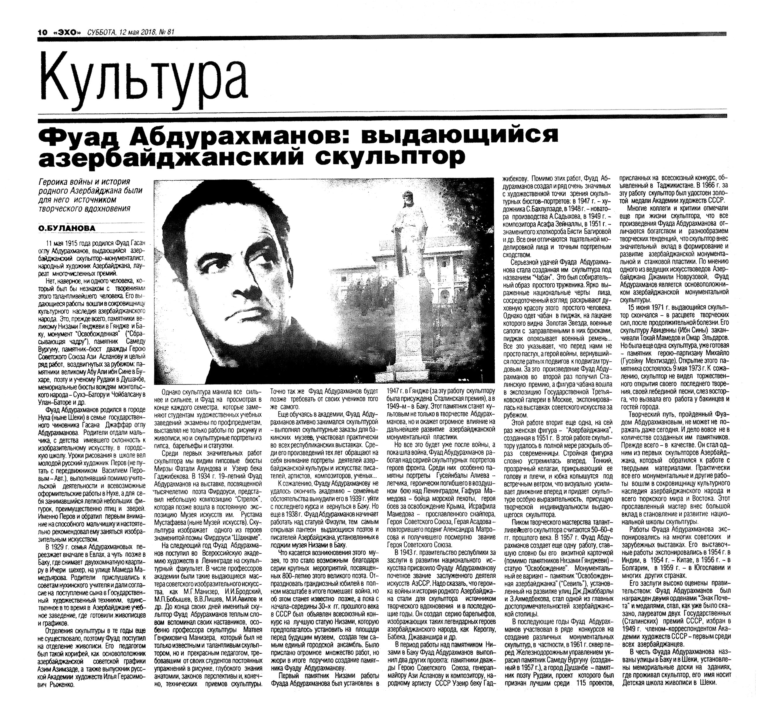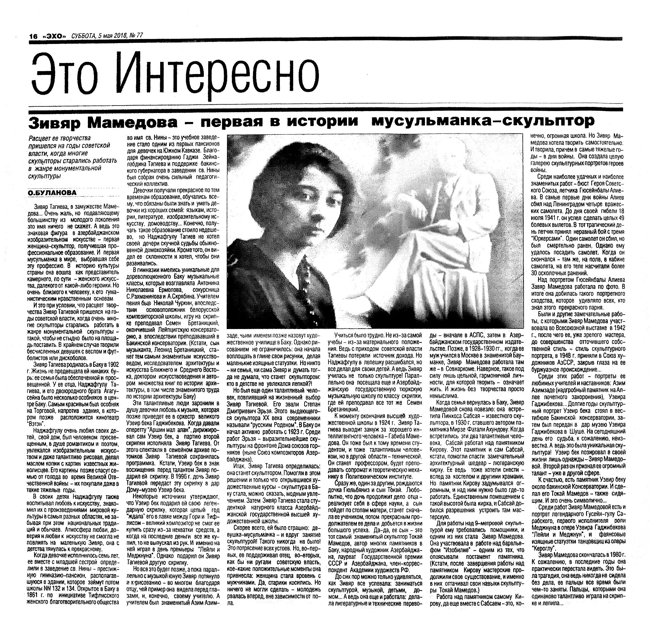 СКУЛЬПТУРА 1483. Буланова, О. Зивяр Мамедова-первая в истории мусульманка- скульптор //Эхо.- 2018.- 5 мая.- С.16. 1484. Буланова, О. Памяти Токая Мамедова: На 91-м году скончался выдающийся скульптор //Эхо.- 2018.-12 мая.- С.16. 1485. Буланова, О. Фуад Абдурахманов: Выдающийся азербайджанский скульптор //Эхо.- 2018.-12 мая.- С.10. 1486. Микеладзе, Г. Сотвори вечность достойным и не будешь забыт сам: К 90-летию скульптора, профессора Кямала Алекперова //Азербайджанские известия.- 2018.- 19 мая.- С.3. 1487. Скончался скульптор Токай Мамедов //Ежедневные новости.- 2018.- 4 мая.- С.5. 1488. Состоялась церемония открытия комплекса надгробного памятника академику Рафиге Алиевой: скульптура Натига Алиева //Бакинский рабочий.- 2018.- 8 мая.- С.6. 1489. Toкай Габиб оглу Мамедов: Некролог //Бакинский рабочий.- 2018.- 3 мая.- С.2. 1490. Хагверди, Г. Творчество - это когда тебя могут читать: Мастерская художника - святая святых его внутренней жизни: [беседа со скульптором Г.Хагверди] /провела А.Ислам //Каспiй.- 2018.- 3 мая.- С.13.
