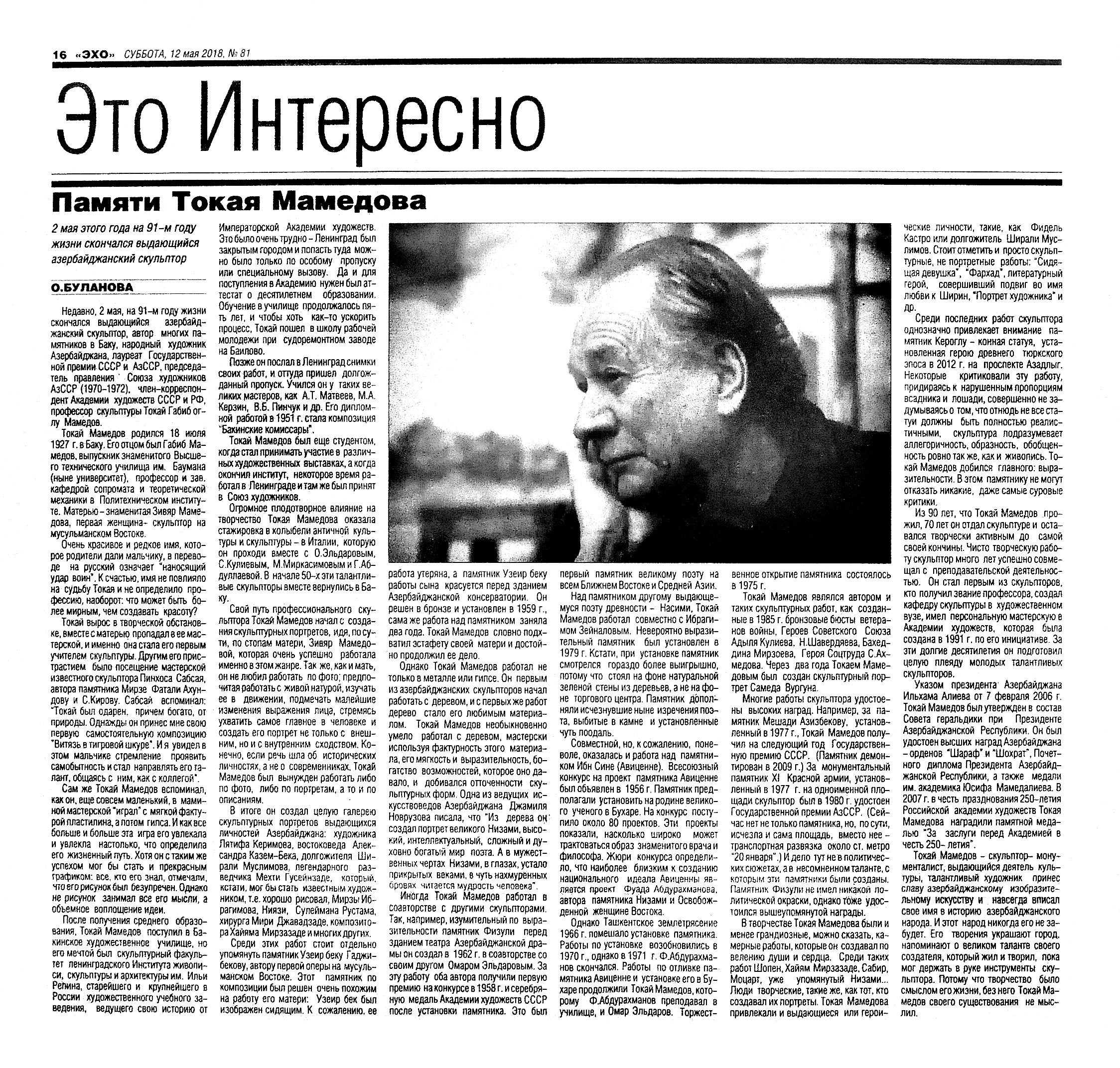 Tokay Məmmədovun vəfatı ilə əlaqədar 657. Fərəcov, S. Sənətkarla vida mərasimi: Xalq rəssamı Tokay Məmmədov son mənzilə yola salındı //Mədəniyyət.- 2018.- 4 may.- S.4. 658. Xalq Rəssamı Tokay Məmmədov son mənzilə yola salınıb //Azərbaycan.- 2018.- 4 may.- S.11. 659. Tokay Həbib oğlu Məmmədov: [Xalq rəssamı, heykəltəraşın vəfatı ilə əlaqədar] //Azərbaycan.- 2018.- 3 may.- S.3.; Mədəniyyət.- 2018.- 4 may.- S.3.