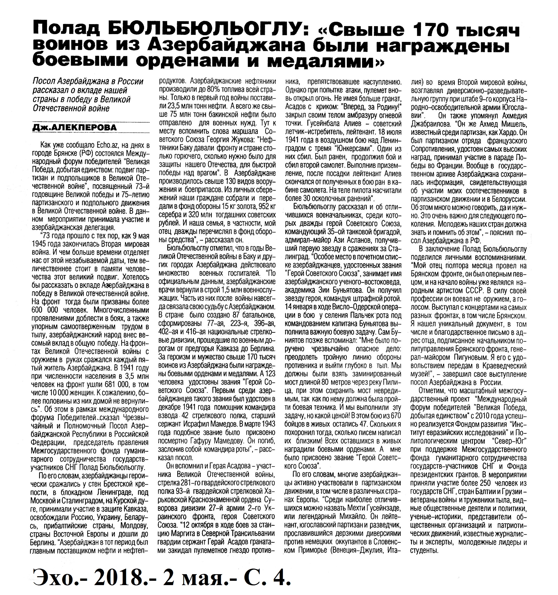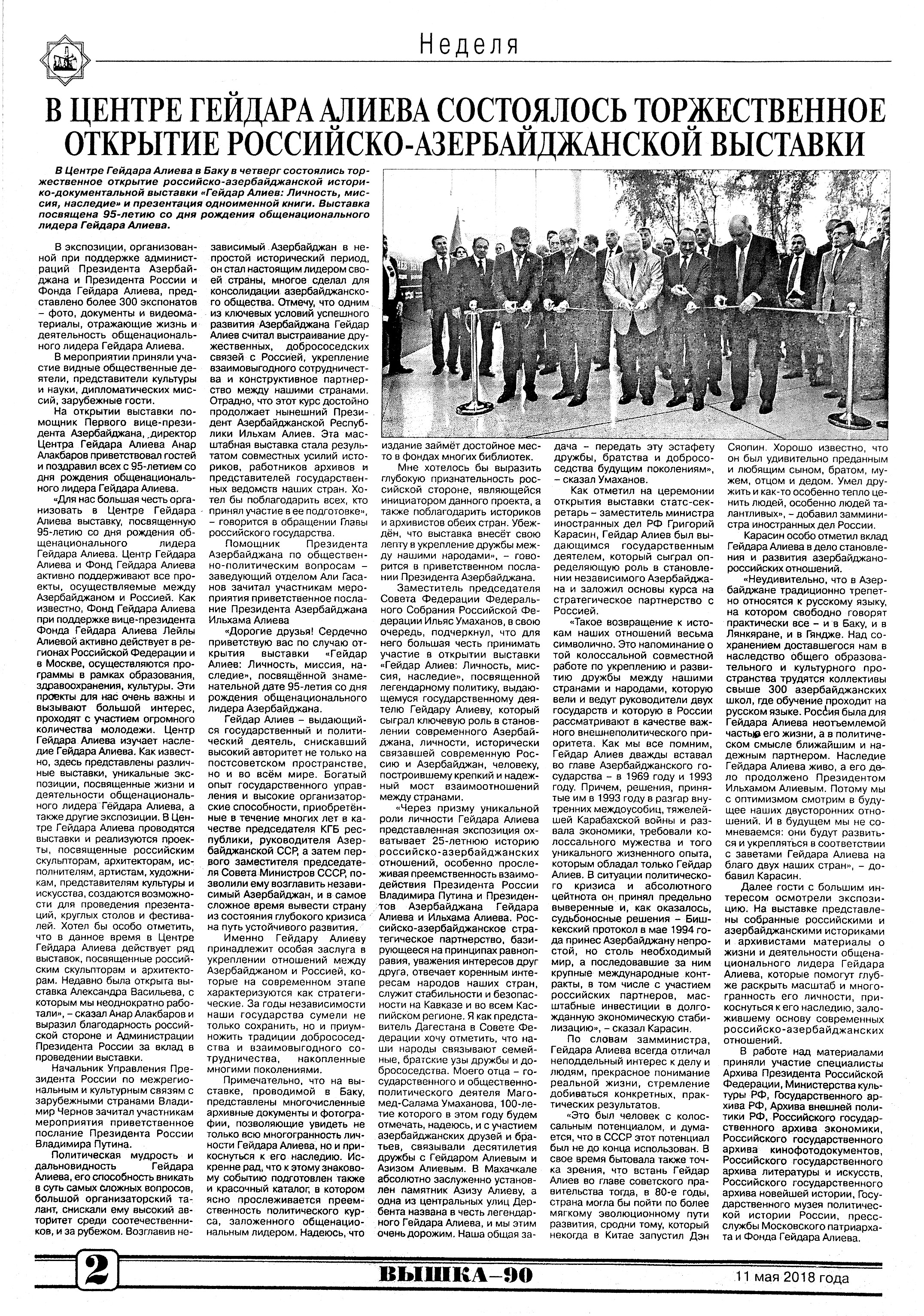 День победы 1430. Алекперова, Дж. Полад Бюльбюльоглы: "Свыше 170 тысяч воинов из Азербайджана были награждены боевыми орденами и медалями" //Эхо.- 2018.- 2 мая.- С. 5. 1431. В Академии Гейдара Алиева СГБ отмечена 73-я годовщина Победы над фашизмом //Бакинский рабочий.- 2018.- 8 мая.- С.6. 1432. В Астане состоялась презентация книги «Открывший путь на Родину» на казахском языке по случаю 95-летия со дня рождения великого лидера Гейдара Алиева: [предисловие к книге написал Президент Республики Казахстан Нурсултан Назарбаев] //Бакинский рабочий.- 2018.- 17 мая.- С.9. 1433. В Баку состоялась праздничная встреча с ветеранами ВОВ и членами Общественного объединения жителей блокадного Ленинграда //Вышка.- 2018.- 11 мая.- С.6. 1434. В «Доме литератора» состоялась литературно-музыкальная церемония по случаю 95-летия со дня рождения общенационального лидера Гейдара Алиева //Бакинский рабочий.- 2018.- 17 мая.- С.11. 1435. В Мадриде показан документальный фильм «Цель – Баку. Как Гитлер проиграл битву за нефть» //Бакинский рабочий.- 2018.-11мая.- С.11. 1436. В Подмосковье открыли памятник бакинской нефти: [в Военно-историческом музее Истринского района] //Ежедневные новости.-2018.-11 мая.- С.3. 1437. Гасанов, А. Гейдар Алиев и учение о национальной государственности - Азербайджанство //Бакинский рабочий.- 2018.- 17 мая.- С.10-11. 1438. Президент Ильхам Алиев принял участие в проведенной в Баку церемонии по случаю 9 Мая – Дня Победы //Бакинский рабочий.- 2018.- 11мая.- С.6.