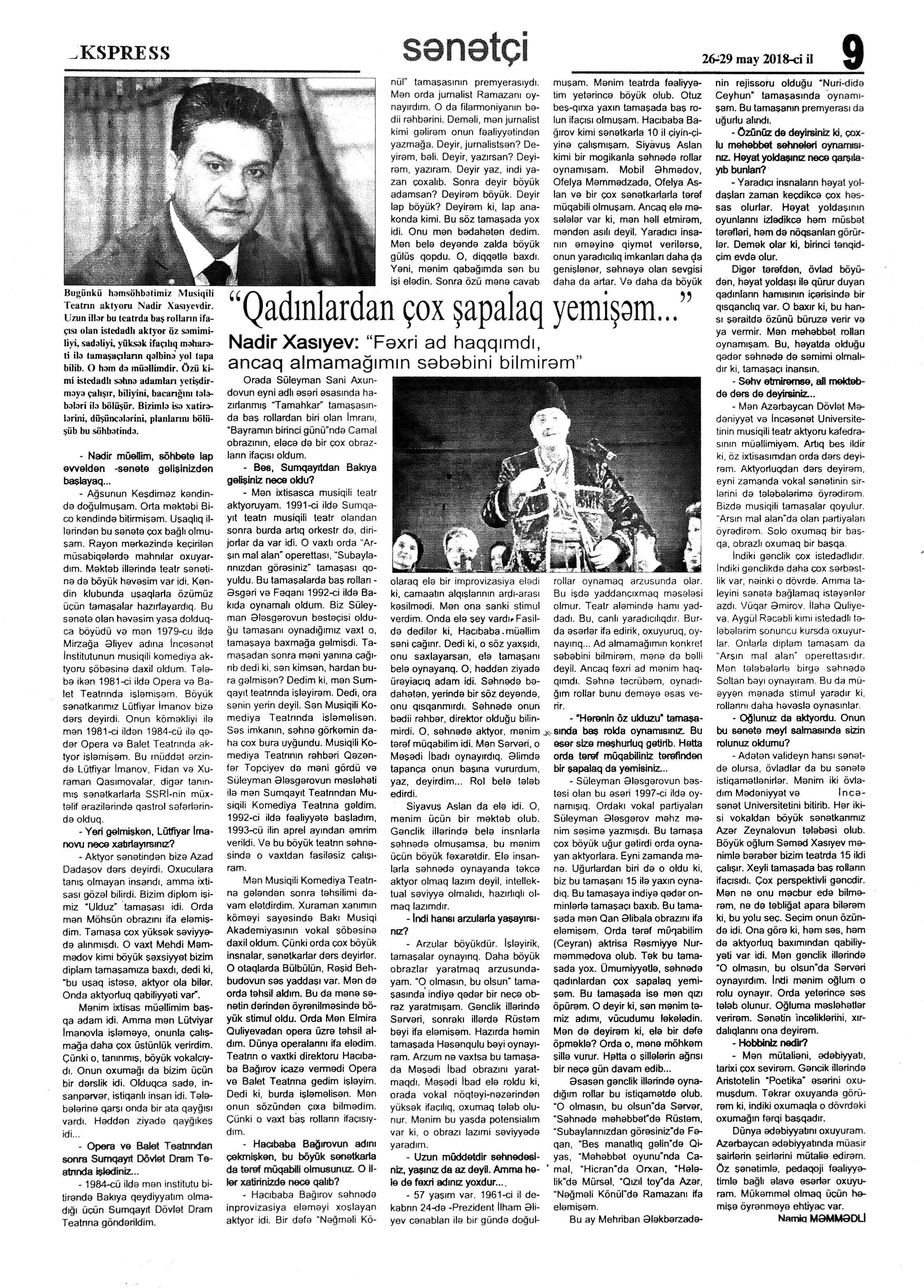 Azərbaycan Dövlət Musiqili Teatrı 850. Xasıyev, N. Qadınlardan çox şapalaq yemişəm...: Nadir Xasıyev: Fəxri ad haqqımdı, ancaq almamağımın səbəbini bilmirəm: [teatrın aktyoru ilə müsahibə] /müsahibəni apardı Namiq Məmmədli //Ekspress.- 2018.- 26-29 may.- S.9. 851. Musiqili Teatrın solisti TÜRKSOY-un diplomuna layiq görülüb: [Türkiyənin Qaziantep şəhərində Beynəlxalq opera və balet festivalının açılış mərasimində Eleonora Mustafayevanın diploma layiq görülməsi haqqında] //Mədəniyyət.-2018.-23 may.- S.10. 852. Musiqili Teatrında yeni tamaşa “Qodonun intizarında”: [Yunis Vəlipurun hazırladığı eyniadlı tamaşanın nümayişi haqqında] //Mədəniyyət.-2017.- 18 may.- S.6.