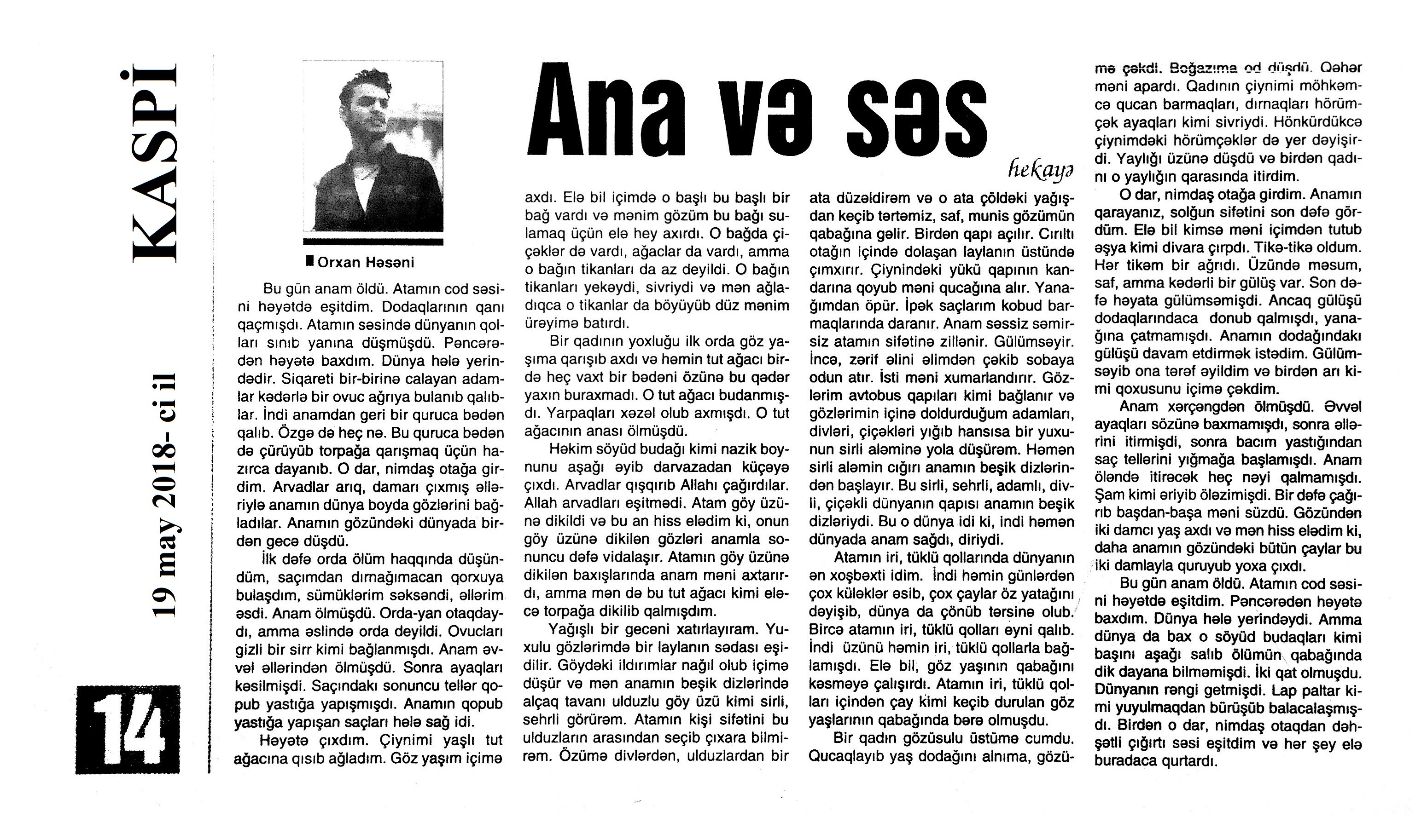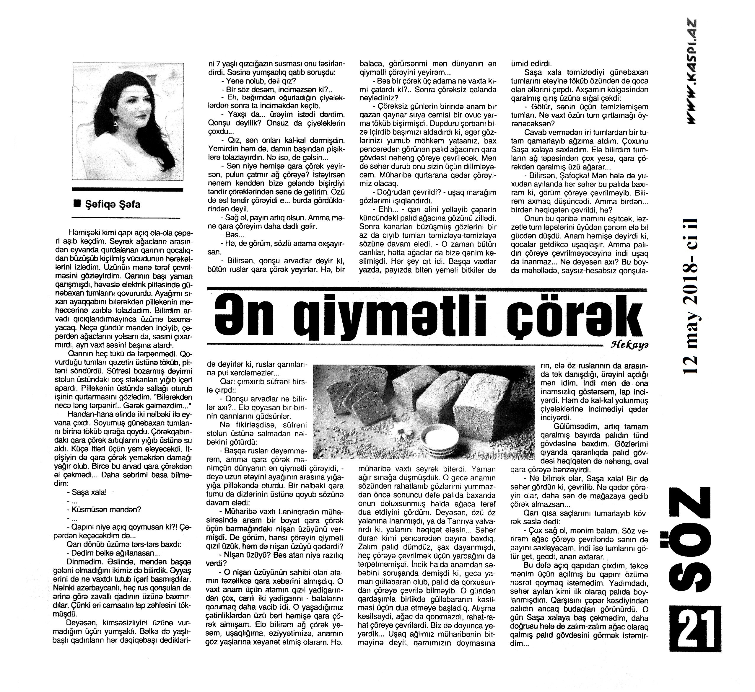 HEKAYƏLƏR 915. Abdulla, M. Daş karxanası //525-ci qəzet.-2018.- 4 may.- S.7. 916. Azər, A. Balıncın altındakı pullar //Ədəbiyyat qəzeti.-2018.- 19 may.- S.12. 917. Babayev, B. Tənha qarğalar //Kredo.- 2018.- 10 may.- S.11. 918. Babayev, B. Tənha qarğalar //Kredo.-2018.- 17 may.- S.13. 919. Cabbarlı, A. Ərəb ərəb şeyxini necə yola saldı... //Ədalət.-2018.- 22 may.- S.6. 920. Əlabbas. Yadigar //Ədəbiyyat qəzeti.- 2018.- 6 may.- S.24-25. 921. Fikrətoğlu, O. Külək adam //Ədəbiyyat qəzeti.-2018.- 19 may.- S.7. 922. Haqverdiyev, Ə. Pir //Ədalət.- 2018.- 18 may.- S.1;5. 923. Həcər. Şərabdan şirin //Kaspi.-2018.- 26-29 may.- S.18-19. 924. Həsəni, O. Ana və səs //Kaspi.- 2018.- 19-21 may.- S.14. 925. İdris, Y. Axşam marşı //Kaspi.- 2018.- 19-21 may.- S.14. 926. İsgəndərli, B. Gecikmiş etiraf, yaxud məni bağışla: Mühəndis Vəzifə Əmirbəyovaya hörmətlə //Palitra.-2018.- 18 may.- S.13. 927. İsgəndərli, B. Plutarxın ölümü //Ədəbiyyat qəzeti.-2018.- 19 may.- S.25. 928. Kreve, V. Qartal haqqında nəğmə: Rəvayət: [Litva ədəbiyyatı] /tərc.etdi Mahir Həmzəyev //Ədəbiyyat qəzeti.- 2018.- 26 may.- S.24. 929. Qədir, C. İtki //Ədəbiyyat qəzeti.- 2018.- 26 may.- S.24. 930. Qocabəyli, N. Yumşaq ürək və daş ev //Ədəbiyyat qəzeti.- 2018.- 6 may.- S.22-23. 931. Montale, E. Konsert: [italyan ədəbiyyatı] /tərc.etdi Əyyub Qiyas //Ədəbiyyat qəzeti.-2018.- 19 may.- S.30. 932. Rəhimov, Ə. Turp ağacı //Ədalət.- 2018.- 3 may.- S.8. 933. Rüstəm, Q. Bəxtin beləsi //Kaspi.-2018.- 26-29 may.- S.19-20. 934. Seyidli, P. “Bayatı-Şiraz”: Minimalist üslubda kino ekspressiya //Ədəbiyyat qəzeti.- 2018.- 6 may.- S.8-9. 935. Səlim, S. Moruq kolu //Ədəbiyyat qəzeti.- 2018.- 6 may.- S.23. 936. Şəfa, Ş. Ən qiymətli çörək //Kaspi.-2018.- 12-14 may.- S.21. 937. Tağıyev, A. Marafon qaçışı: (sənədli hekayə) //525-ci qəzet.-2018.- 4 may.- S.8. 938. Tahir, Ü. Qınaq //Kaspi.- 2018.- 5-7 may.- S.24. 939. Vahid,T. Vağzaldakı qarı //Ədəbiyyat qəzeti.- 2018.- 12 may.- S.11. 940. Veysəlli, N. Bünövrə daşı //Ədalət.- 2018.- 15 may.- S.8.