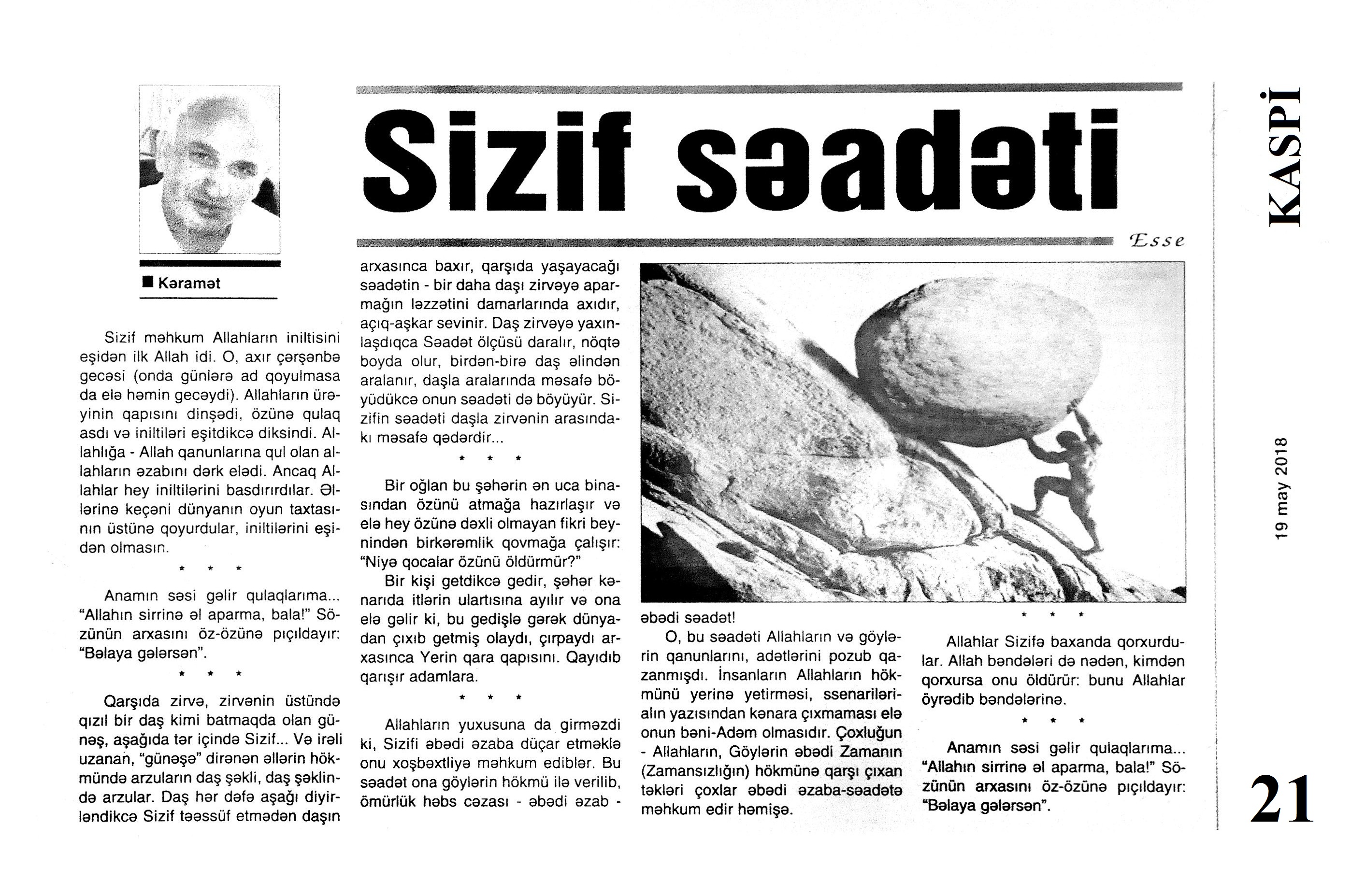 ESSELƏR 941. Eminov, A. İllərə nə var ki... //Ədalət.-2018.- 18 may.- S.6. 942. Kəramət. Seçilənlər //Kaspi.- 2018.- 19-21 may.- S.21. 943. Kəramət. Sizif səadəti //Kaspi.- 2018.- 19-21 may.- S.21. 944. Vüsal, B. Ənəlhəq deyən kişi...: [yazıçı İsa Muğannaya həsr edilib] //Ədəbiyyat qəzeti.-2018.- 19 may.- S.22-23. 945. Yusifli, R. Bir eloğlum haqqında esse: [Füzuli rayonunun keçmiş icra başçısı Nəbi Muxtarov haqqında] //Ədalət.-2018.- 24 may.- S.5.