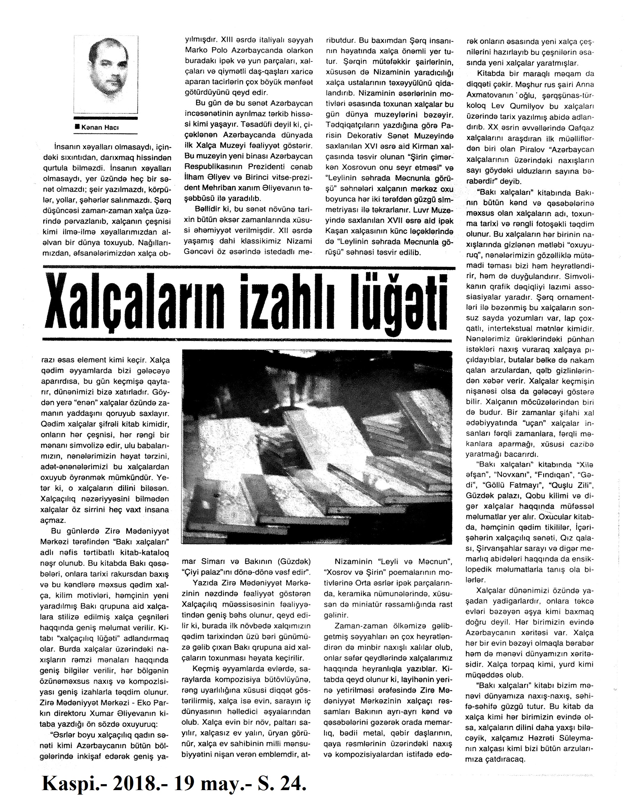 DEKORATİV-TƏTBİQİ İNCƏSƏNƏT 660. Əliyev, İ. “Azərxalça” ASC-nin Xaçmaz filalı istifadəyə verilib: Prezident İlham Əliyevin çıxışı: [Xaçmaz rayonuna səfəri çərçivəsində] //Azərbaycan.- 2018.- 5 may.- S.2. 661. Hacı, K. Xalçaların izahlı lüğəti: [Zirə Mədəniyyət Mərkəzi tərəfindən “Bakı xalçaları” adlı kitab-kataloqun nəşri haqqında] //Kaspi.- 2018.- 19-21 may.- S.24. 662. Xaçmazda metal üzərində bədii döymə əsərlərindən ibarət sərgi açılıb: [Xaçmaz Dövlət Rəsm Qalereyasında] //Yeni Azərbaycan.- 2018.- 18 may.- S.7. 663. Xalçaçılar təltif edilib: [Azərbaycanda xalçaçılıq sənətinin inkişafındakı səmərəli fəaliyyətlərinə görə] //Mədəniyyət.- 2018.- 9 may.- S.2. 664. Xədicə. Daşkənddə “Kəlağayı – Azərbaycan ipəyinin dürdanəsi” təqdim olundu: [Heydər Əliyev adına Azərbaycan Mədəniyyət Mərkəzinin layihəsi ilə özbək və rus dillərində çap edilən eyniadlı kitabın təqdimatı haqqında] //525-ci qəzet.- 2018.- 2 may.- S.7. 665. İmanquliyev, B. Naxışlara dönən ilmələrin sehri: [Prezident İlham Əliyevin Xalçaçı Gününün təsis edilməsi ilə bağlı Sərəncamı haqqında] //Azərbaycan.- 2018.- 6 may.- S.11. 666. Kəlağayı – Azərbaycan ipəyinin dürdanəsi: Daşkənddə özbək və rus dillərində çap olunmuş kitabın təqdimatı //Mədəniyyət.- 2018.- 2 may.- S.9. 667. Mirməmməd, G. Naxışlara bürünüb yatmış əjdaha: [Heydər Əliyev Fondu tərəfindən xaricdən ölkəmizə gətirilən VII əsrə aid Xətai (əjdahalı) xalçasının Azərbaycan Xalça Muzeyinə təqdim edilməsi haqqında] //Mədəniyyət.-2018.- 18 may.- S.11. 668. Tural. Kəlağayı – Azərbaycan ipəyinin dürdanəsi adlı özbək və rus dillərində çap olunmuş kitabın təqdimatı keçirilib //Palitra.- 2018.- 1 may.- S.13. 669. Yaponiyada Azərbaycan xalçaçılığına maraq //Mədəniyyət.-2018.- 18 may.- S.11. 670. Yolumuzu gözləyən Qarabağ...: [Xalça Muzeyində eyniadlı tədbirin keçirilməsi haqqında] //Mədəniyyət.- 2018.- 9 may.- S.6.