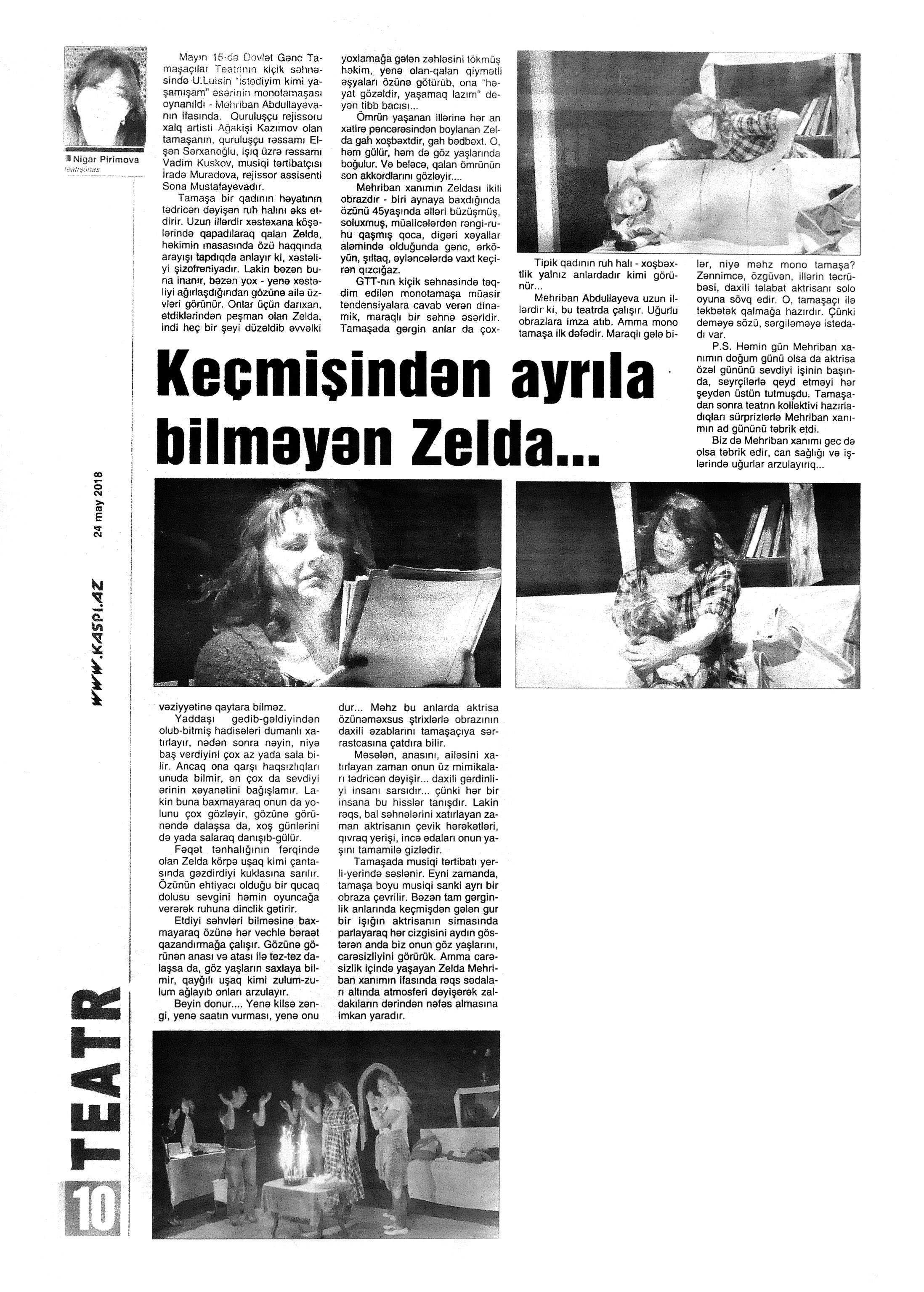 Azərbaycan Dövlət Gənc Tamaşaçılar Teatrı 843. Gənc Tamaşaçılar Teatrına Hindistandan diplom gəlib //Mədəniyyət.- 2018.- 2 may.- S.6. 844. Lütfi Zadənin xatirəsinə həsr edilən tamaşanın premyerası olub: [Cənnət Səlimovanın hazırladığı “Dəlixanada qətl” tamaşasının nümayişi haqqında] //Mədəniyyət.- 2018.- 30 may.- S.5. 845. Müşfiq, Ş. Kontrabasın “ayaqları altından” ucalmaq...: [teatrda İrina Perlovanın hazırladığı eyniadlı tamaşa haqqında] //525-ci qəzet.- 2018.- 12 may.- S.17. 846. Pirimova, N. Keçmişindən ayrıla bilməyən Zelda...: [Ağakişi Kazımovun hazırladığı “İstədiyim kimi yaşayıram” tamaşası haqqında] //Kaspi.- 2018.- 24 may.- S.10. 847. Şərifova, G. Güşvər Şərifova: Yaxşı nə vardısa orda qaldı: [aktrisa ilə müsahibə] /müsahibəni apardı Nigar Pirimova //Kaspi.- 2018.- 31 may.- S.12. 848. “Tanış olun, dostum Bəkkar” Nağıl-tamaşa uşaqların ifasında: [Gənc Tamaşaçılar Teatrında F.Köçərli adına Respublika Uşaq Kitabxanasının və 3 saylı Uşaq-Gənclər İnkişaf Mərkəzinin birgə hazırladıqları eyniadlı tamaşanın təqdimtı haqqında] //Mədəniyyət.-2018.- 16 may.- S.9. 849. Teatrın əməkdaşları mükafatlandırılıb: [teatrın bir qrup əməkdaşının Dövlət Sərhəd Xidmətinin rəhbərliyi tərəfindən mükafatlandırılması haqqında] //Mədəniyyət.-2018.- 23 may.- S.6.