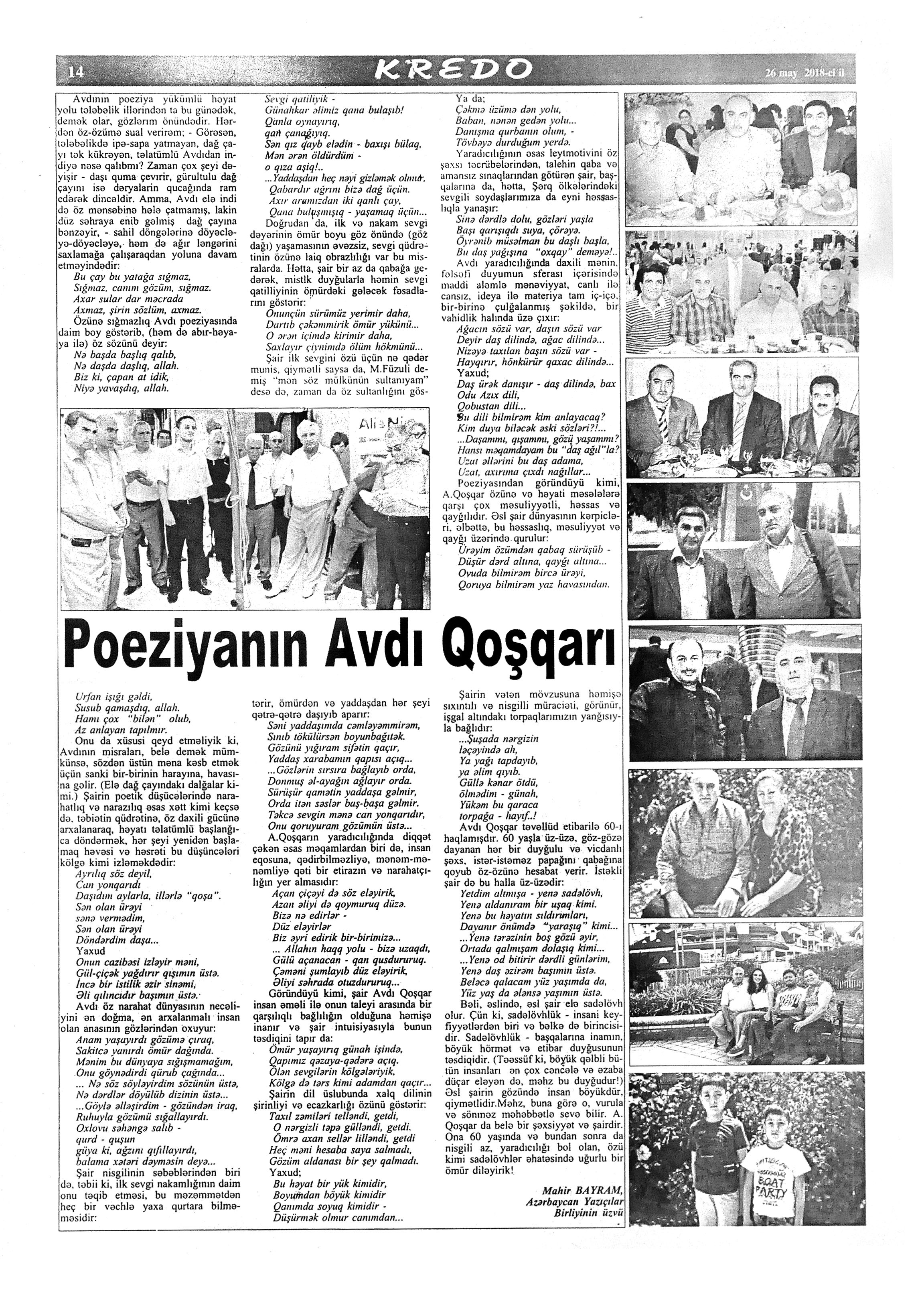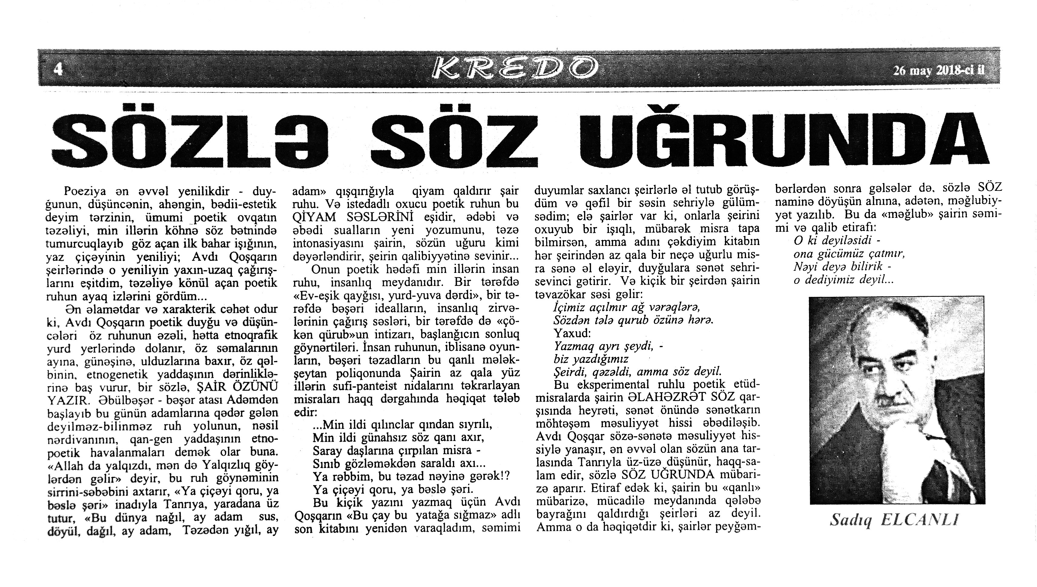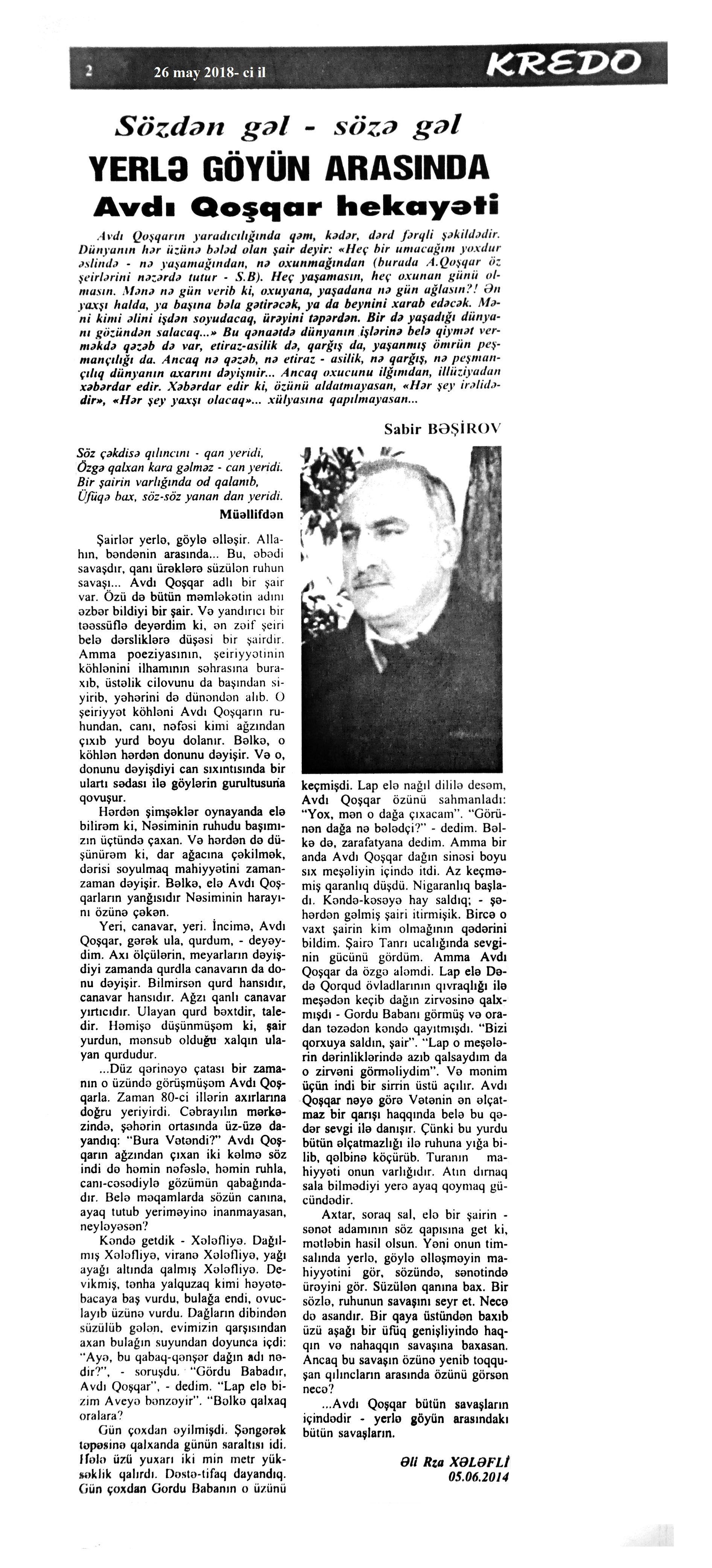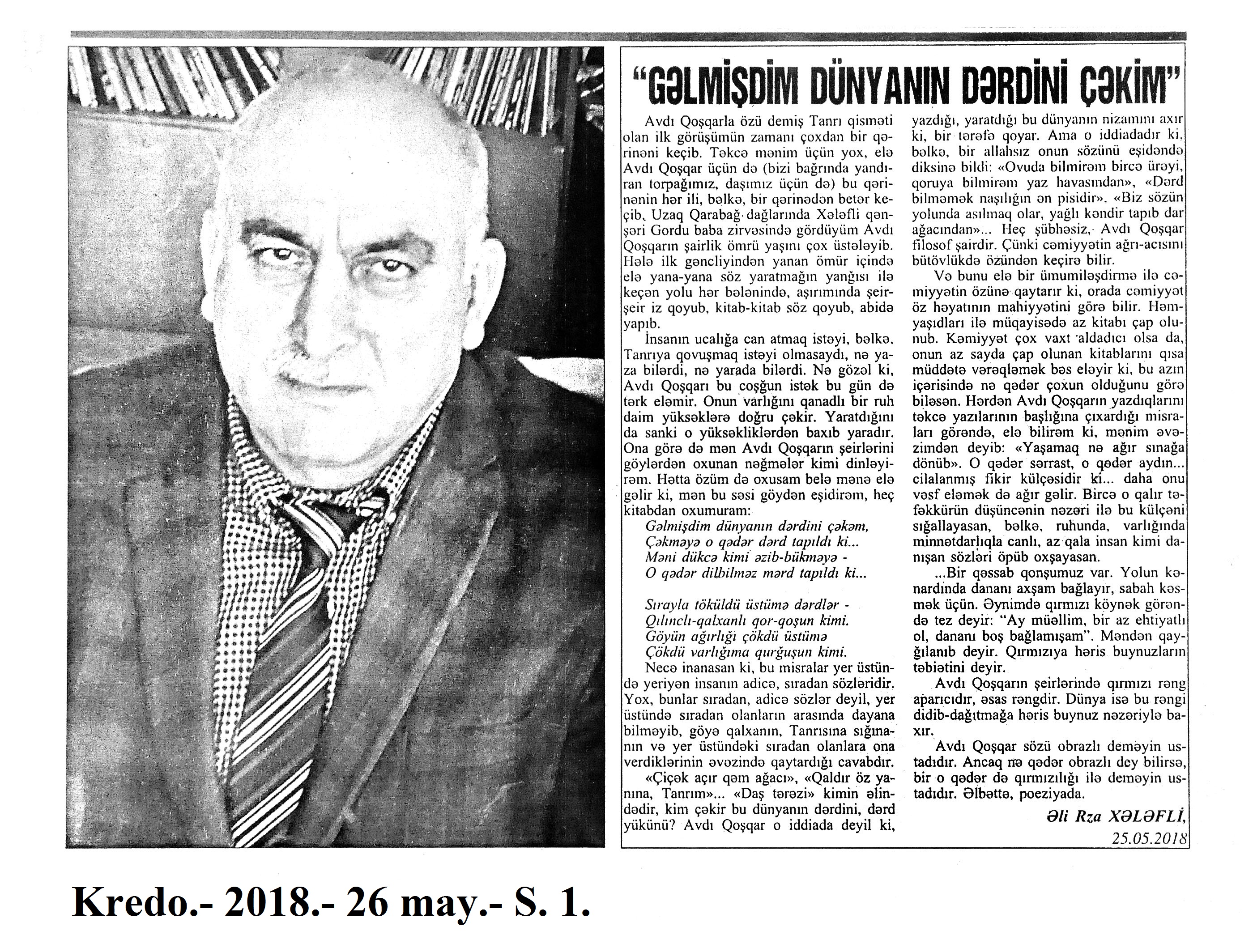 Avdı Qoşqar – 60 1255. Albalıyev, Ş. Duyğuların təbiiliyi: Avdı Qoşqar – 60: [şairin “Bu çay bu yatağa sığmaz” adlı şeirlər kitabı haqqında] //Kredo.- 2018.- 26 may.- S.15. 1256. Allahmanlı, M. Bədii düşüncə və onun fəlsəfi məzmunu: (Avdı Qoşqarın yaradıcılığı əsasında) //Kredo.- 2018.- 26 may.- S.3;7. 1257. Avdı Qoşqar – 60: [tanınmış şairin yubileyi münasibətilə AYB-nin təbriki] //Ədəbiyyat qəzeti.- 2018.- 26 may.- S.32. 1258. Bayram, M. Poeziyanın Avdı Qoşqarı //Kredo.- 2018.- 26 may.- S.14. 1259. Cəfərov, N. “Yatağına sığmayan çay”ın poeziyası: [şairin yaradıcılığı haqqında] //Kredo.- 2018.- 26 may.- S.6-7. 1260. Elcanlı, S. Sözlə söz uğrunda: [şairin yubileyi münasibətilə] //Kredo.- 2018.- 26 may.- S.4. 1261. Ələkbərli, M. Ən böyük istedad ad qorumaqdı: Avdı Qoşqar – 60: [şairin yaradıcılığı haqqında] //Kredo.- 2018.- 26 may.- S.15. 1262. Xələfli, Ə. R. Avdı Qoşqar – 60: İnsanın dəyəri dediyi sözdü: Gəlmişdim dünyanın dərdini çəkim //Kredo.- 2018.- 26 may.- S.1. 1263. Xələfli, Ə. R. Yerlə göyün arasında: Avdı Qoşqar hekayəti: Sözdən gəl - sözə gəl //Kredo.- 2018.- 26 may.- S.2. 1264. Kamal, R. Avdı Qoşqar: Ömür və söz sınağında //Kredo.- 2018.- 26 may.- S.4. 1265. Qaraxanoğlu, M. Abzasların zamanı...: Avdı Qoşqarın 60 yaşına //Ədəbiyyat qəzeti.- 2018.- 19 may.- S.29. 1266. Qaraxanoğlu, M. Abzasların zamanı...: [şair haqqında] //Kredo.- 2018.- 26 may.- S.11. 1267. Qoşqar, A. Bu, bizik; Anamın ölmünə: [şeirlər] //Kredo.- 2018.- 26 may.- S.5. 1268. Qoşqar, A. Nə dünya bəyazdı – göründüyü tək, nə göylər çıilçıraq – ulduz yığını: Bir sevda ağlayar...; Bir az...; Ana, gözümün qarası və s.: [şeirlər] //Kredo.- 2018.- 26 may.- S.8-9. 1269. Qoşqar, A. Sözümüzün Avdı Qoşqarı, yaxud cəzanı Tanrıdan istəmək həqiqəti: [şairlə müsahibə] /müsahibəni apardı Əli Rza Xələfli //Kredo.- 2018.- 26 may.- S.10;16. 1270. Qoşqar, A. “Yaddaşdan heç nəyi gizləmək olmur”: İki göz gərəkdi...; Tanrı, nə cəzam var...; Bir anlayan tapılmır... və s.: [şeirlər] //Kredo.- 2018.- 26 may.- S.12. 1271. Yusifli, V. “Gəlmişdim dünyanın dərdini çəkim”: (Avdı Qoşqarın şeirləri haqqında) //Kredo.- 2018.- 26 may.- S.5.