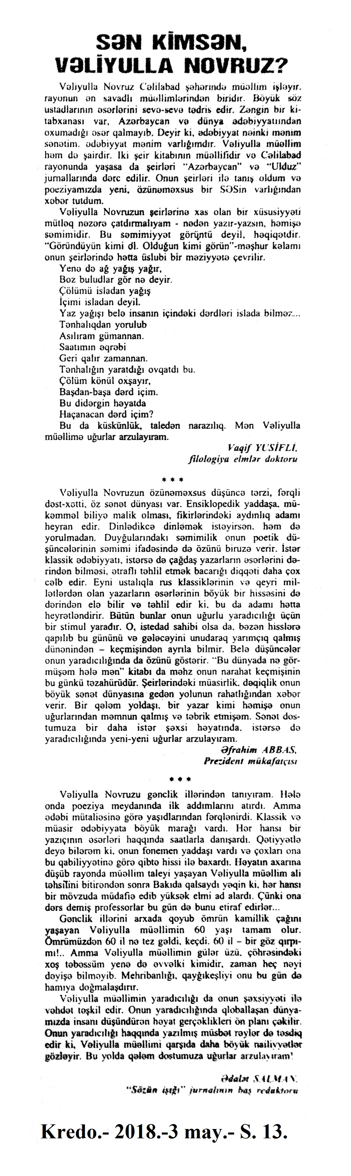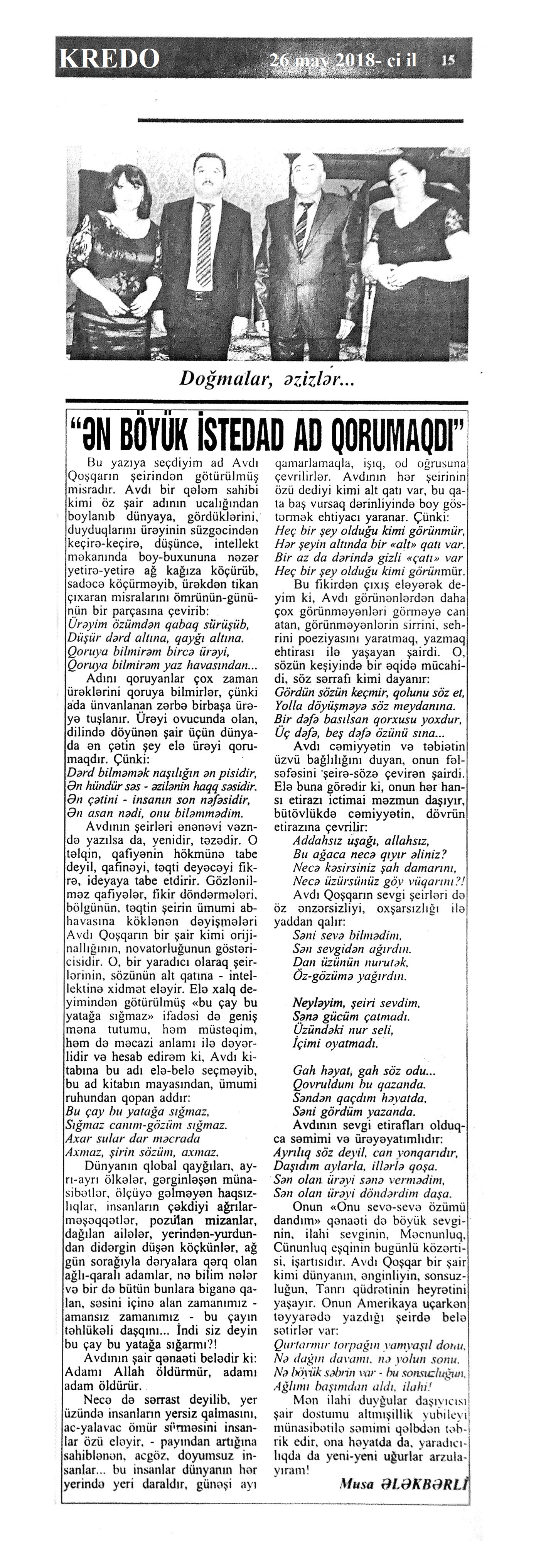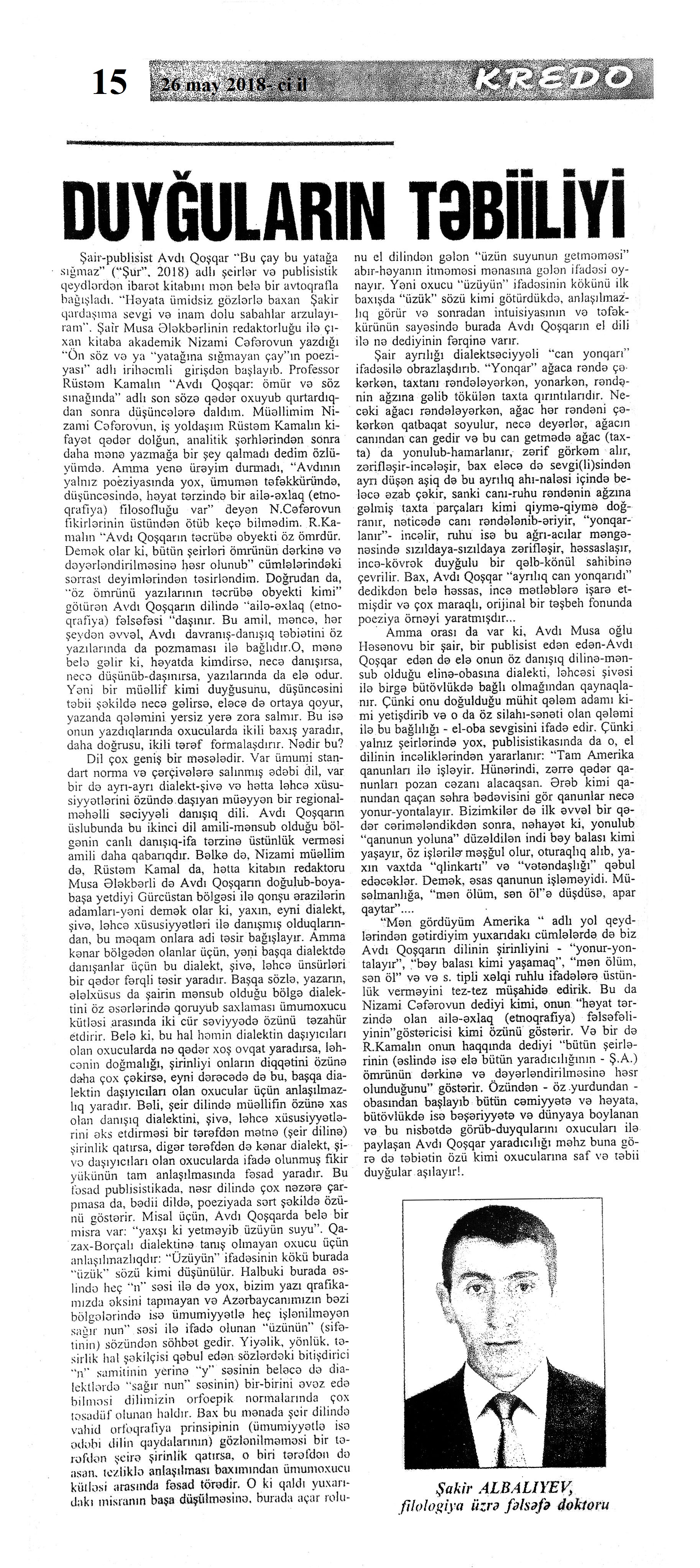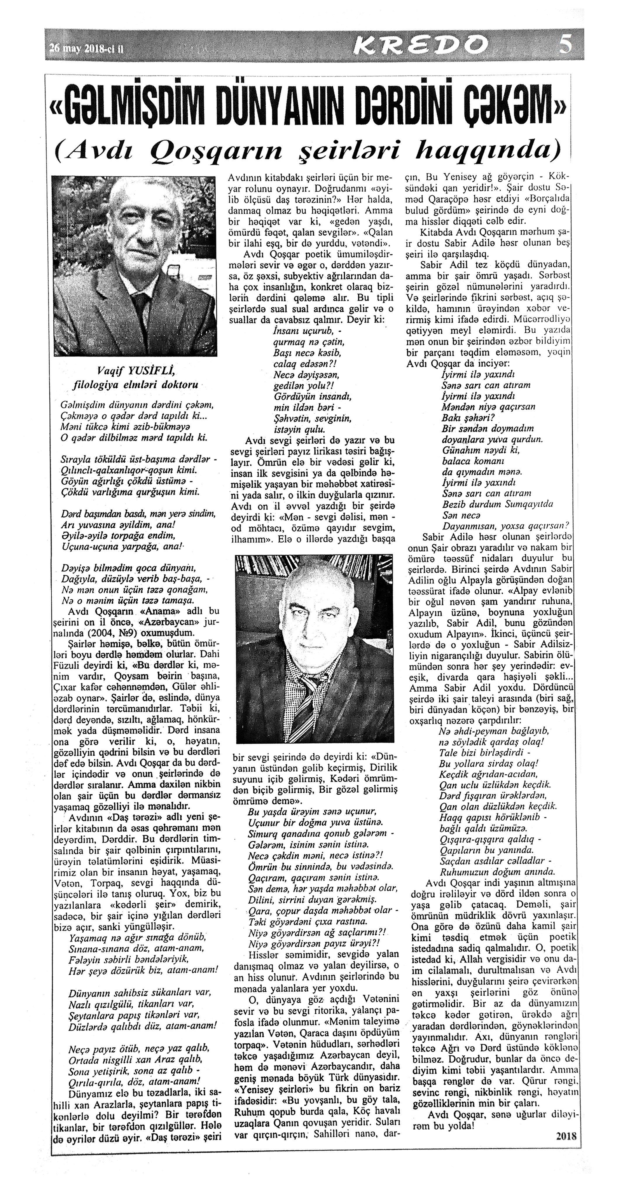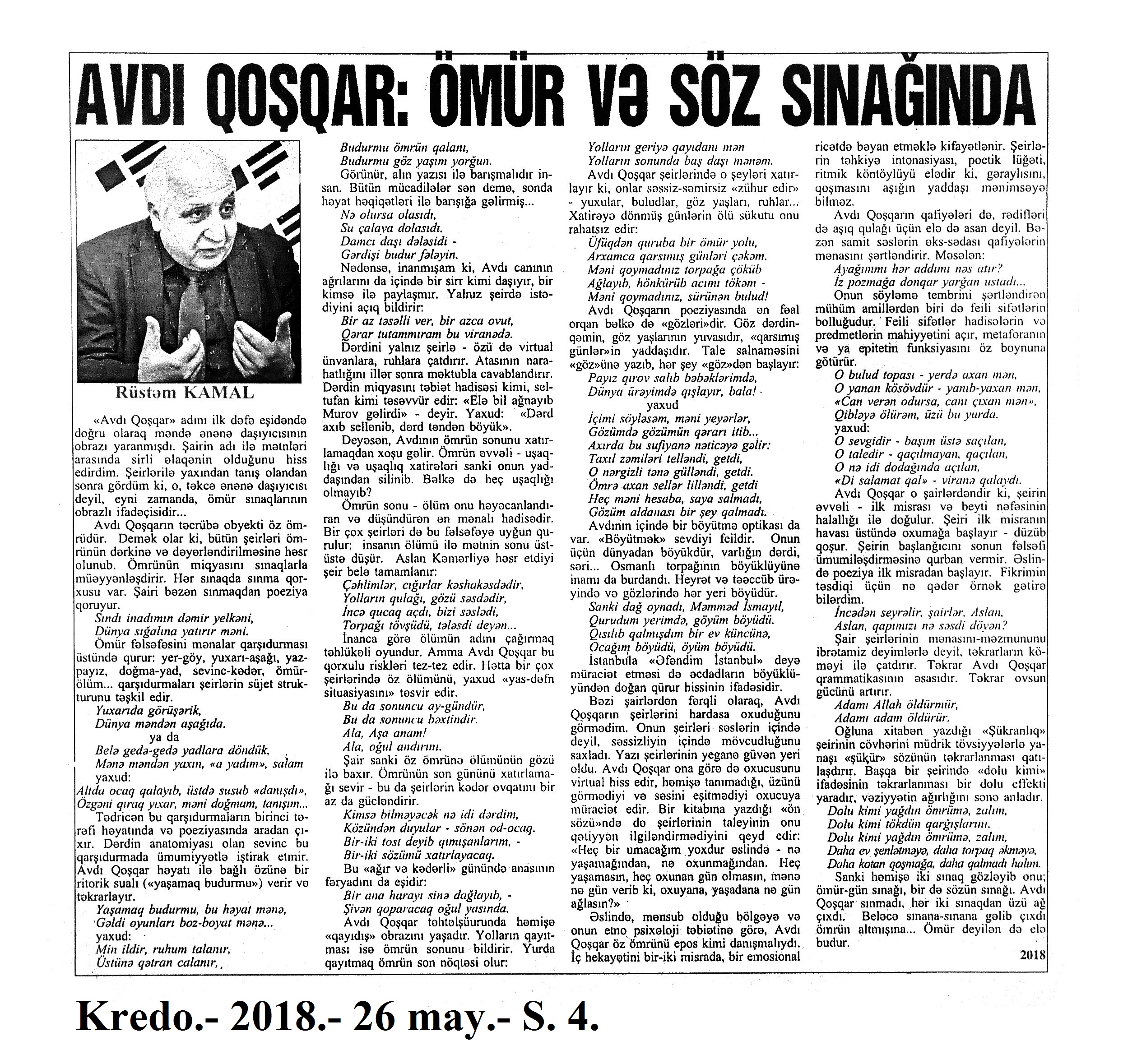 Avdı Qoşqar – 60 1255. Albalıyev, Ş. Duyğuların təbiiliyi: Avdı Qoşqar – 60: [şairin “Bu çay bu yatağa sığmaz” adlı şeirlər kitabı haqqında] //Kredo.- 2018.- 26 may.- S.15. 1256. Allahmanlı, M. Bədii düşüncə və onun fəlsəfi məzmunu: (Avdı Qoşqarın yaradıcılığı əsasında) //Kredo.- 2018.- 26 may.- S.3;7. 1257. Avdı Qoşqar – 60: [tanınmış şairin yubileyi münasibətilə AYB-nin təbriki] //Ədəbiyyat qəzeti.- 2018.- 26 may.- S.32. 1258. Bayram, M. Poeziyanın Avdı Qoşqarı //Kredo.- 2018.- 26 may.- S.14. 1259. Cəfərov, N. “Yatağına sığmayan çay”ın poeziyası: [şairin yaradıcılığı haqqında] //Kredo.- 2018.- 26 may.- S.6-7. 1260. Elcanlı, S. Sözlə söz uğrunda: [şairin yubileyi münasibətilə] //Kredo.- 2018.- 26 may.- S.4. 1261. Ələkbərli, M. Ən böyük istedad ad qorumaqdı: Avdı Qoşqar – 60: [şairin yaradıcılığı haqqında] //Kredo.- 2018.- 26 may.- S.15. 1262. Xələfli, Ə. R. Avdı Qoşqar – 60: İnsanın dəyəri dediyi sözdü: Gəlmişdim dünyanın dərdini çəkim //Kredo.- 2018.- 26 may.- S.1. 1263. Xələfli, Ə. R. Yerlə göyün arasında: Avdı Qoşqar hekayəti: Sözdən gəl - sözə gəl //Kredo.- 2018.- 26 may.- S.2. 1264. Kamal, R. Avdı Qoşqar: Ömür və söz sınağında //Kredo.- 2018.- 26 may.- S.4. 1265. Qaraxanoğlu, M. Abzasların zamanı...: Avdı Qoşqarın 60 yaşına //Ədəbiyyat qəzeti.- 2018.- 19 may.- S.29. 1266. Qaraxanoğlu, M. Abzasların zamanı...: [şair haqqında] //Kredo.- 2018.- 26 may.- S.11. 1267. Qoşqar, A. Bu, bizik; Anamın ölmünə: [şeirlər] //Kredo.- 2018.- 26 may.- S.5. 1268. Qoşqar, A. Nə dünya bəyazdı – göründüyü tək, nə göylər çıilçıraq – ulduz yığını: Bir sevda ağlayar...; Bir az...; Ana, gözümün qarası və s.: [şeirlər] //Kredo.- 2018.- 26 may.- S.8-9. 1269. Qoşqar, A. Sözümüzün Avdı Qoşqarı, yaxud cəzanı Tanrıdan istəmək həqiqəti: [şairlə müsahibə] /müsahibəni apardı Əli Rza Xələfli //Kredo.- 2018.- 26 may.- S.10;16. 1270. Qoşqar, A. “Yaddaşdan heç nəyi gizləmək olmur”: İki göz gərəkdi...; Tanrı, nə cəzam var...; Bir anlayan tapılmır... və s.: [şeirlər] //Kredo.- 2018.- 26 may.- S.12. 1271. Yusifli, V. “Gəlmişdim dünyanın dərdini çəkim”: (Avdı Qoşqarın şeirləri haqqında) //Kredo.- 2018.- 26 may.- S.5.