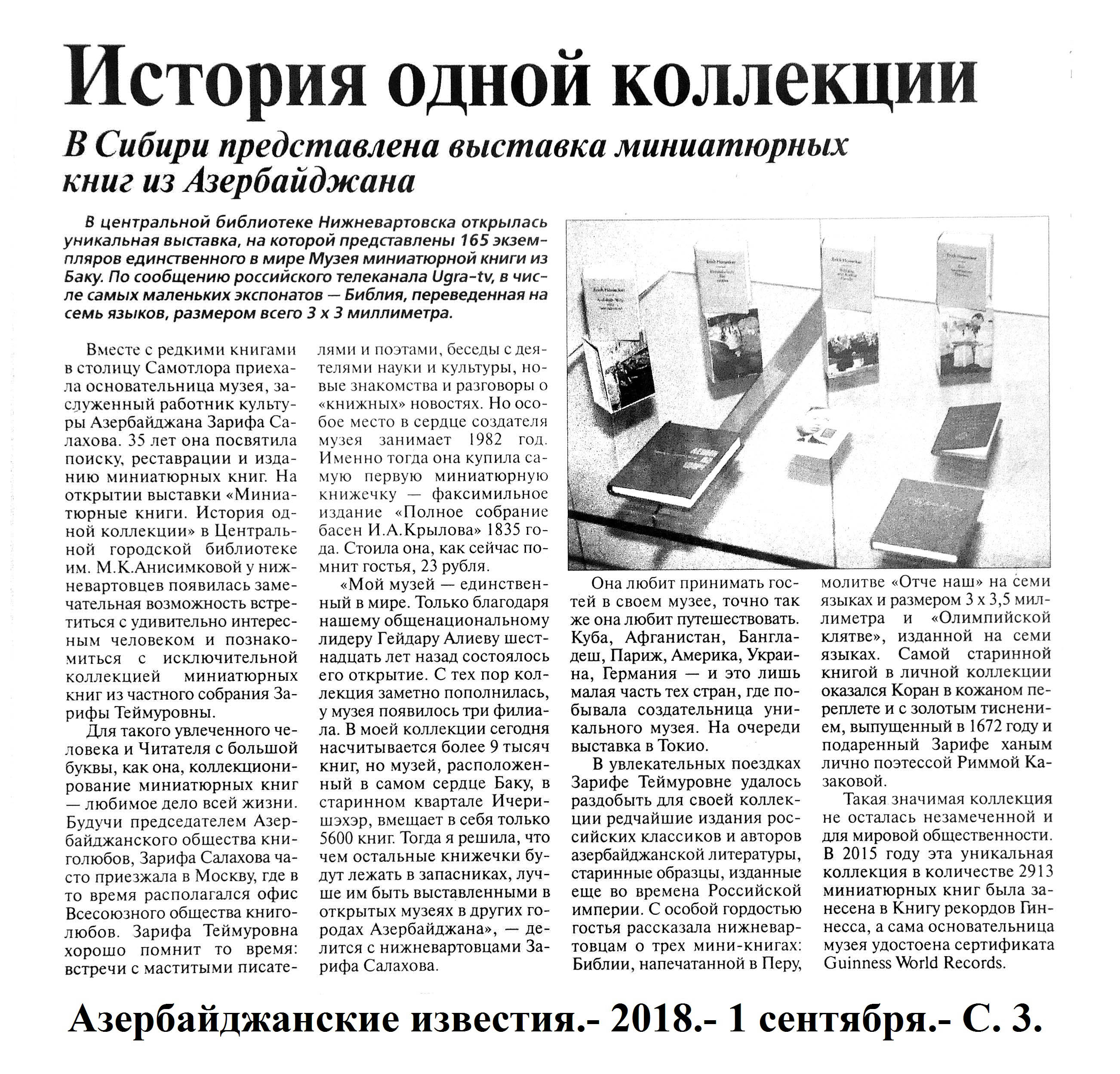 МУЗЕЙНОЕ ДЕЛО 1083. В Шеки открылся Дом-музей Бахтияра Вахабзаде //Ежедневные новости.- 2018.-7 сентября.- С.10. 1084. История одной коллекции: В Сибири представлена выставка миниатюрных книг из Азербайджана: [экспонаты Музея Миниатюрной Книги] //Азербайджанские известия.- 2018.-1 сентября.- С.3. 1085. Кязимова, С. Поэт свободы: В Шеки открылся Дом-музей Бахтияра Вагабзаде //Азербайджанские известия.- 2018.- 4 сентября.- С.4. 1086. Меликова, Ш. Ренессанс ремесел: Размах развития народных промыслов в Узбекистане впечатляет: [беседа с директором Музея Ковра Ш.Меликовой] /провела Н.Баннаева //Каспiй.- 2018.-8 сентября.- С.12. 1087. Президент Ильхам Алиев принял участие в открытии Музея Флага в Билясуваре //Бакинский рабочий.- 2018.- 19 сентября.- С.7.