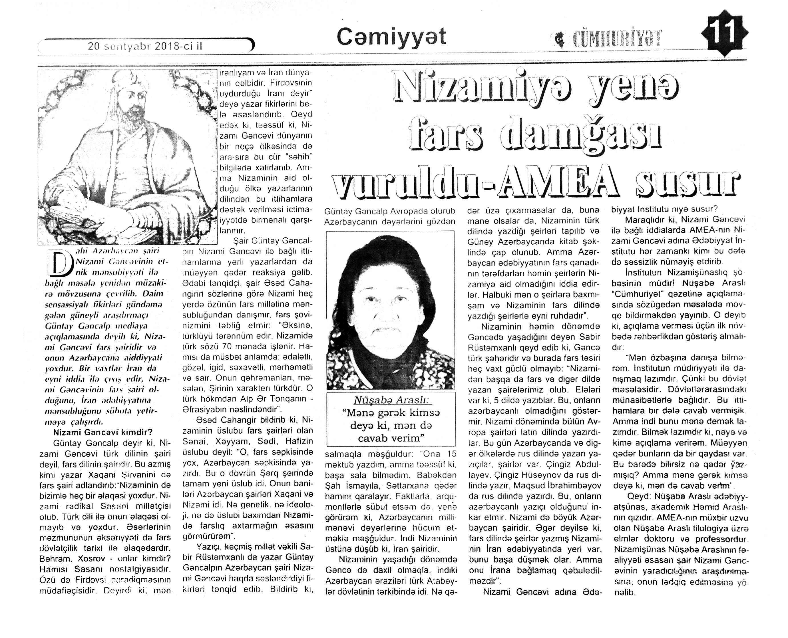 Azərbaycan qəzeti – 100 40. Cavadov, S. Ad günün mübarək //Azərbaycan.-2018.- 15 sentyabr.- S.16. 41. Həbibbəyli, İ. Müstəqil Azərbaycanın güzgüsü “AZƏRBAYCAN”: Milli dövlətçilik və azərbaycançılıq tribunası: ["Azərbaycan” qəzetinin 100 illiyi münasibətilə] //Azərbaycan.- 2018.- 14 sentyabr.- S.1;4. 42. Hüseynov, F. Mədəniyyət naziri “Azərbaycan” qəzetinin kollektivini yubiley münasibətilə təbrik etdi: [Əbülfəs Qarayev qəzetin 100 illiyi münasibətilə redaksiyada olmuşdur] //Mədəniyyət.- 2018.- 14 sentyabr.- S.5. 43. Mirələmov, H. Hamımızın qəzeti: [“Azərbaycan” qəzetinin 100 illik yubileyi münasibətilə] //Azərbaycan.- 2018.- 12 sentyabr.- S.1;3. 44. Nərimanoğlu, M. Əbülfəs Qarayev: “Azərbaycan” qəzetinin tarixi mədəniyyət və mətbuat tariximizin parlaq səhifəsidir: Mədəniyyət naziri “Azərbaycan” qəzeti redaksiyasının qonağı oldu: [qəzetin 100 illiyi münasibətilə] //Azərbaycan.- 2018.- 14 sentyabr.- S.6. 45. Zifəroğlu, V. Söz və mətbuat azadlığının salnaməçisi: [“Azərbaycan” qəzetinin 100 illiyi münasibətilə//Azərbaycan.- 2018.- 12 sentyabr.- S.6.