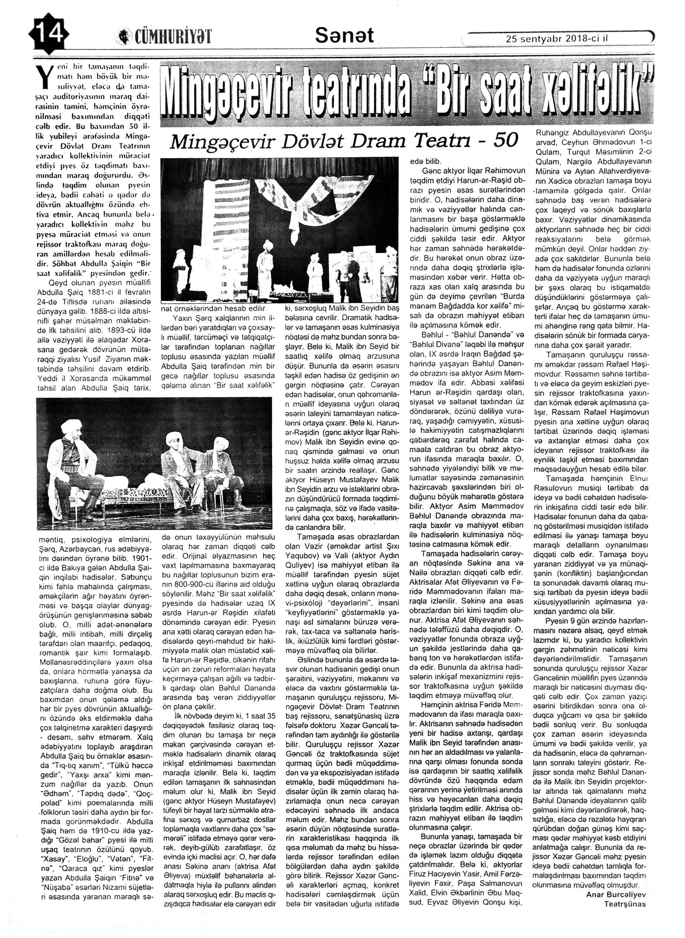Akademik Milli Dram Teatrı 546. Abbaslı, T. Dastan İnsan…: Şəxsiyyəti yaradıcılığından, yaradıcılığı şəxsiyyətindən maraqlı Hadisə – Adam – Adil İsgəndərov: [Xalq artisti haqqında] //Mədəniyyət.-2018.- 19 sentyabr.- S.12. 547. “Bir, iki – bizimki!” yenə səhnədədir: [Əlif Cahangirlinin hazırladığı eyniadlı tamaşanın premyerası haqqında] //Mədəniyyət.- 2018.- 28 sentyabr.- S.4. 548. Ələsgərli, Ç. Milli Dram Teatrı: repertuar haqqında düşüncələr //525-ci qəzet. - 2018.- 18 sentyabr.- S.7. 549. Əzimov, R. “Bir də onda ayıldıq ki, arzusunda olduğumuz rolları oynamaq üçün vaxt çoxdan keçib”: [Xalq artisti Rafiq Əzimovun müsahibəsi] /müsahibəni apardı Xəyalə //Üç nöqtə.- 2018.- 15 sentyabr.- S.12. 550. Gülcahan. Dərbənddə “Gəlinlərin qiyamı” baş tutub: [Dram Teatrında Sərvər Əliyevin hazırladığı eyniadlı tamaşanın nümayişi haqqında] //Mədəniyyət.-2018.- 21 sentyabr.- S.9. 551. Məlik, R. Yaşımın üstünə yaş gəlir, amma qocalmıram: [Xalq artisti Ramiz Məliklə müsahibə] /müsahibəni apardı Cavid Zeynallı //Kaspi. - 2018.- 15-17 sentyabr.- S.10. 552. Milli Dram Teatrı yeni mövsümü “Qarabağnamə” tamaşası ilə açıb: [Xalq artisti Mərahim Fərzəlibəyovun quruluşunda] //Mədəniyyət.-2018.- 19 sentyabr.- S.11. 553. Milli Dram Teatrında “Sinif yoldaşları”nın premyerası: Sakit... Məşq gedir!: [Azərpaşa Nemətovun hazırladığı eyniadlı tamaşanın nümayişi haqqında] //Mədəniyyət.-2018.- 26 sentyabr.- S.7. 554. Mirməmməd, G. Kaş bu gediş belə olmayaydı...: Getdi. Gec-tez, hamımızın gedəcəyi yerə əbədi köçdü. Amma... Amma gərək bu gediş belə olmayaydı...: [Xalq artisti, mərhum Zərnigar Ağakişiyeva haqqında] //Üç nöqtə.- 2018.- 13 sentyabr.- S.12. 555. Ölkəmiz Qazaxıstanda beynəlxalq teatr festivalında təmsil olunub: [Akademik Milli Dram Teatrının Aktau şəhərində keçirilən Xəzəryanı Ölkələrin II Beynəlxalq Teatr Festivalında təmsil olunması haqqında] //Mədəniyyət.-2018.- 19 sentyabr.- S.11. 556. Rəhimli, Ş. İlham Azərbaycan ədəbiyyatının gözəl təbliğatçısı olub: Nurəddin Mehdixanlı: Ən böyük arzusu övladının toyunu görmək idi. Amma nakam getdi: [Xalq artisti sənət yoldaşı İlham Əsgərov haqqında] //Azad Azərbaycan.- 2018.- 7 sentyabr.- S.7. 557. Rüstəmov, R. Mehdi Məmmədova bəyəndiyi tələbənin başqası yox, mən olduğumu heç vaxt deyə bilmədim...: [aktyor Rüstəm Rüstəmovla söhbət] /söhbətləşdi Samirə Əşrəf //Ədəbiyyat qəzeti.- 2018.- 29 sentyabr.- S.22-23.