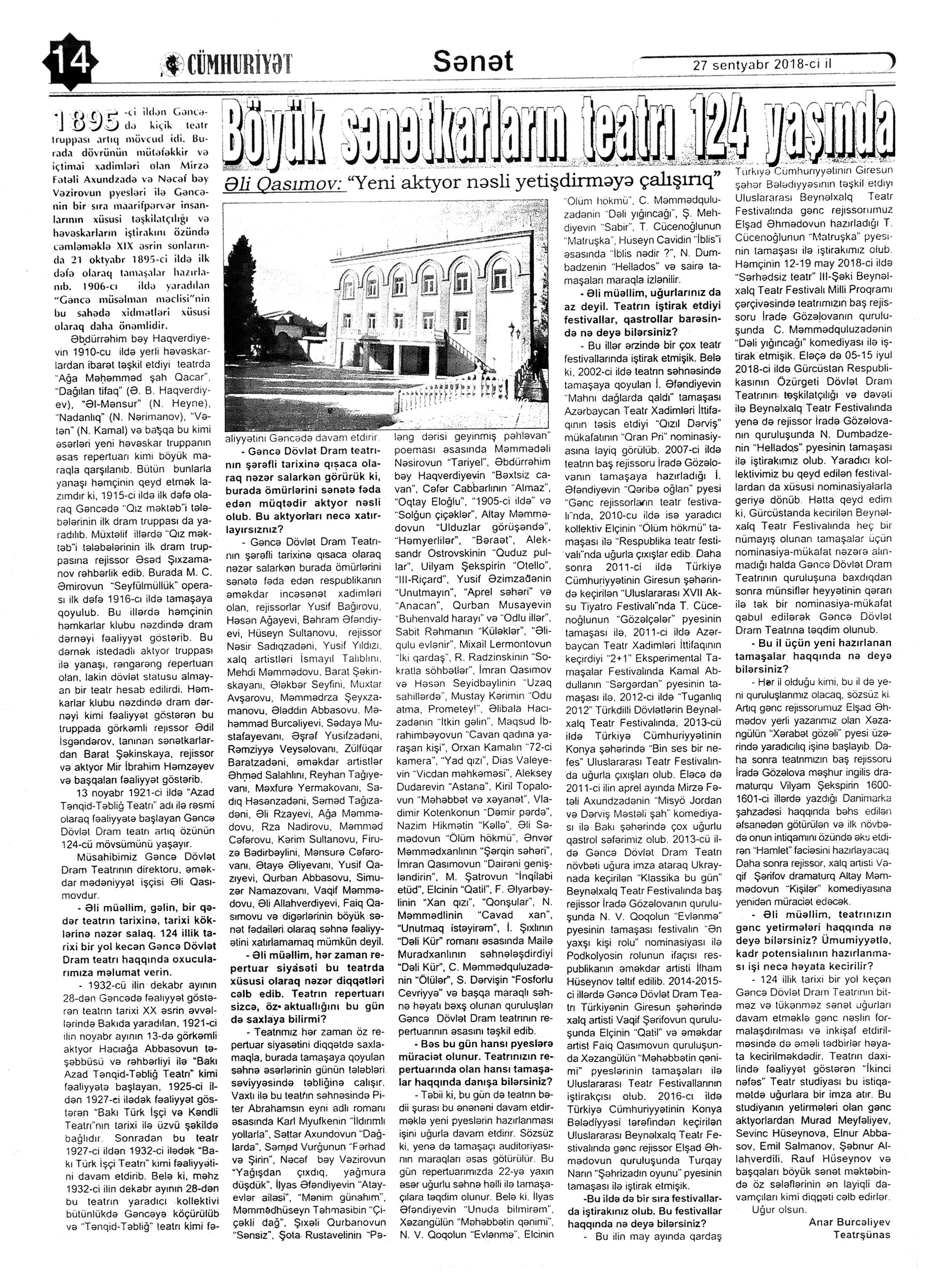 İntiqam Qasımzadə – 75 967. Əmirli, Ə. Baş redaktor: [“Azərbaycan” jurnalının baş redaktorunun yubileyi münasibətilə] //525-ci qəzet.- 2018.- 1 sentyabr.- S.19. 968. Yusifli, V. 75 ilin İntiqam Qasımzadəsi...: [tənqidçi haqqında] //Ədalət.- 2018.- 8 sentyabr.- S.15. 969. Yusifli, V. Bu, İntiqam Qasımzadədir... //Ədəbiyyat qəzeti.- 2018.- 1 sentyabr.- S.14-15. Azər Turan –55 970. Azər Turan: Əli bəy Hüseynzadəni daha konseptual araşdırmaq, öyrənmək və tədris etmək milli vicdan məsələsidir: Müsahibimiz Əli bəy Hüseynzadənin tədqiqatçısı, filologiya üzrə fəlsəfə doktoru, “Ədəbiyyat qəzeti”nin baş redaktoru Azər Turandır /müsahibəni apardı Gündüz Nəsibov //Türküstan.- 2018.- 4-10 sentyabr.- S.5. 971. Eyvazlı, G. Estetik mühit yaradan: [müəllifin Azər Turanın ad günü münasibəti ilə yazdığı eyniadlı məqaləsi haqqında] //Kaspi. - 2018.- 15-17 sentyabr.- S.18. 972. Əliyeva, A. Hüseyn Cavid carçısı – Qəlbi Turan olan Azər Turan //Türküstan.-2018.- 18-24 sentyabr.- S.10. 973. Hüseynoğlu, S. Qəlbimlə öpürəm uğurlarını: Azər Turanın 55 yaşına / //Kaspi.- 2018.- 15-17 sentyabr.- S.18. 974. Turan, A. Baş redaktordan: [müəllifin ad günü münasibətilə yazılan təbriklərə münasibəti] //Ədəbiyyat qəzeti.-2018.- 22 sentyabr.- S.7. 975. Turan, A. “Eşqi həmişələr gəlir yanıma...”: 23 avqust 2018. Bakı, Yasamal. Nizaməddin Şəmsizadənin evində düşüncələr: [Nizaməddin Şəmsizadə barədə düşüncələr] //Ədəbiyyat qəzeti.- 2018.- 1 sentyabr.- S.5. 976. Turan, A. “Eşqi həmişələr gəlir yanıma...”: 25 avqust. İsmayıllı, Buynuz kəndi. Musa Yaqubun evində: [şair Musa Yaqubun yaradıcılığı haqqında] //Ədəbiyyat qəzeti.- 2018.- 1 sentyabr.- S.5. 977. Turan, A. Ədəbiyyata həm də torpağı vətən qılmaq sənəti kimi baxıram: yubileyini qeyd edən “Ədəbiyyat qəzeti”nin baş redaktoru ilə müsahibə] /müsahibəni apardı Fərid Hüseyn //Kaspi.- 2018.- 15-17 sentyabr.- S.12-13. 978. Yusifli, V. Türk düşüncəsinin irfan çobanı: [tədqiqatçı, publisist, sənətşünas, naşir “Ədəbiyyat qəzeti”nin baş redaktorunun yubileyi münasibətilə] //Ədalət.- 2018.- 15 sentyabr.- S.9;15.