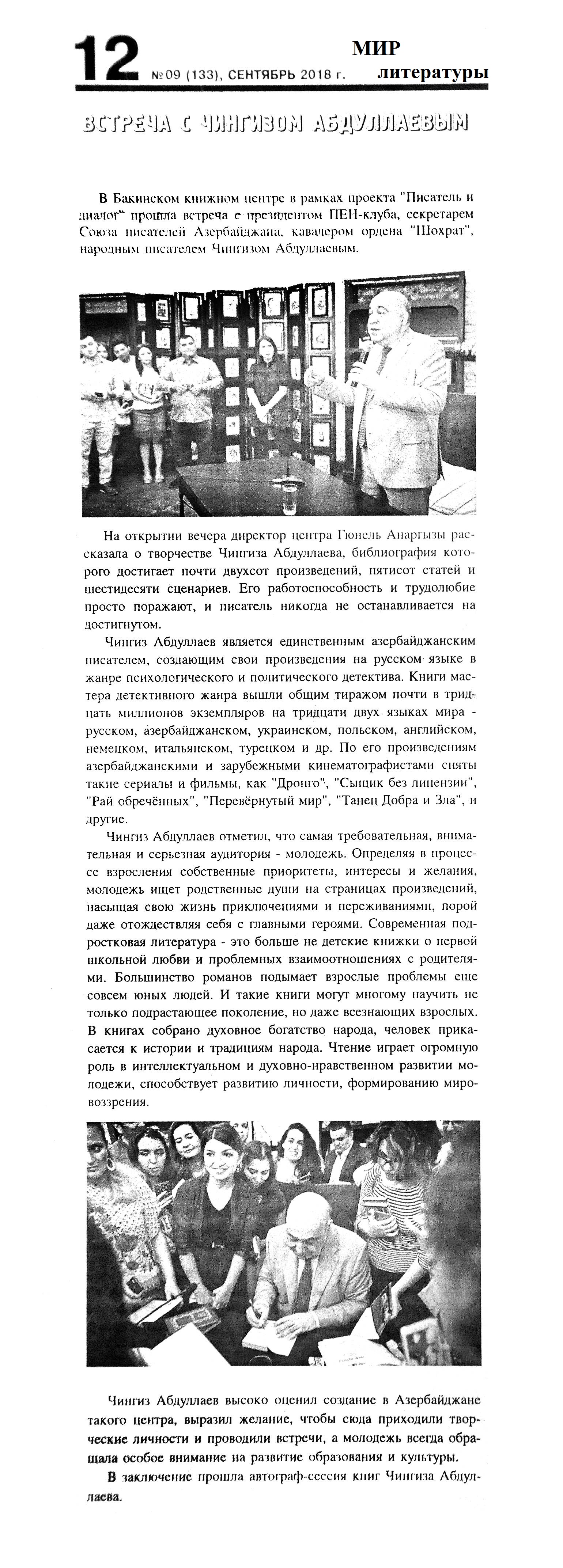 ЛИТЕРАТУРОВЕДЕНИЕ И ЛИТЕРАТУРНАЯ КРИТИКА 1168. Большой успех пьесы народного писателя Эльчина в Лондоне: [«Обитатели ада» в Театре Union] //Бакинский рабочий.- 2018.-12 сентября.- С.4. 1169. В Союзе писателей состоялась презентация электронной книги İlmə əyləncəli əlifba: [автор - С.Аманова] //Бакинский рабочий.- 2018.-14 сентября.- С.6. 1170. В Турции изданы избранные рассказы Джафара Джаббарлы: [перевод - Ю. Шена] //Ежедневные новости.- 2018.-17 сентября.- С.10. 1171. Встреча с Чингизом Абдуллаевым: [в Бакинском книжном центре] //Мир литературы.- 2018.- №09(133) сентябрь.- С. 12. 1172. Касумова, Т. Зло приходит в полночь: Лондонский театр Union поставил мюзикл по пьесе Эльчина «Обитатели ада» //Азербайджанские известия.- 2018.-15 сентября.- С.3. 1173. Кулиева, М. Благодарю тебя - я жил!: [о поэзии Сиявуша Мамедзаде] //Мир литературы.- 2018.- №09(133) сентябрь.- С. 6-7. 1174. Кулиева, М. Подлинные наследники классической литературы: [о жизни и творчестве М.Физули] //Мир литературы.- 2018.- №09(133) сентябрь.- С.4-6. 1175. Нури, И. Портрет моей души: Ирада Нури: Я занимаюсь любимым делом, которое к тому же приносит доход /беседу с писательницей провела М.Мурсалова //Каспiй.- 2018.-29 сентября.- С.16-17.