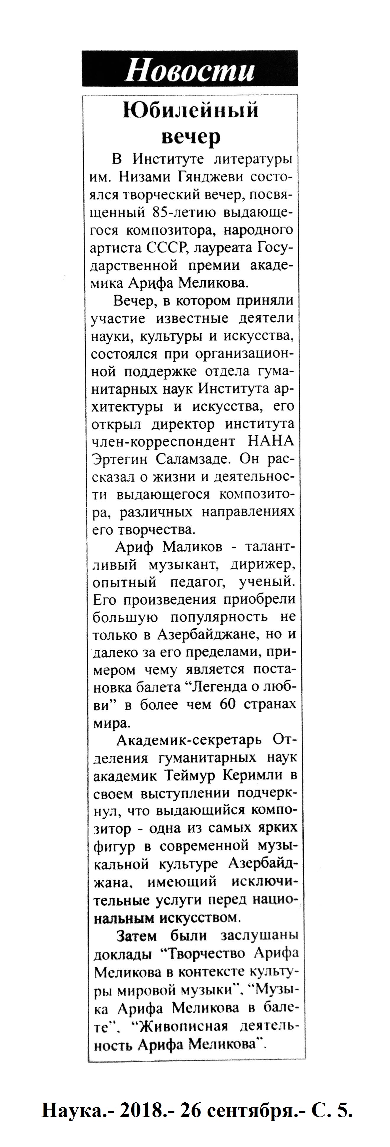 Ариф Меликов – 85 1124. Алиев, И. Народному артисту Арифу Меликову: [поздравление президента] //Бакинский рабочий.- 2018.-14 сентября.- С.3. 1125. Мурадова, К. «Я сын своего народа»: Гражданская позиция, проявляемая Арифом Меликовым всегда и во всем, проистекает из осознания им своего главного долга в жизни //Азербайджанские известия.- 2018.-15 сентября.- С.3. 1126. Юбилейный вечер: [в Институте Литературы] //Наука.- 2018.-26 сентября.- С.5.