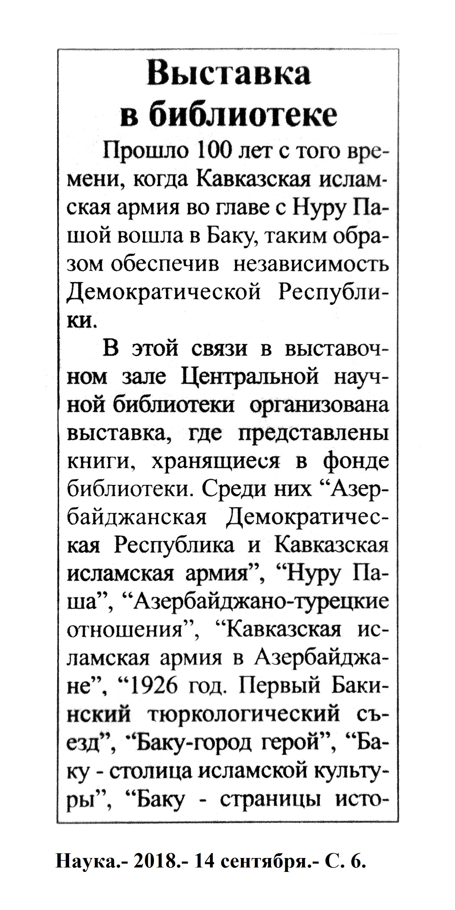 Нахчыван – столица исламской и европейской культур 1029. Алиева, Г. Место, где живет исламская культура: Такое право Нахчывану дает богатое историческое наследие региона //Каспiй.- 2018.- 11 сентября.- С.11. 1030. В Нахчыване состоялось открытие «Европейского городка» //Бакинский рабочий.- 2018.- 25 сентября.- С.5. 1031. Гасанова, С. Столица исламской культуры: [конференция] //Азербайджанские известия.- 2018.- 11 сентября.- С.1. 1032. Кестутис Янкаускас: «Существуют широкие возможности для увеличения числа туристов, приезжающих в Азербайджан, в том числе Нахчыван» //Бакинский рабочий.- 2018.- 26 сентября.- С.11. Год АДР – 100 1033. Алиев, И. В Mилли Меджлисе состоялось торжественное заседание, посвященное 100-летию азербайджанского парламента: Президент Ильхам Алиев принял участие в заседании //Бакинский рабочий.- 2018.- 22 сентября.- С.1-3. 1034. Алиев, И. Прошел парад, посвященный 100-летию освобождения города Баку: В параде приняли участие Президент Ильхам Алиев и Президент Реджеп Тайип Эрдоган //Бакинский рабочий.- 2018.- 18 сентября.- С.3-5. 1035. Алиева, М. В Риме состоялась конференция, посвященная 100-летию Азербайджанской Демократической Республики и отношениям стратегического партнерства между Азербайджаном и Италией //Бакинский рабочий.- 2018.- 26 сентября.- С.4-5. 1036. В Ватикане торжественно отмечен 100-летний юбилей Азербайджанской Демократической Республики //Бакинский рабочий.- 2018.- 28 сентября.- С.7. 1037. В парке Центра Гейдара Алиева состоится концерт, посвященный 100-летию освобождения Баку //Бакинский рабочий.- 2018.- 15 сентября.- С.6. 1038. В рамках проекта «Серия юбилеев» подготовлены слайды «Выдающиеся государственные, политические и общественные деятели АДР» //Бакинский рабочий.- 2018.- 29 сентября.- С.6. 1039. В Риме устроен официальный прием по случаю 100-летнего юбилея Азербайджанской Демократической Республики //Бакинский рабочий.- 2018.- 26 сентября.- С. 5-6. 1040. Встреча с председателем Сената Италии: [визит первого вице-президента АР М. Алиевой] //Бакинский рабочий.- 2018.- 26 сентября.- С.4. 1041. Выставка в библиотеке: [НАНА] //Наука.- 2018.- 26 сентября.- С.5. 1042. Две Родины влюбленного поэта: [о книге соотечественника, проживающего в Израиле М.Сальмана «Влюбленный Азербайджан»] //Мир литературы.- 2018.- №09(133) сентябрь.- С.10. 1043. Кязимова, С. Нация вам благодарна!: Выставка в Национальном музее истории Азербайджана посвящена 100-й годовщине освобождения Баку //Азербайджанские известия.- 2018.- 15 сентября.- С.3. 1044. Открылась выставка «Нация благодарна вам», посвященная 100-летию освобождения Баку от оккупации: [в Музее Истории] //Бакинский рабочий.- 2018.- 15 сентября.- С.4. 1045. При организационной поддержке Фонда Гейдара Алиева в Варшаве отмечено 100-летие Азербайджанской Демократической Республики //Бакинский рабочий.- 2018.- 5 сентября.- С.3. 1046. Торжественно отмечено 100-летие парламента первой на Востоке демократической республики //Бакинский рабочий.- 2018.- 22 сентября.- С.5-6. 1047. Узеир Гаджибейли и Азербайджанская Демократическая Республика //Вышка.- 2018.-20 сентября.- С.8. 1048. Фейзуллаева, А. Единство языка, мысли и дела: Азербайджанская литература в период АДР //Каспiй.- 2018.-21 сентября.- С.11-12.