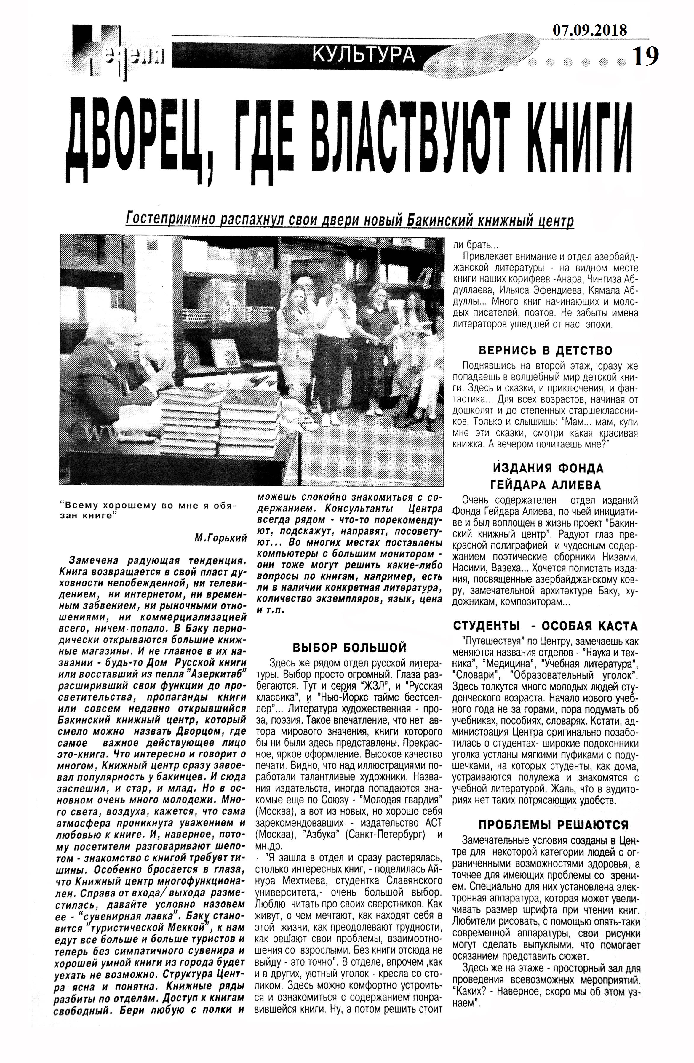 KİTABXANA İŞİ 180. Azərbaycanda bir nüsxədə və kiçik tirajla nəşr olan kitabların sərgisi-baxışı: [M.Ş.Vazeh adına Mərkəzi Kitabxanada] //Вышка.- 2018.-7-13 сентября.- S.11. 181. Azəri, L. Kitabxana sisteminin inkişafında innovativ yeniliklərin tətbiqi zəruridir: Azərbaycan Milli Kitabxanasının 95 illiyinə həsr edilmiş elmi-praktik konfrans: [“Milli kitabxanalarda innovasiyalar – dəyişikliklərin əsası və inkişafın istiqaməti kimi” mövzusunda] //Mədəniyyəti.- 2018.- 28 sentyabr.- S.3. 182. Bakı Kitab Mərkəzində görmə qabiliyyəti zəif uşaqlarla görüş //Mədəniyyət.-2018.- 26 sentyabr.- S.12. 183. Bakı Kitab Mərkəzində ziyalılar və ictimai xadimlər üçün təqdimat keçirilib //Azərbaycan.- 2018.-1 sentyabr.- S.6.; Ədəbiyyat qəzeti.- 2018.-1 sentyabr.- S.8.; 525-ci qəzet. - 2018.-4 sentyabr.- S.7. 184. Bayramlı, M. Bakı Kitab mərkəzi kitabsevərlərin sevimli məkanı olacaq //Yeni Azərbaycan.- 2018.- 8 sentyabr.- S.7. 185. “Biblioemalatxana”nın növbəti “təmir günü” [M.Ş.Vazeh adına Yasamal Rayon Mərkəzi Kitabxanasında eyniadlı layihənin keçirilməsi haqqında] //Mədəniyyət.- 2018.- 5 sentyabr.- S.11. 186. Fariz. Kollektivdə sağlam mühit hər zaman işin xeyrinə olur: [Milli Kitabxanada Mədəniyyət Nazirliyi Həmkarlar İttifaqının növbədənkənar iclasında Mədəniyyət naziri Əbülfəs Qarayevin iştirakı haqqında] //Mədəniyyət.-2018.- 19 sentyabr.- S.6. 187. Gənclər Kitabxanası Rus Mədəniyyət Mərkəzi ilə əməkdaşlıq edir //Mədəniyyət.- 2018.- 14 sentyabr.- S.9. 188. Heydər Əliyev Fondunun təşəbbüsü ilə yaradılan Bakı Kitab Mərkəzinin açılışı olub: [Prezident İlham Əliyev və birinci xanım Mehriban Əliyeva Bakı Kitab Mərkəzinin açılışında iştirak ediblər] //Ədəbiyyat qəzeti.- 2018.-1 sentyabr.- S.2. 189. İsveç səfirliyindən Gəncənin Uşaq Kitabxanasına hədiyyə //Mədəniyyət.- 2018.- 28 sentyabr.- S.7. 190. “Kitab və onun gələcəyi” müzakirə olunur: [M.Ş.Vazeh adına Mərkəzi Kitabxanada] //525-ci qəzet.-2018.- 26 sentyabr.- S.7. 191. “Kitabxanaya kitab hədiyyə edirik” aksiyası davam edir: [M.Ş.Vazeh adına Yasamal Rayon Mərkəzi Kitabxanasında eyniadlı aksiyanın keçirilməsi haqqında] //Вышка.- 2018.-7-13 сентября.- S.11. 192. “Kitabxanaya kitab hədiyyə edirik”: [M.Ş.Vazeh adına Yasamal Rayon Mərkəzi Kitabxanasında eyniadlı aksiyanın keçirilməsi haqqında] //Mədəniyyət.- 2018.- 7 sentyabr.- S.10. 193. Qətərlə kitabxana sahəsində əməkdaşlıq davam edir: [Qətər Milli Kitabxanasının icraçı direktoru Sohair Vastavinin Milli Kitabxanada olması haqqında] //Mədəniyyət.- 2018.- 28 sentyabr.- S.5. 194. Qocayeva, Ə. “Akademik İsa Həbibbəyli” biblioqrafiyası nəşr edilmişdir: [M.F.Axundov adına Azərbaycan Milli Kitabxanasında] //Səs.- 2018.- 26 sentyabr.- S.12. 195. Milli Kitabxana ölkəmizin bilik xəzinəsidir: [M. F. Axundov adına Azərbaycan Milli Kitabxanasında “Milli kitabxanalarda innovasiyalar” mövzusunda keçirilən beynəlxalq elmi konfrans haqqında] //Həftə içi.- 2018.- 28 sentyabr.- S.8. 196. Milli Kitabxananın 95 illiyi elmi-praktik konfransla qeyd olundu: [“Milli kitabxanalarda innovasiyalar – dəyişikliklərin əsası və inkişafın istiqaməti kimi” mövzusunda] //525-ci qəzet. - 2018.- 28 sentyabr.- S.7. 197. Müşfiq, Ş. Milli Kitabxananın direktoru qətərli həmkarı ilə görüşdü: [Kərim Tahirov Qətər Milli Kitabxanasının İcraçı direktoru xanım doktor Sohair Vastavini qəbul edib] //525-ci qəzet.-2018.- 27 sentyabr.- S.7. 198. Mütaliə və kitablar arasında istirahət: Bakı Kitab Mərkəzində təqdimat keçirilib //Mədəniyyət.- 2018.-5 sentyabr.- S.4. 199. Respublika Gənclər Kitabxanasının 90 illiyi münasibətilə sərgi: [“Açıq Kitabxana”, “XXI əsr Gənclər Kitabxanaları – Ənənələr, innovasiyalar. Öyrənək, öyrədək” layihələri çərçivəsində Yasamal rayonu Mikayıl Müşfiq adına bağda kitab sərgisinin təşkili haqqında] //Mədəniyyət.-2018.- 26 sentyabr.- S.15. 200. Rəsul Həmzətovun 95 illiyi münasibətilə kitab sərgisi: [Milli Kitabxanada Dağıstanın Xalq şairi, tərcüməçi, publisist, ictimai xadimin kitab sərgisi haqqında] //Mədəniyyət.- 2018.- 7 sentyabr.- S.4. 201. Şahanə. Milli Kitabxanada “Rəsul Həmzətov-95” sərgisi //525-ci qəzet.- 2018.- 8 sentyabr.- S.9. 202. Tək nüsxədə olan kitabların sərgisi: [Yasamal Rayon MKS-nin Mərkəzi Kitabxanasında keçirilən sərgi haqqında] //Mədəniyyət.- 2018.- 14 sentyabr.- S. 7. 203. Tofiq, H. “Milli Kitabxana ölkəmizin bilik xəzinəsidir” – Əbülfəs Qarayev: “Milli Kitabxanada beş milyondan artıq kitab saxlanılır”: [konfransda Əbülfəs Qarayev cıxış edib] //Azad Azərbaycan.- 2018.- 28 sentyabr.- S.7.