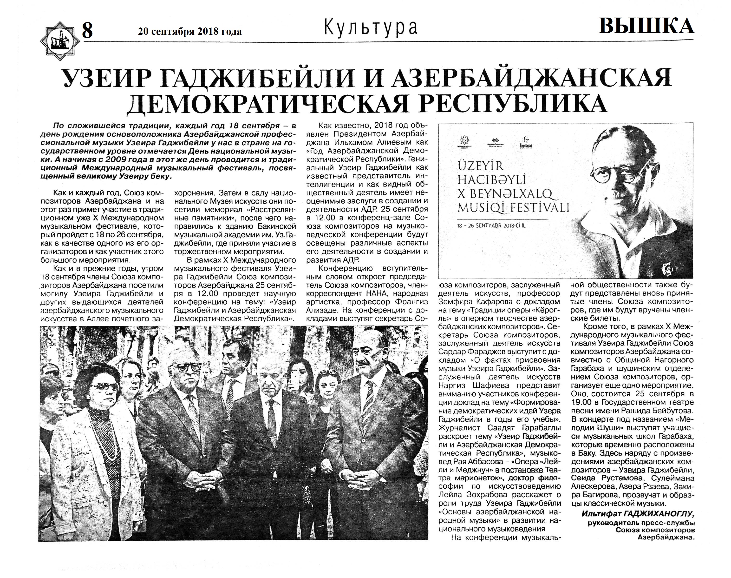 МУЗЫКА 1108. Аббасова, Р. Мир, сотканный из музыки, света и надежды: Каждым днем своей жизни он оправдывал имя, данное ему при рождении: [о жизни и творчестве пианиста и композитора Джахангира Гараева] //Каспiй.- 2018.-8 сентября.- С.14-15. 1109. Агаев, Н. Он поднял тар на вершины: Гаджи Ханмамедов обладал неповторимым творческим почерком: [к 100 летию народного артиста] //Азербайджанские известия.- 2018.-1 сентября.- С.3. 1110. Азербайджанский дирижер занял второе место на конкурсе имени Евгения Светланова: [Фуад Ибрагимов] //Ежедневные новости.- 2018.-14 сентября.- С.10. 1111. Алиярова, Н. Музыка - язык, понятный всем: Наргиз Алиярова: Каждый человек способен изменить к лучшему мир вокруг себя: [беседа с Заслуженной артисткой Н.Алияровой] /провела А.Ислам //Каспiй.- 2018.-8 сентября.- С.16-17. 1112. Баритон Магеррам Гусейнов успешно дебютировал в Театре Ла Скала //Ежедневные новости.- 2018.-7 сентября.- С.3. 1113. Вишневкин, Б. Был и останется бакинцем: Борис Вишневкин о городе детства, о жизни, о музыке…: [беседа с композитором, соотечественником из США] /провела Ф.Ханджанбекова //Каспiй.- 2018.-8 сентября.- С.10-11. 1114. Ислам, А. Незабываемые имена, неповторимые голоса…: Фирангиз Ахмедова-90 //Каспiй.- 2018.-7 сентября.- С.13. 1115. Ислам, А. По следам одной телепередачи: Искусство преданных служителей древнего мугама: [о творчестве народных артистов, ханенде А.Мамедова и А.Абдуллаева] //Каспiй.- 2018.-12 сентября.- С.12. 1116. Народный артист Азербайджана выступил на открытии сезона Метрополитен-опера: [Эльчин Азизов] //Бакинский рабочий.- 2018.-27 сентября.- С.7. 1117. Садыхлы-Дворкин, А. Богатая коллекция счастья: Афа Садыхлы-Дворкин: Счастье - это коллекция счастливых дней!: [беседа с пианисткой] /провела Н.Алиярова //Каспiй.- 2018.-5 сентября.- С.11.