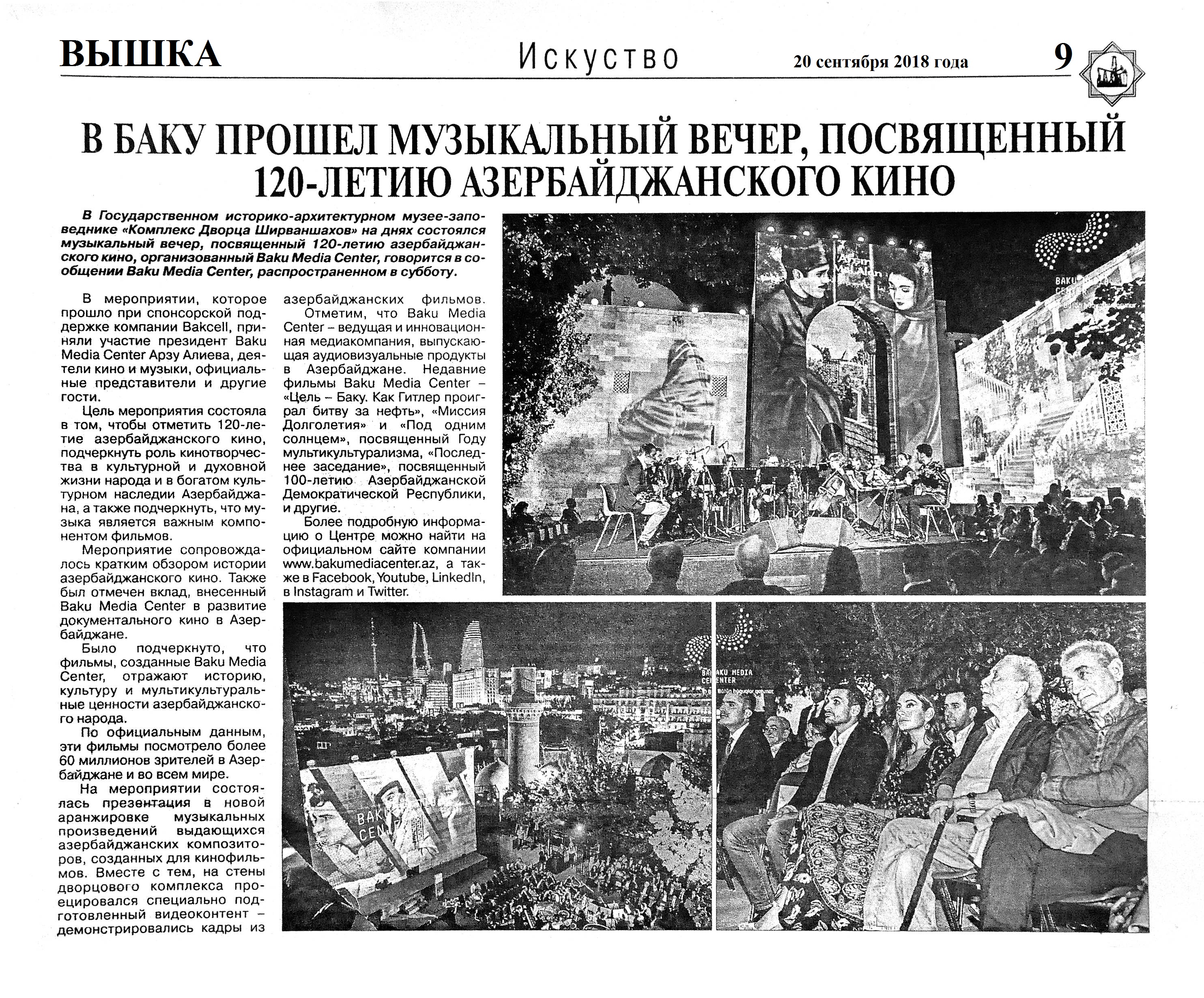 Azərbaycan kinosu – 120 500. Adana festivalında Azərbaycan kinosunun 120 illiyinə həsr olunan mərasim: [Türkiyənin Adana şəhərində keçirilən 25-ci Beynəlxalq Film Festivalı çərçivəsində] //Mədəniyyət.-2018.- 26 sentyabr.- S.11. 501. Azərbaycan kinosunun 120 illiyinə həsr olunmuş musiqi axşamı keçirilib: [Bakı Media Mərkəzi “Şirvanşahlar Saray Kompleksi” Dövlət Tarix-Memarlıq Qoruq Muzeyində] //Azərbaycan.- 2018.- 16 sentyabr.- S.12.; Respublika.- 2018.- 16 sentyabr.- S.7.; Mədəniyyət.-2018.- 19 sentyabr.- S.7. 502. 120 yaşlı Azərbaycan kinosu: [Goranboy Rayon Heydər Əliyev Mərkəzində keçirilən tədbir haqqında] //Mədəniyyət.-2018.- 21 sentyabr.- S.10.
