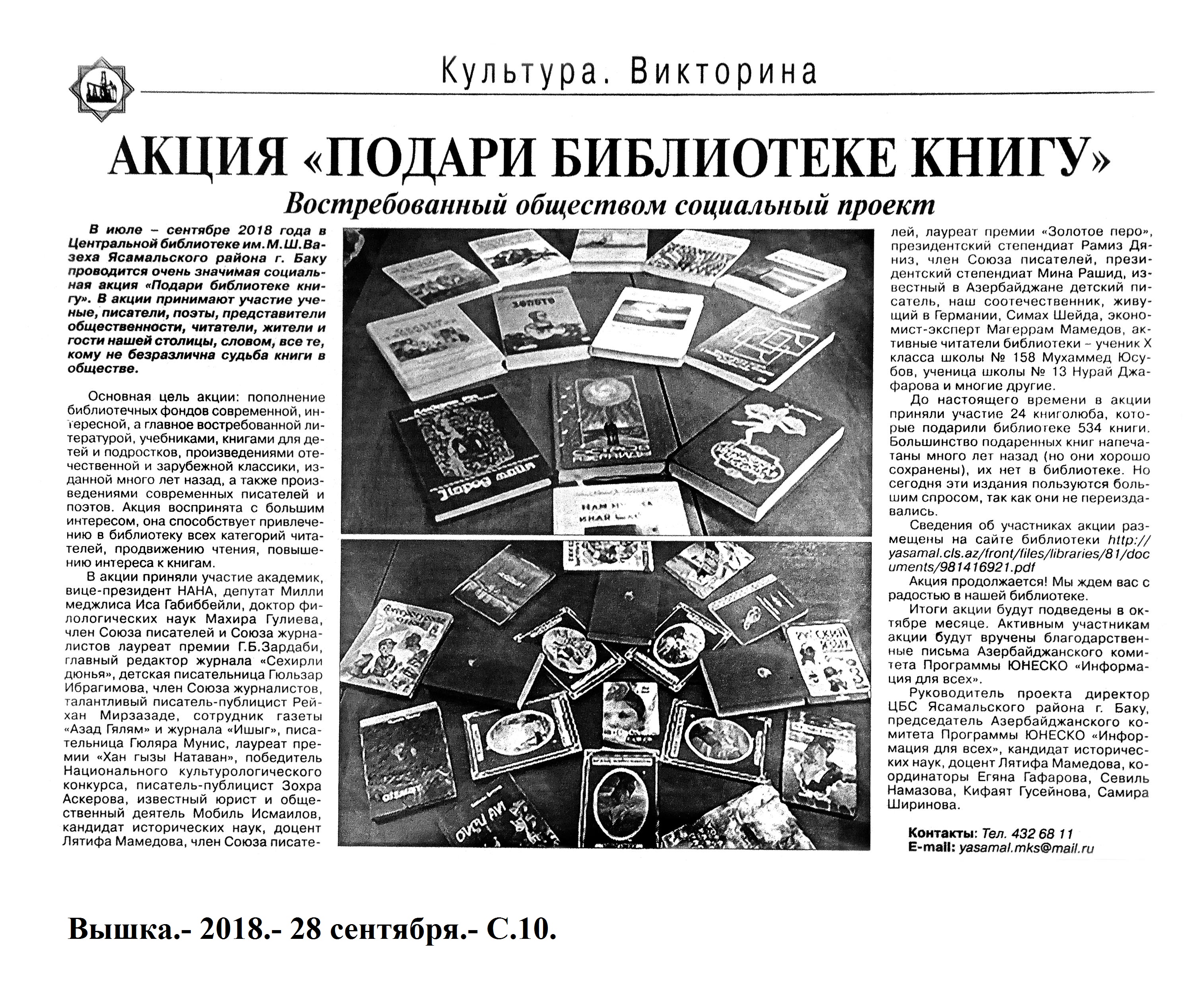 БИБЛИОТЕЧНОЕ ДЕЛО БИБЛИОТЕКОВЕДЕНИЕ 1079. Акция «Подари библиотеке книгу»: Востребованный обществом социальный проект: [в Центральной библиотеке имени М.Ш.Вазеха] //Вышка.- 2018.-28 сентября.- С.10. 1080. В Баку проходит выставка книг, изданных ограниченным тиражом: [в Центральной библиотеке имени М.Ш.Вазеха] //Ежедневные новости.- 2018.-21 сентября.- С.10. 1081. Гамбарова, Ш. Библиотека как научно-методический центр: Образовательное учреждение, которое стимулирует детей на дальнейшее развитие: [беседа с директором Детской Библиотеки им.Ф.Кочарли Ш.Гамбаровой] /провела А.Ислам //Каспiй.- 2018.-20 сентября.- С.11-12. 1082. Мирзоев, М. В единственном экземпляре: Выставка в Центральной Библиотеке имени Мирзы Шафи Вазеха Ясамальского района не только интересна, но и уникальна //Азербайджанские известия.- 2018.-20 сентября.- С. 3.