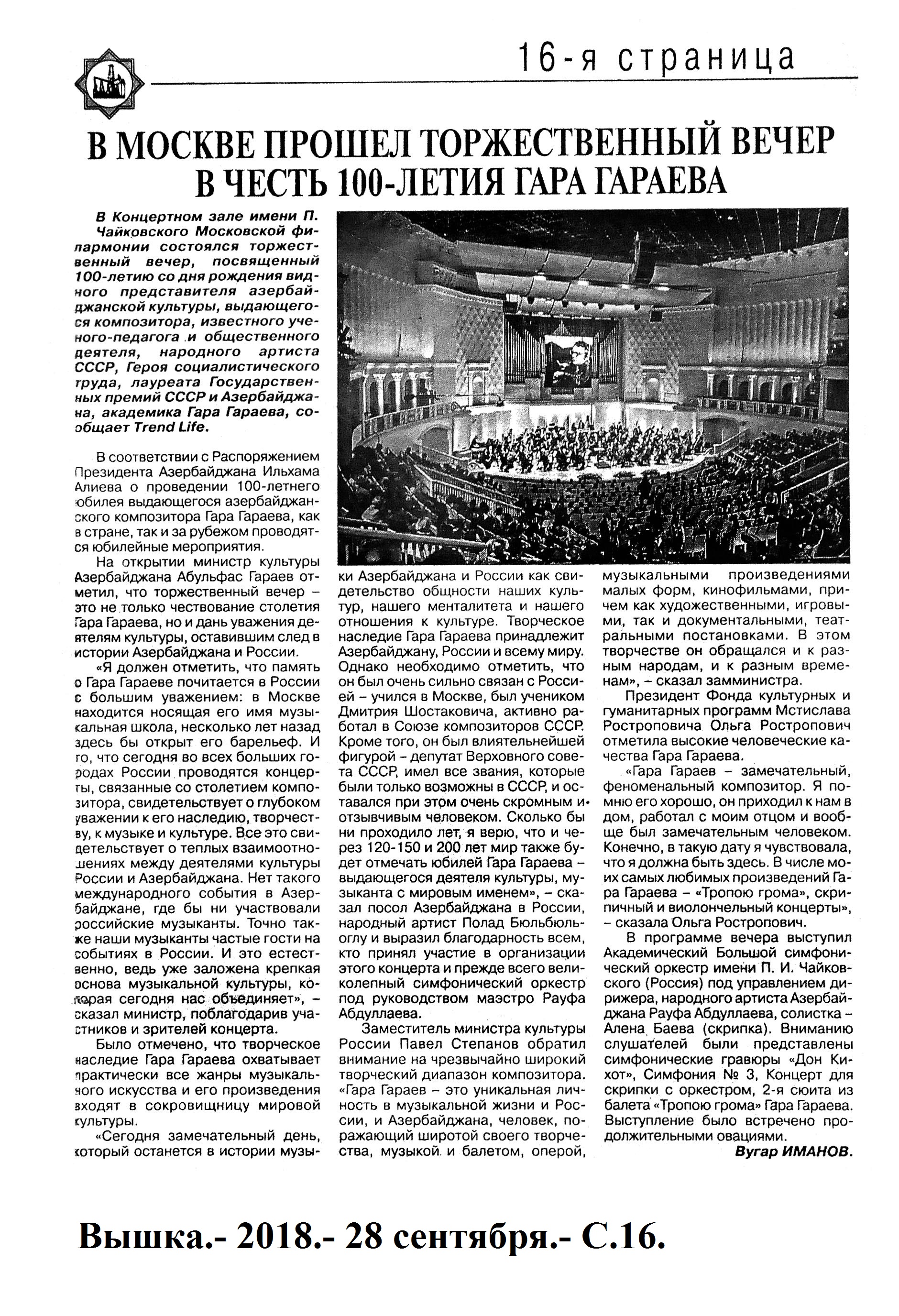 См.: 104 Гара Гараев – 100 1118. В Москве отметят столетие со дня рождения Кара Караева //Бакинский рабочий.- 2018.-18 сентября.- С.10. 1119. В Москве прошел концерт, посвященный 100-летию Кара Караева //Бакинский рабочий.- 2018.-25 сентября.- С.6. 1120. Иманов, В. В Москве прошел торжественный вечер в честь 100-летия Гара Гараева //Вышка.- 2018.-28 сентября.- С.16. 1121. Мирзоев, А. Ариф Мирзоев, композитор: «Я счастлив, что был учеником гения» /провела беседу И.Рассказова //Каспiй.- 2018.-22 сентября.- С.1,3. 1122. На французском радио и телевидении прозвучали произведения Кара Караева //Бакинский рабочий.- 2018.-11 сентября.- С.5. 1123. Саранский театр новый сезон открыл премьерой балета «Семь красавиц» //Бакинский рабочий.- 2018.-22 сентября.- С.7.