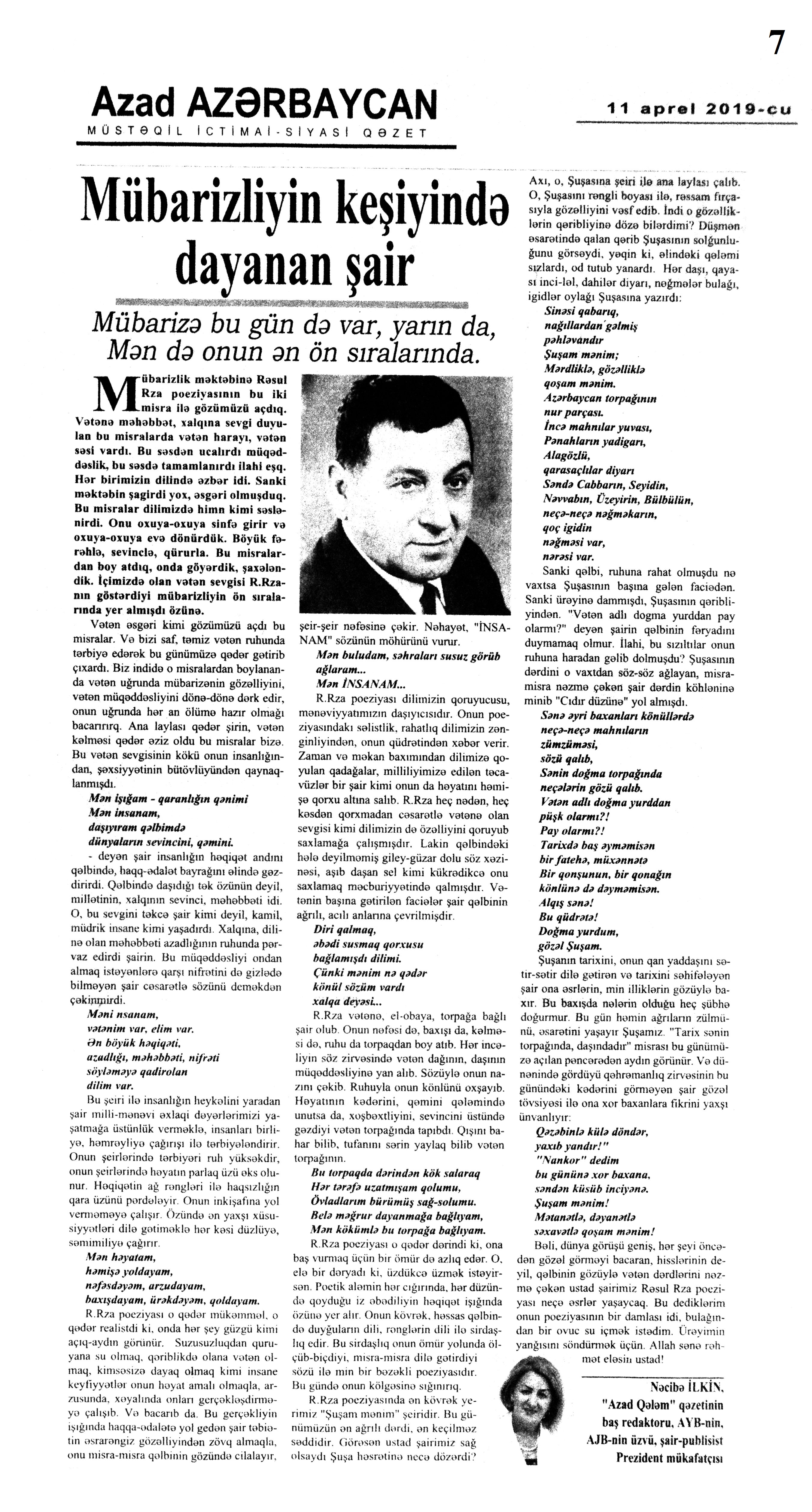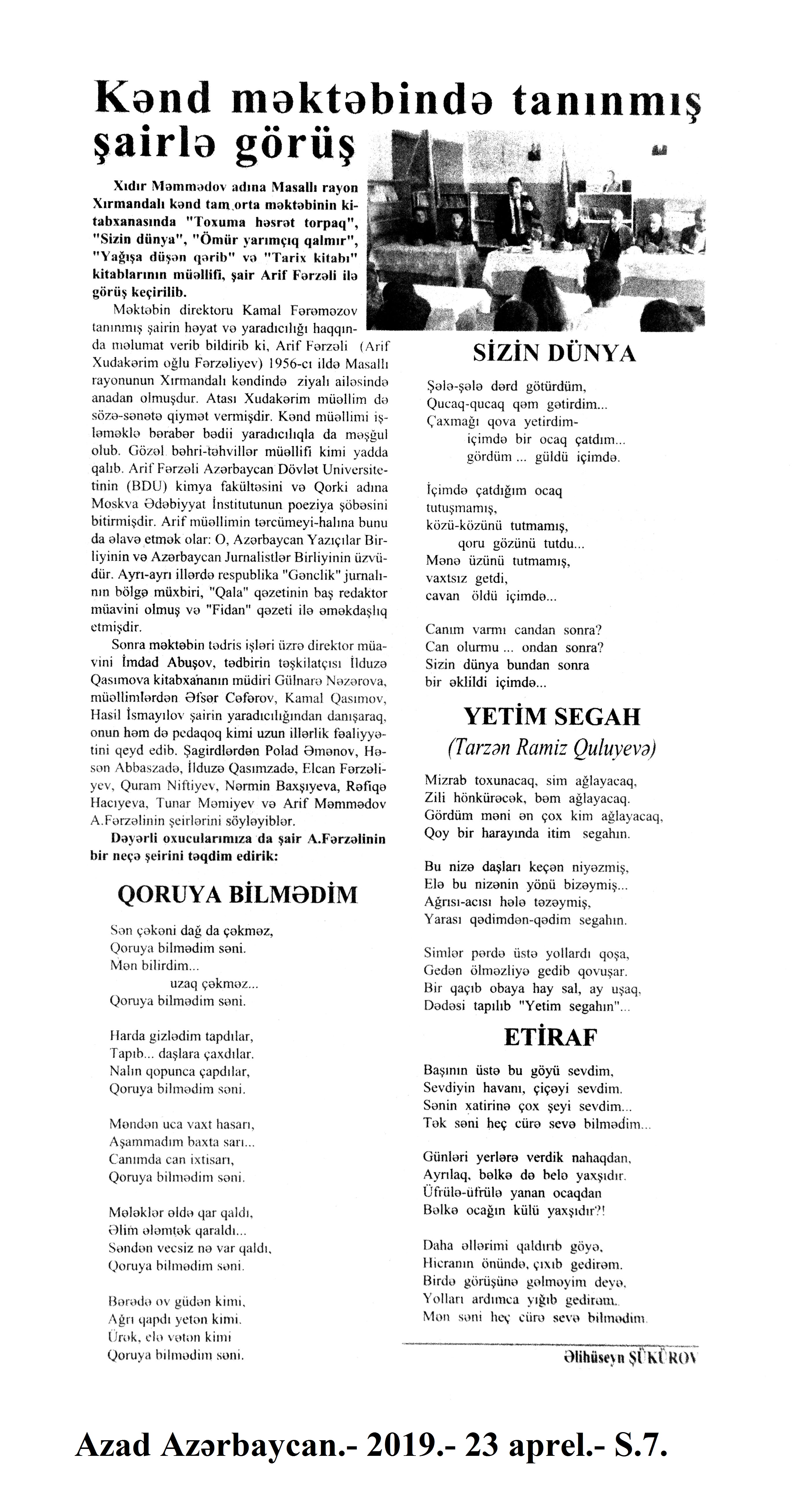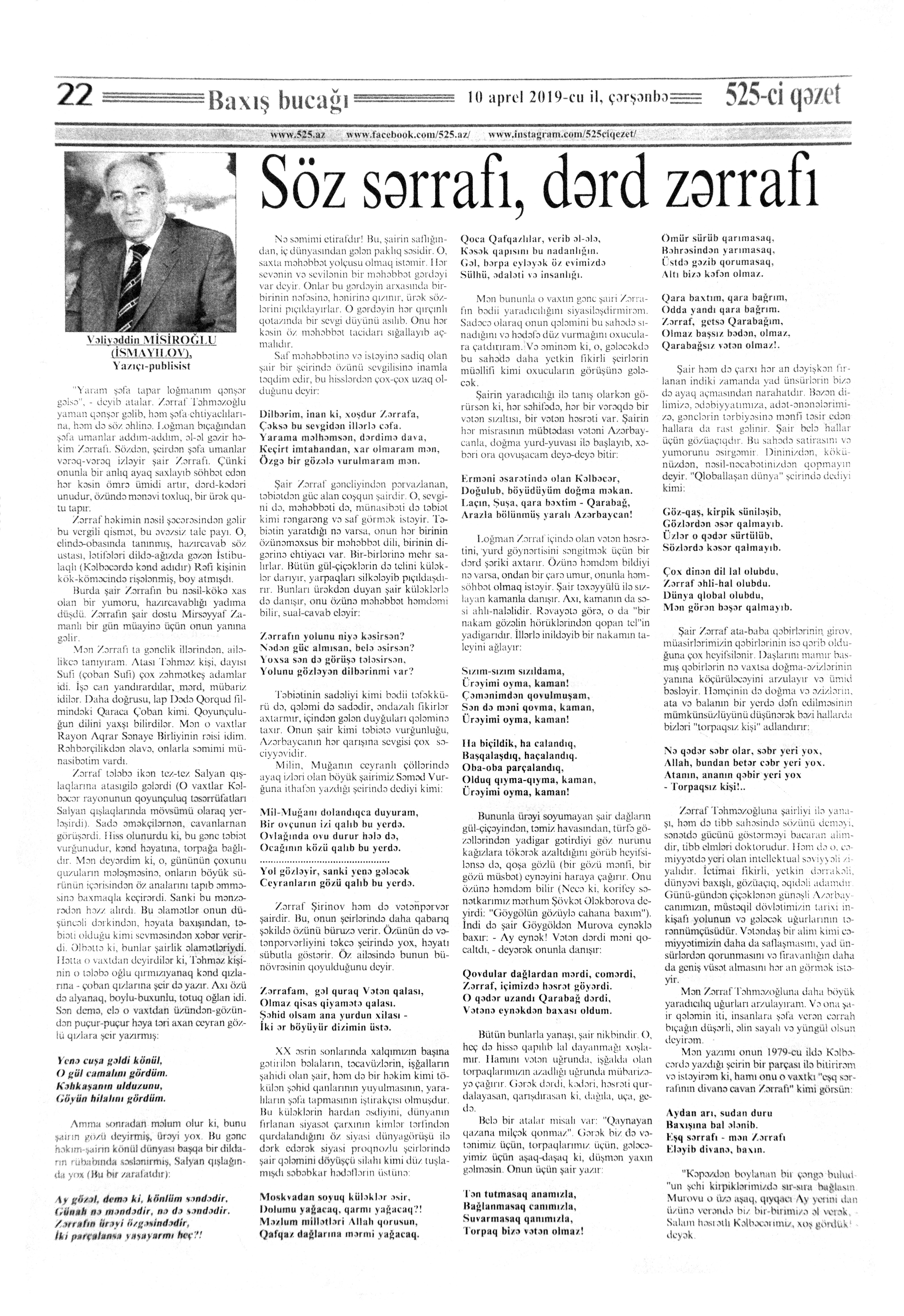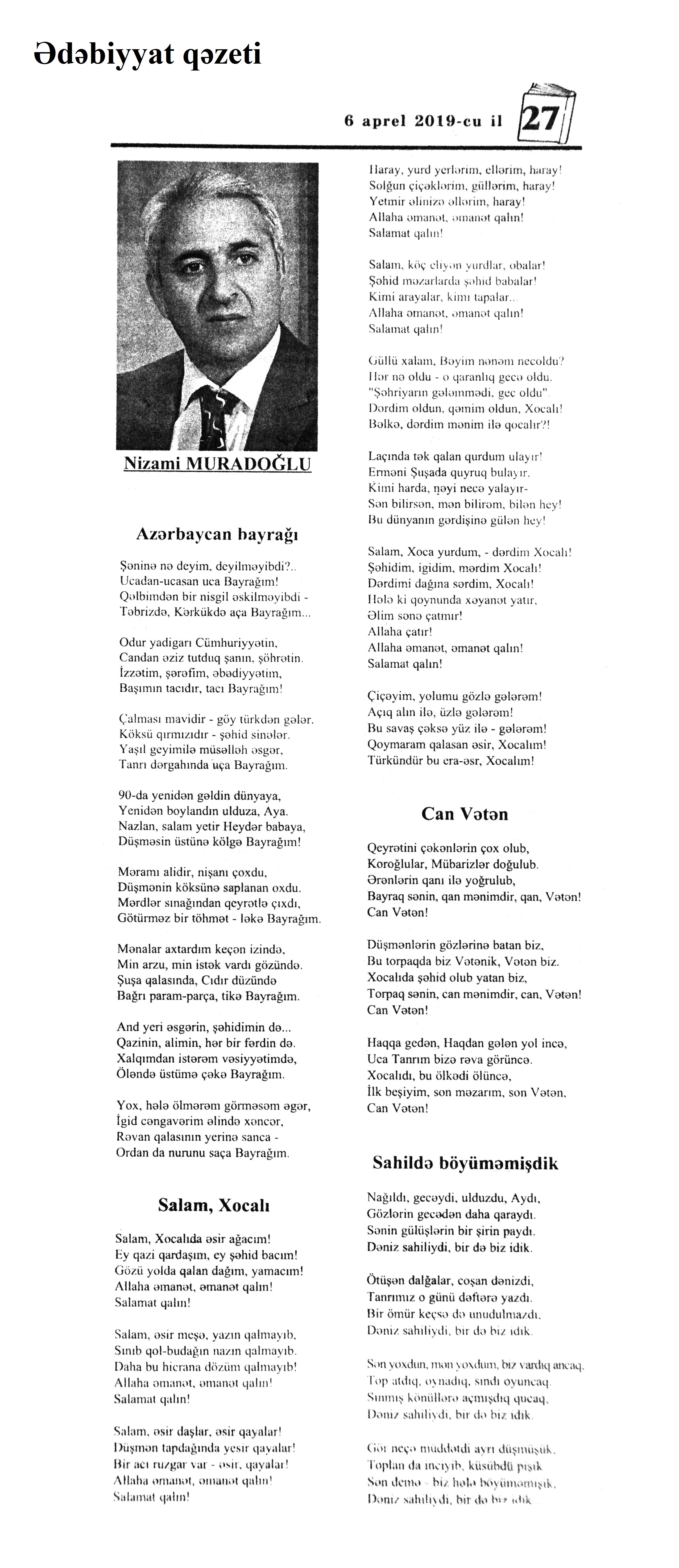 İsmayılovun eyniadlı şeiri haqqında] 431. Basyo. Yapon xokkoları: Murad Köhnəqalanın tərcüməsində /Kyöray; Tiyö Fukuda; Xyakuti, və Busonun şeirləri //Ədəbiyyat qəzeti.- 2019.- 27 aprel.- S.31. 432. Davudova, R. Ucalsın bayrağımız; Vətənim; Ana; Səhər-səhər; Yaz gəlir; Nənə //Ədalət.- 2019.- 9 aprel.- S.6. 433. Dərbəndli, Z. Sənsiz baxışlarım donub buz tutub: Ulu Dərbənd; Səhnə gözləri; Bir dəniz istərəm; Ağır dərddir //Ədalət.- 2019.- 23 aprel.- S.8. 434. Elsevər, S. Elinaya //Ədəbiyyat qəzeti.- 2019.- 13 aprel.- S.14. 435. Eyvazlı, G. Bu //Azərbaycan müəllimi.- 2019.- 12 aprel.- S.14. 436. Əfsun, Ə. Dağların; Yox; Gəlmişəm; Gecələr; Qədəmin xoş gəlib yaza, bənövşə və s. //Ədalət.- 2019.- 30 aprel.- S.8.