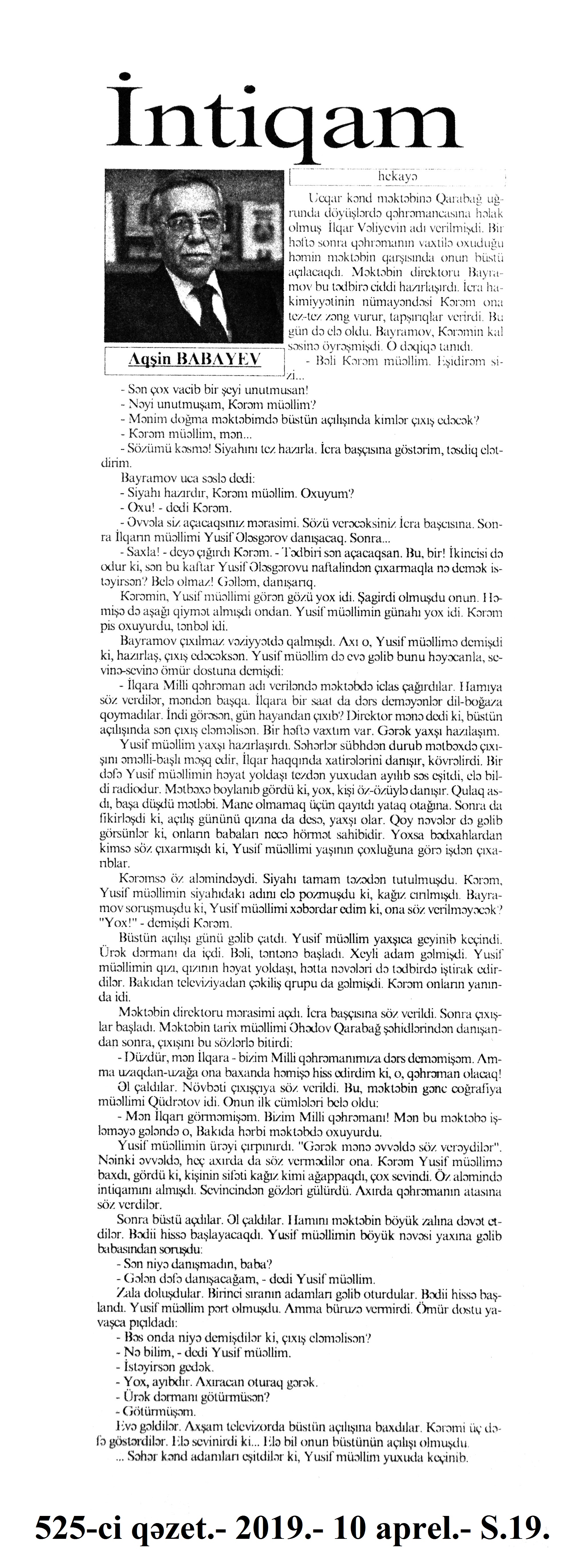 HEKAYƏLƏR 515. Abbas, M. Mənim badam xalam //Ədalət.-2019.- 4 aprel.- S.7. 516. Abdullah, M. Çəki daşı //Ədəbiyyat qəzeti.- 2019.- 27 aprel.- S.22-23. 517. Abid qızı, G. İtmiş boyunbağı //Ədalət.- 2019.- 2 aprel.- S. 7. 518. Alıoğlu, S. Tütək səsi //Ədalət.- 2019.- 24 aprel.- S.7. 519. Asnı, A. Gülsatan //Ədalət.- 2019.- 23 aprel.- S.7. 520. Ataqam. Nanəli konfet //Ədəbiyyat qəzeti.- 2019.- 20 aprel.- S. 28. 521. Azayev, Ə. Böyük oyanış //Ədalət.- 2019.- 25 aprel.- S.6. 522. Azər, A. Maşındakı qız //Ədəbiyyat qəzeti.- 2019.- 13 aprel.- S.21. 523. Babayev, A. İntiqam //525-ci qəzet.- 2019.- 10 aprel.- S. 19. 524. Boysunar, T. Axşamüstü //Ədəbiyyat qəzeti.- 2019.- 27 aprel.- S.4. 525. Bünyad, Y. Yad qadın, quduz itlər və...: Yazıçı Həmid Piriyevə //Ədəbiyyat qəzeti.- 2019.- 6 aprel.- S. 30. 526. Əlioğlu, Ə. Qanayan sədəflər //Ədalət.- 2019.- 13 aprel.- S. 16. 527. Əlioğlu, Ə. Qarpız //Kaspi.-2019.- 27-29 aprel.- S.22. 528. Fikrətoğlu, O. Paxıl //Kaspi.- 2019.- 20-22 aprel.- S.21. 529. Heydərova, Ü. Pələng: Ustadım Ramiz Fətəliyevə //Ədəbiyyat qəzeti.- 2019.- 27 aprel.- S.5. 530. Həsəni, O. Sonuncu yuxu //525-ci qəzet.- 2019.- 27 aprel.- S.19. 531. Hidayət, S. Hacı Murad: /fars dilindən tərc.etdi Məmməd Nuri //Kaspi.- 2019.- 27-29 aprel.- S.19. 532. İsabəyli, Q. İtki //Ədalət. -2019.- 6 aprel.- S.12. 533. İsmayıl, R. At muraddı //Ədalət.- 2019.- 17 aprel.- S.8. 534. Kəngərli, A. Qaş düzəldən yerdə //Ədəbiyyat qəzeti.- 2019.- 6 aprel.- S.28. 535. Lindqren, A. Mirabel: [isveç ədəbiyyatı] //Ədəbiyyat qəzeti.-2019.- 13 aprel.- S.26. 536. Məlikzadə, S. Ad //Kaspi.-2019.- 6-8 aprel.- S.22. 537. Mustafa, G. O gün... //Azərbaycan müəllimi.- 2019.- 12 aprel.- S.14. 538. Müzəffərli, A. Axşam xaşı //Ədalət.- 2019.- 10 aprel.- S. 7. 539. Müzəffərli, A. Göz yaşları quruyanda //Ədalət.- 2019.- 16 aprel.- S.6. 540. Pərvin. Serpantin //525-ci qəzet.-2019.- 20 aprel .- S.15. 541. Rulfo, X. Hər şey kasıb olduğumuza görədir: [Meksika ədəbiyyatı] /tərc.etdi Həmid Piriyev //Ədəbiyyat qəzeti.- 2019.- 20 aprel.- S.6.