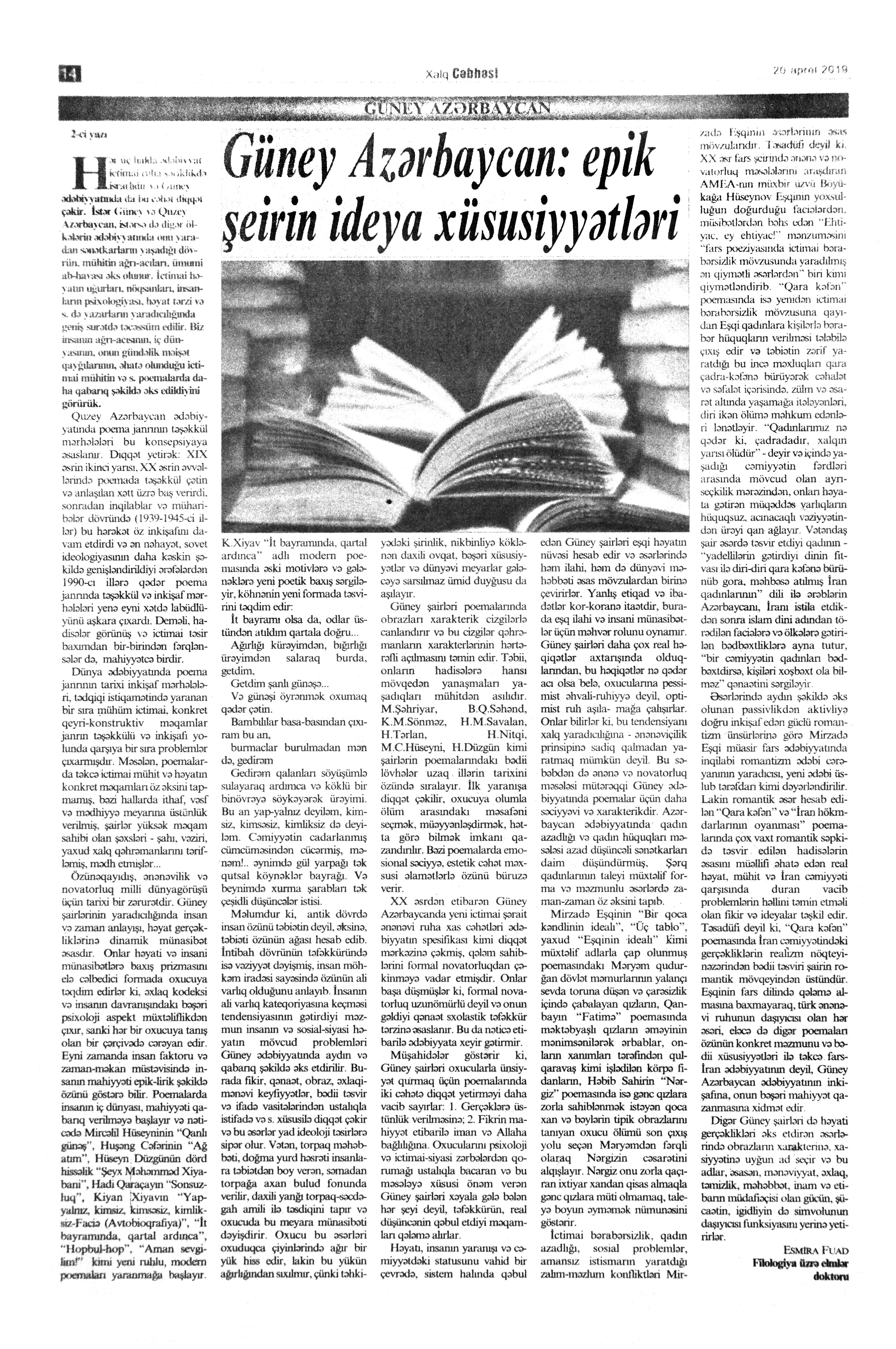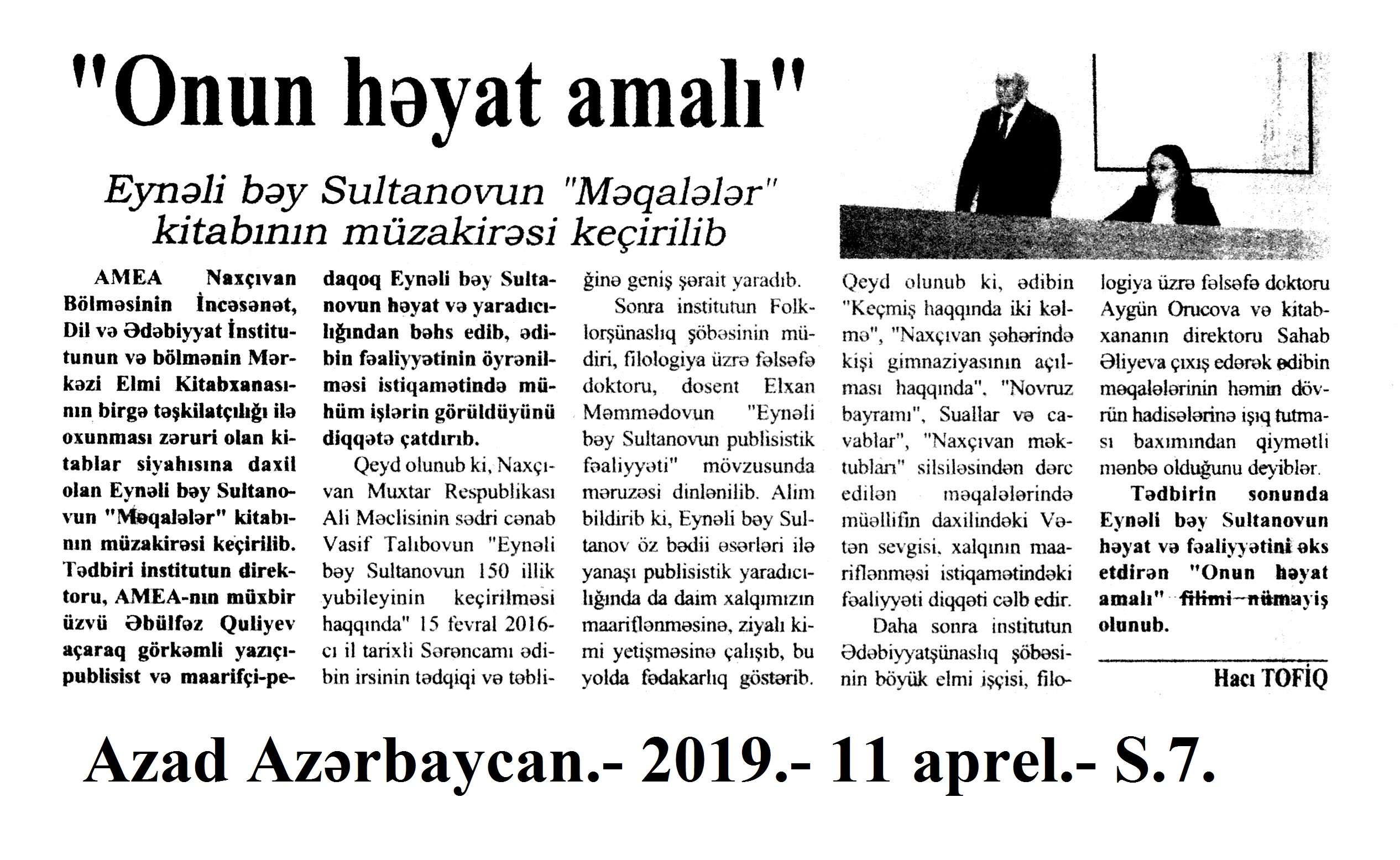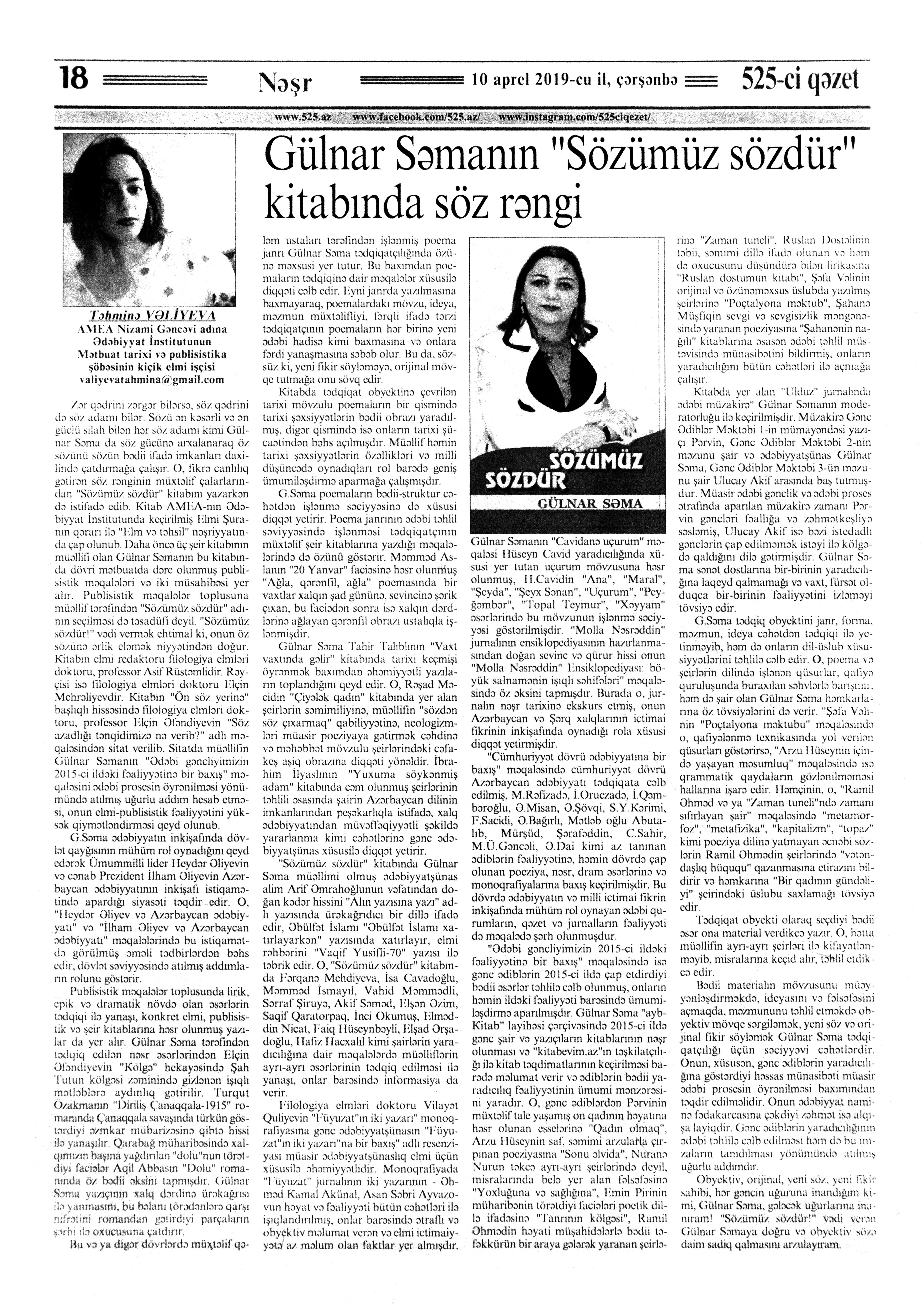 Nigar Rəfibəylinin çiçək ətirli poetik dünyası 793. Sadıqlı, P. Etnoqrafik bilgilərlə zəngin kitab: [araşdırmaçı yazar Rüfət Hüseynlinin “Xınna dərəsində Keşişkənd-Qoşabulaq elləri” kitabı haqqında] //Ədalət.-2019.- 5 aprel.- S.7. 794. Sadiq, B. Şeirin vətənpərvərlik missiyası: (Elmira Aslanxanlı Turanın kitabı haqqında düşüncələri) //Ədalət.- 2019.- 19 aprel.- S.8. 795. Salmanqızı, E. “Ölü ordunun generalı”: Gələcəyə torpağın altında yatanlar qərar verir: [yazıçı İsmayıl Kadarenin eyniadlı romanı haqqında] //Kaspi.- 2019.- 20-22 aprel.- S.20. 796. Salmanlı, R. Professorun müəmmalı ölümü: Repressiya qurbanları: [professor Məmmədkazım Ələkbərli haqqında] //Azərbaycan.- 2019.- 14 aprel.- S.6. 797. Sarıyeva, İ. Yunus Oğuz “Nadir şah Əfşar: tarixin gedişini dəyişdirən görkəmli sərkərdə” adlı beynəlxalq elmi konfransda sanballı çıxış etməyə hazırlaşır //Bakı Xəbər.- 2019.- 10 aprel.- S.10. 798. Seyidzadə, T. “Onun həyat amalı”: Eynəli bəy Sulta-novun “Məqalələr” kitabının müzakirəsi keçirilib: [AMEA-da] //Azad Azərbaycan.-2019.- 11 aprel.- S.7. 799. Səxavət, S. “Mənim üçün Üzeyir bəy Notr-Damdan yüksəkdədir”: [yazıçı Seyran Səxavətin ermənilərin tarixi abidələrimizə zərər vermələri haqqında müsahibəsi] /müsahibəni apardı Məlahət Rzayeva //Şərq.- 2019.- 18 aprel.- S.8. 800. Sənan, F. Yazıçı taleyinə qəriblik yazılmış Qərib Mehdiyə açıq məktub //Ədalət.- 2019.- 24 aprel.- S.6. 801. Soltanzadə, E. İLAHİYYATÇI: “Şairlər boşboğazdırlar... Nəsimi, Səməd Vurğun, Füzuli..: [Elşən Soltanzadə ilə “Quranın”, islam dininin müsəlmanlara düzgün çatdırılmaması ilə bağlı müsahibə] /müsahibəni apardı Eminquey //Ədalət.- 2019.- 26 aprel.- S.5. 802. “Sözümüz sözdür” də söz rəngi: [Gülnar Səmanın eyniadlı kitabı haqqında] //Azad Azərbaycan.- 2019.- 20 aprel.- S.7. 803. “Suyu seyr edən ağacın yuxusu”: [Qəşəm Nəcəfzadənin eyniadlı esselərdən ibarət kitabı haqqında] //Ədəbiyyat qəzeti.- 2019.- 13 aprel.- S.32. 804. Şahanə. ”Yazıçı” dərgisinin yeni sayında Füzuli yad edilib //525-ci qəzet.-2019.- 13 aprel.- S.13. 805. Şahin, Ş. Söz-söz xırdalanan şair: [Xatirə Rəhimbəylinin yaradıcılığı haqqında] //525-ci qəzet.- 2019.- 10 aprel.- S.20. 806. Şəfa, Ş. Qafqaz əfsanəsi – Hacı Murad: [Tolstoyun “Hacı Murad” povesti haqqında] //Kaspi.- 2019.- 20-22 aprel.- S.22. 807. Şəfaqət, H. Züleyxa gözlərini açır: Müasir tatar yazıçısı Quzel Yaxinanın eyniadlı əsərinə //Ədəbiyyat qəzeti.- 2019.- 13 aprel.- S.14. 808. Şəmsizadə, N. Gözəllik və sənət haqqında ballada: “Fəhmin fəthi” silsiləsindən //Ədəbiyyat qəzeti.- 2019.- 13 aprel.- S.20. 809. Şəmsizadə, N. İdrakdan süzülənlər: [Əli Vəli oğlunun yaradıcılığı haqqında] //Ədəbiyyat qəzeti.- 2019.- 6 aprel.- S.20. 810. Şərifova, S. “Ömür bir nağıldır” romanının janr xüsusiyyətləri: [şair Fərəc Fərəcovun eyniadlı kitabı haqqında] //Ədalət.- 2019.- 9 aprel.- S.5. 811. Şərifova, S. “Ömür bir nağıldır” romanının janr xüsusiyyətləri //Ədalət.-2019.- 10 aprel.- S.5. 812. Şərqşünas alimin məqalələr toplusu: [“Aida İmanquliyeva və Şərq-Qərb əlaqələrinin multikultural tədqiqi” toplusu haqqında] //Elm.- 2019.- 19 aprel.- S.6. 813. Şirvan, G. Yaşıdım şeirlərin müəllifinə: [şair, Əməkdar jurnalist Qulu Ağsəsin yaradıcılığı haqqında] //Ədəbiyyat qəzeti.-2019.- 20 aprel.- S.26.; 525-ci qəzet.-2019.-20 aprel.- S.12. 814. Şükürov, Ə. Kənd məktəbində tanınmış şairlə görüş: [Masallı Rayon Xırmandalı kəndində Arif Fərzəli ilə] //Azad Azərbaycan.-2019.- 23 aprel.- S.7. 815. Tağıyev, A. “Mənə nə” dilinizə gəlməsin...: “Xatirə yarpaqları”ndan: [müəllif Aydın Tağıyevin yazıçı Ələviyyə Babayeva ilə görüşü haqqında] //525-ci qəzet.- 2019.- 6 aprel.- S.23. 816. Tağıyeva, A. Londonda “Ağı” kitabının təqdimatı keçiri-lib: [Günel Anarqızının eyniadlı kitabı haqqında] //Ədəbiyyat qəzeti.- 2019.- 27 aprel.- S.13. 817. Tahirli, A. Parisdən bir məktub, iki tarixi sənəd: Sartr və Kamünün Hacıbəylilərə məktubu //Ədəbiyyat qəzeti.- 2019.- 6 aprel.- S.15; Kaspi.- 2019.- 9 aprel.- S.15. 818. Turan, A. “Şeirim sərbəst, fikrim fəzalar qədər dibsiz...”: [Mikayıl Rəfilinin həyat və yaradıcılığı haqqında] //Ədəbiyyat qəzeti.- 2019.- 6 aprel.- S.16-17. 819. Turan, T. Darıxmaq və qəfil gələn hədiyyə: [müəllif Türkan Turanın düşüncələri] //525-ci qəzet.- 2019.- 10 aprel. - S.12. 820. Turan, T. Köksüz münasibət və dibi tutmayan ağac: [müəllifin düşüncələri] //525-ci qəzet.- 2019.- 3 aprel. - S.12. 821. “Tülü” oxucuların ixtiyarına buraxılıb: Orxan Fikrətoğlu yeni kitabını təqdim etdi: [Mətbuat şürasında] //Şərq.- 2019.- 20 aprel.- S.6. 822. “Türkiyə ədəbiyyatında yeni hekayəçilik”: [filologiya üzrə fəlsəfə doktoru Sədaqət Qasımlının eyniadlı kitabının çapdan çıxması haqqında] //Mədəniyyət.- 2019.- 5 aprel.- S.7. 823. Ulusel, R. Kainat – insan vətənidir: İnsanlıq Birlik idealında: I məqalə //Ədəbiyyat qəzeti.-2019.- 13 aprel.- S.25. 824. “Üst Ad” yazı müsabiqəsinə qatılmış uşaqlar mükafatlandırıldı: [8-15 yaşlı uşaqlar arasında keçirilən yazı müsabiqəsinin nəticələri haqqında] //Ədəbiyyat qəzeti.-2019.- 20 aprel.- S.29. 825. Vəli, Ş. Gülün sözü: [Gülnar Səmanın eyniadlı kitabı haqqında] //Hərbi And.- 2019.- 12 aprel.- S.16. 826. Vəliyeva, T. Gülnar Səmanın “Sözümüz sözdür” kitabında söz rəngi: [yazarın eyniadlı kitabı haqqında] //525-ci qəzet.-2019.- 10 aprel.- S.18. 827. Vüsal,
