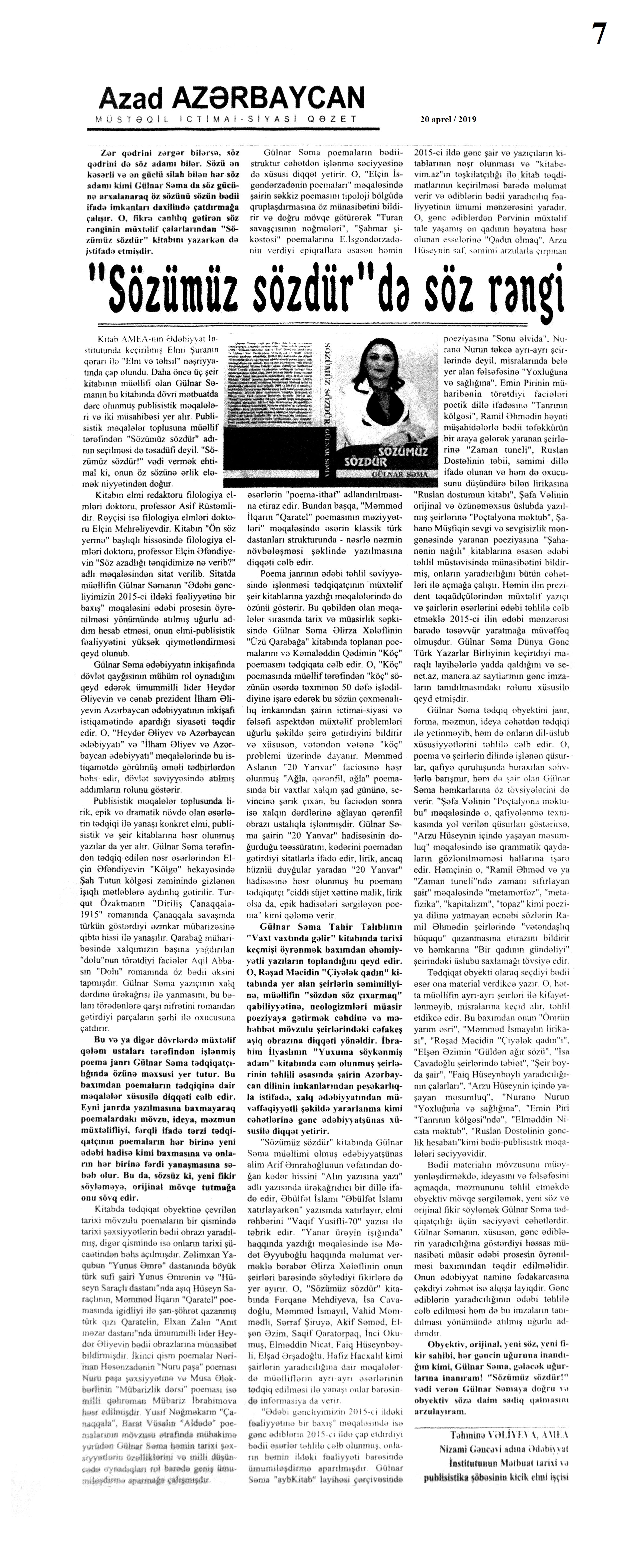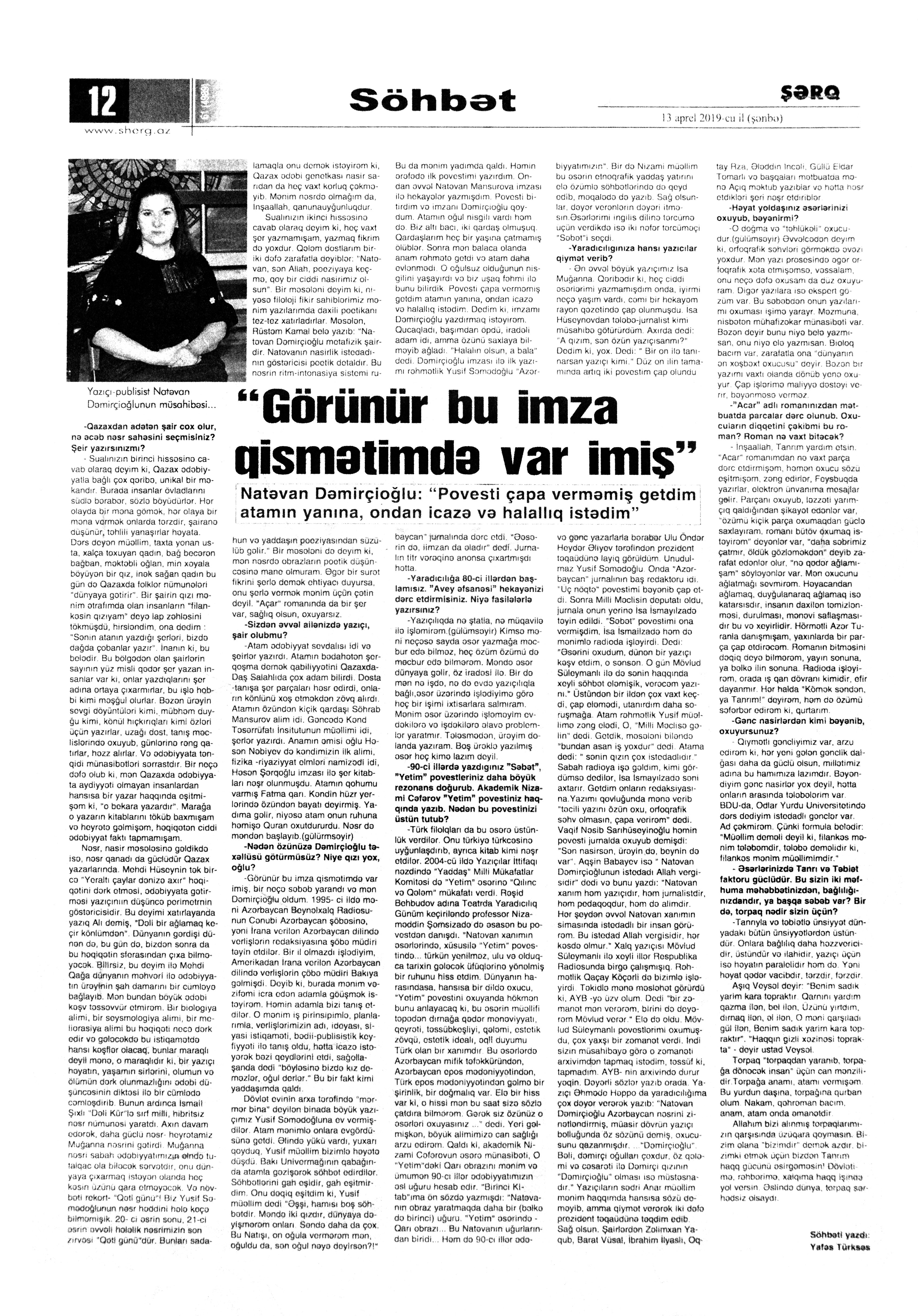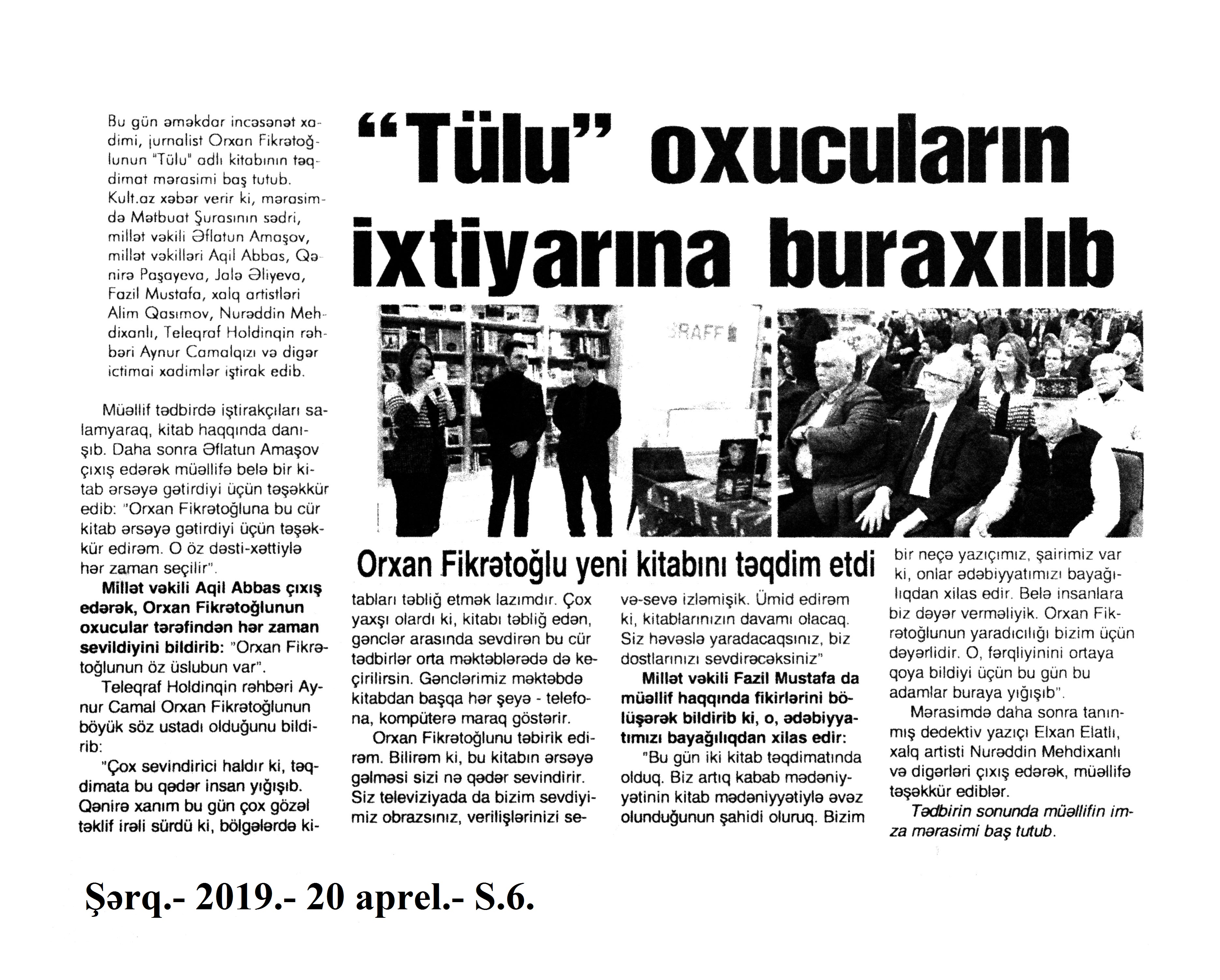 Nigar Rəfibəylinin çiçək ətirli poetik dünyası 793. Sadıqlı, P. Etnoqrafik bilgilərlə zəngin kitab: [araşdırmaçı yazar Rüfət Hüseynlinin “Xınna dərəsində Keşişkənd-Qoşabulaq elləri” kitabı haqqında] //Ədalət.-2019.- 5 aprel.- S.7. 794. Sadiq, B. Şeirin vətənpərvərlik missiyası: (Elmira Aslanxanlı Turanın kitabı haqqında düşüncələri) //Ədalət.- 2019.- 19 aprel.- S.8. 795. Salmanqızı, E. “Ölü ordunun generalı”: Gələcəyə torpağın altında yatanlar qərar verir: [yazıçı İsmayıl Kadarenin eyniadlı romanı haqqında] //Kaspi.- 2019.- 20-22 aprel.- S.20. 796. Salmanlı, R. Professorun müəmmalı ölümü: Repressiya qurbanları: [professor Məmmədkazım Ələkbərli haqqında] //Azərbaycan.- 2019.- 14 aprel.- S.6. 797. Sarıyeva, İ. Yunus Oğuz “Nadir şah Əfşar: tarixin gedişini dəyişdirən görkəmli sərkərdə” adlı beynəlxalq elmi konfransda sanballı çıxış etməyə hazırlaşır //Bakı Xəbər.- 2019.- 10 aprel.- S.10. 798. Seyidzadə, T. “Onun həyat amalı”: Eynəli bəy Sulta-novun “Məqalələr” kitabının müzakirəsi keçirilib: [AMEA-da] //Azad Azərbaycan.-2019.- 11 aprel.- S.7. 799. Səxavət, S. “Mənim üçün Üzeyir bəy Notr-Damdan yüksəkdədir”: [yazıçı Seyran Səxavətin ermənilərin tarixi abidələrimizə zərər vermələri haqqında müsahibəsi] /müsahibəni apardı Məlahət Rzayeva //Şərq.- 2019.- 18 aprel.- S.8. 800. Sənan, F. Yazıçı taleyinə qəriblik yazılmış Qərib Mehdiyə açıq məktub //Ədalət.- 2019.- 24 aprel.- S.6. 801. Soltanzadə, E. İLAHİYYATÇI: “Şairlər boşboğazdırlar... Nəsimi, Səməd Vurğun, Füzuli..: [Elşən Soltanzadə ilə “Quranın”, islam dininin müsəlmanlara düzgün çatdırılmaması ilə bağlı müsahibə] /müsahibəni apardı Eminquey //Ədalət.- 2019.- 26 aprel.- S.5. 802. “Sözümüz sözdür” də söz rəngi: [Gülnar Səmanın eyniadlı kitabı haqqında] //Azad Azərbaycan.- 2019.- 20 aprel.- S.7. 803. “Suyu seyr edən ağacın yuxusu”: [Qəşəm Nəcəfzadənin eyniadlı esselərdən ibarət kitabı haqqında] //Ədəbiyyat qəzeti.- 2019.- 13 aprel.- S.32. 804. Şahanə. ”Yazıçı” dərgisinin yeni sayında Füzuli yad edilib //525-ci qəzet.-2019.- 13 aprel.- S.13. 805. Şahin, Ş. Söz-söz xırdalanan şair: [Xatirə Rəhimbəylinin yaradıcılığı haqqında] //525-ci qəzet.- 2019.- 10 aprel.- S.20. 806. Şəfa, Ş. Qafqaz əfsanəsi – Hacı Murad: [Tolstoyun “Hacı Murad” povesti haqqında] //Kaspi.- 2019.- 20-22 aprel.- S.22. 807. Şəfaqət, H. Züleyxa gözlərini açır: Müasir tatar yazıçısı Quzel Yaxinanın eyniadlı əsərinə //Ədəbiyyat qəzeti.- 2019.- 13 aprel.- S.14. 808. Şəmsizadə, N. Gözəllik və sənət haqqında ballada: “Fəhmin fəthi” silsiləsindən //Ədəbiyyat qəzeti.- 2019.- 13 aprel.- S.20. 809. Şəmsizadə, N. İdrakdan süzülənlər: [Əli Vəli oğlunun yaradıcılığı haqqında] //Ədəbiyyat qəzeti.- 2019.- 6 aprel.- S.20. 810. Şərifova, S. “Ömür bir nağıldır” romanının janr xüsusiyyətləri: [şair Fərəc Fərəcovun eyniadlı kitabı haqqında] //Ədalət.- 2019.- 9 aprel.- S.5. 811. Şərifova, S. “Ömür bir nağıldır” romanının janr xüsusiyyətləri //Ədalət.-2019.- 10 aprel.- S.5. 812. Şərqşünas alimin məqalələr toplusu: [“Aida İmanquliyeva və Şərq-Qərb əlaqələrinin multikultural tədqiqi” toplusu haqqında] //Elm.- 2019.- 19 aprel.- S.6. 813. Şirvan, G. Yaşıdım şeirlərin müəllifinə: [şair, Əməkdar jurnalist Qulu Ağsəsin yaradıcılığı haqqında] //Ədəbiyyat qəzeti.-2019.- 20 aprel.- S.26.; 525-ci qəzet.-2019.-20 aprel.- S.12. 814. Şükürov, Ə. Kənd məktəbində tanınmış şairlə görüş: [Masallı Rayon Xırmandalı kəndində Arif Fərzəli ilə] //Azad Azərbaycan.-2019.- 23 aprel.- S.7. 815. Tağıyev, A. “Mənə nə” dilinizə gəlməsin...: “Xatirə yarpaqları”ndan: [müəllif Aydın Tağıyevin yazıçı Ələviyyə Babayeva ilə görüşü haqqında] //525-ci qəzet.- 2019.- 6 aprel.- S.23. 816. Tağıyeva, A. Londonda “Ağı” kitabının təqdimatı keçiri-lib: [Günel Anarqızının eyniadlı kitabı haqqında] //Ədəbiyyat qəzeti.- 2019.- 27 aprel.- S.13. 817. Tahirli, A. Parisdən bir məktub, iki tarixi sənəd: Sartr və Kamünün Hacıbəylilərə məktubu //Ədəbiyyat qəzeti.- 2019.- 6 aprel.- S.15; Kaspi.- 2019.- 9 aprel.- S.15. 818. Turan, A. “Şeirim sərbəst, fikrim fəzalar qədər dibsiz...”: [Mikayıl Rəfilinin həyat və yaradıcılığı haqqında] //Ədəbiyyat qəzeti.- 2019.- 6 aprel.- S.16-17. 819. Turan, T. Darıxmaq və qəfil gələn hədiyyə: [müəllif Türkan Turanın düşüncələri] //525-ci qəzet.- 2019.- 10 aprel. - S.12. 820. Turan, T. Köksüz münasibət və dibi tutmayan ağac: [müəllifin düşüncələri] //525-ci qəzet.- 2019.- 3 aprel. - S.12. 821. “Tülü” oxucuların ixtiyarına buraxılıb: Orxan Fikrətoğlu yeni kitabını təqdim etdi: [Mətbuat şürasında] //Şərq.- 2019.- 20 aprel.- S.6. 822. “Türkiyə ədəbiyyatında yeni hekayəçilik”: [filologiya üzrə fəlsəfə doktoru Sədaqət Qasımlının eyniadlı kitabının çapdan çıxması haqqında] //Mədəniyyət.- 2019.- 5 aprel.- S.7. 823. Ulusel, R. Kainat – insan vətənidir: İnsanlıq Birlik idealında: I məqalə //Ədəbiyyat qəzeti.-2019.- 13 aprel.- S.25. 824. “Üst Ad” yazı müsabiqəsinə qatılmış uşaqlar mükafatlandırıldı: [8-15 yaşlı uşaqlar arasında keçirilən yazı müsabiqəsinin nəticələri haqqında] //Ədəbiyyat qəzeti.-2019.- 20 aprel.- S.29. 825. Vəli, Ş. Gülün sözü: [Gülnar Səmanın eyniadlı kitabı haqqında] //Hərbi And.- 2019.- 12 aprel.- S.16. 826. Vəliyeva, T. Gülnar Səmanın “Sözümüz sözdür” kitabında söz rəngi: [yazarın eyniadlı kitabı haqqında] //525-ci qəzet.-2019.- 10 aprel.- S.18. 827. Vüsal,