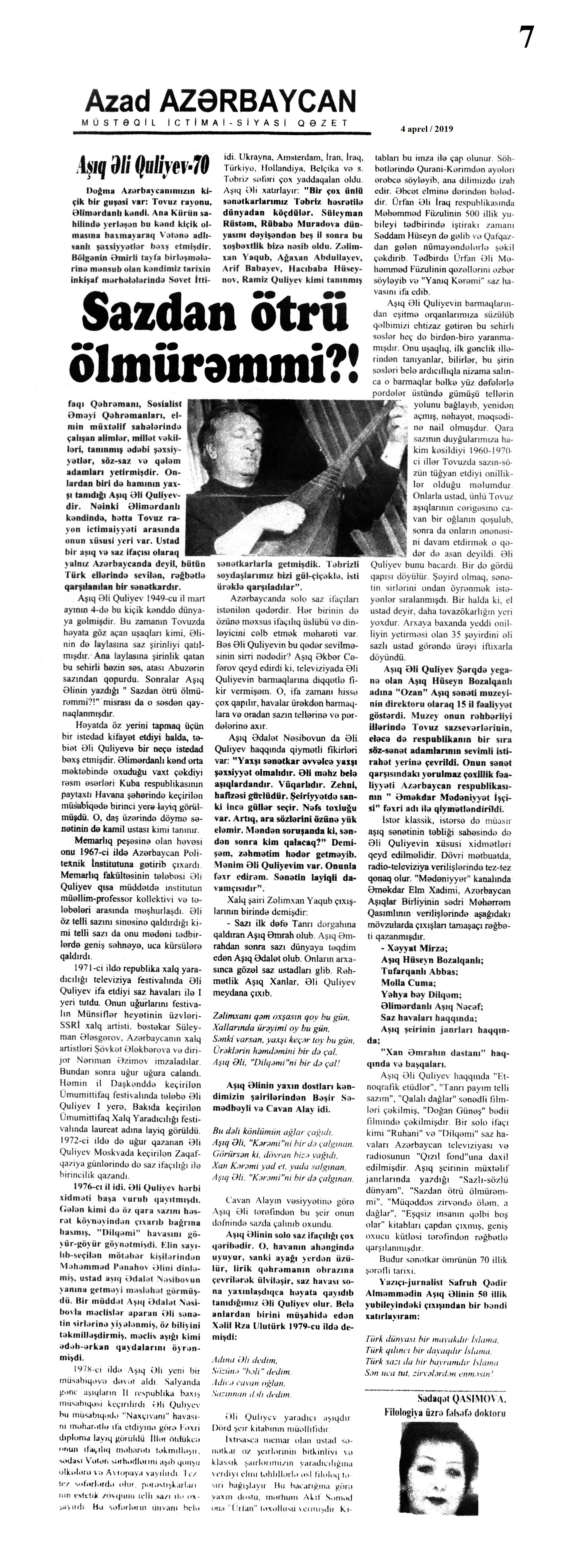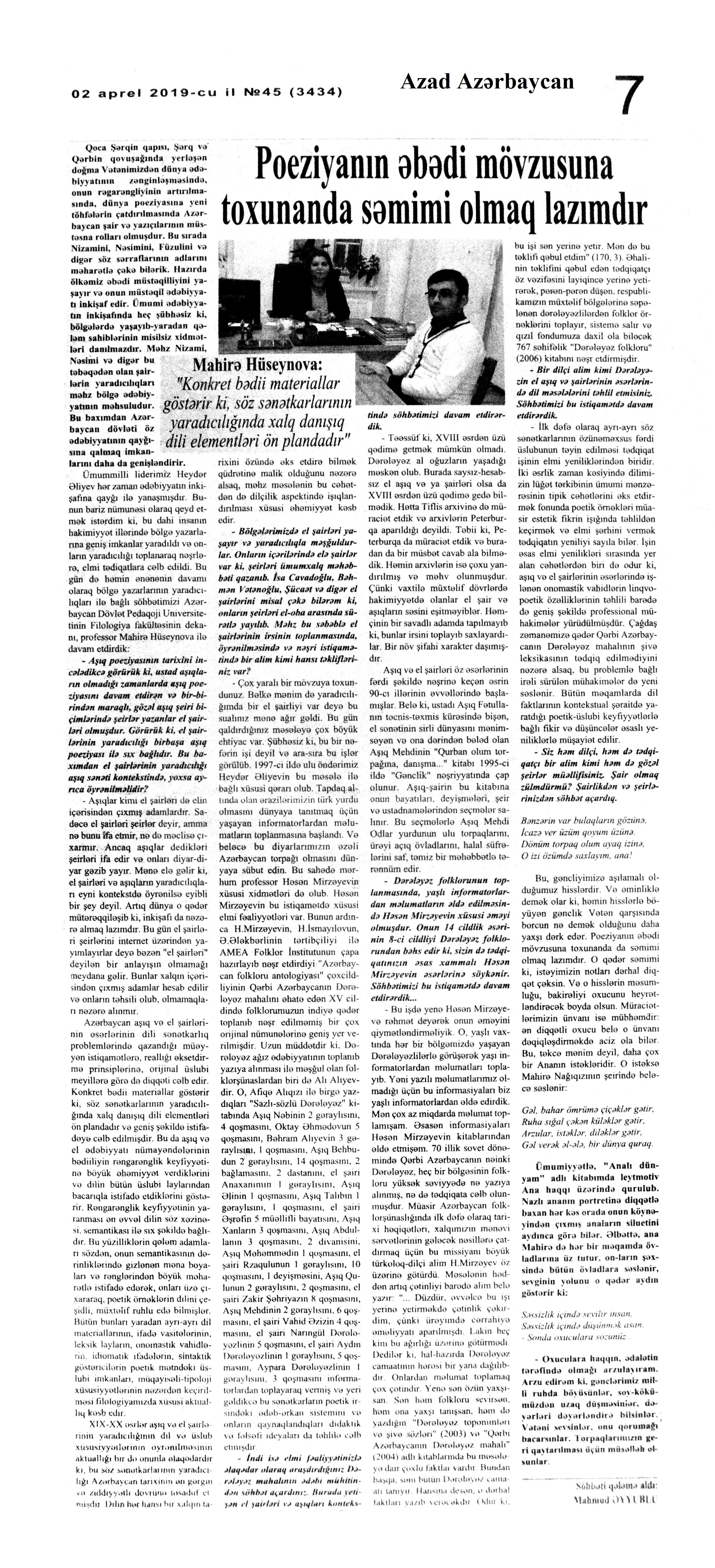 XALQ YARADICILIĞI 324. Aşıqlarımız Özbəkistanda festivalda ikinci yeri tutublar //Mədəniyyət.-2019.- 12 aprel.- S.3. 325. Gülayə. “Dayan, bu an necəsənsə...”: [aşıq Gülarə Azaflı haqqında] //Ədalət.-2019.- 11 aprel.- S.8. 326. İbrahimov, S.M. Tədqiqatın özünəməxsusluğu: [filologiya üzrə fəlsəfə doktoru Sevda İmanovanın “Folklor və Magiya” kitabı haqqında] //Ədalət.-2019.- 5 aprel.- S.7. 327. Qasımova, S. Sazdan ötrü ölmürəmmi?!: [“Ozan” Aşıq sənət müzeyinin direktoru Əli Quliyev haqqında] //Azad Azərbaycan.-2019.- 4 aprel.- S.7. 328. Nizamiqızı, H. “Sazın səsi haqq səsidir”: Aşıq sənətinin UNESCO siyahısına salınmasının 10 illiyi münasibətilə gecə keçirildi: [Azərbaycan Dövlət Akademik Filarmoniyasında] //Mədəniyyət.-2019.- 24 aprel.- S.1-2. 329. Şəkidə “Böyük Qafqaz kuboku” rəqs yarışması: [Şəki Dövlət Dram Teatrının səhnəsində eyniadlı rəqs yarışmasınin keçirilməsi haqqında] //Mədəniyyət.-2019.- 19 aprel.- S.7. 330. Yunisli, F. Sazı başına tac eləyən ustad: [Aşıq Ədalətin 80 illiyi ilə əlaqədar] //Mədəniyyətt.- 2019.- 17 aprel.- S.6.