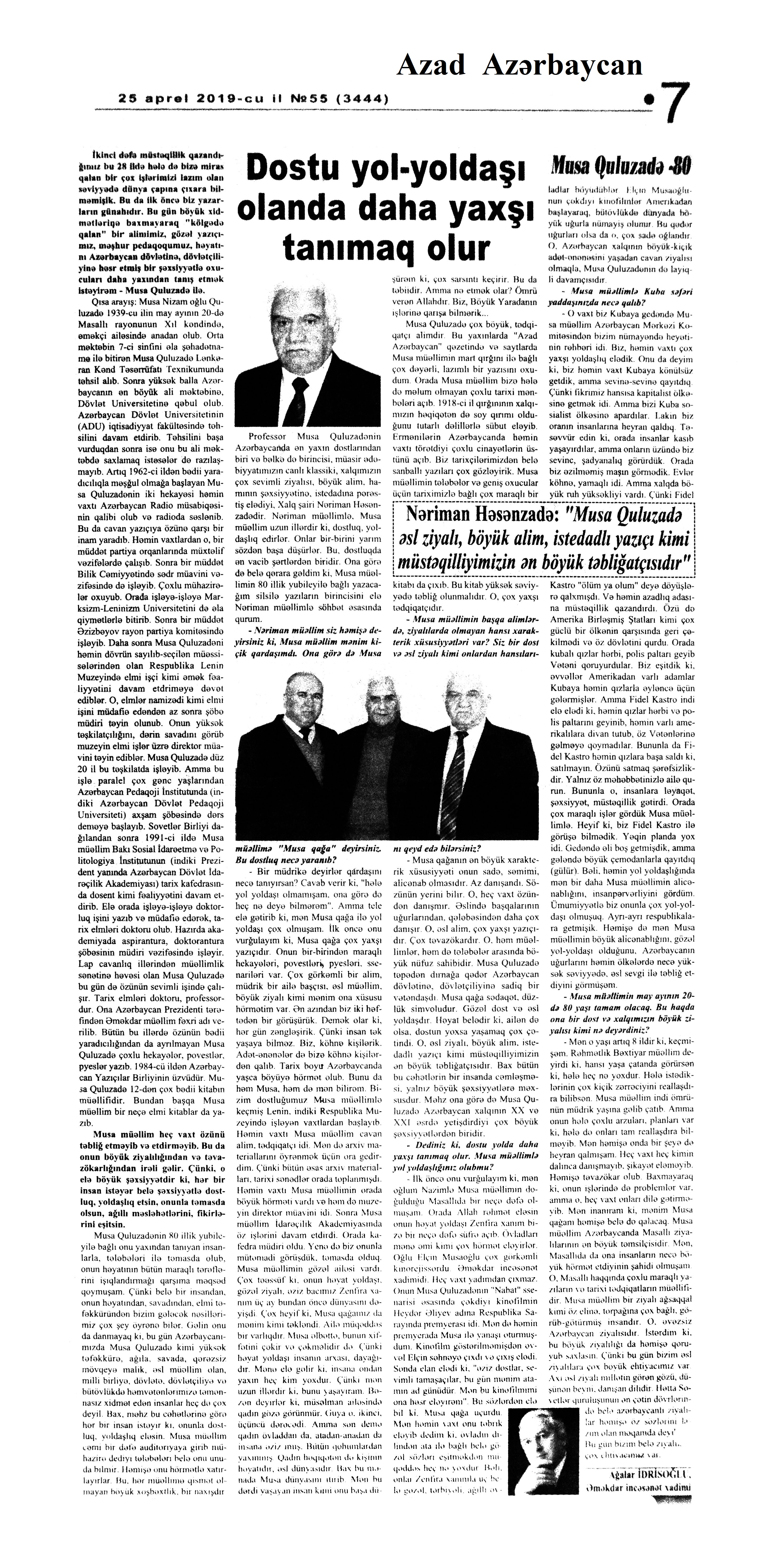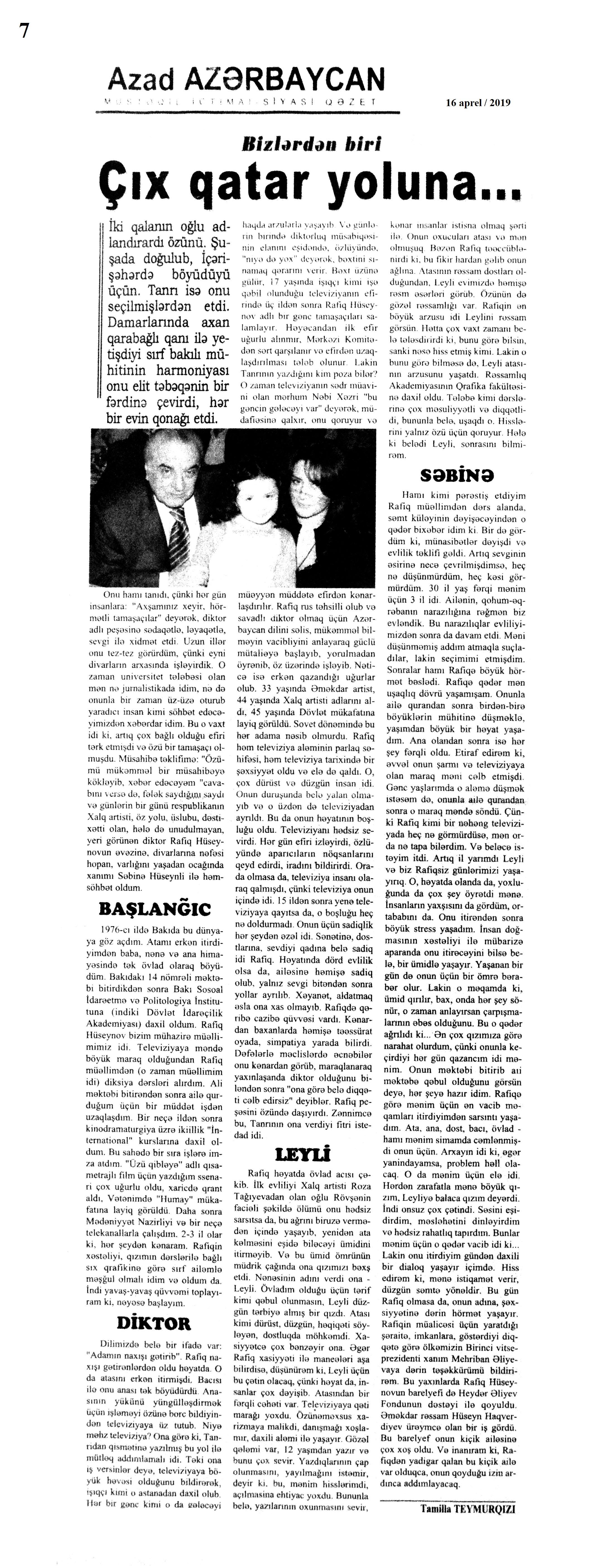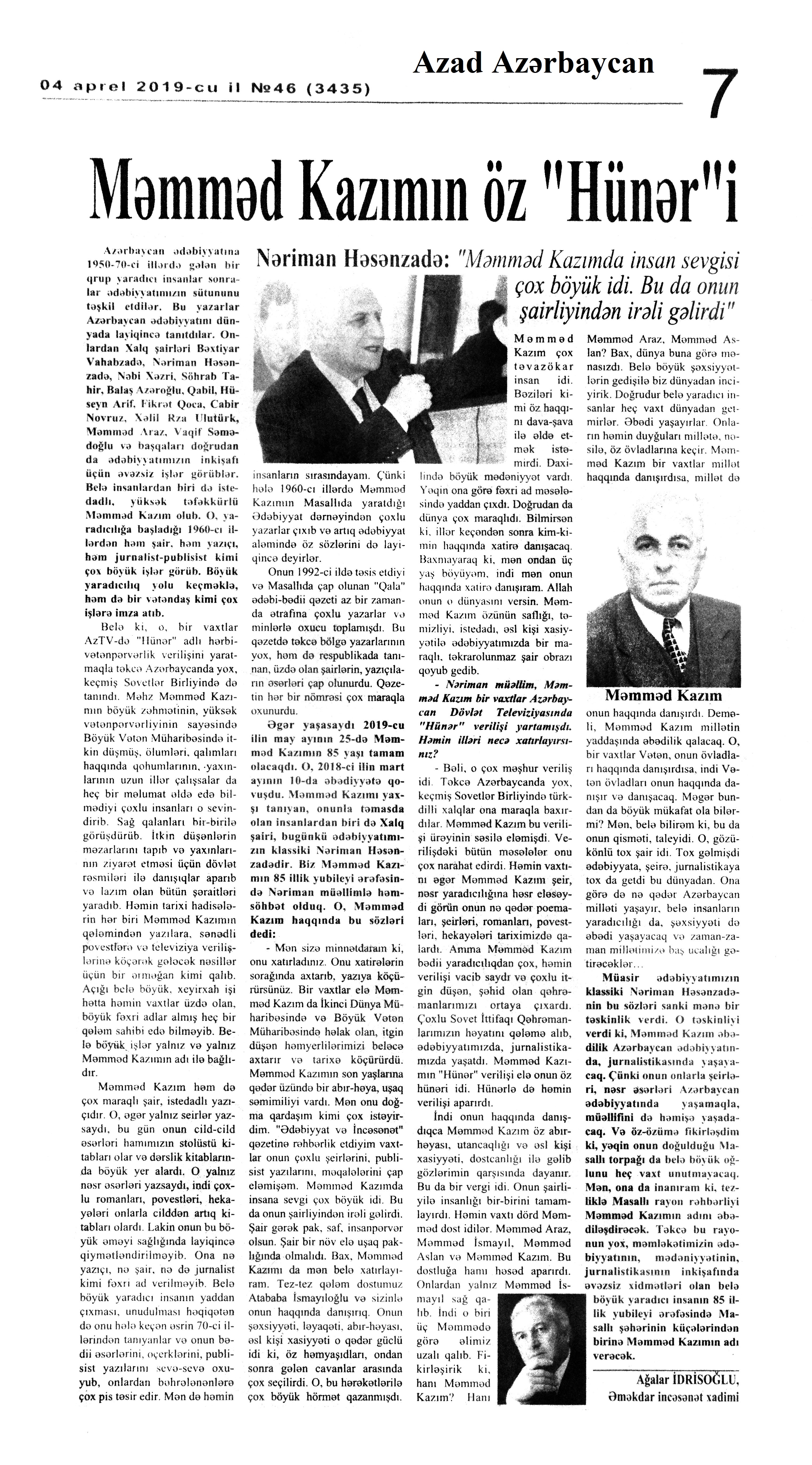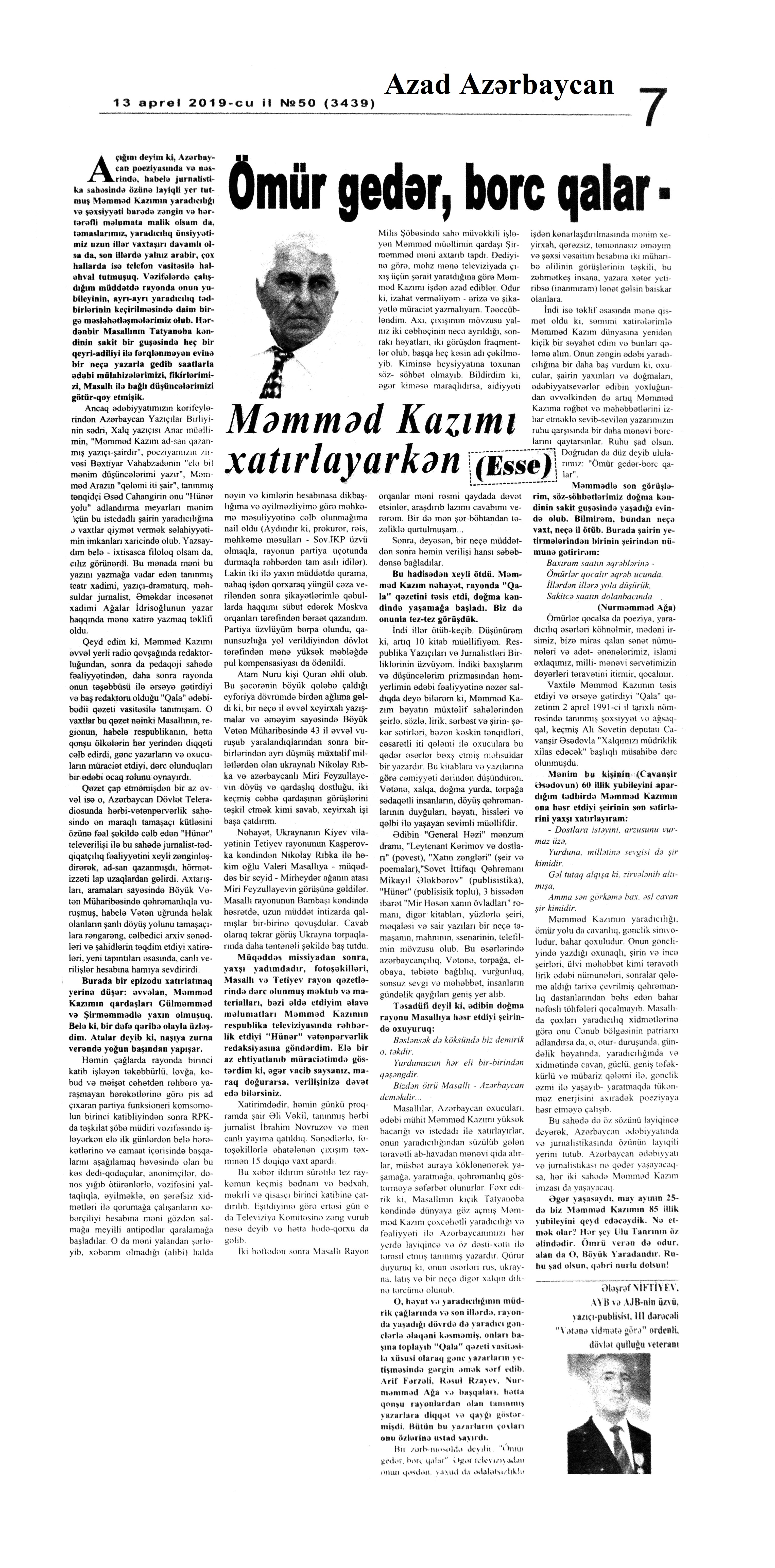 ESSELƏR 542. Mehdi, Q. Mərdəkan esseləri //Ədalət.- 2019.- 27 aprel.- S.9. 543. Məmmədoğlu, M. Böyük ana haqqında düşüncələr: [Akademik Zərifə Əliyeva haqqında] //Ədalət.- 2019.- 27 aprel.- S.12. 544. Müşfiq, Ş. Bir uşağın dünyasına səyahət //525-ci qəzet.-2019.- 24 aprel .- S.20. 545. Niftiyev, Ə. Ömür gedər, borc qalar: Məmməd Kazımı xatırlayarkən: (Esse) //Azad Azərbaycan.- 2019.- 13 aprel.- S.7. 546. Pərvin. Dəniz dənizdə batır.... //525-ci qəzet.- 2019.- 27 aprel.- S.15. 547. Turan, T. Dişi filin hikkəsi: Gedəni seyr etmək həmişə əzab verir //525-ci qəzet.-2019.- 13 aprel. - S.12. 548. Turan, T. “Fastfood” münasibətlər... //525-ci qəzet.-2019.- 20 aprel. - S.14. 549. Viləşsoy, A. “Şinelli qalalar”//Ədalət.- 2019.- 26 aprel.- S. 6. 550. Vüsal, B. Xətadı qeyri-eşq...: (esse) //Kredo.- 2019.- 18 aprel.- S.8-9.