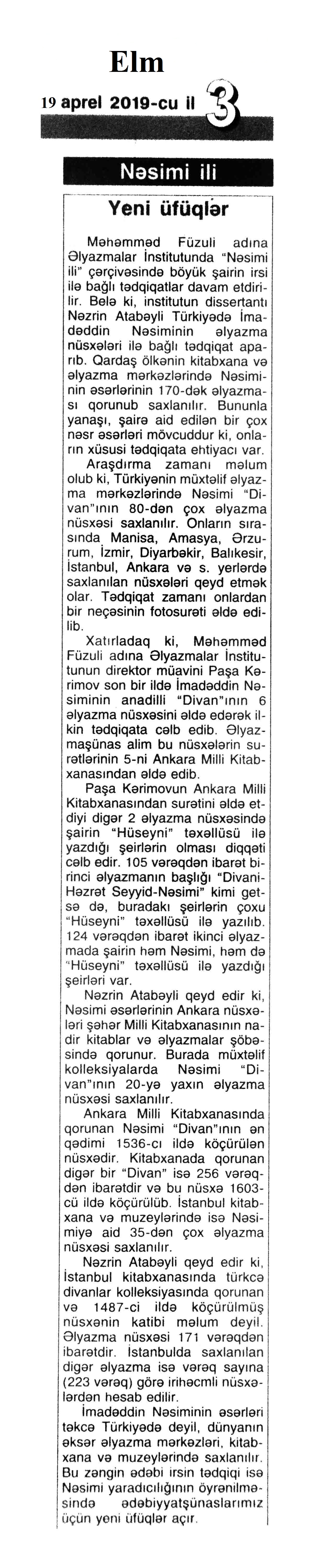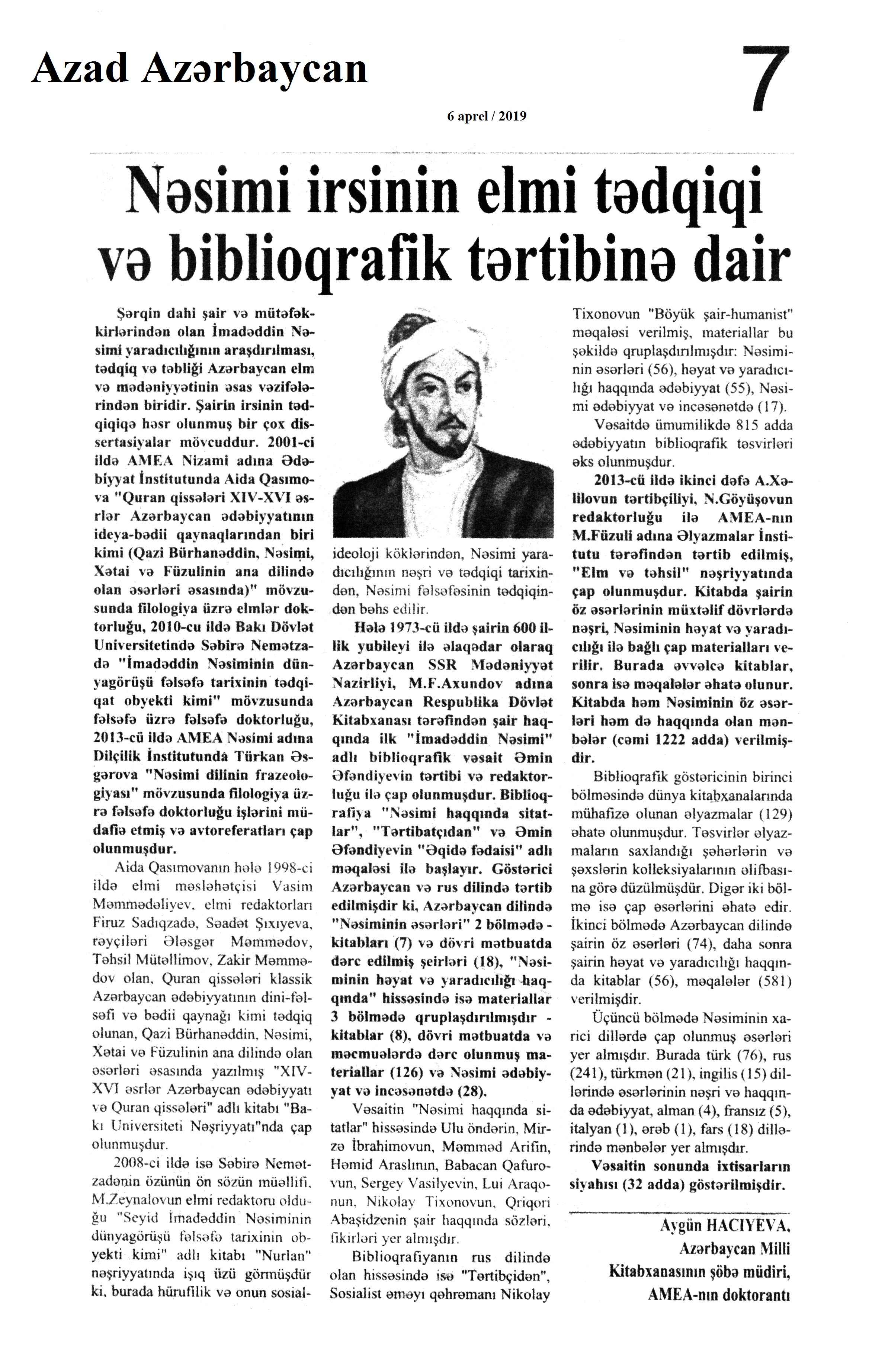 2019-cu il – “Nəsimi ili” 856. Abdullayeva, Z. “Nəsimi” kinofilmində musiqi: [bəstəkar Tofiq Quliyevin musiqiləri haqqında] //525-ci qəzet.- 2019.- 10 aprel.- S. 17. 857. Aruz, S. Nəsimi: Şah və Nəsiminin münazirəsi: Beşpərdəli dramın dördüncü pərdəsi //Ədəbiyyat qəzeti.-2019.- 20 aprel.- S.12-13. 858. Aslan, Ş. İki cahana sığmayan şair //525-ci qəzett.- 2019.- 26 aprel.- S.13. 859. Aslan, V. Türk sufi triadası – Şeyx Əhməd Yəsəvi, Yunis İmrə, İmadəddin Nəsimi //Ədalət.-2019.- 4 aprel.- S.7. 860. Aslan, V. Türk sufi triadası – Şeyx Əhməd Yəsəvi, Yunis İmrə, İmadəddin Nəsimi //Ədalət.-2019.- 5 aprel.- S.7. 861. Aslan, V. Türk sufi triadası – Şeyx Əhməd Yəsəvi, Yunis İmrə, İmadəddin Nəsimi //Ədalət.-2019.- 6 aprel.- S.4. 862. Aslan, V. Türk sufi triadası – Şeyx Əhməd Yəsəvi, Yu-nis İmrə, İmadəddin Nəsimi //Ədalət.- 2019.- 9 aprel.- S.7. 863. Aslan, V. Türk sufi triadası – Şeyx Əhməd Yəsəvi, Yunis İmrə, İmadəddin Nəsimi //Ədalət.-2019.- 10 aprel.- S.7. 864. Azəri, L. “Hüsnü-cəmal, əqli kamal”: İmadəddin Nəsiminin 650 illiyinə həsr olunmuş bədii qiraət müsabiqəsinə yekun vurulub: [Beynəlxalq Muğam Mərkəzində] //Mədəniyyət.-2019.- 26 aprel.- S.4. 865. Babayeva, G. “Molla Nəsrəddin” jurnalının nəşri tarixindən //525-ci qəzet.- 2019.- 5 aprel.- S.12-13. 866. Beynəlxalq Türk Akademiyasından Nəsiminin 650 illiyi ilə bağlı kitab: [şairin şeirlərindən ibarət kitabın nəşr edilməsi haqqında] //Mədəniyyət.-2019.- 3 aprel.- S.4. 867. Bəxtiyar Vahabzadənin “Fəryad” əsəri özbək dilində: [Camal Kamalın şairin Nəsimiyə həsr etdiyi eyniadlı əsəri tərcümə etməsi haqqında] //Mədəniyyət.- 2019.- 24 aprel.- S. 7. 868. Braziliyada Nəsiminin 650 illiyinə həsr edilmiş fotosərgi //Mədəniyyət.-2019.- 26 aprel.- S.8. 869. Budapeştdə Nəsiminin 650 illik yubileyinə həsr olunmuş tədbir //Mədəniyyət.-2019.- 19 aprel.- S.1-2. 870. Buzovnalı, A. “Nəsimi – şeir, sənət və mənəviyyat”...: [Leyla Əliyevanın şeir yaradıcılığı haqqında] //Ədəbiyyat qəzeti.- 2019.- 20 aprel.- S.3. 871. Cavadov, S. Əbədiyyət şairi: (İmadəddin Nəsiminin 650 illiyi münasibətilə) //Azərbaycan.- 2019.- 13 aprel.- S.7. 872. Cəfərova, L. “Nəsimiyə ithaf” əsərində tembr və faktura xüsusiyyətlər: Və ya sintez içində sintezlə rastlaşmaq: [Akademik Milli Dram Teatrında Xalq artisti Firəngiz Əlizadənin eyniadlı əsərinin vokal-xoreoqrafik tamaşası haqqında] //Kaspi.- 2019.- 3 aprel.- S.15. 873. Əjdər ol Nəsimi fəlsəfəsinin mahiyyətindən danışıb: [AYB-də keçirilən tədbir haqqında] //Ədəbiyyat qəzeti.- 2019.- 6 aprel.- S.32. 874. Əliyev, A. “Nəsimi ili, Nəsimi dili” festivalında sumqayıtlılar da iştirak edəcək: [festival çərçivəsində Sumqayıt Dövlət Dram Teatrının kollektivi Əyyub Qiyasın “Şah və Sultan” kompozisiyası ilə iştirak edir] //Azərbaycan.- 2019.- 14 aprel.- S. 5. 875. Əliyev, K. Nəsimi və mif //Ədəbiyyat qəzeti.- 2019.- 13 aprel.- S.22-23. 876. Əliyev, M. “Suriya müftisi Nəsiminin qətlinə görə xalqımızdan üzr istədi”: Mahir Əliyev: Nəsiminin məzarı yerləşən ərazidə Azərbaycanın Mədəniyyət Mərkəzi açılacaqdı: [Modern.az saytının əməkdaşı ilə müsahibə] /müsahibəni apardı Namidə Bingöl //Üç nöqtə.- 2019.- 25 aprel.- S.12. 877. Əliyeva, A. Dünyanı sözlə bəzəyən həqiqət aşiqi //Mədəniyyət.-2019.- 17 aprel.- S.6. 878. Əliyeva, G. Nəsimi poeziyasında Can, Cahan, Canan //525-ci qəzet.- 2019.- 6 aprel.- S.19;23. 879. Əliyeva, M. Nəsimi ədəbi-bədii gecəsi keçirildi: [187 saylı tam orta məktəbdə] //Respublika.- 2019.- 17 aprel.- S.5. 880. Əlizadə, A. Gənclər meydan suladı – TV-lər harda idi?: “Nəsimi gecəsi”ndə gördüklərim: [Muğam Mərkəzində keçirilən tədbir haqqında] //525-ci qəzet.-2019.- 24 aprel.- S.14. 881. Ənvəroğlu, H. İbn Ərəbi fəlsəfi görüşləri və Nəsimi təsəvvüfü //525-ci qəzet.- 2019.- 19 aprel.- S.12-13. 882. Fərəcov, S. Azərbaycan bəstəkarlarının yaradıcılığında Nəsimi mövzusu: [Bəstəkarlar İttifaqında eyniadlı elmi konfransın keçirilməsi haqqında] //Mədəniyyət.- 2019.- 19 aprel.- S. 2. 883. Fərəcova, Z. Nəsiminin yubileyi Budapeştdə qeyd olundu: [Mədəniyyət Nazirliyi, Azərbaycanın Macarıstandakı Səfirliyi, Azərbaycan Milli Kitabxanası və Budapeştdəki Yunus Əmrə İnstitutu ilə birlikdə keçirilmiş ədəbi-musiqili tədbir haqqında] //Azərbaycan.- 2019.- 26 aprel.- S.4. 884. Füzuli teatrında “Nəsimi eşqi”: [Asif Şirinovun hazırladığı eyniadlı tamaşanın nümayişi haqqında] //Mədəniyyət.- 2019.- 24 aprel.- S.2. 885. Hacı, K. Tanınmış yazıçı: Nəsimi Allahsızmı idi?: [yazıçı Kənan Hacı ilə müsahibə] /müsahibəni apardı Oğuz Ayvaz //Ədalət.-2019.- 11 aprel.- S.5 886. Hacıyeva, A. İmadəddin Nəsiminin əsərləri və onun haqqında yazılanlar...: Not əsərləri və Nəsimi çoxcildli kitablarda: [M.F. Axundov adına Azərbaycan Milli Kitabxanasının yeni nəşri haqqında] //Hürriyyət.- 2019.- 6 aprel.- S.13. 887. Hacıyeva, A. Nəsimi irsinin elmi tədqiqi və biblioqrafik tərtibinə dair //Azad Azərbaycan.-2019.-6 aprel.- S.7. 888. Hümmətova, X. Nəsimi şeirində sözün informativ yükü //Hərbi And.- 2019.- 12 aprel.- S.20. 889. Hüseynov, F. Sənət axşamlarından Nəsimi poeziyasına: “Mədəniyyət” qəzetinin “Afişa” əlavəsinin aprel sayında dahi şairin söz xəzinəsindən seçmələr də dərc olunub //Mədəniyyət.-2019.- 5 aprel.- S. 1; 7. 890. Hüsnü-cəmal, əqli kamal…: Ali məktəb tələbələri arasında bədii qiraət müsabiqəsi //Mədəniyyət.-2019.- 3 aprel.- S.7. 891. Xələfli, Ə. R. Şəkil çəkmək istəyirəm...: Nəsimi; Salam